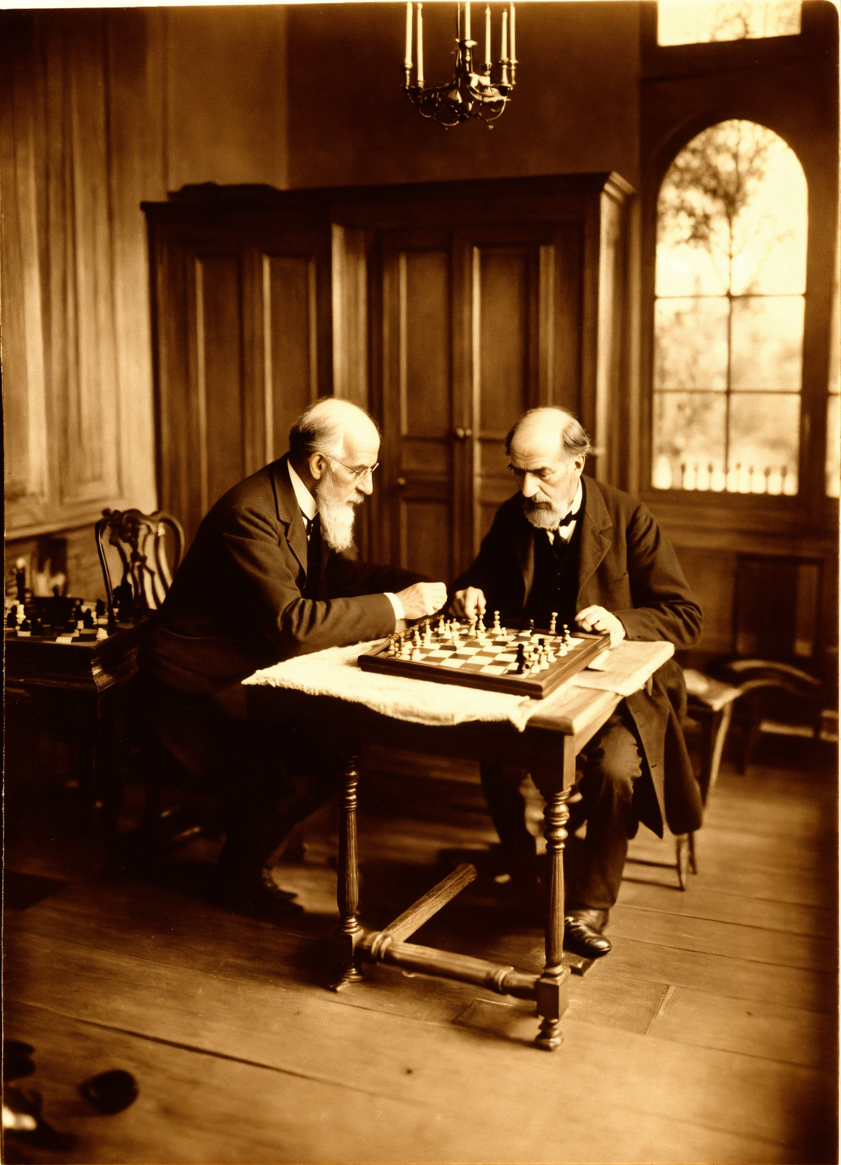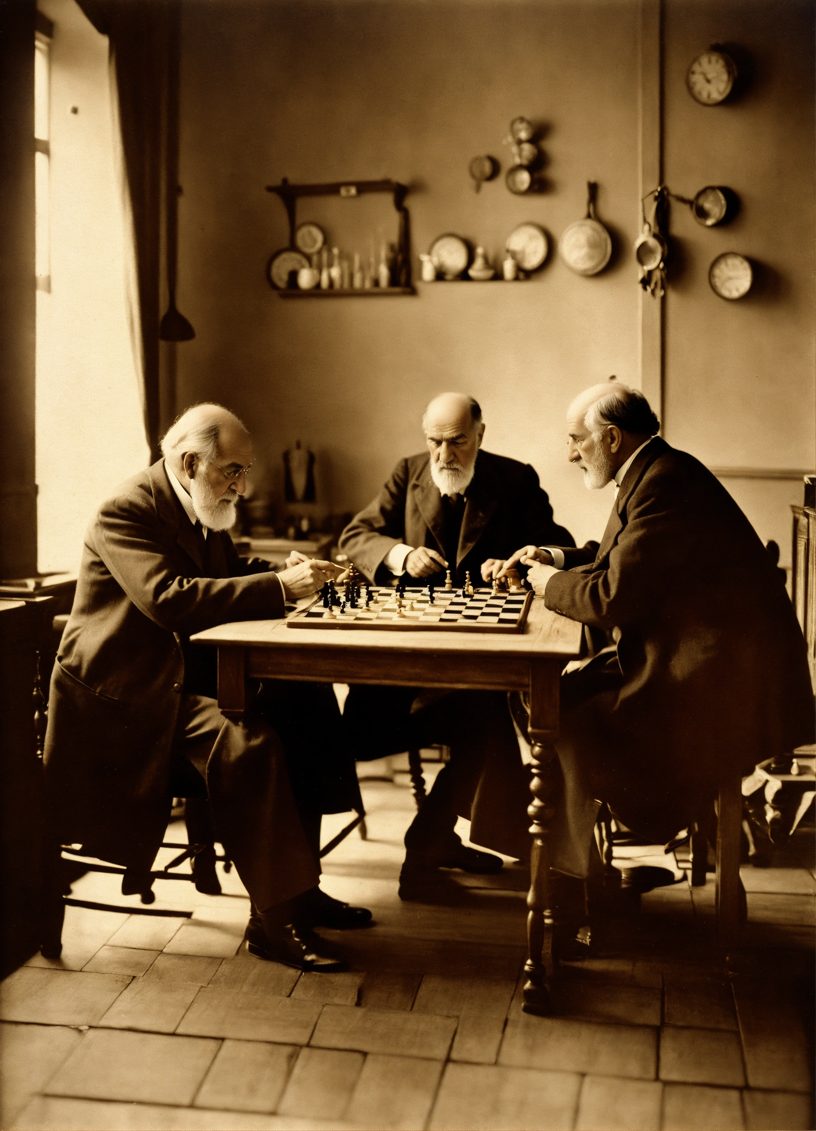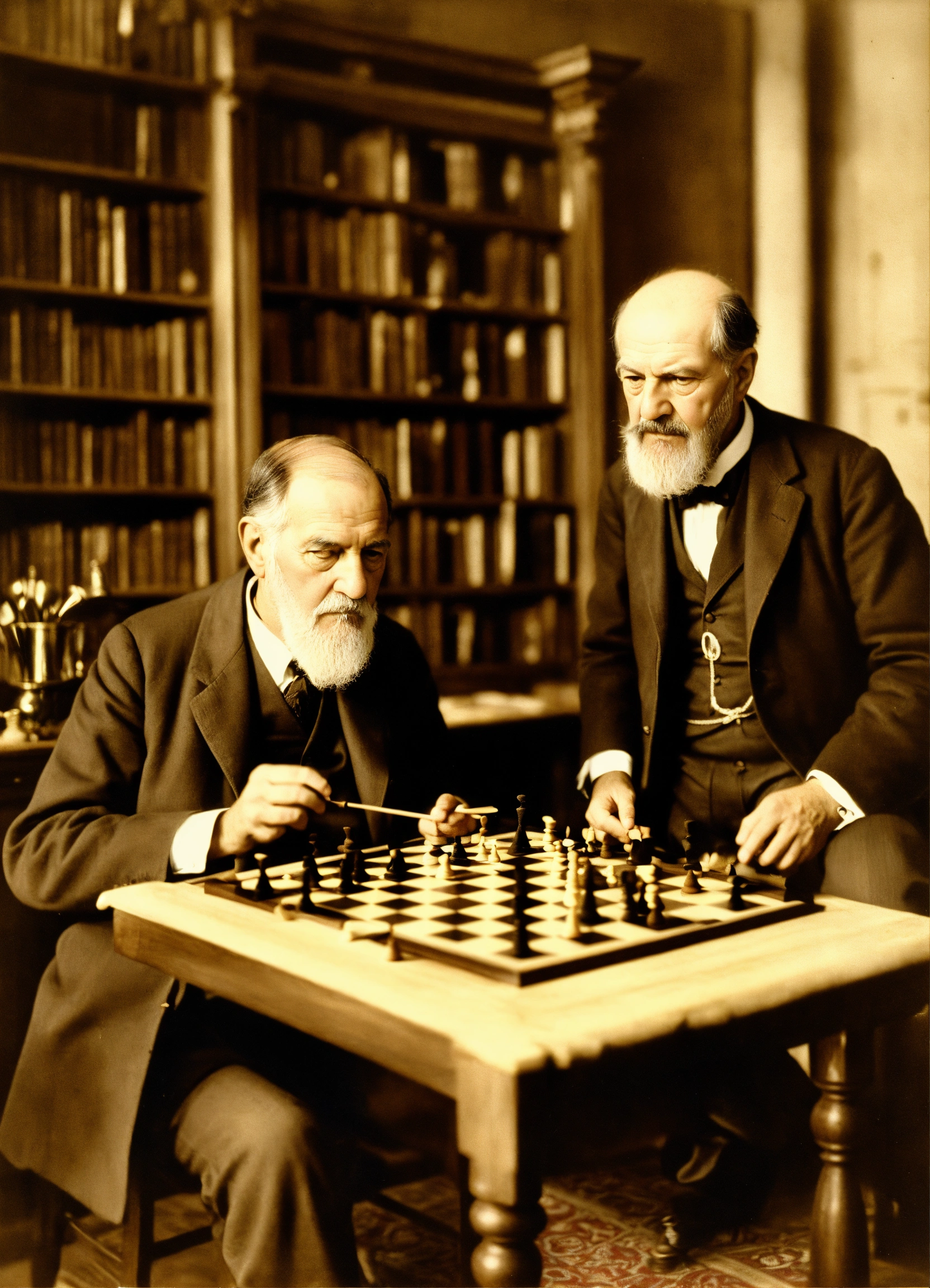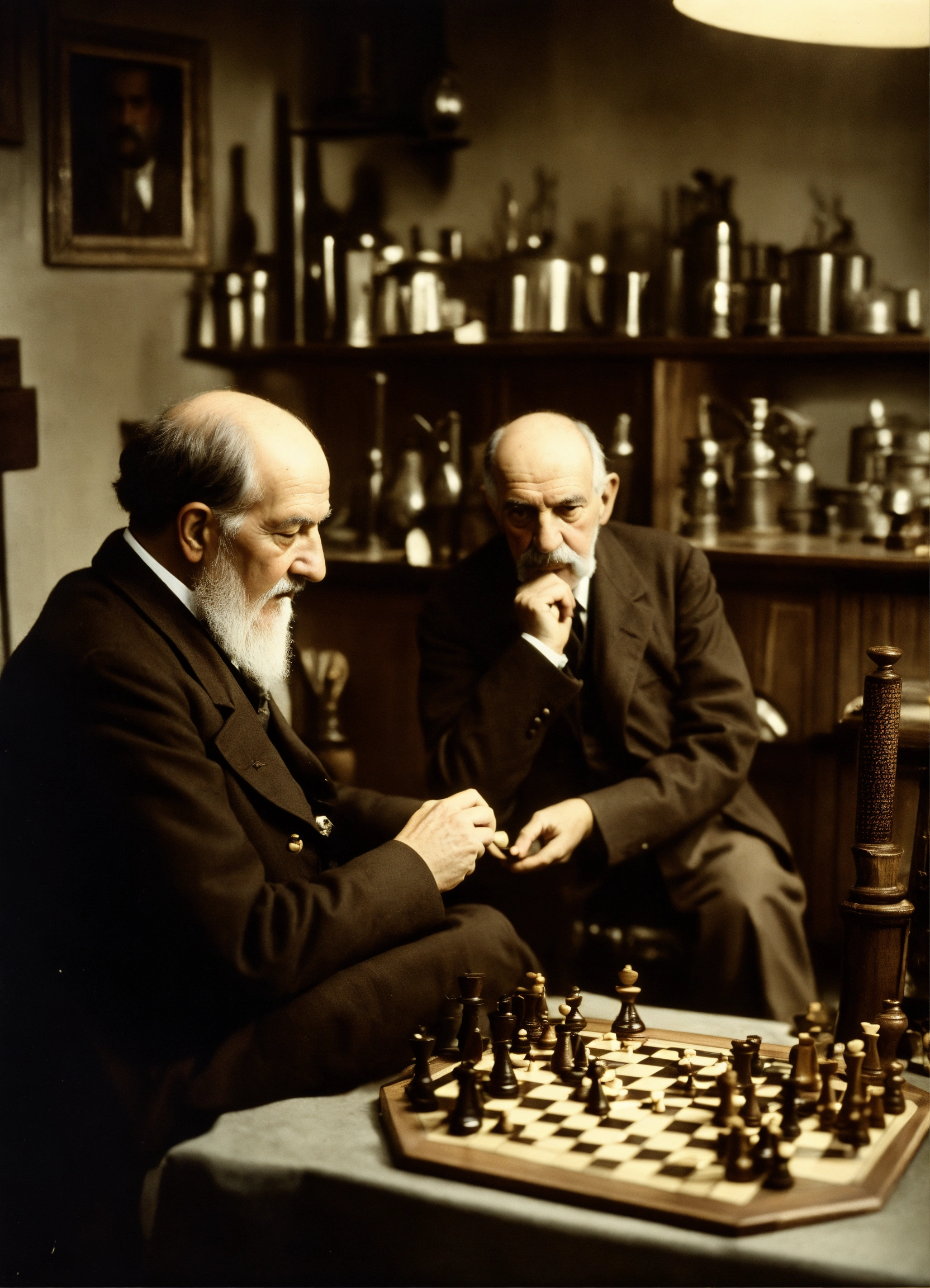 Una fotografía, como un daguerrotipo, de santiago ramón y cajal jugando al ajedrez con sigmund freud en la cocina de cajal