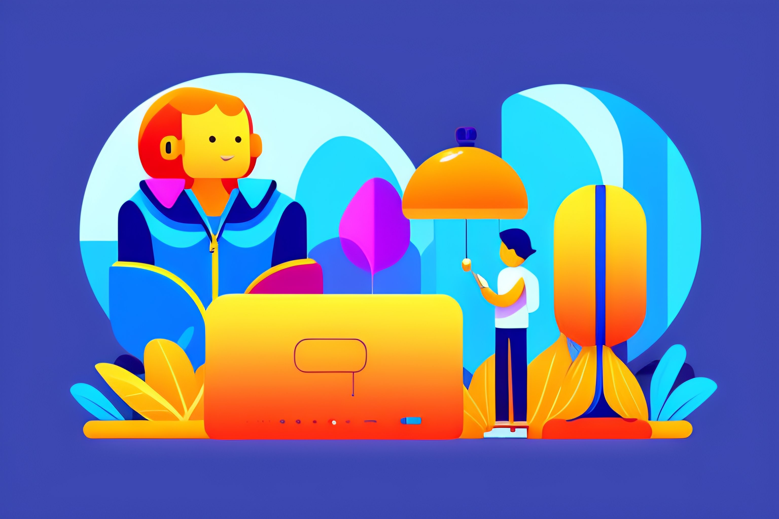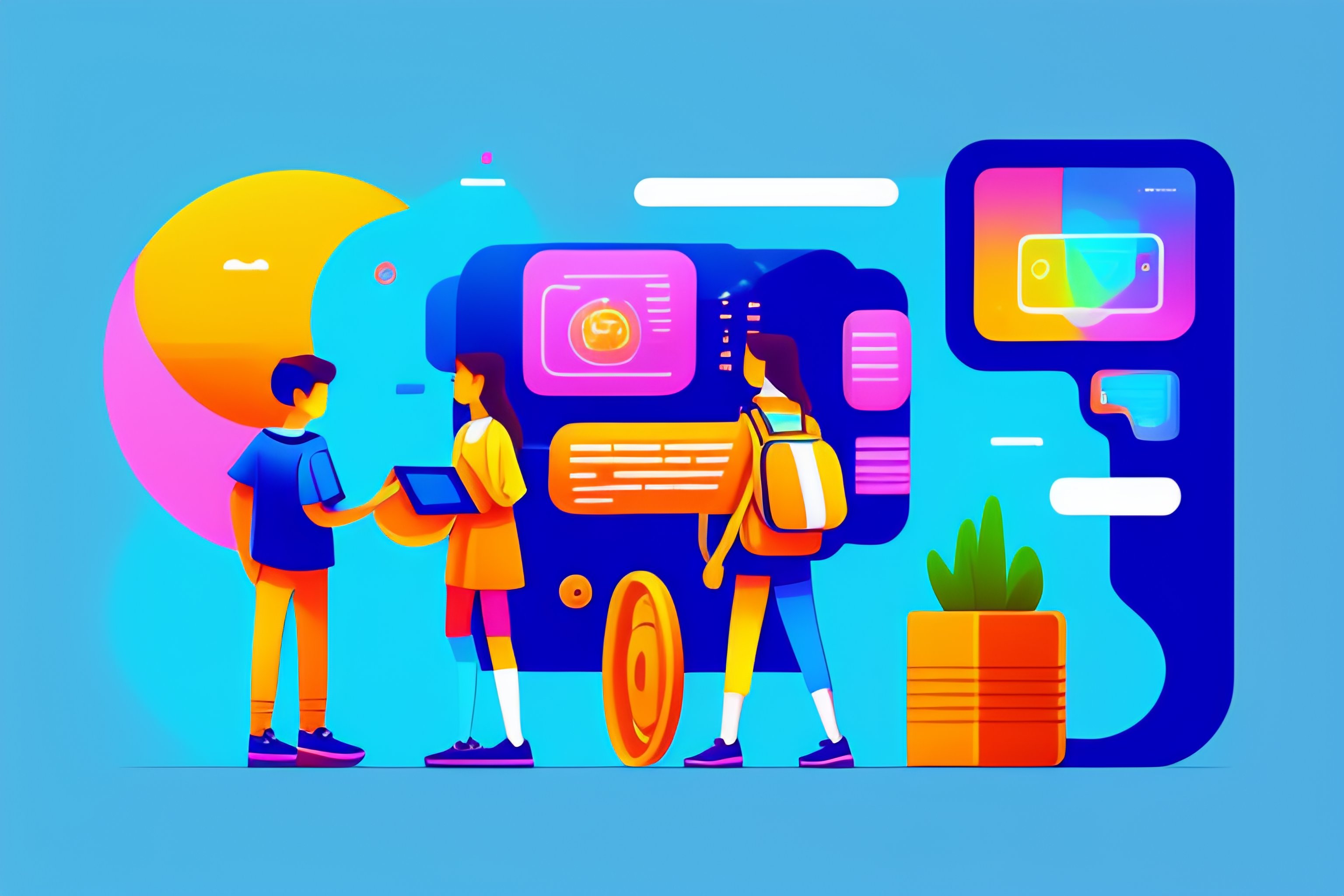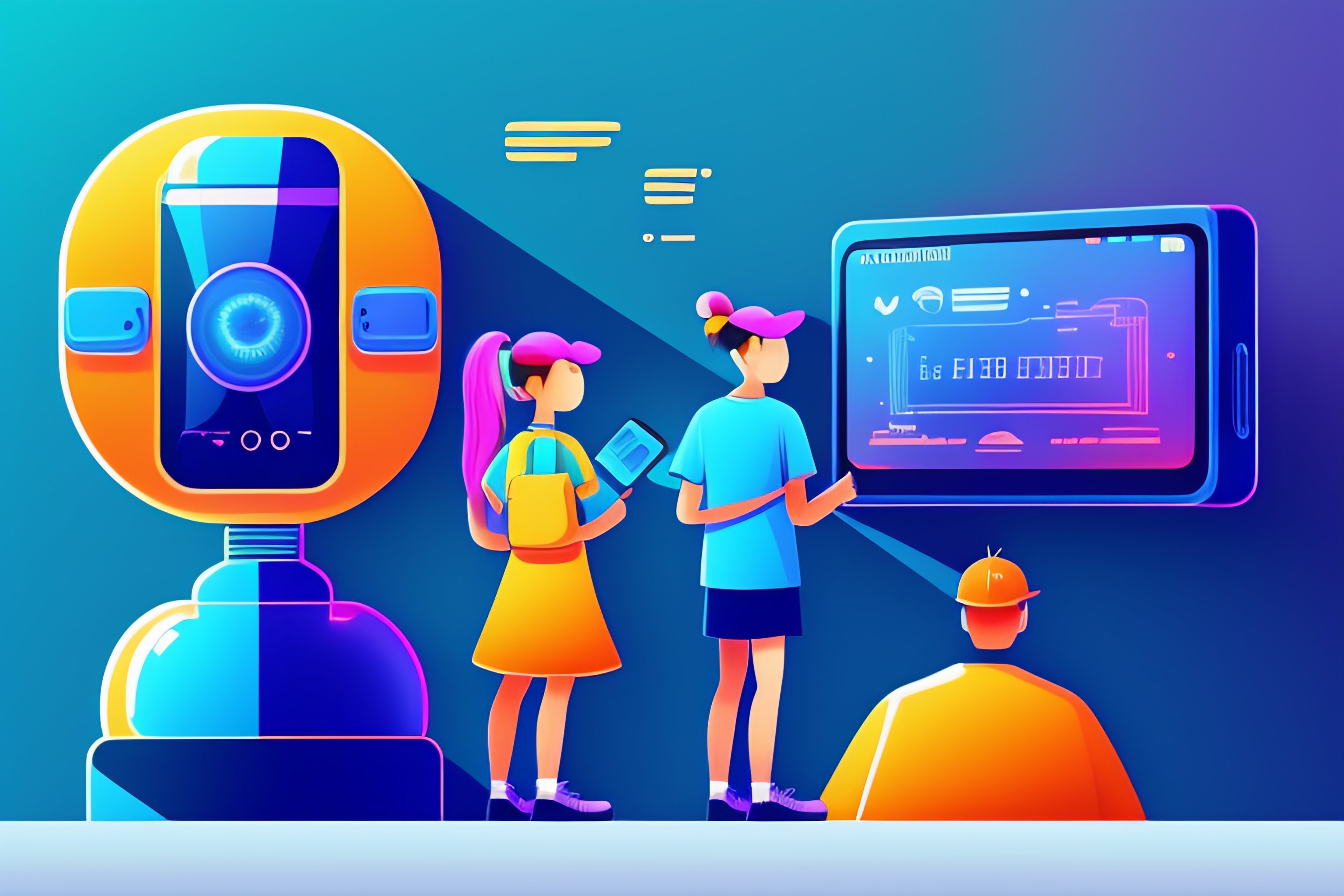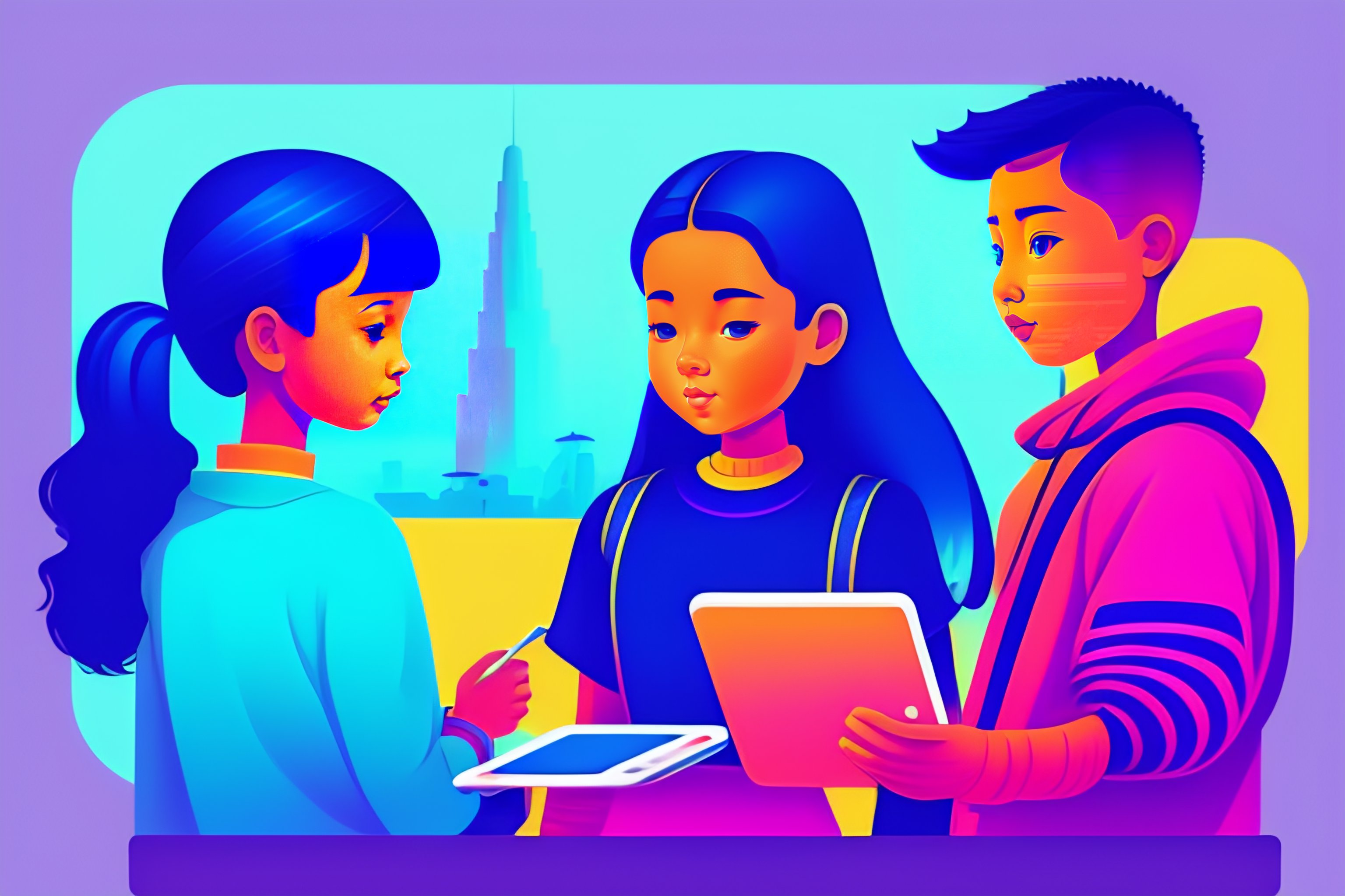 13 year old male and female kids, learning through conversation with artificial intelligent robot, learning in the street, tablet, smartwatch, year 2030, vector art, blueish colors, style of flat vector, stanislav batalov, vibrant colors and hard shadows, plain blue background, comic cover art