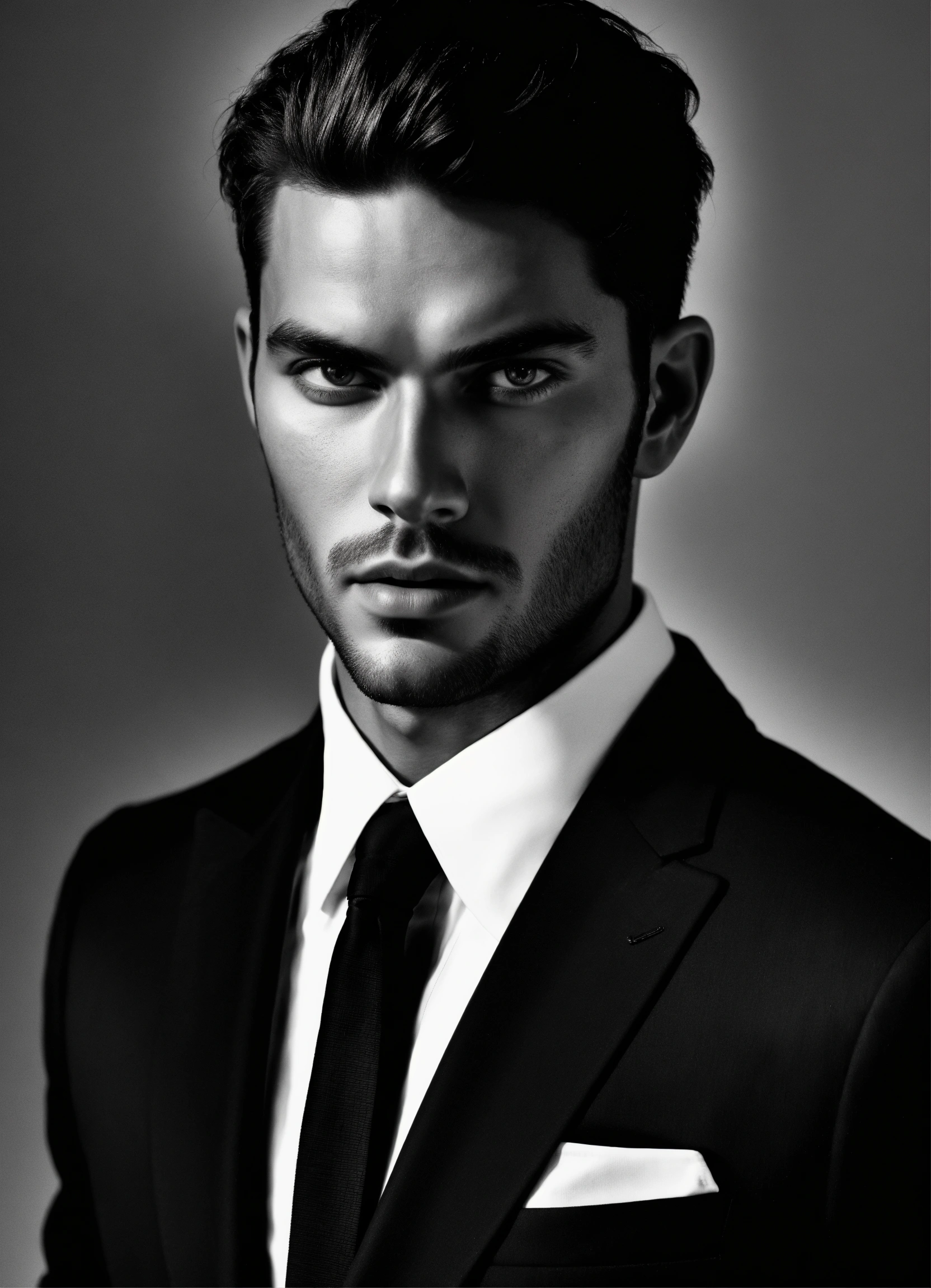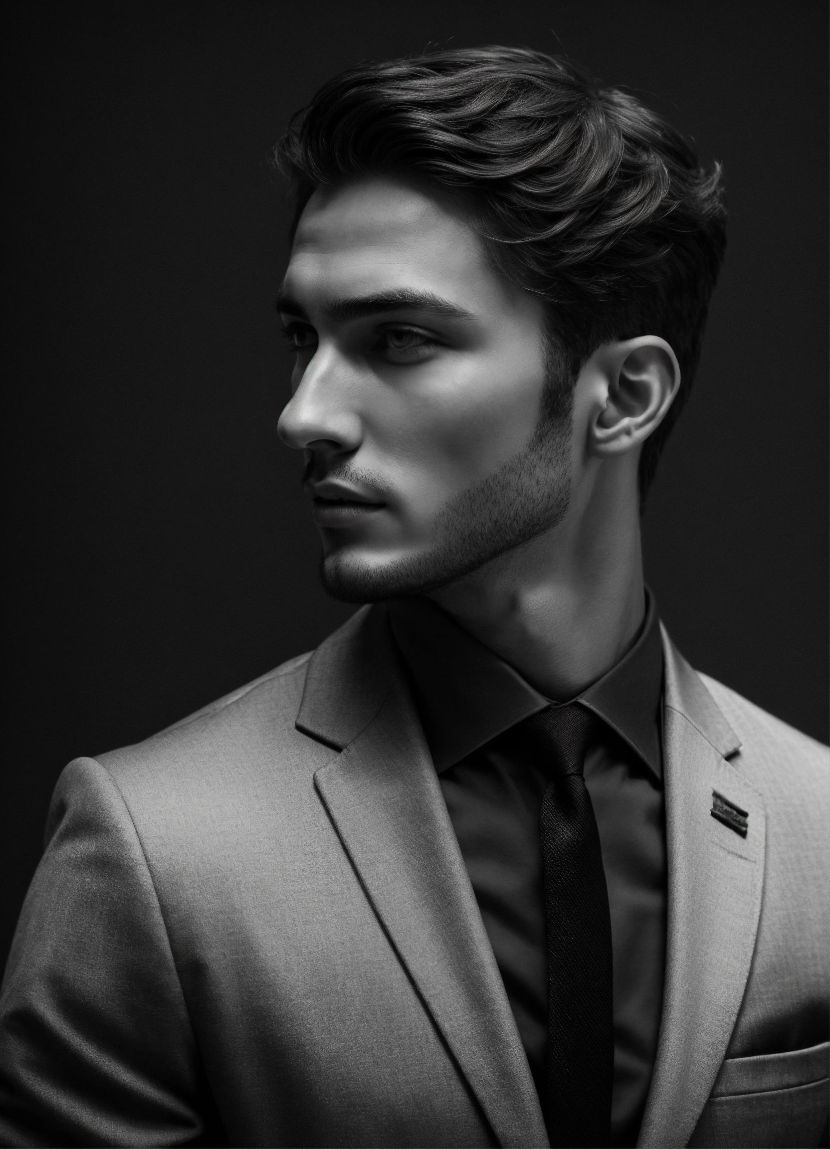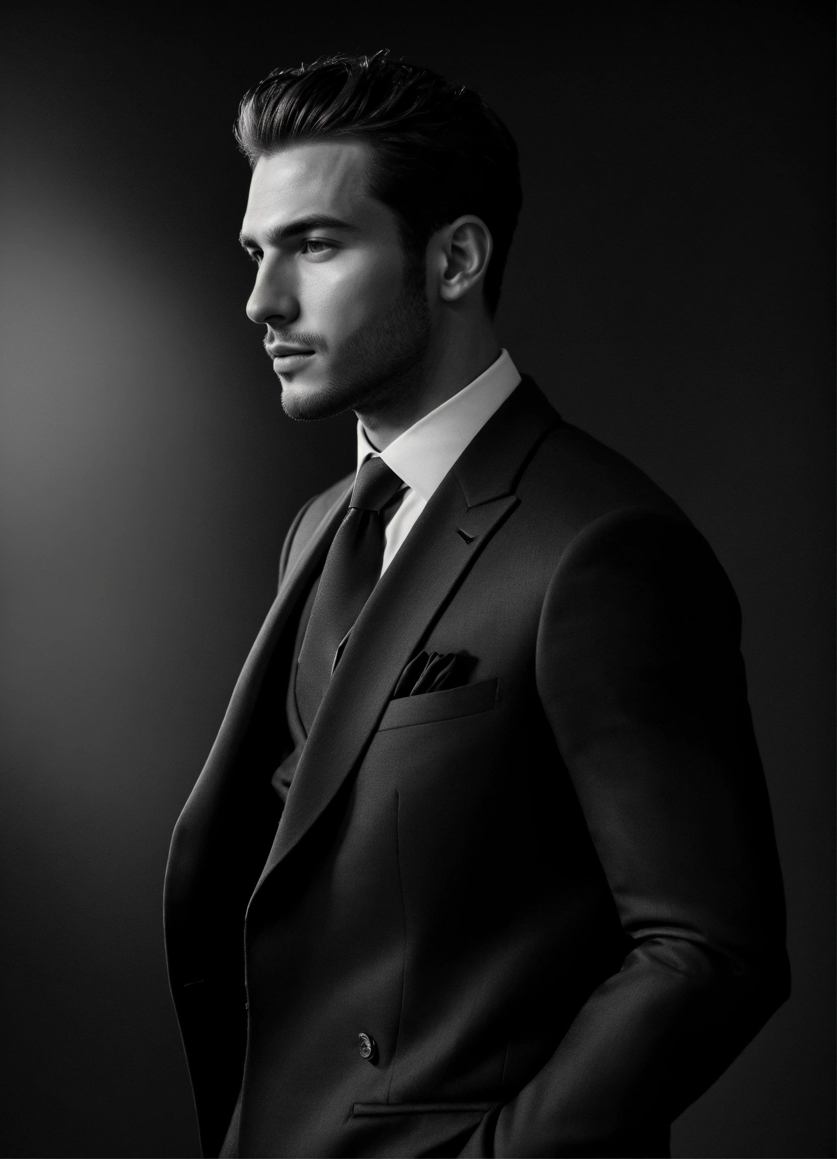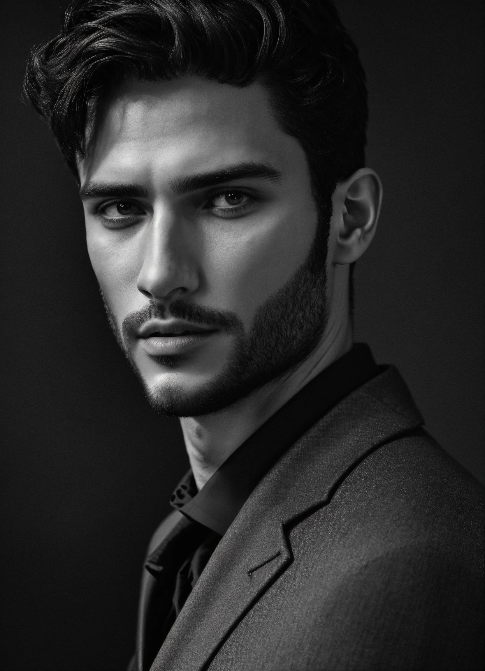 Photo of an italian male model, black and white, photorealistic, poster, not painted, very detailed faces, skin with pores, 4 k, position from left to right, model looking from left to right over his shoulder, dark suit, black plain background, skin not smoothed, face from left to right