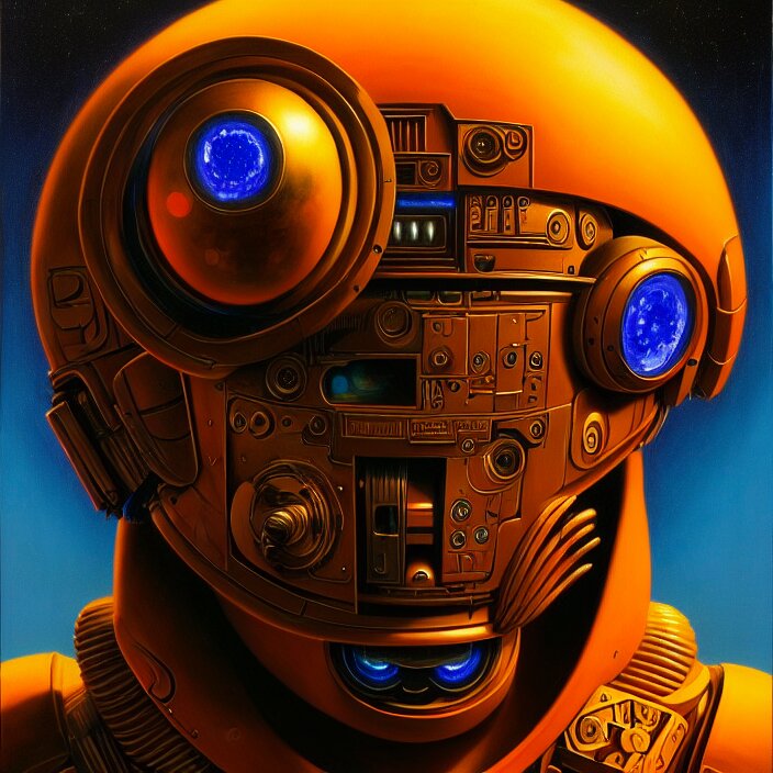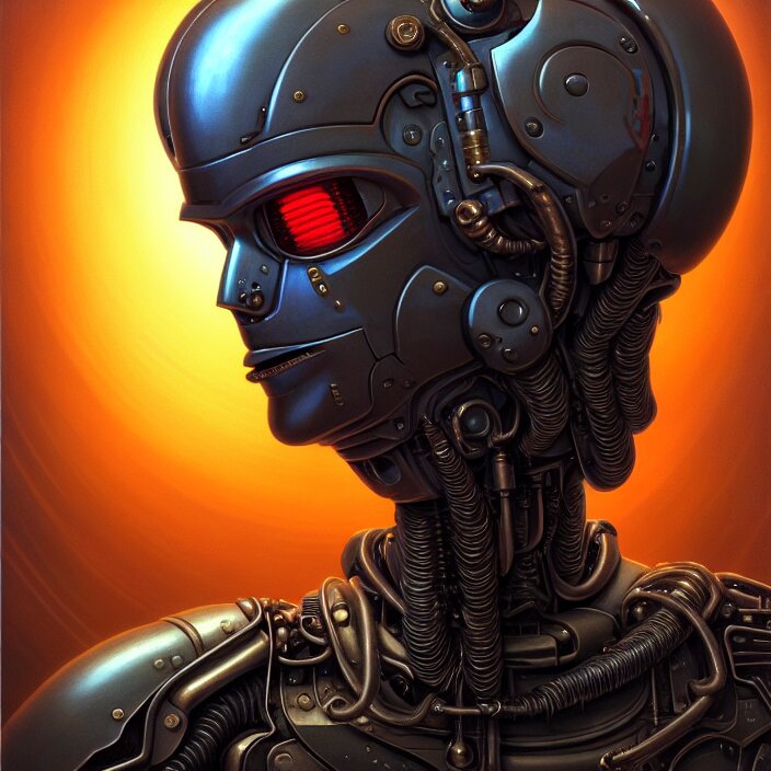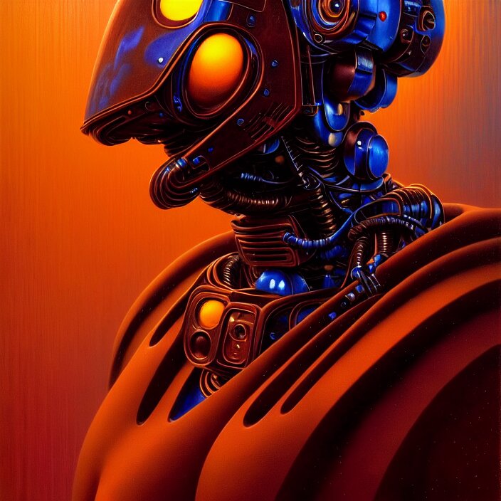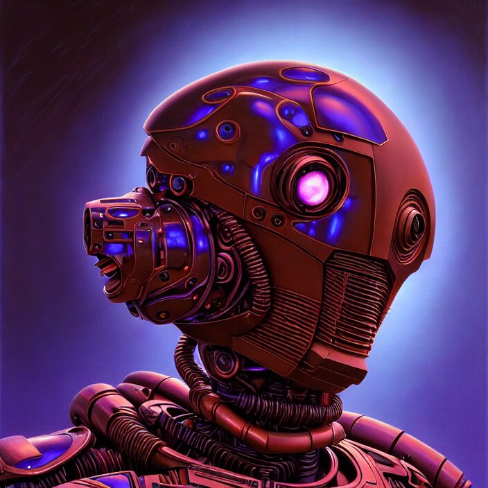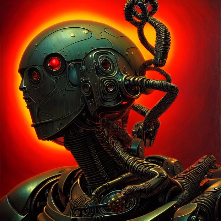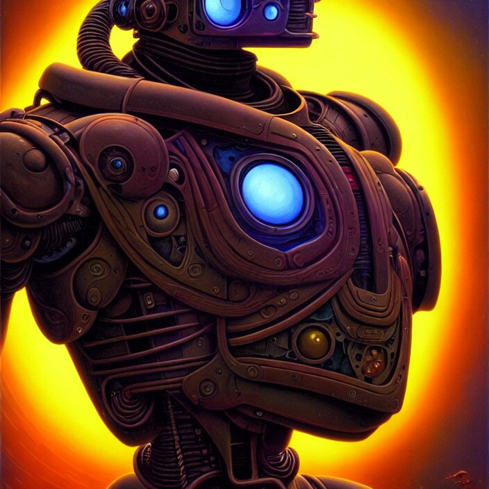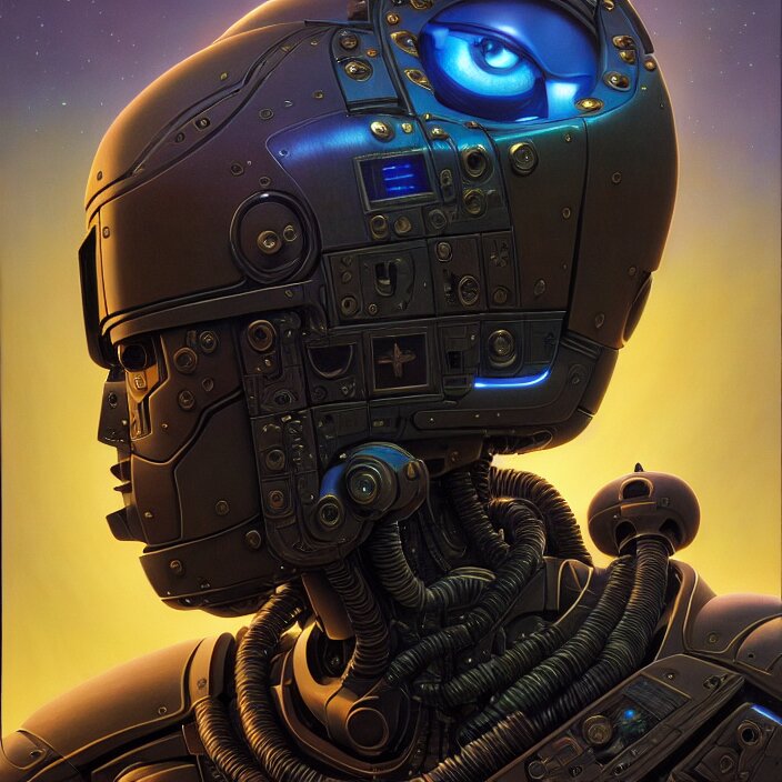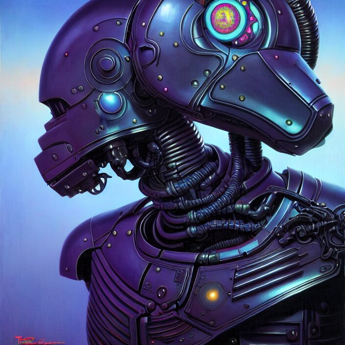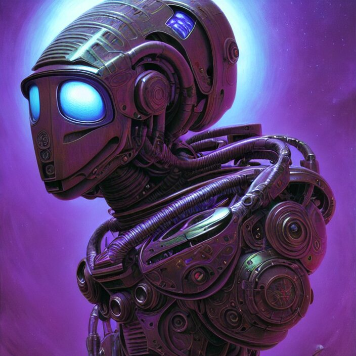 Cinematic bust portrait of psychedelic robot from left, head and chest only, exotic alien features, robotic enhancements, desaturated, tim hildebrandt, wayne barlowe, bruce pennington, donato giancola, larry elmore, oil on canvas, masterpiece, trending on artstation, featured on pixiv, cinematic composition, dramatic pose, beautiful lighting, sharp, details, hyper - detailed, hd, hdr, 4 k, 8 k