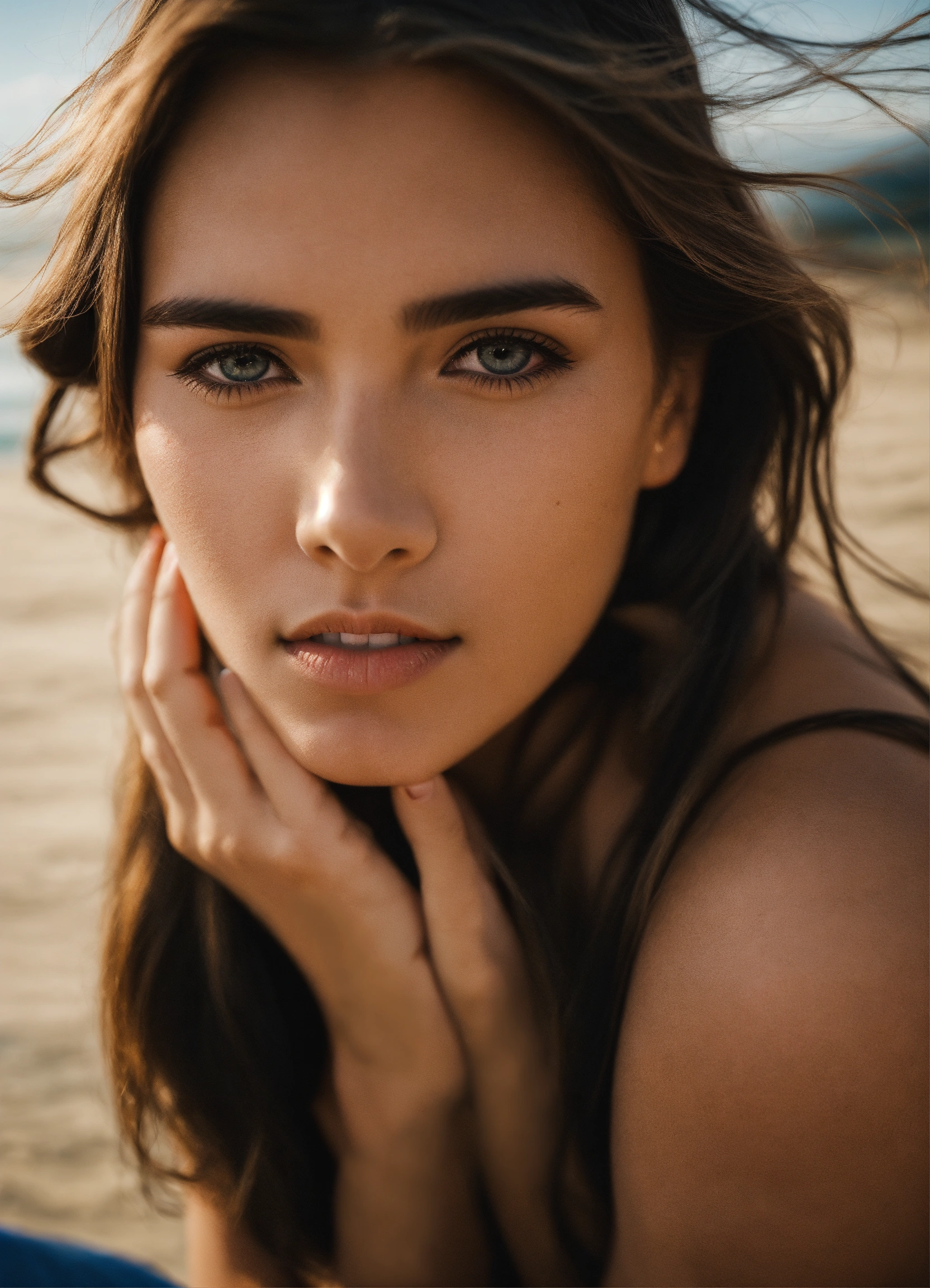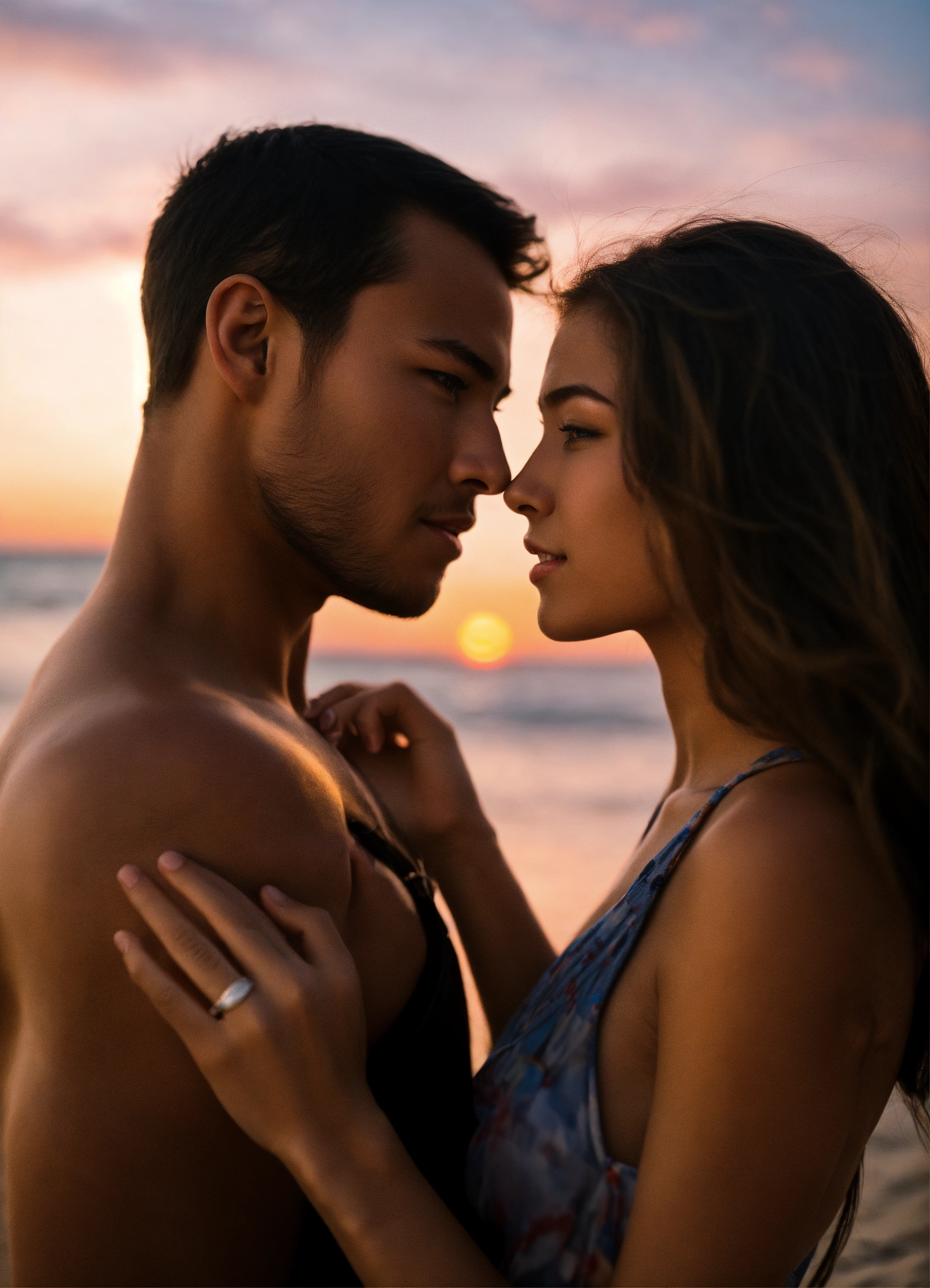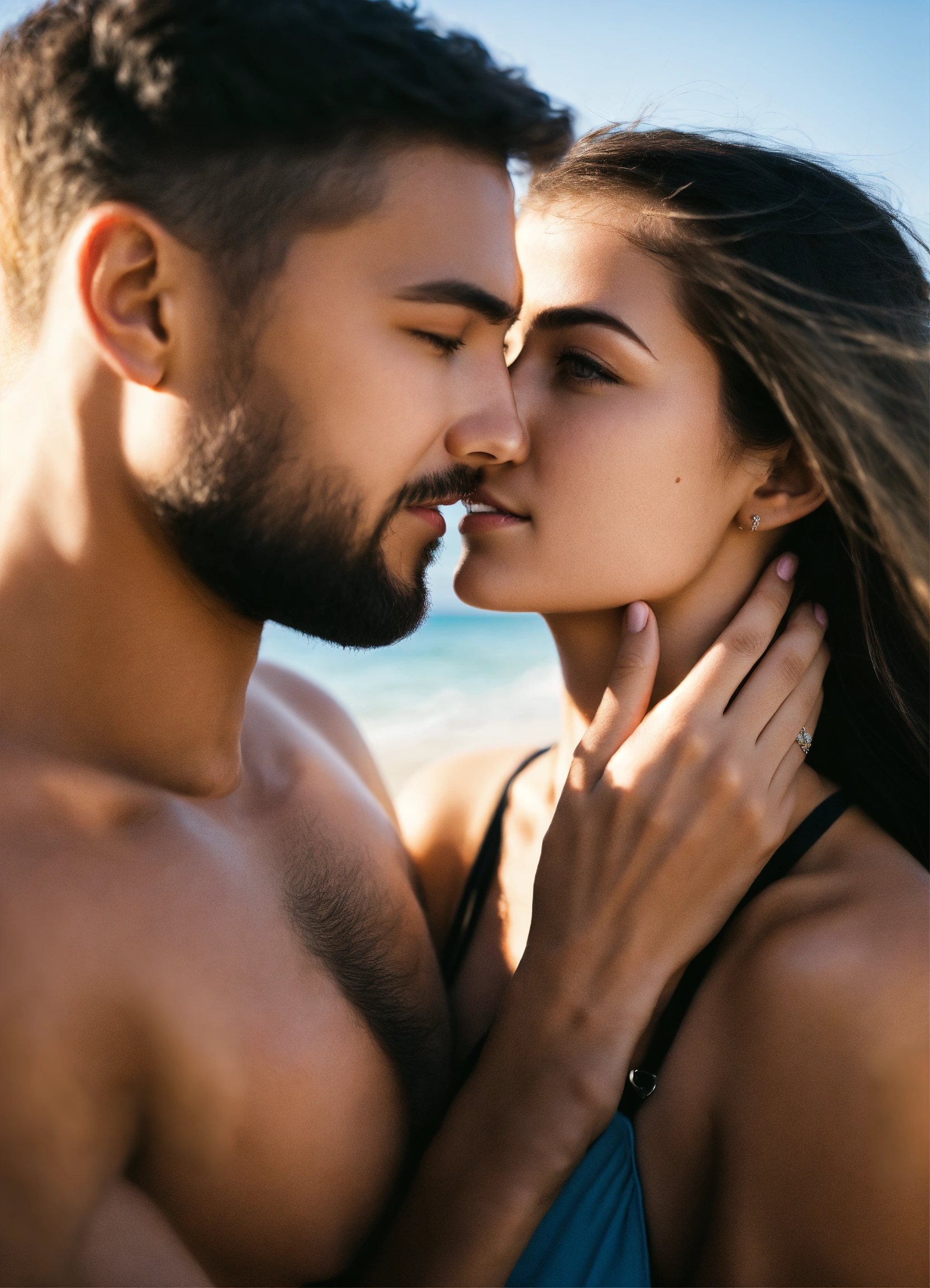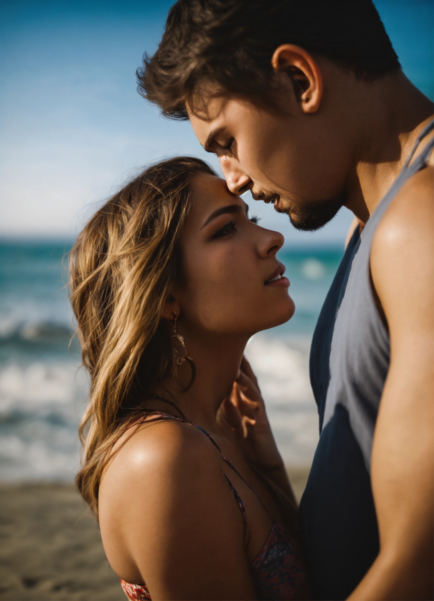 Man and beautiful girl, man's hands on her face, eye contact, at the beach, canon eos 5d, extremely detailed