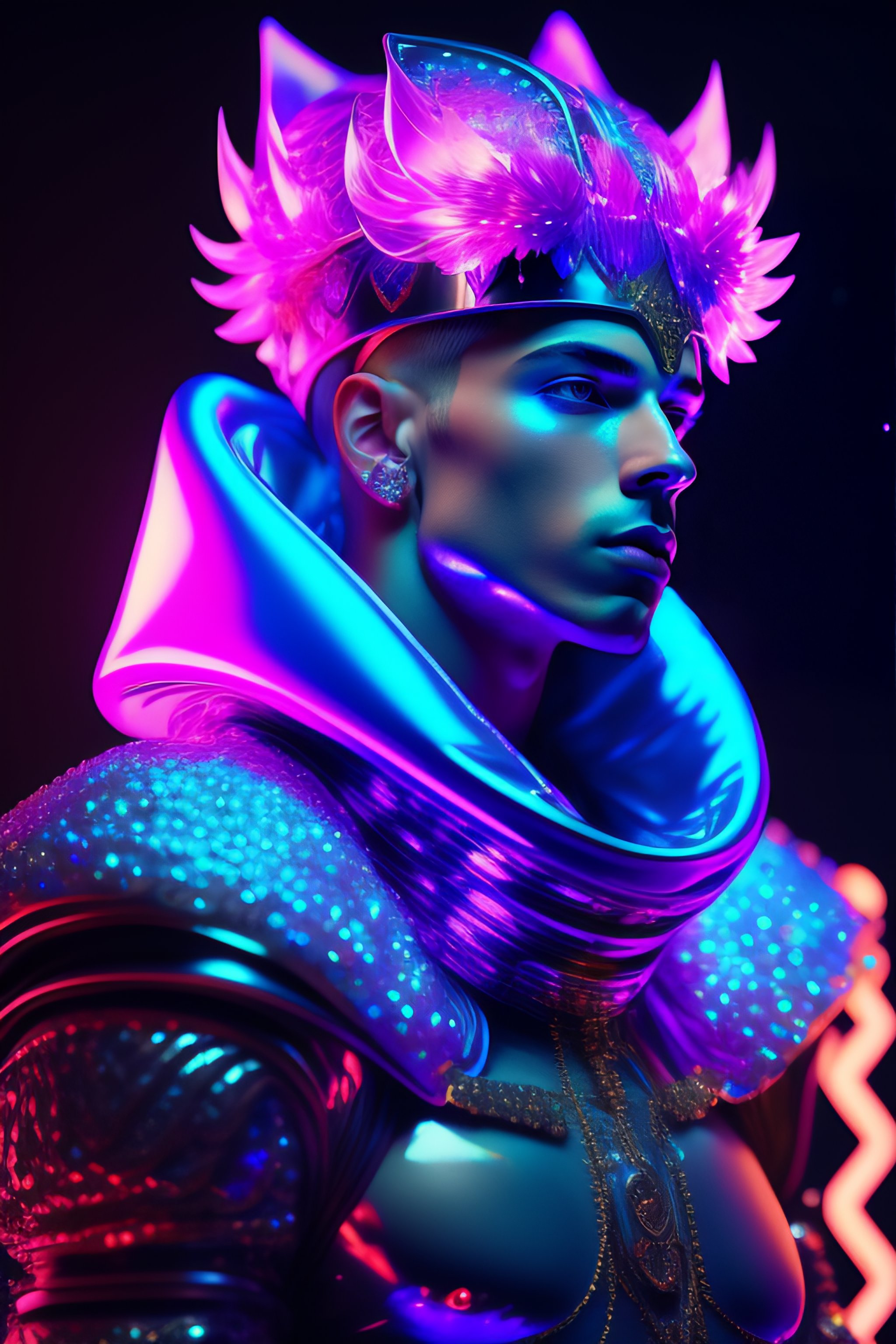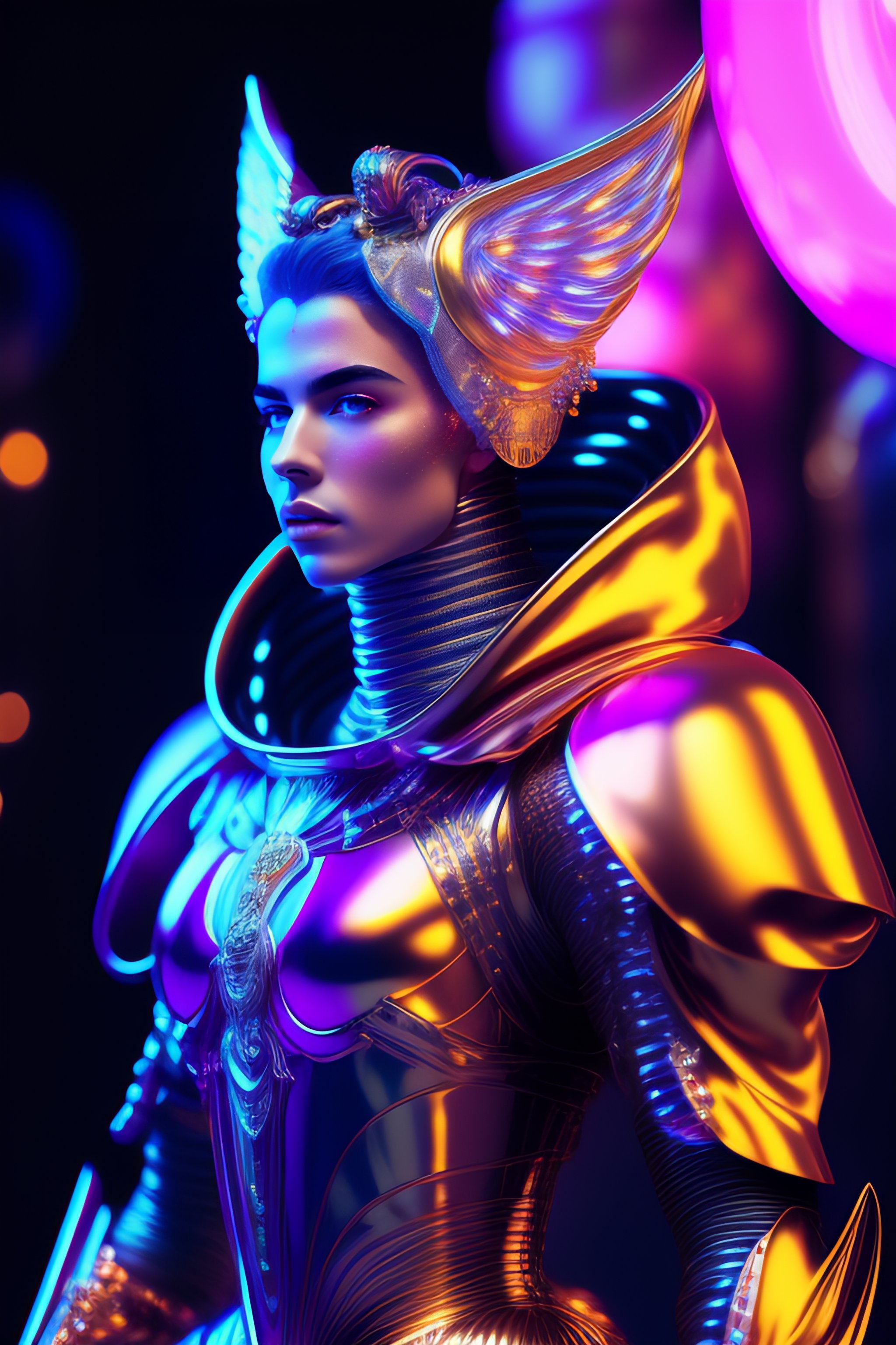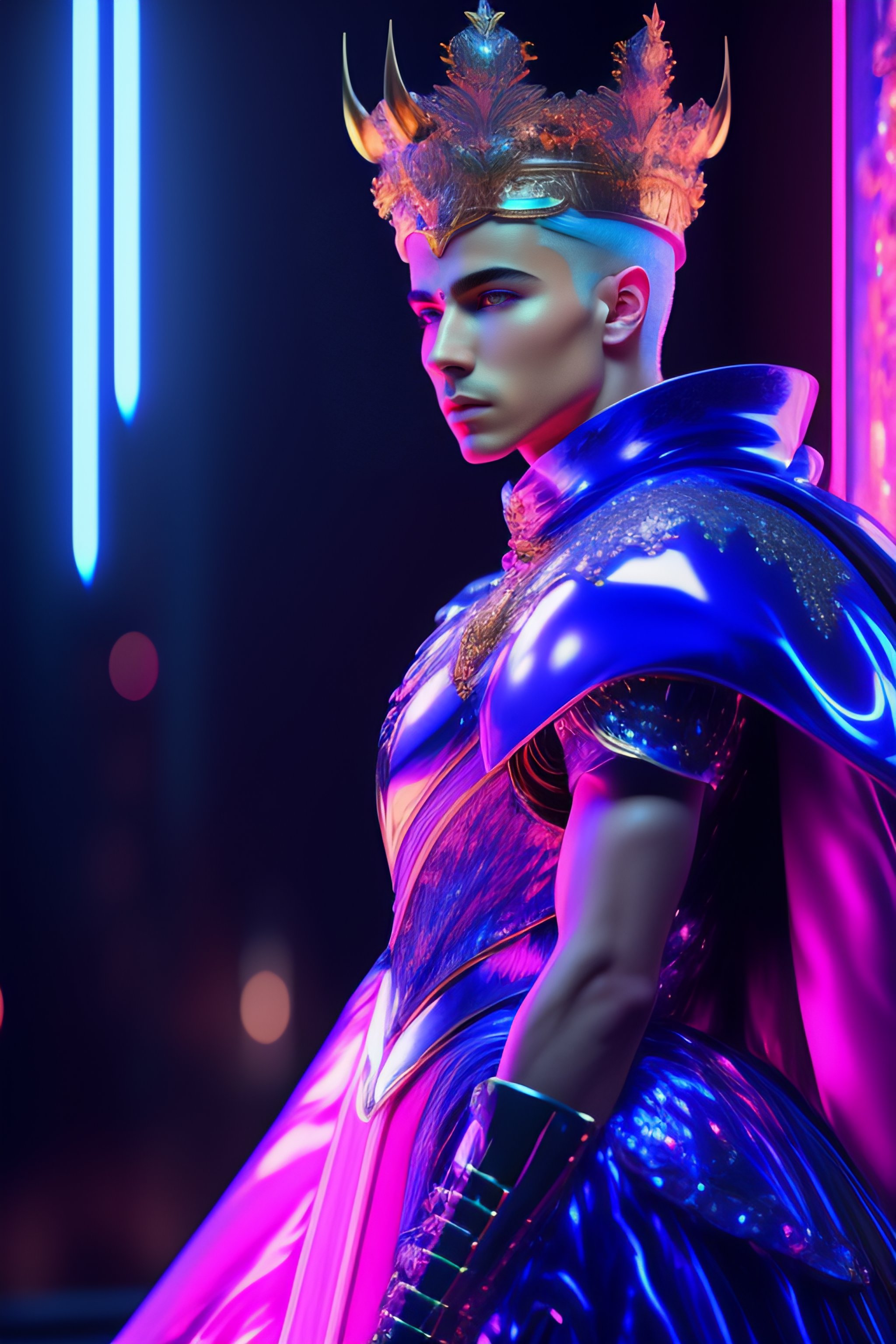 Full-body rococo and cyberpunk delicate neon crystalline sculpture of young muscular golden albino prince joe jonas as an blue iridescent humanoid deity wearing peach plastic hooded cloak holding a human skull in a black castle dungeon, reclining, glowing pink face, crown of pink lasers, large blue diamonds, swirling black silk fabric. futuristic elements. oozing glowing liquid, full-length view. space robots. intricate artwork by caravaggio. trending on artstation, octane render, cinematic lighting from the right, hyper realism, octane render, 8k, depth of field, 3d