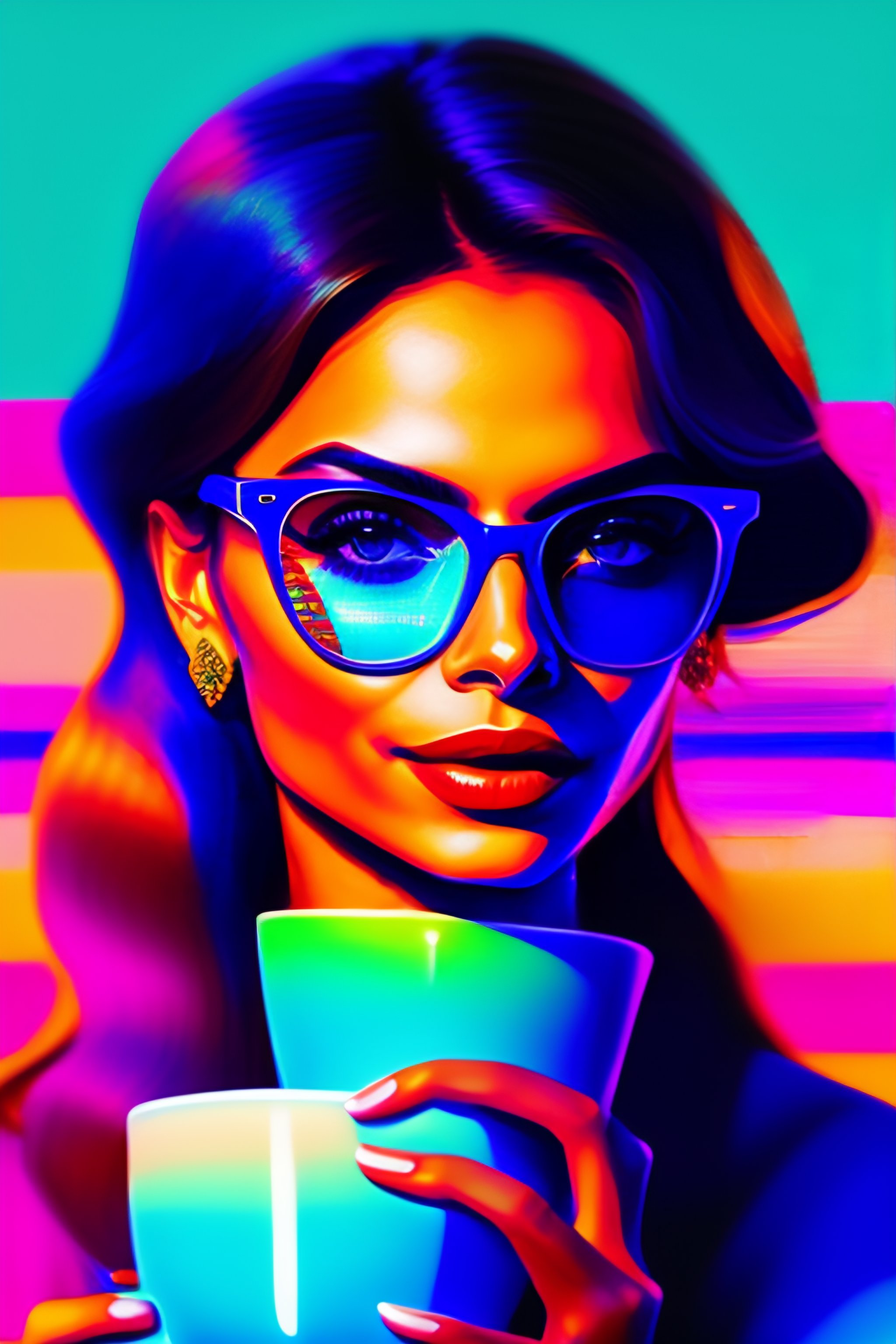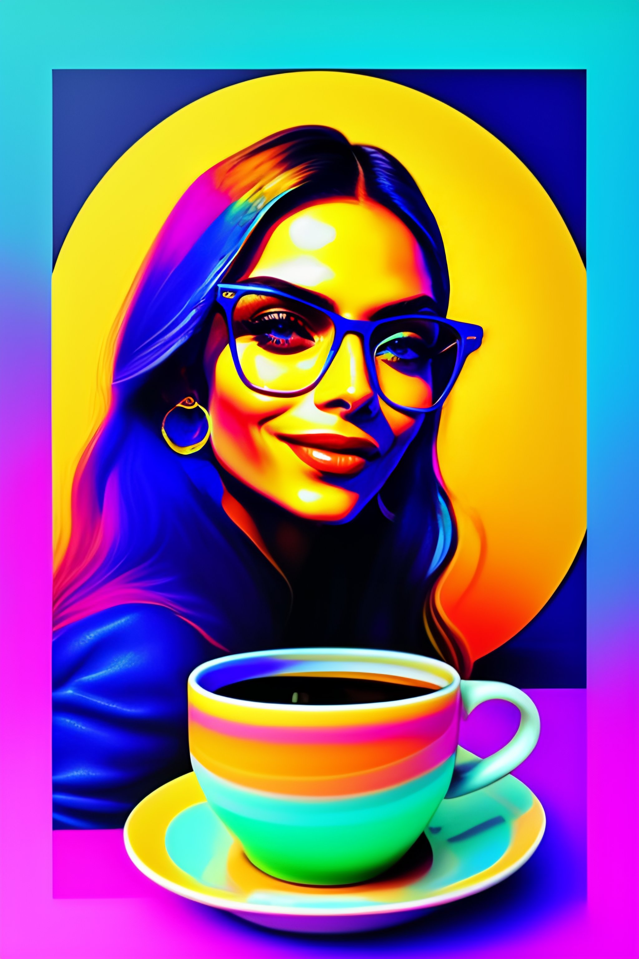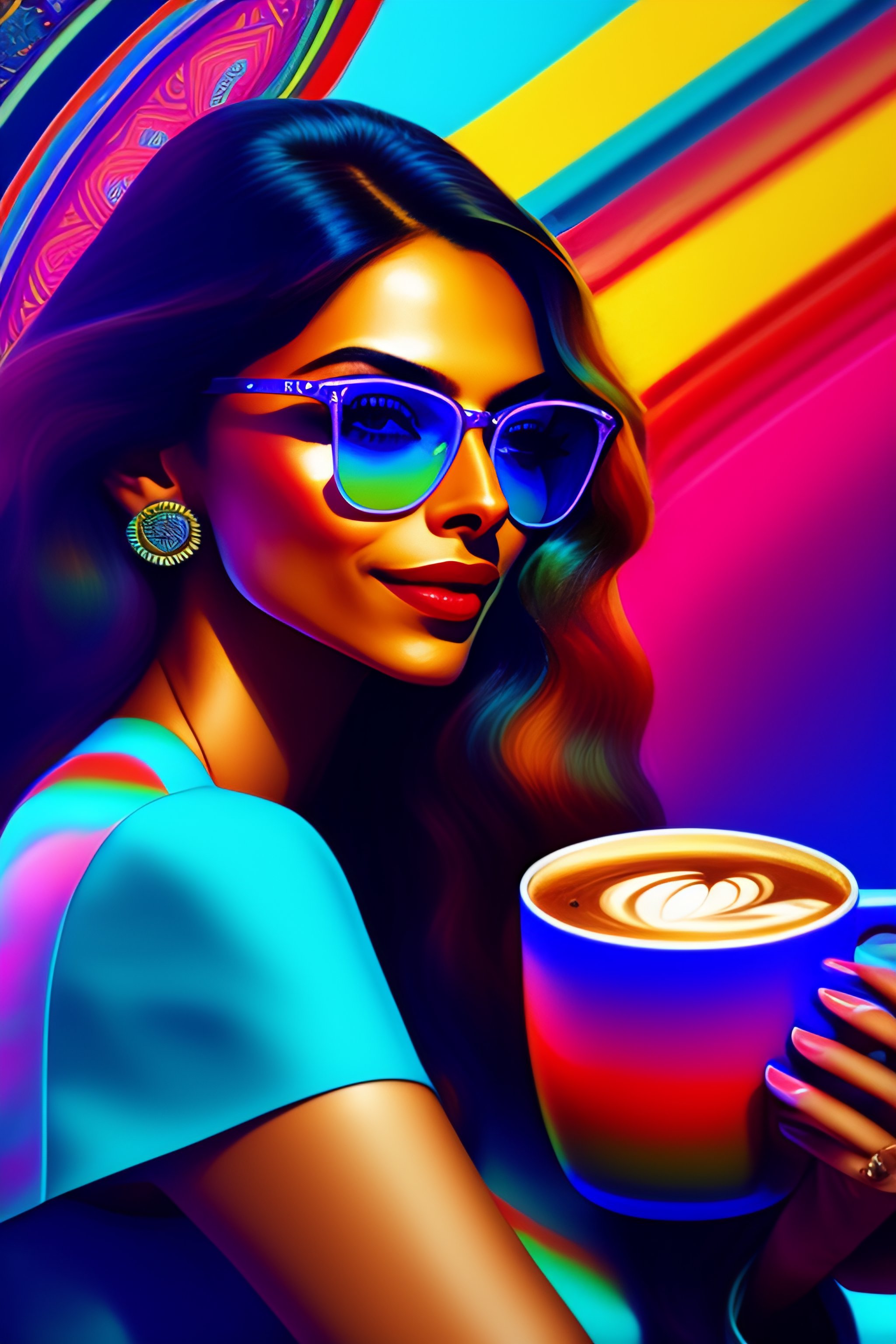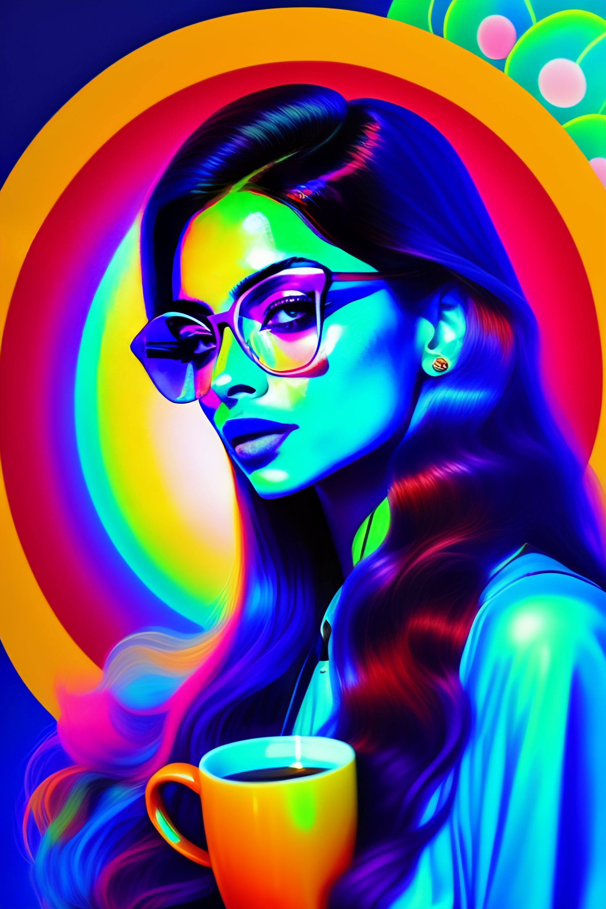 Cute girl in blue dress blonde deepika padukone hair black wayfarer glasses sitting psychedelic patterns inside cafe holding cup of coffee with background art feminine mid shot