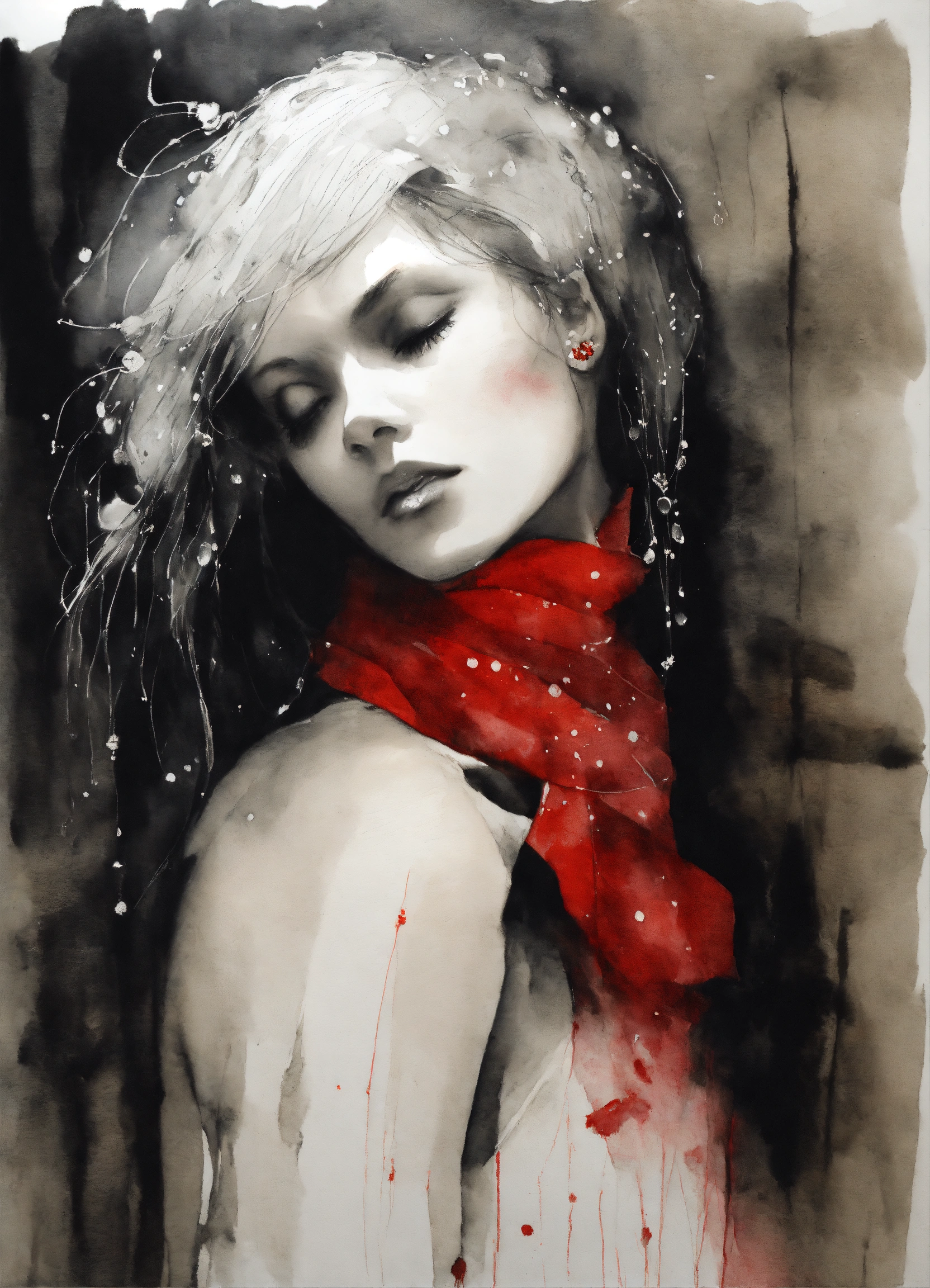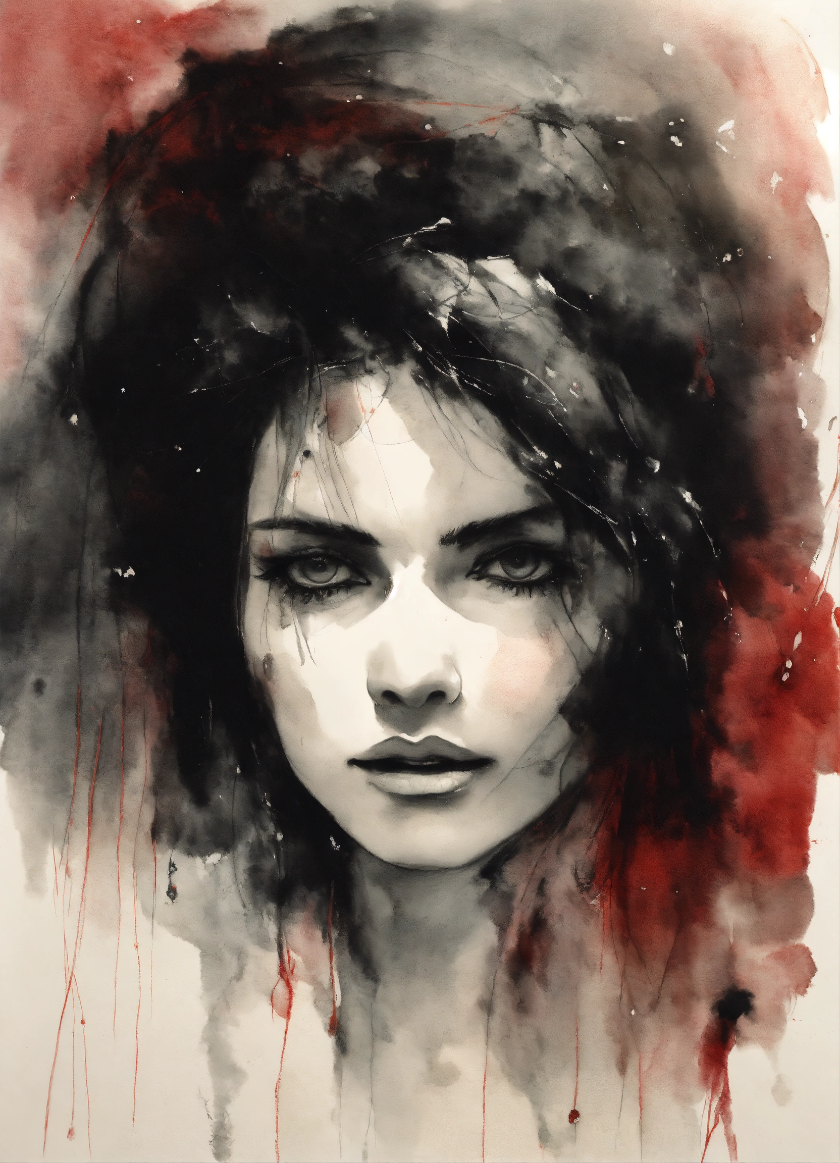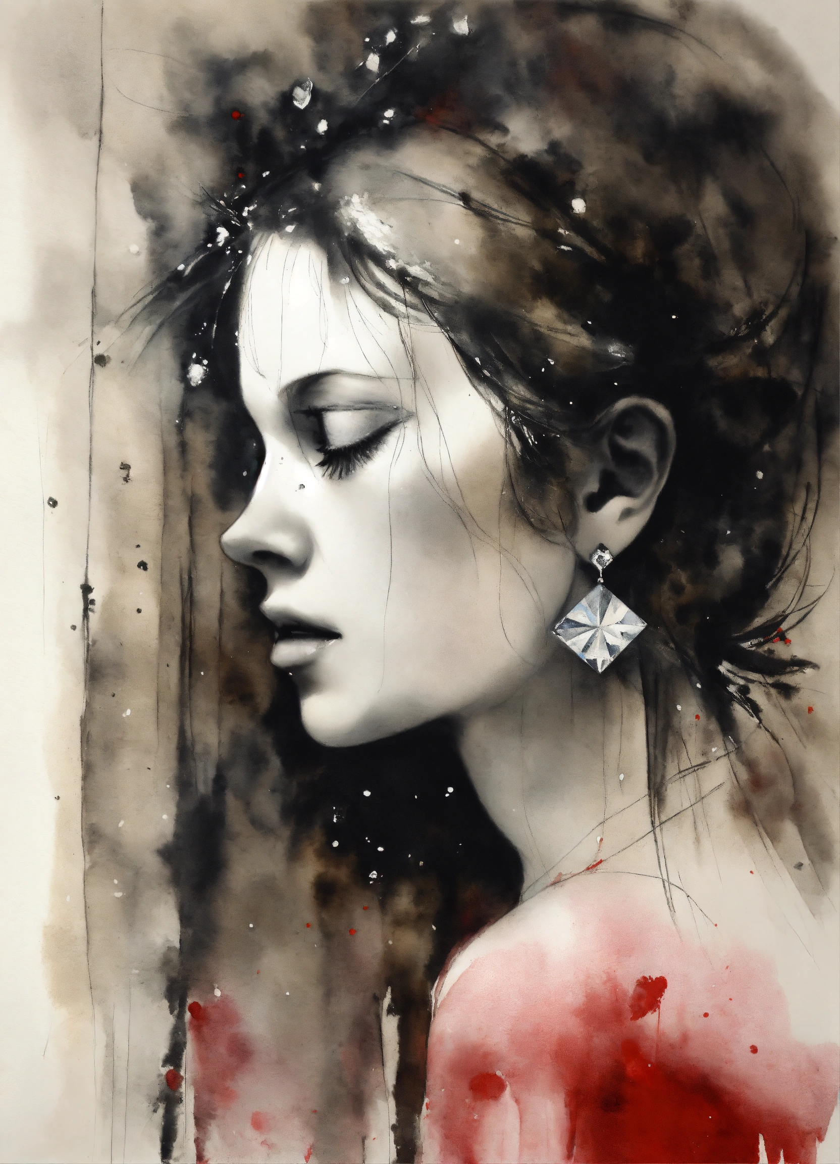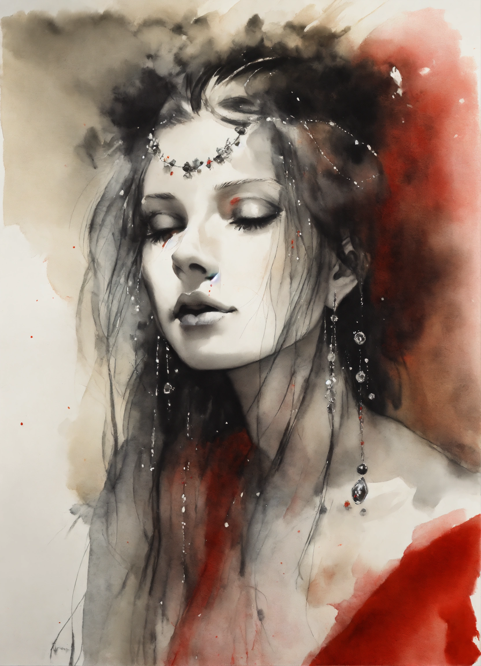 Stephen gammell style, dessin, aquarelle, aquarelles, noir et blanc et rouge, de marais, de sombres créatures, dégoulinan, woman with diamonds in her hair thinks about the seaside