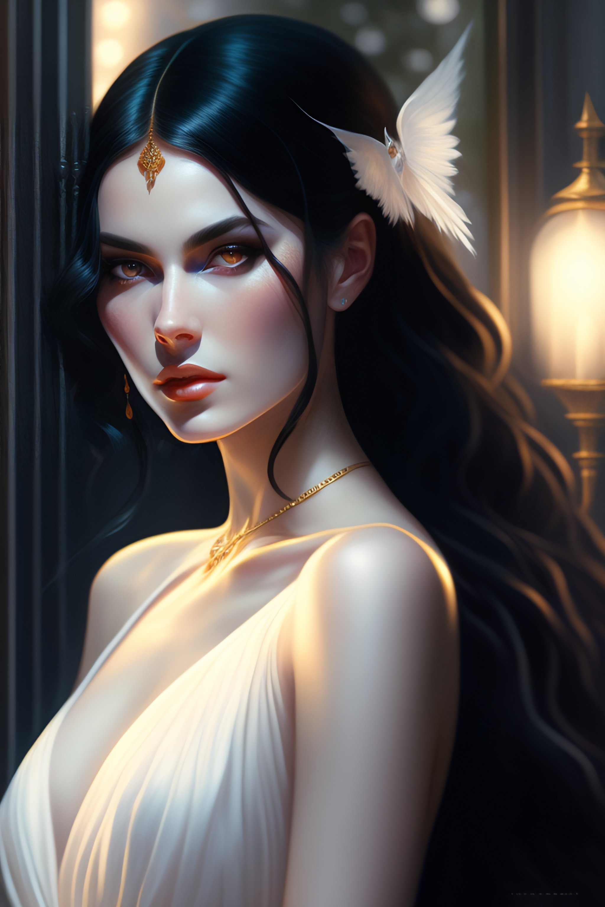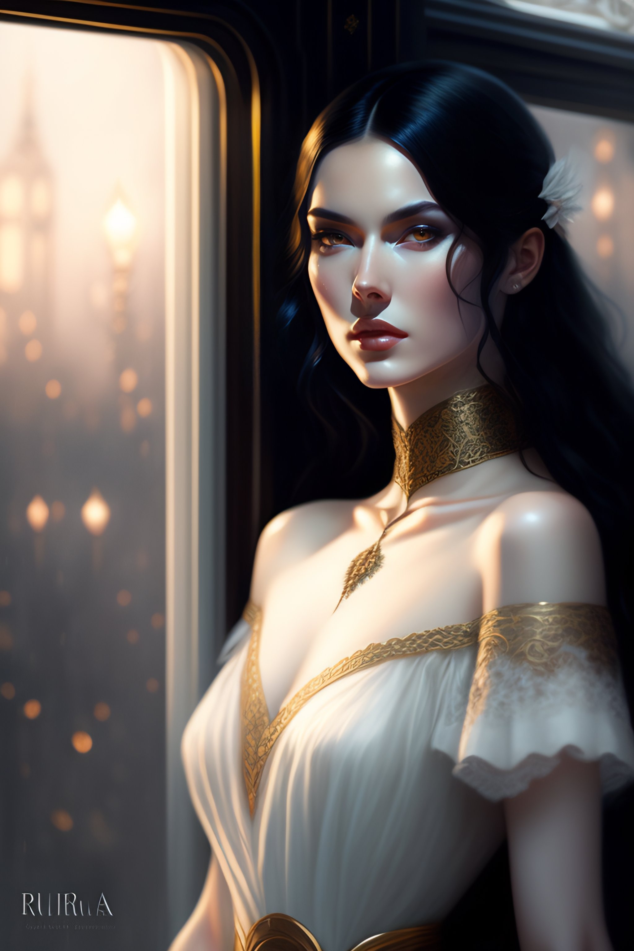 Black hair vampire woman, white skin, pale skin looking through the window, dress, dark light night, intricate, elegant, sharp focus, illustration, highly detailed, digital painting, concept art, matte, art by wlop and artgerm and greg rutkowski and alphonse mucha, masterpiece