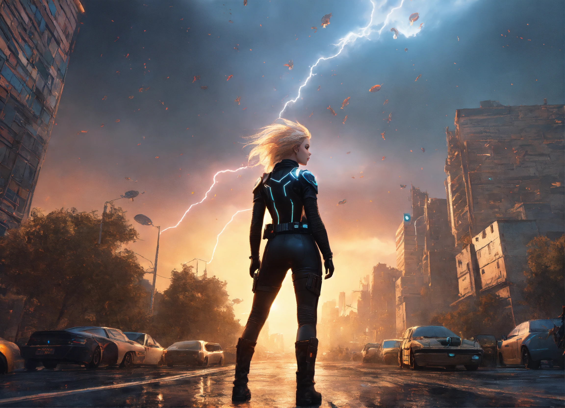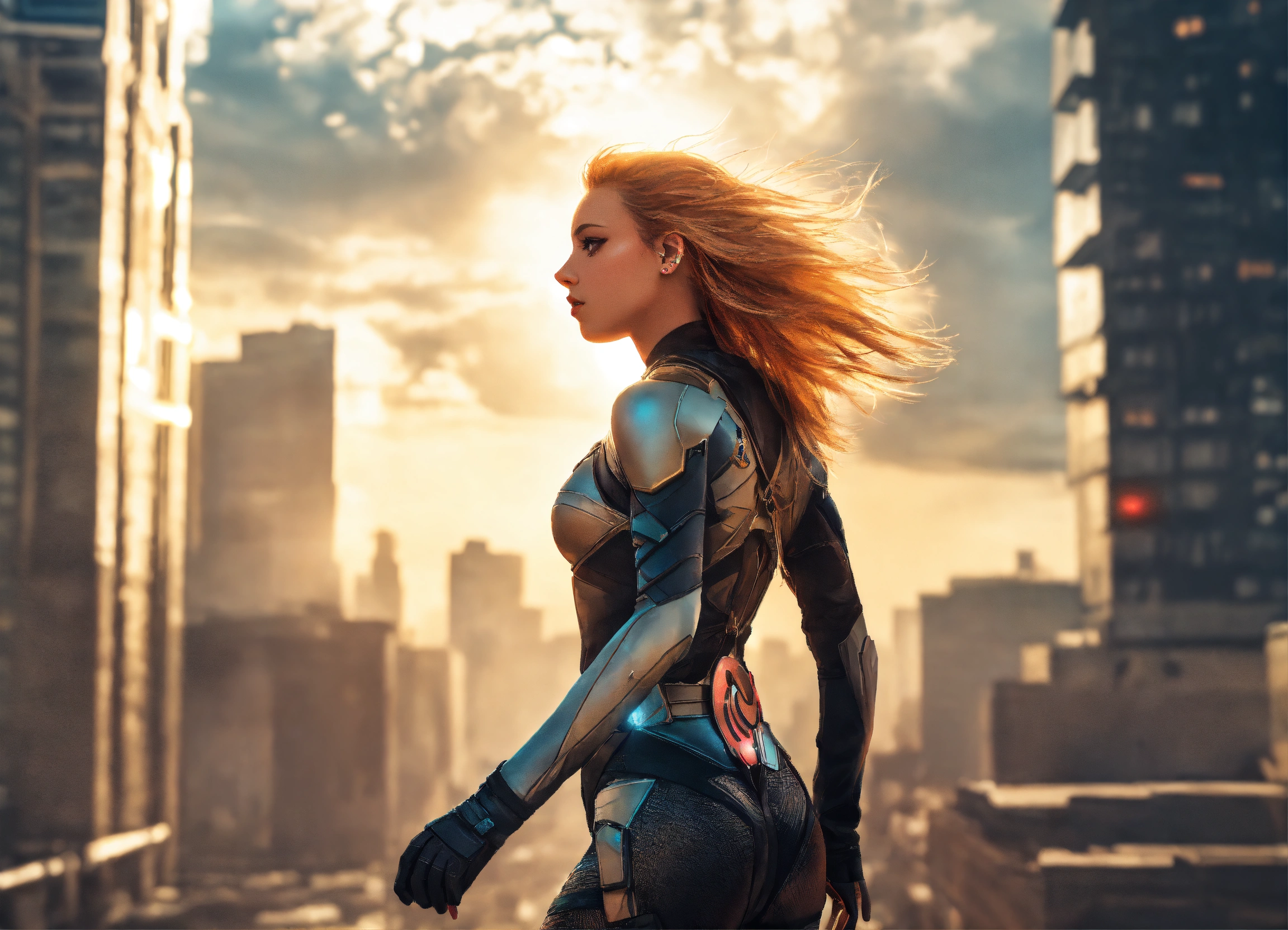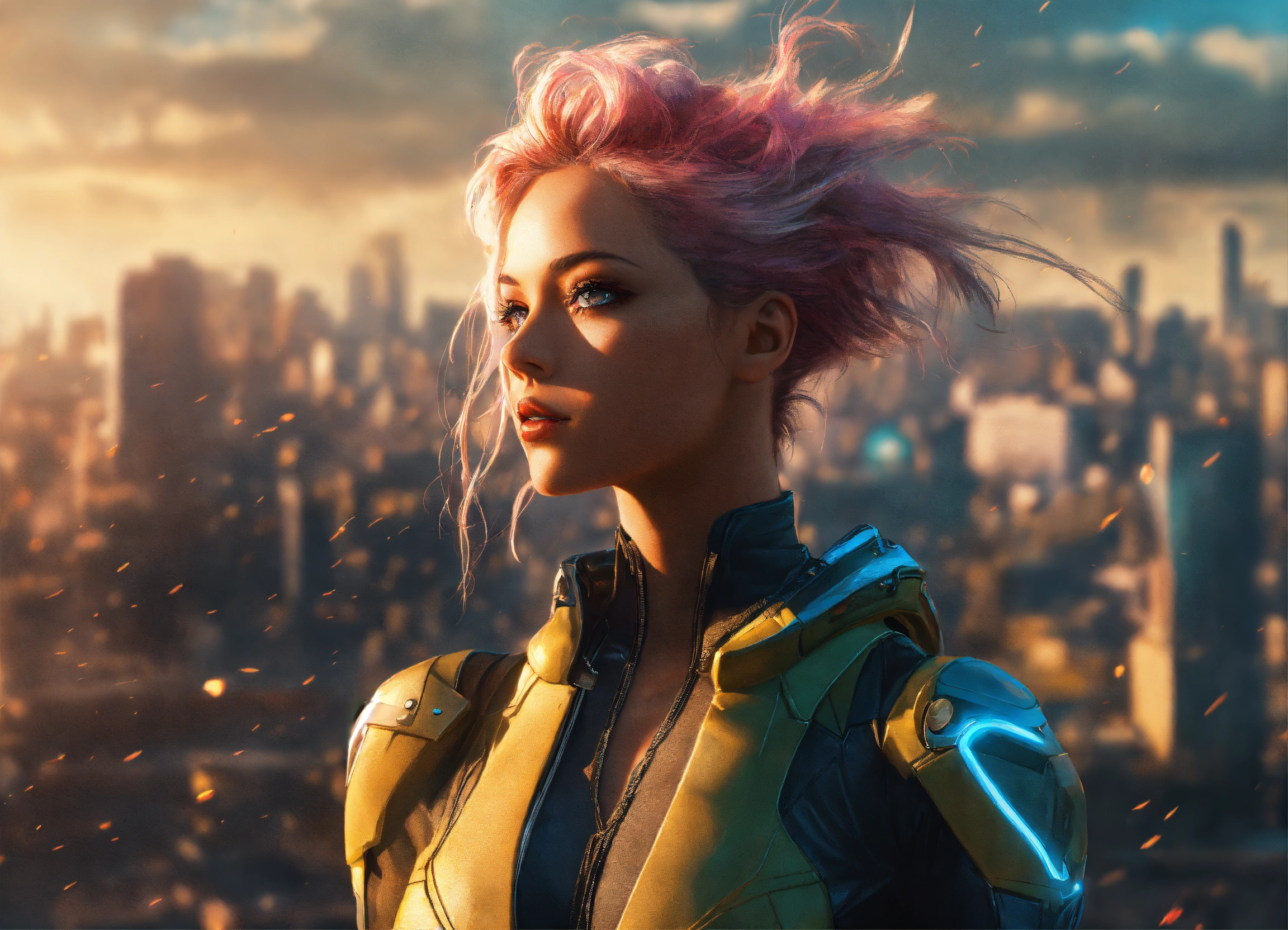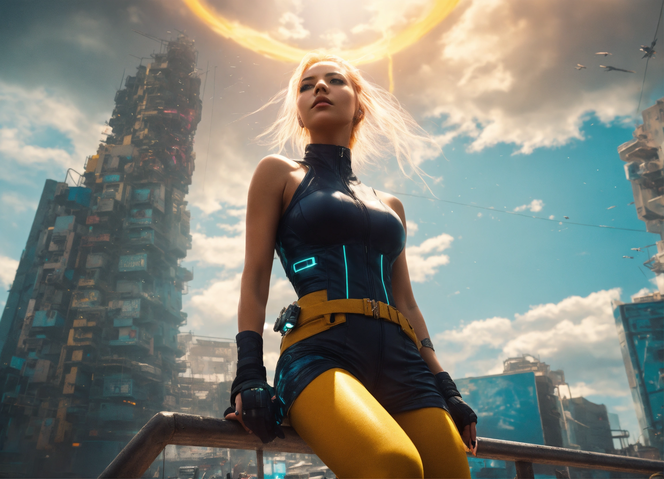 Worms eye view full body high detailed photo realistic natural photo cyberpunk dream girl, futuristic, sunny weather. x-men storm