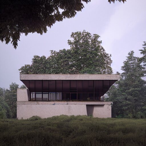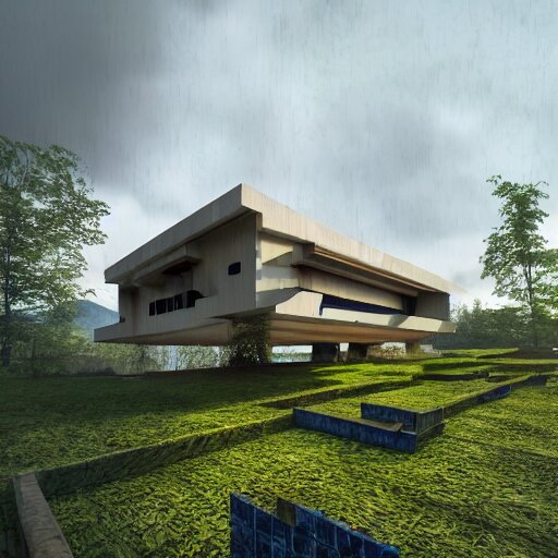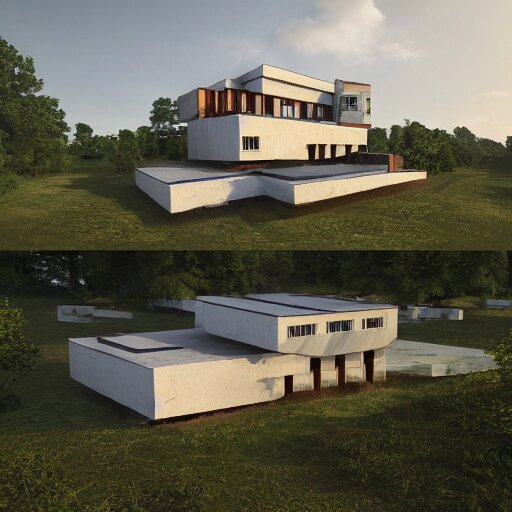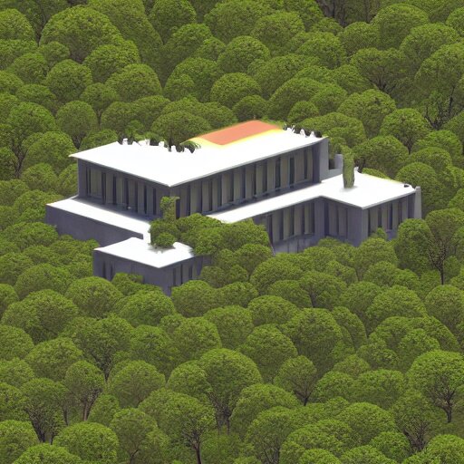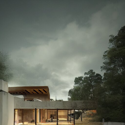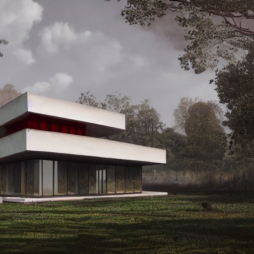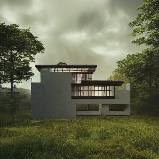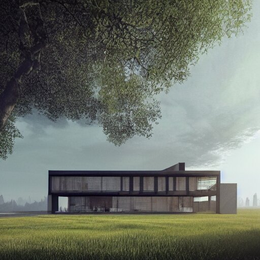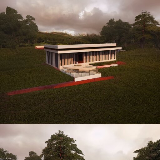 Rectangular modernist house inspired by a tibetan palace, atrium, two levels, in a field, big trees, clouds, dramatic lighting, artstation, matte painting, raphael lacoste, simon stalenhag, frank lloyd wright, drone view