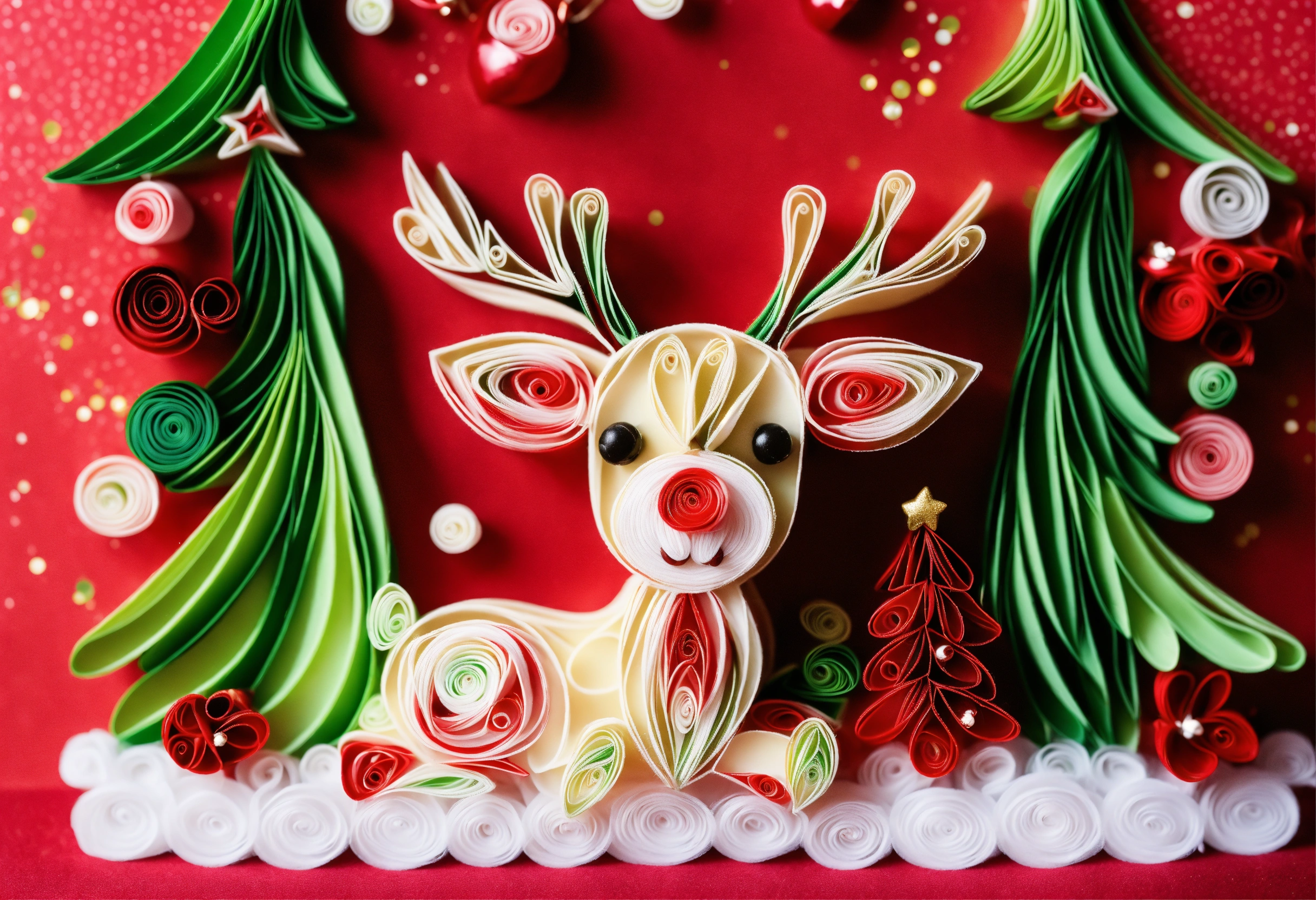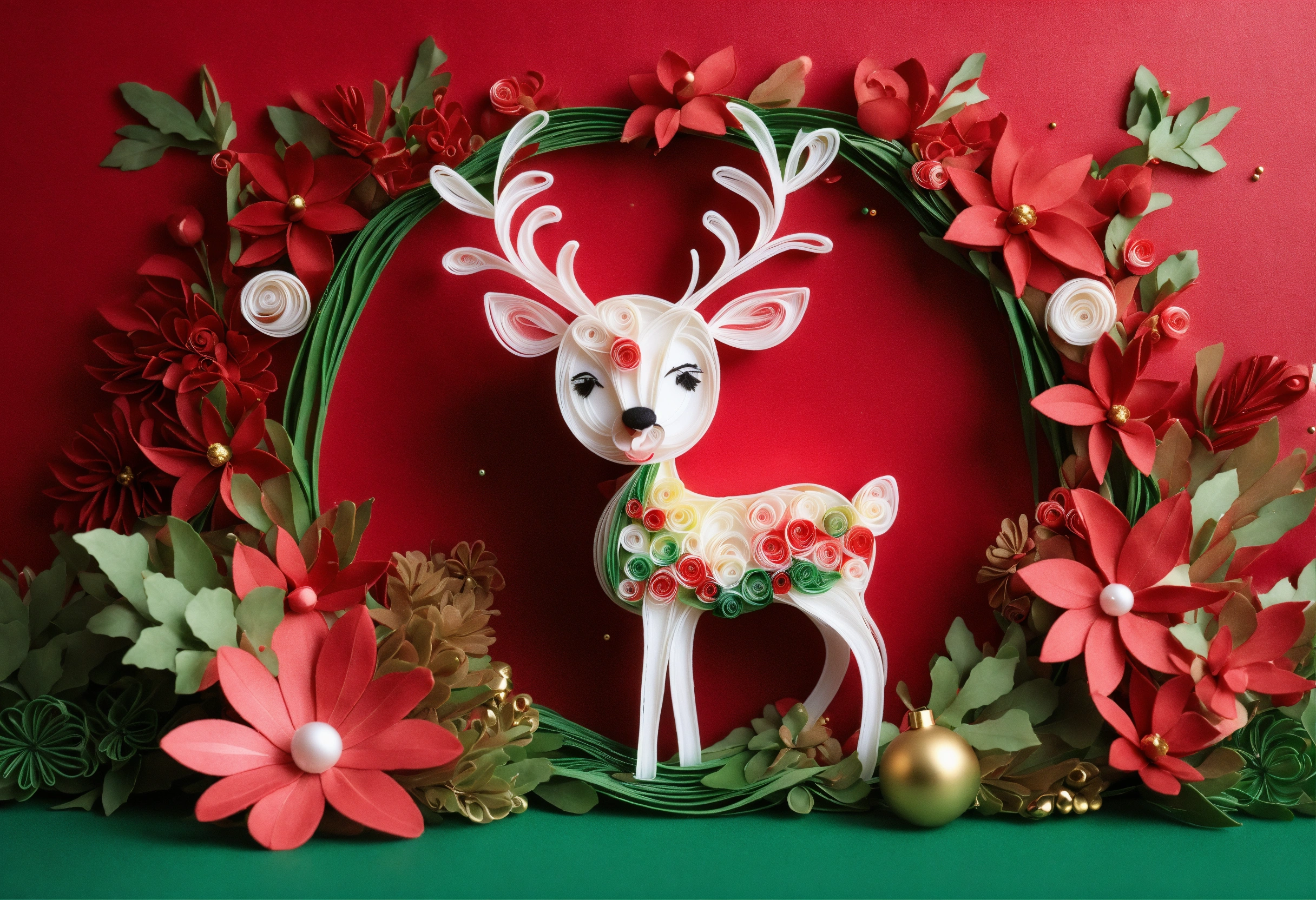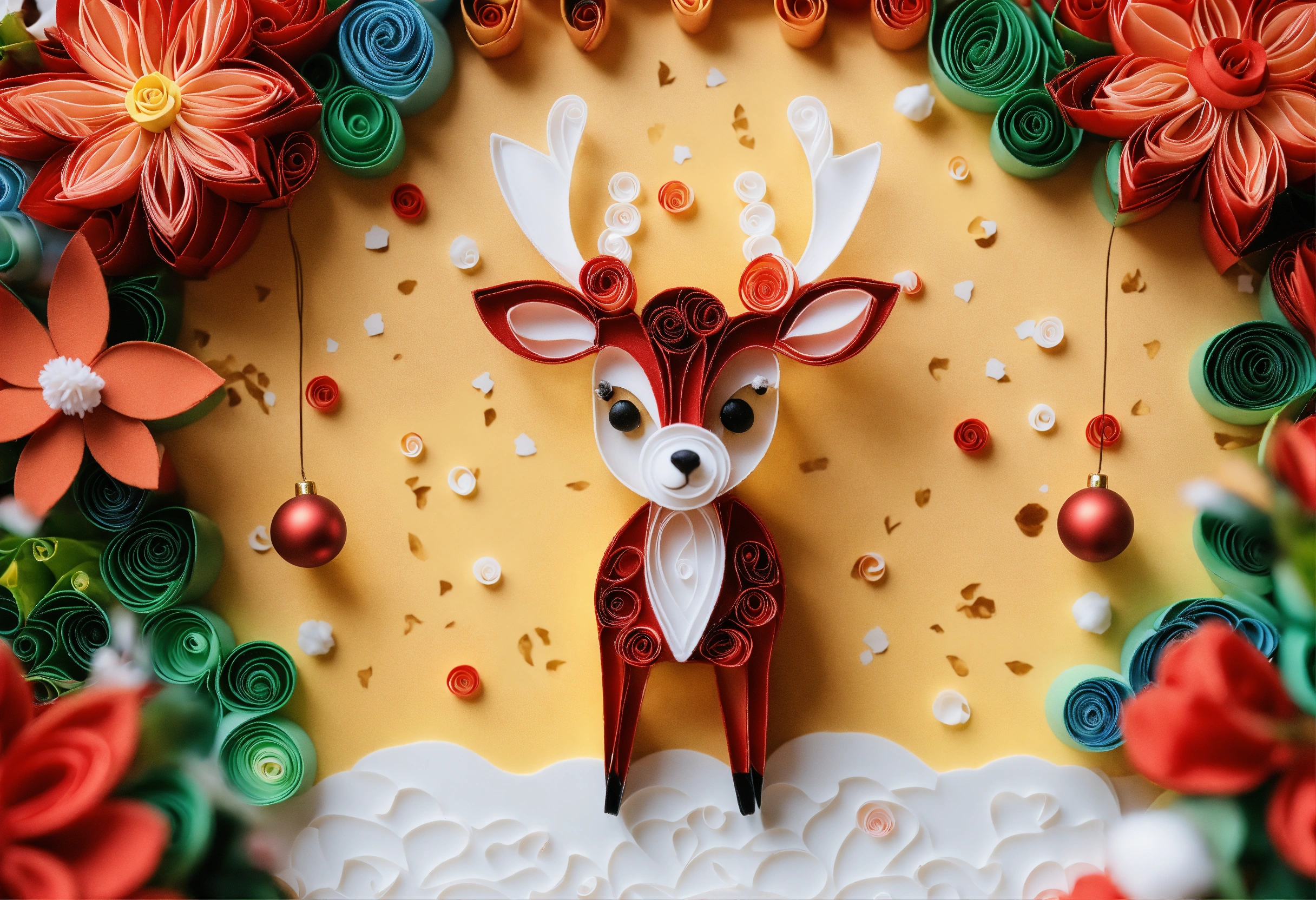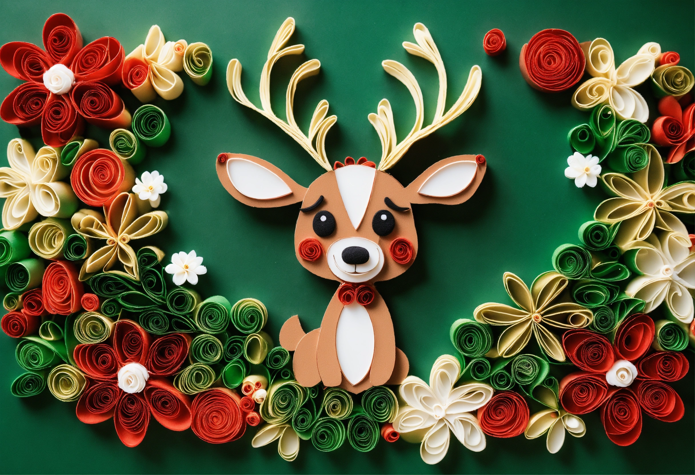 Christmas streamered 3d quilled background with puffy flowers and one very cute smooth happy friendly baby reindeer smooth popping out of center,
