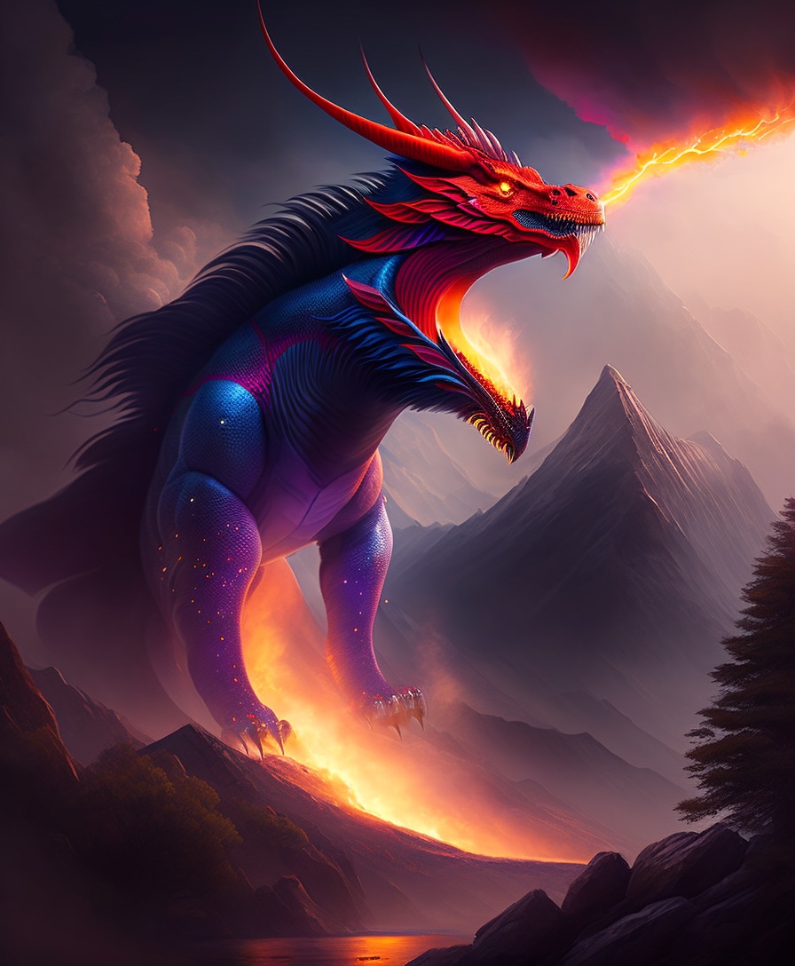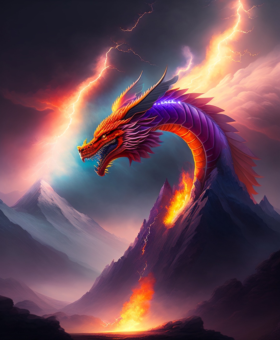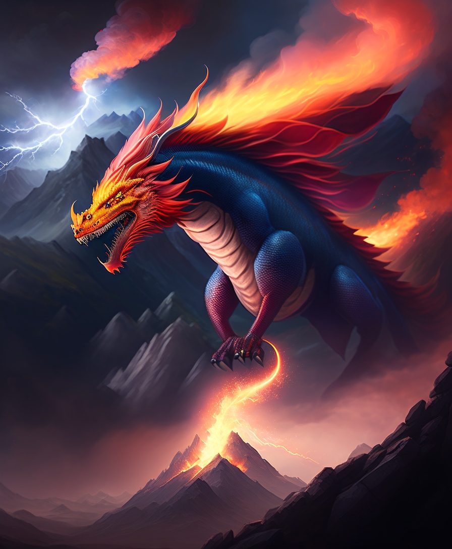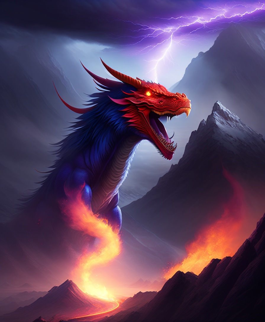 A fire dragon appearing from the dangerous lightning strikes on a mountain at far away distance, looking dangerous and fierce