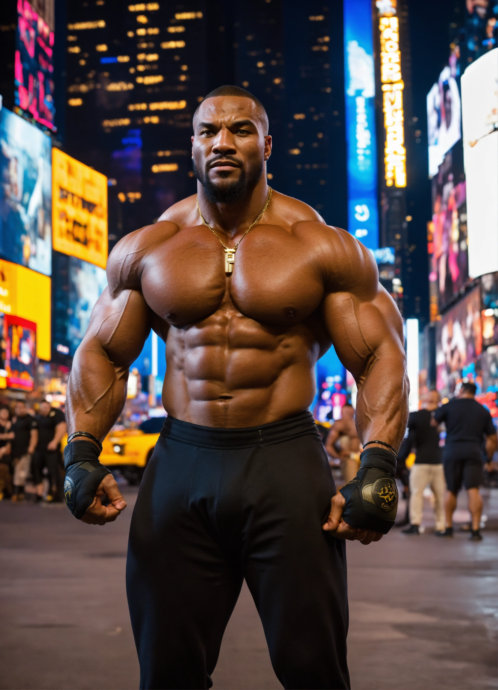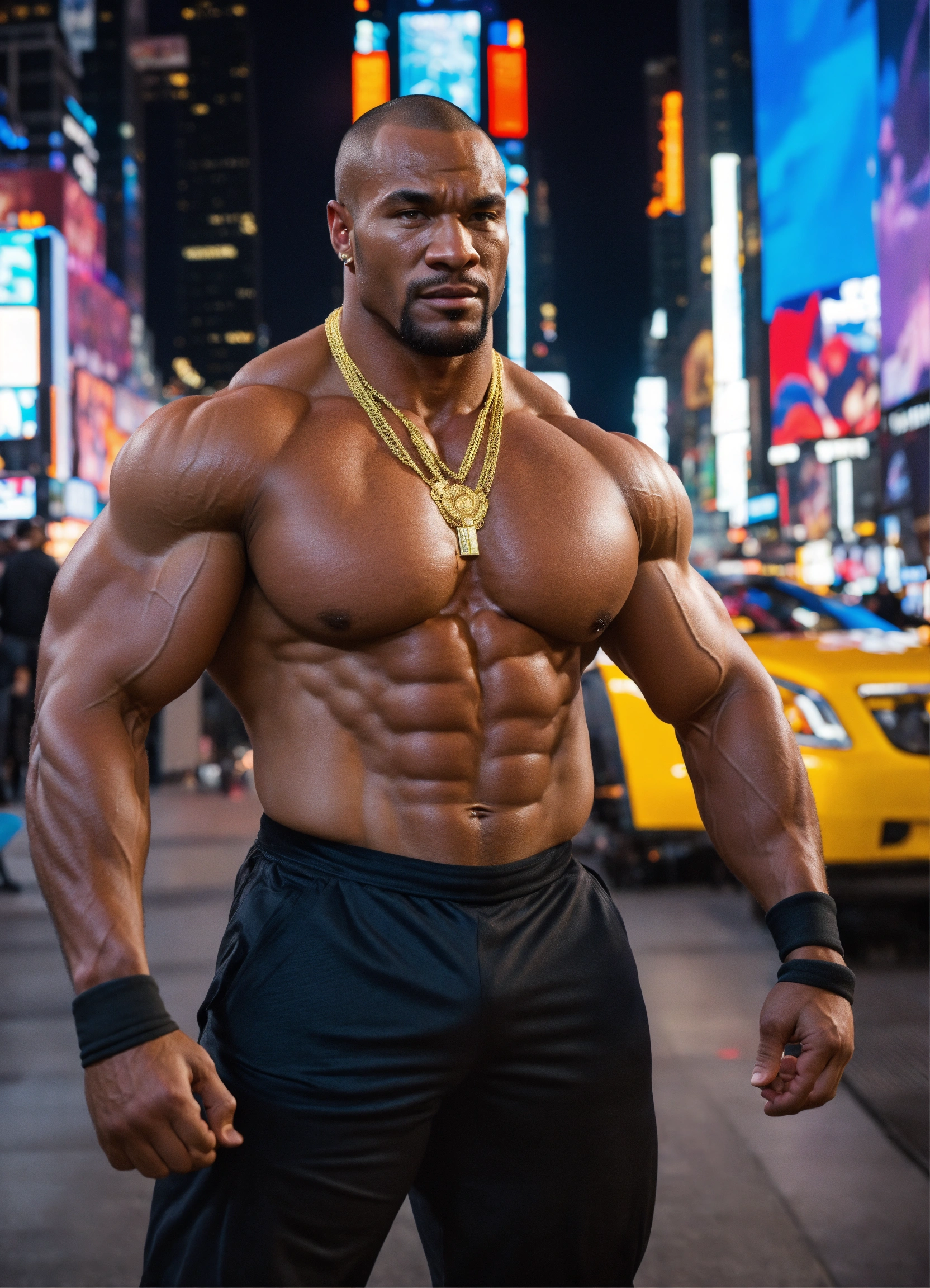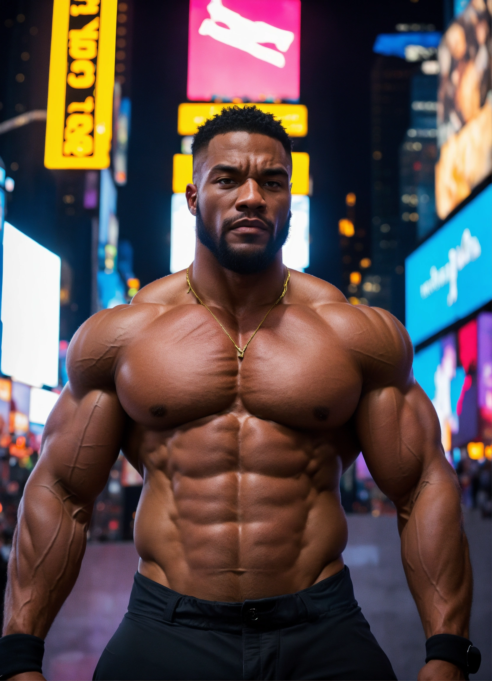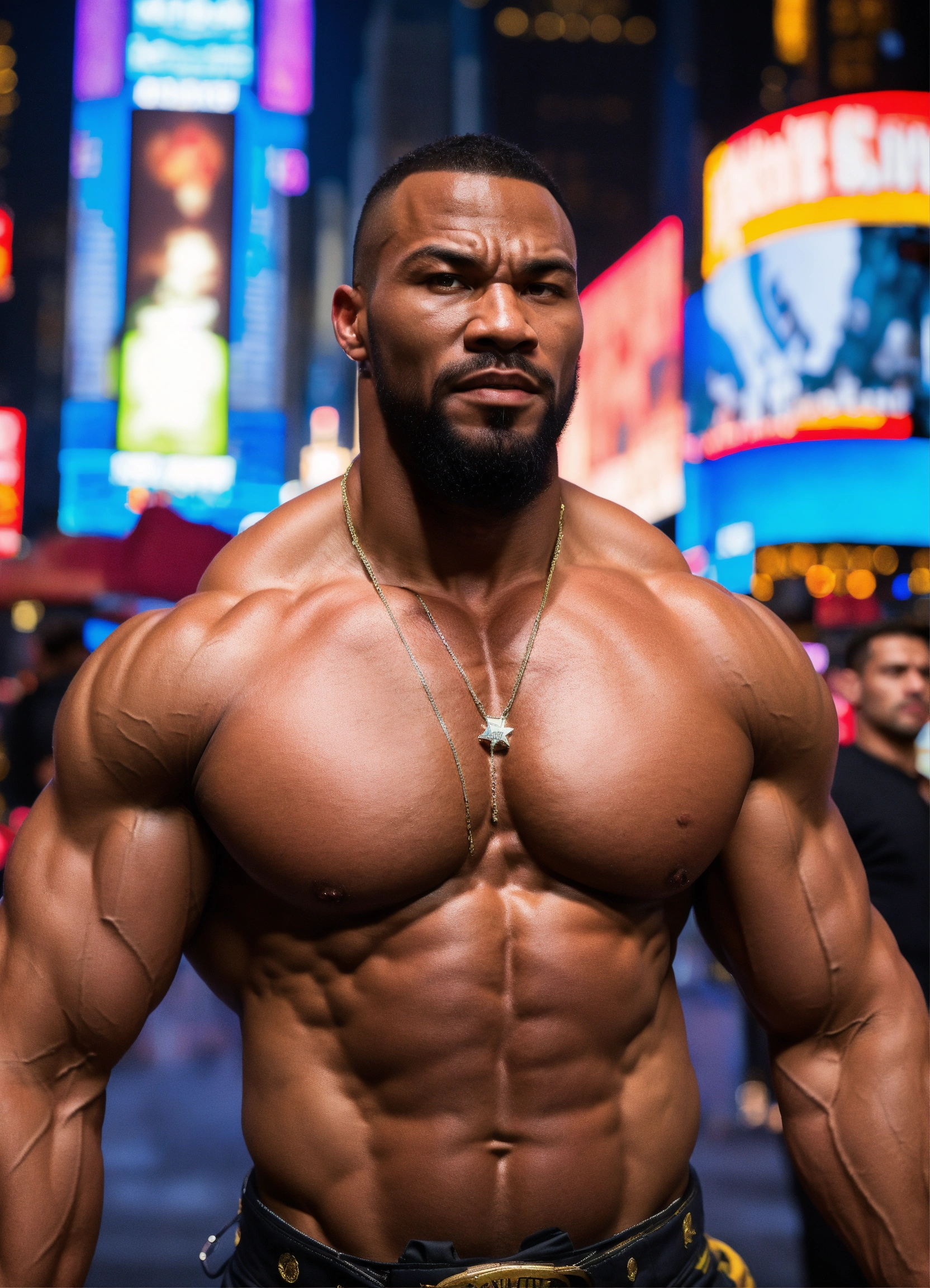 30-year-old man with big muscles, kano from mortal kombat, big bodybuilder, body like a wrestler, in times square at night