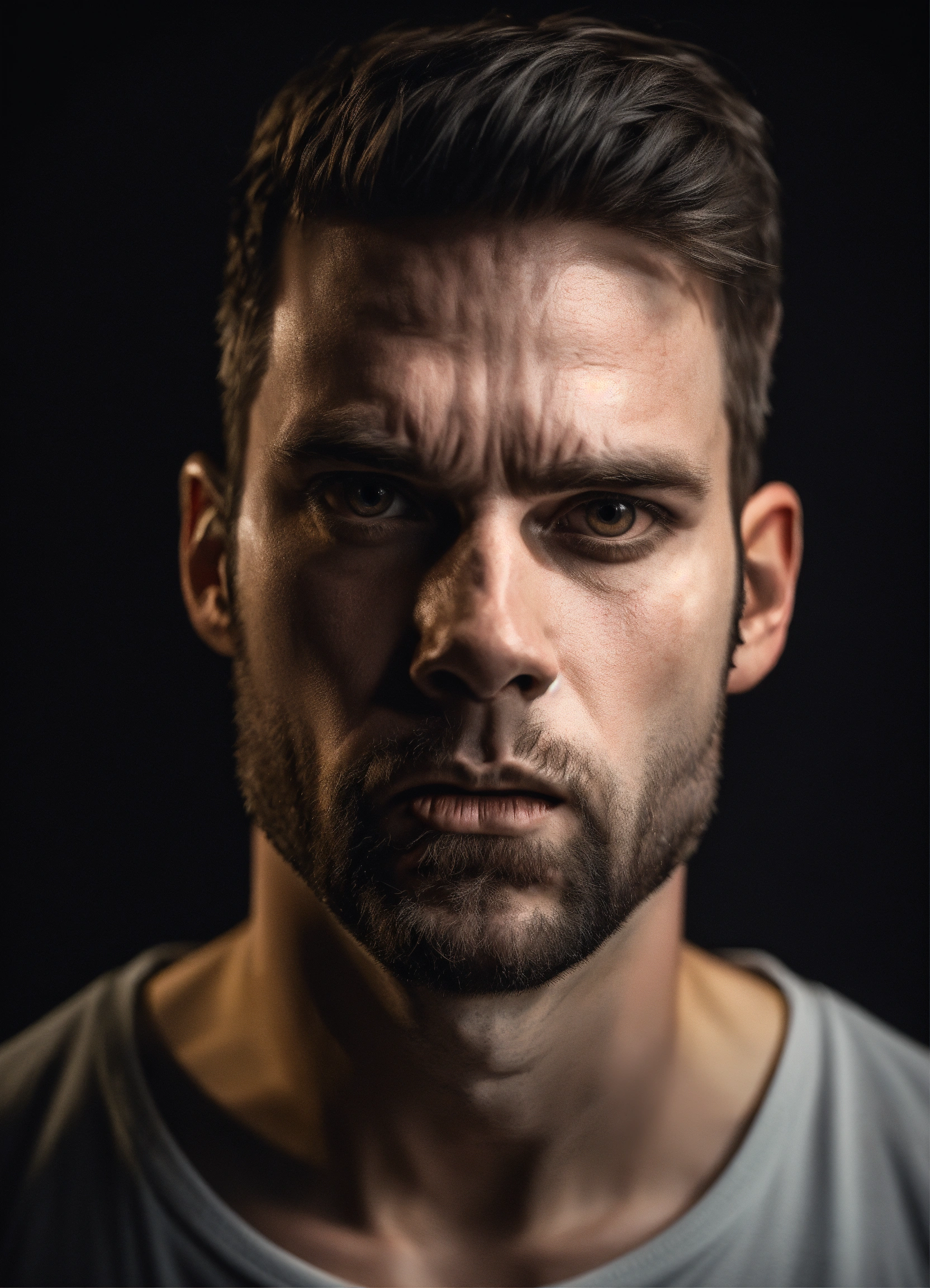 A photograph of a white menacing 30-year-old man, with a hatred expression, creepy face, baronail traits, wide jaw, deep eyes, wearing a black polymer t-shirt, very strong body, very dramatic illumination, hyperdetailed, hyperrealistic, 8 k