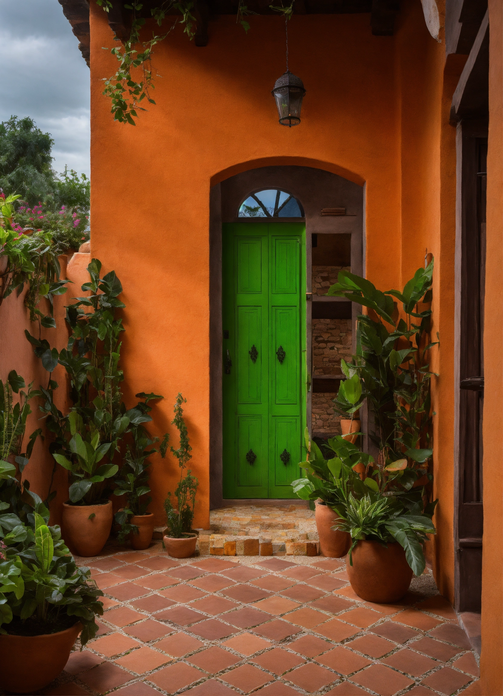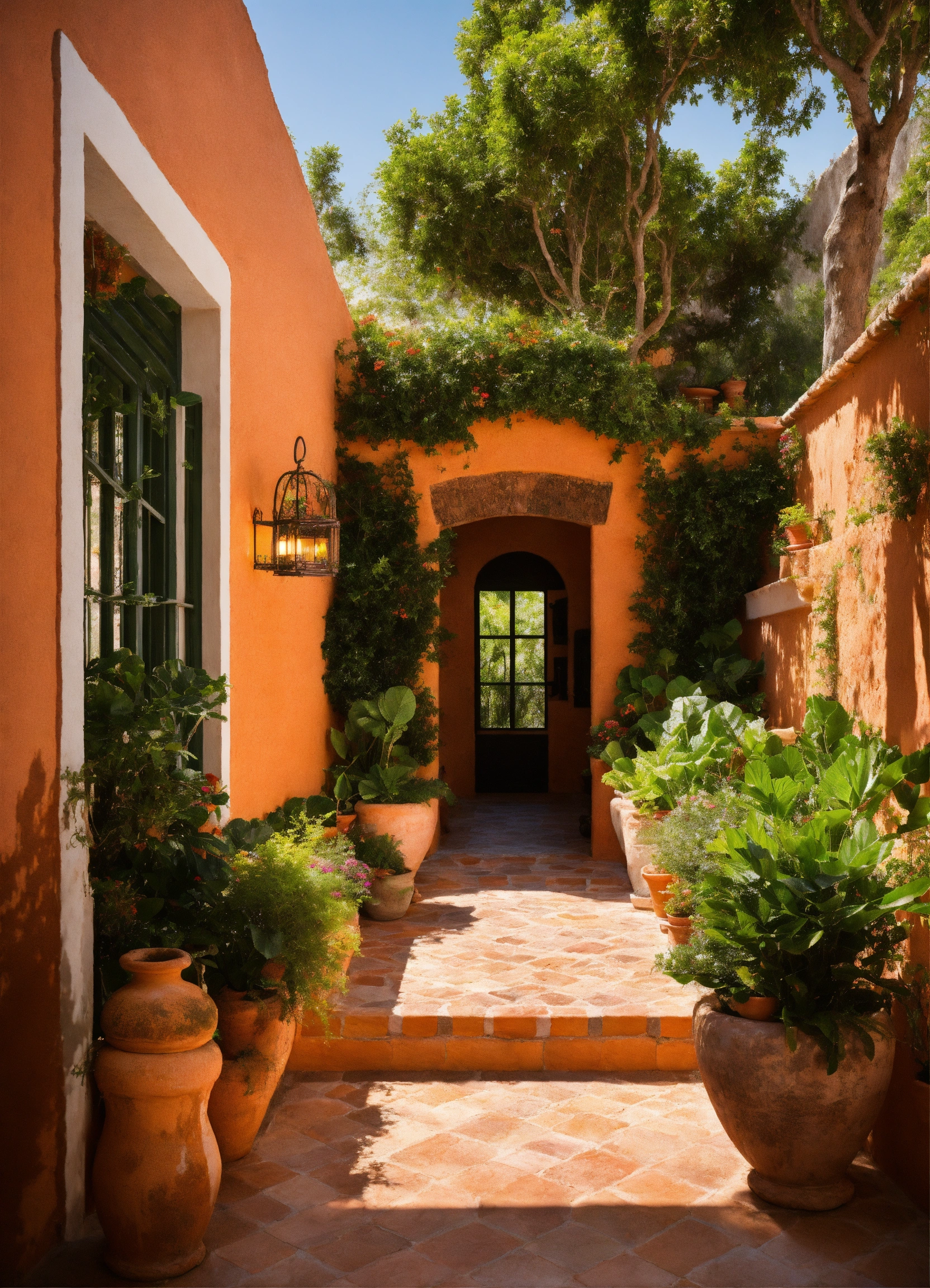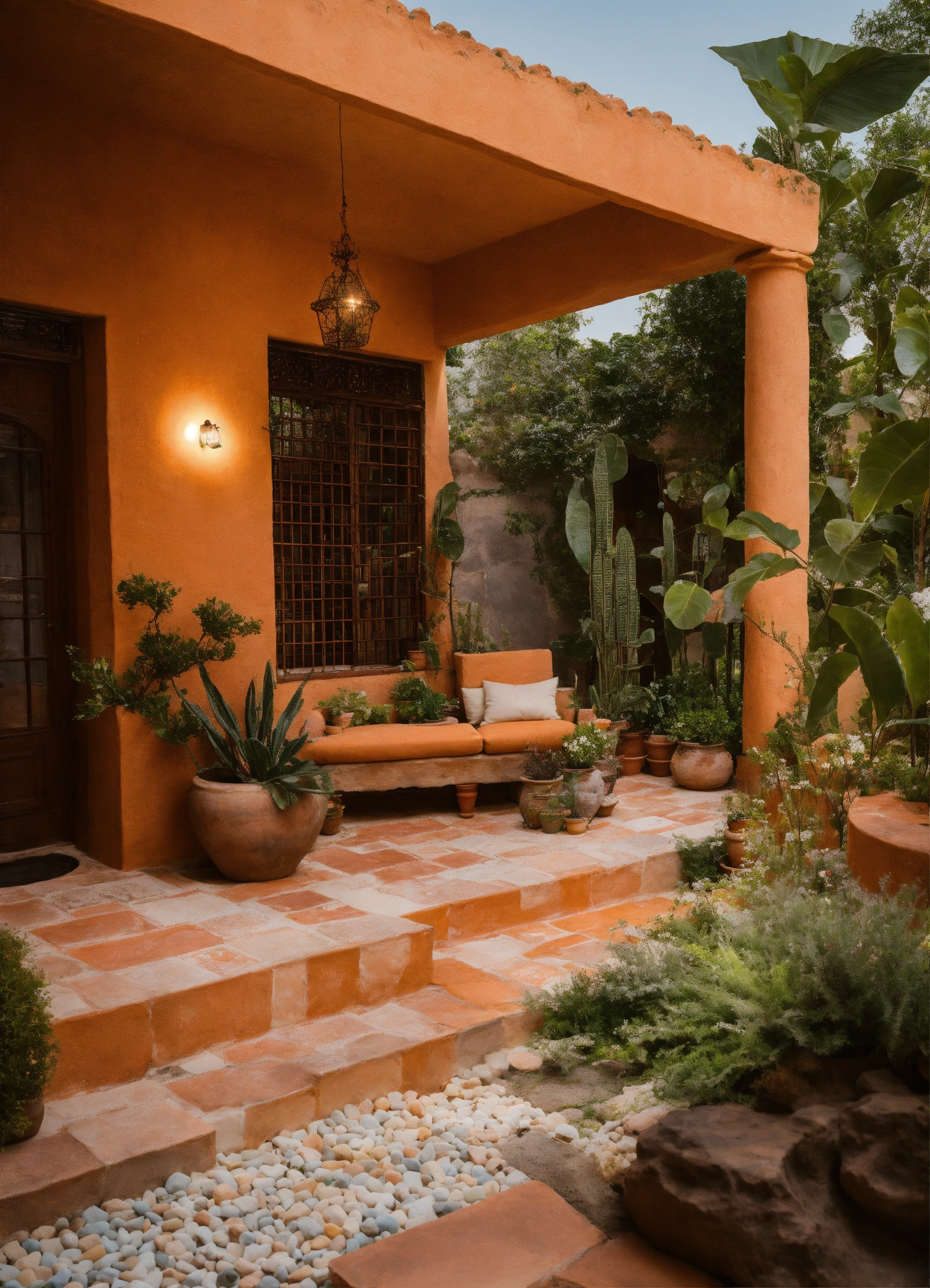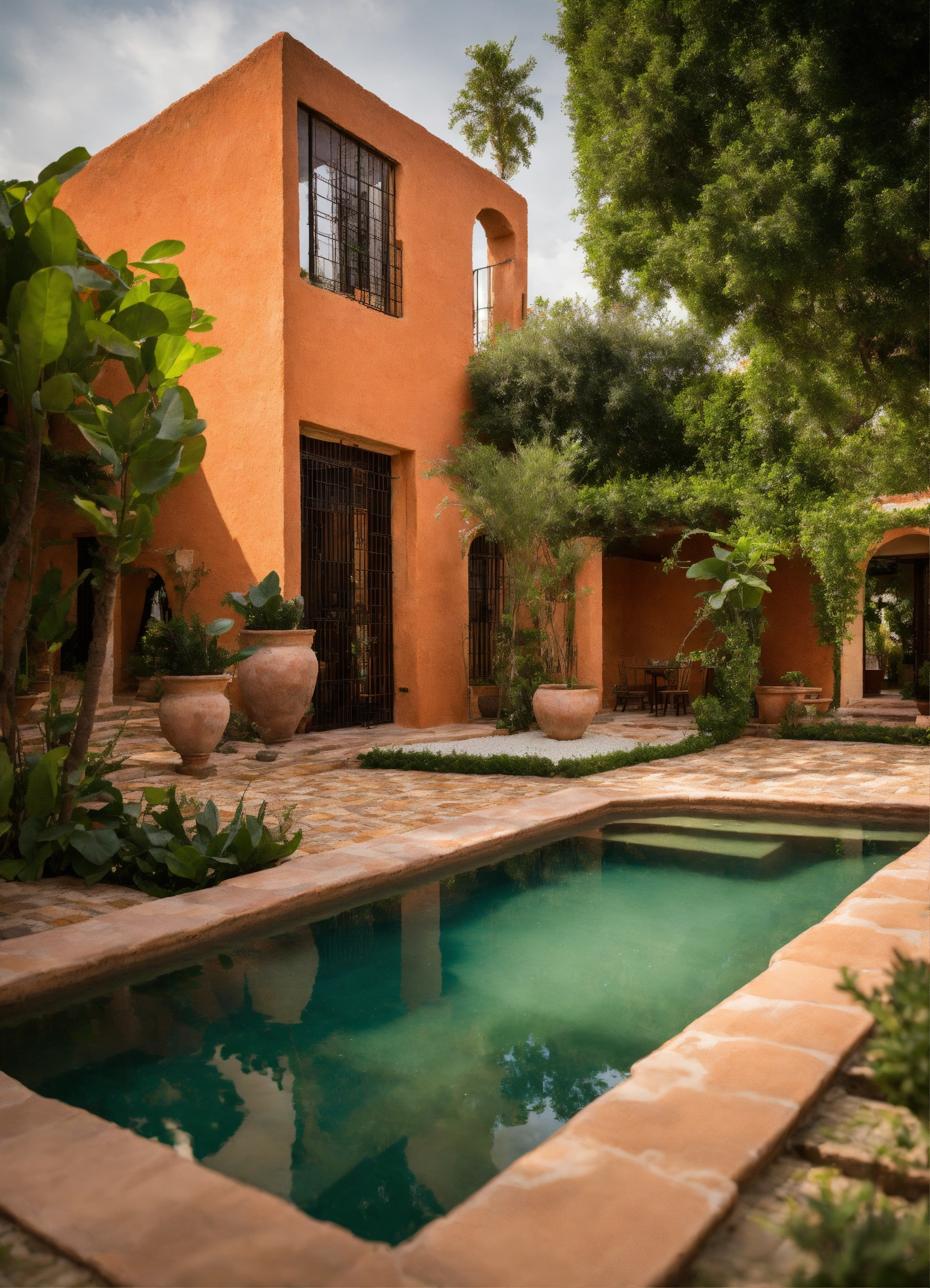 Diseño exterior de pequeña hacienda antigua rehabilitada a vivienda, colores naturales y terracota, led, piscina infinita, vegetación y plantas