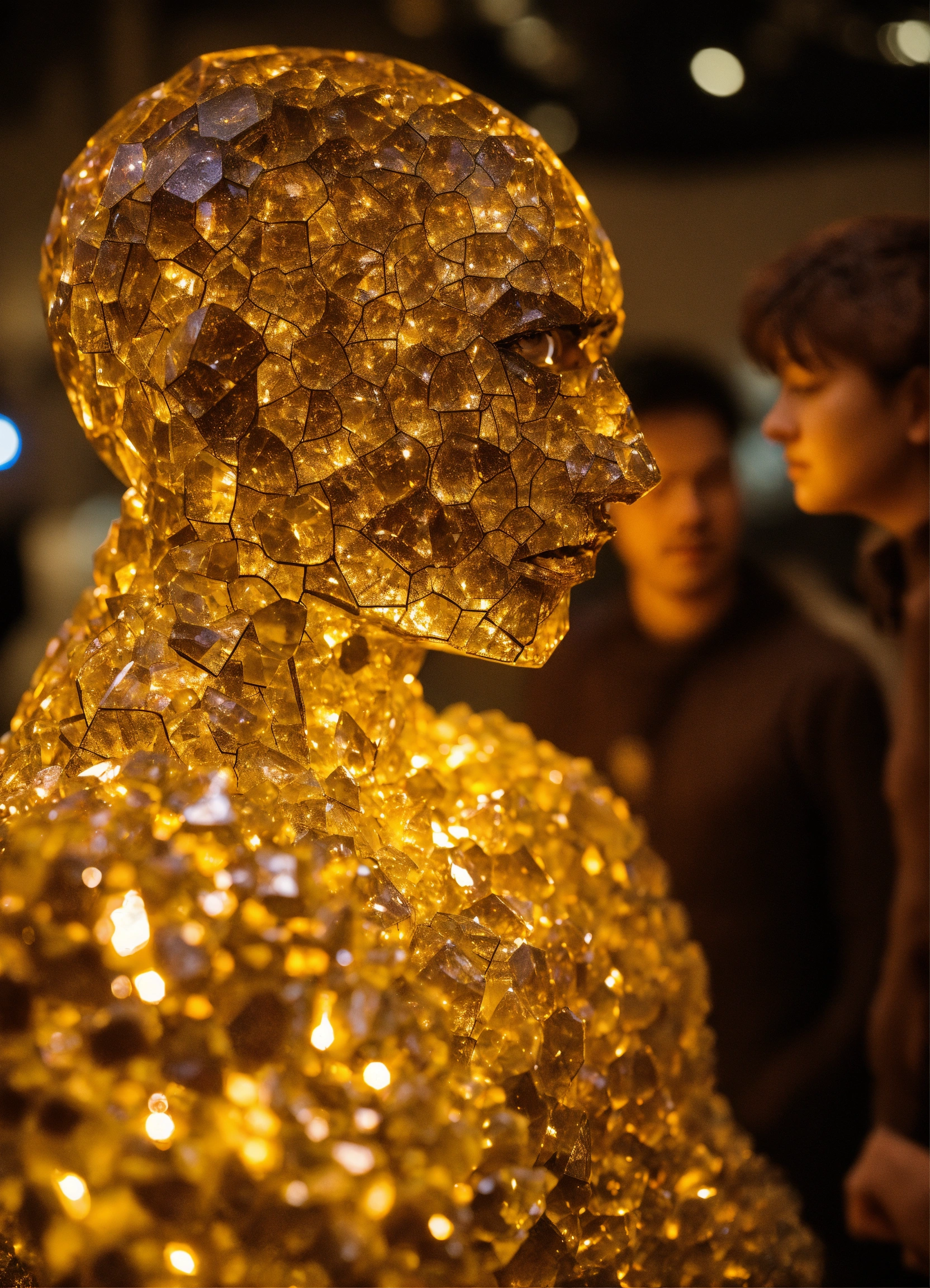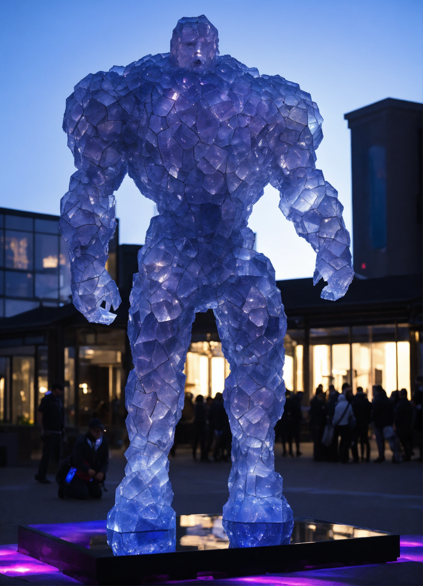 The crystal golem is a living statue carved from crystals, its 8k texture reveals intricate cracks and molten veins that move as it marches with weighty physics