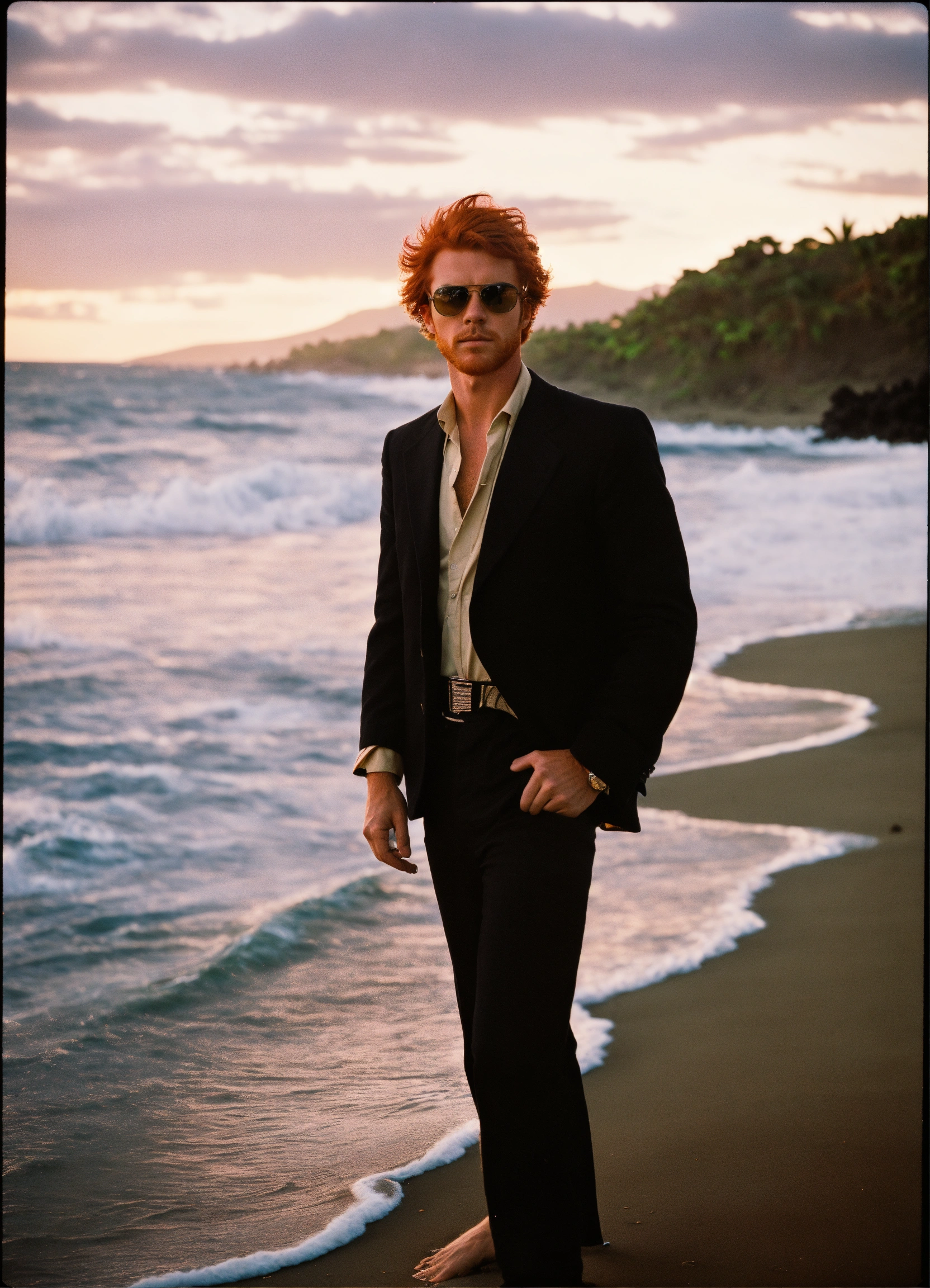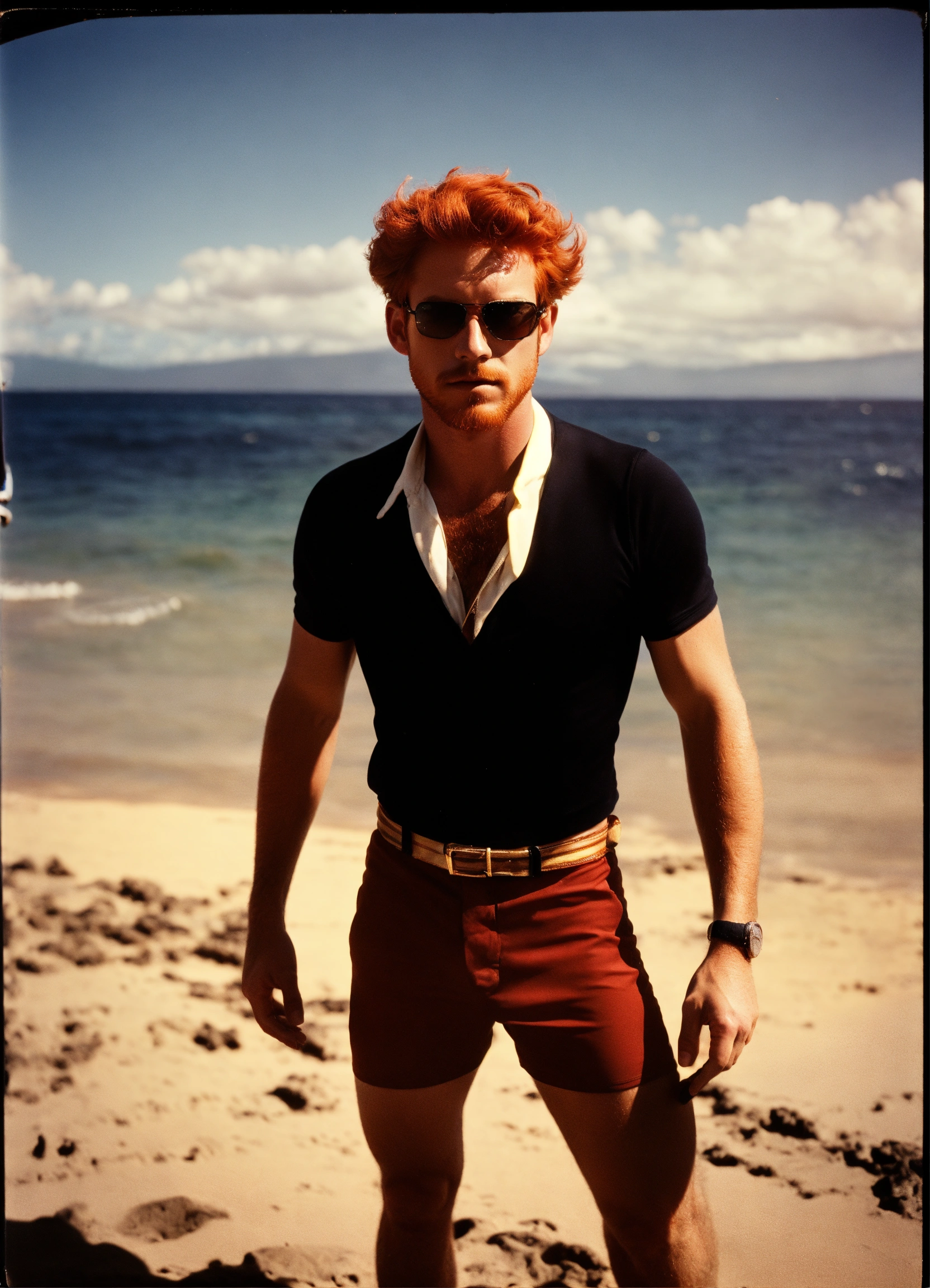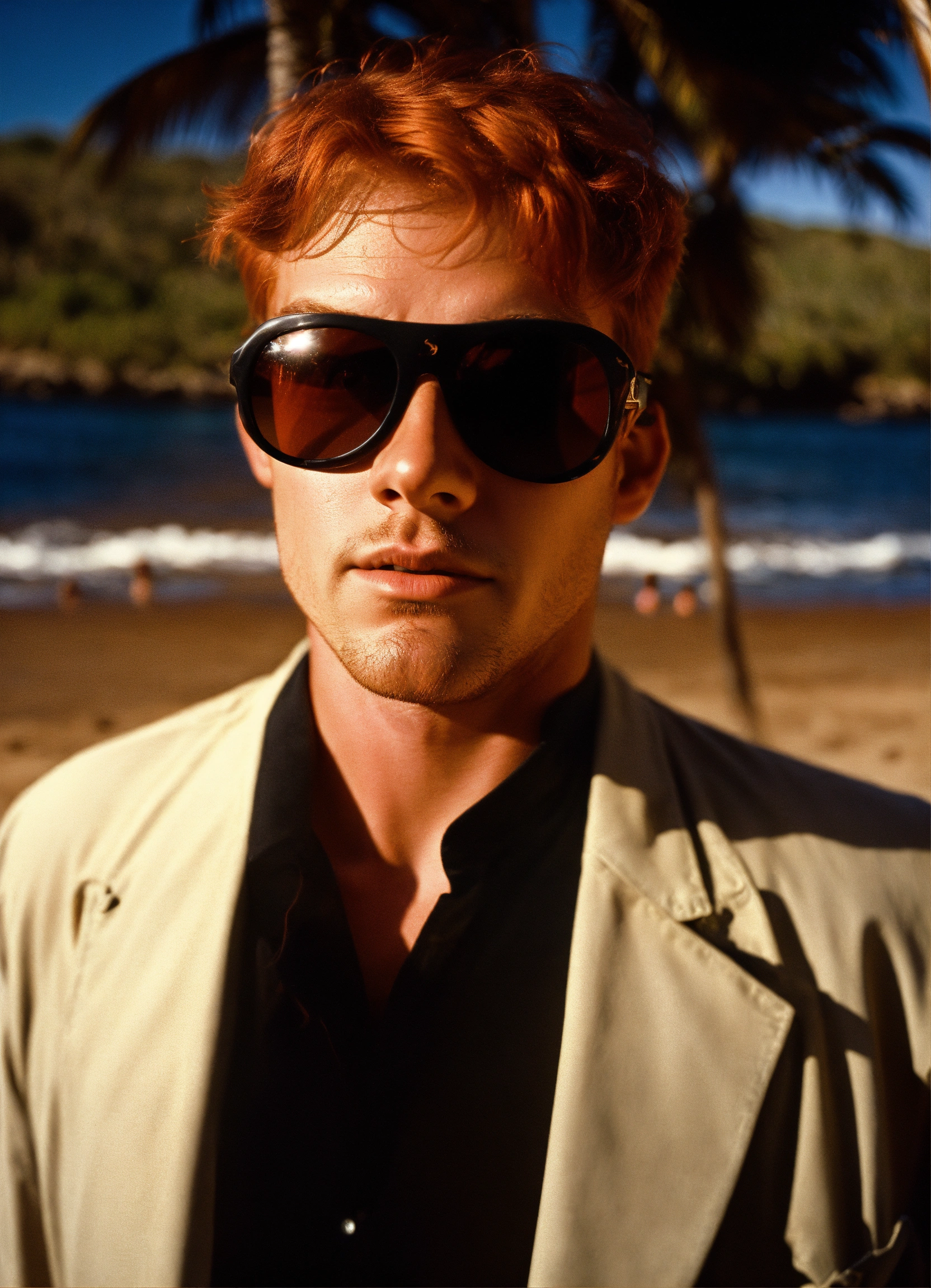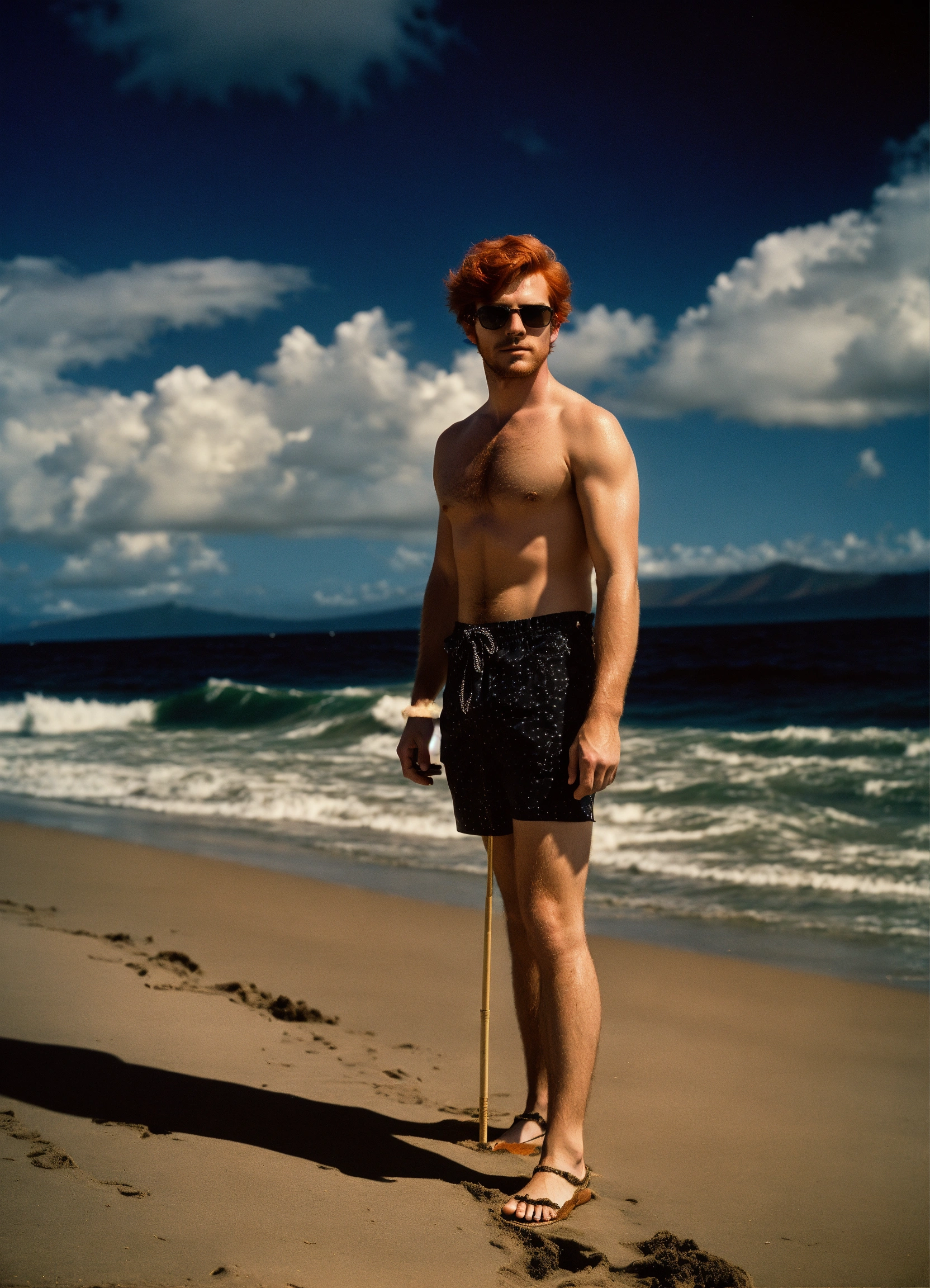 Photo of a late twenties red haired man, on the beach in maui 1975, black swim suit, donald duck sunglasses, dramatic lighting, detective noir, wide angle