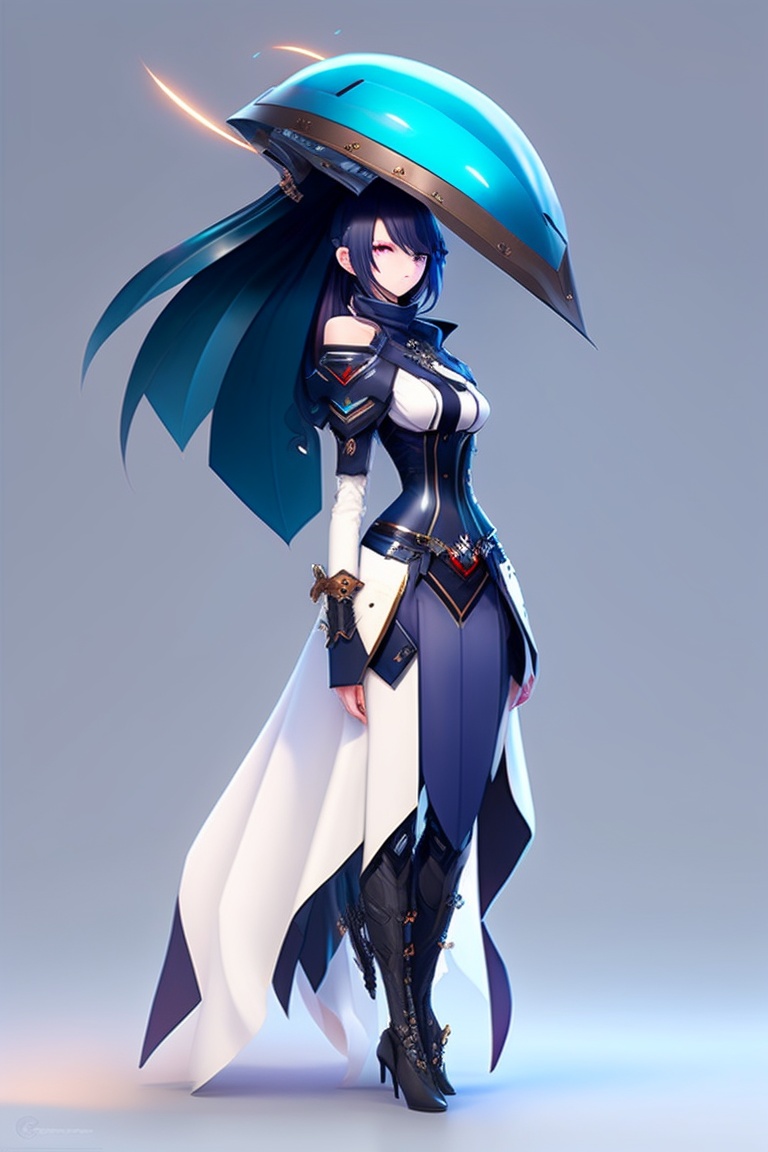 Full body anime style, she-venom robot female, head covered with a gothic veil, mournful gothic long skirt, beautiful and terrible, tall and lean figure, mechanized limb, glowing blue eyes, high resolution, trending art station, white background.