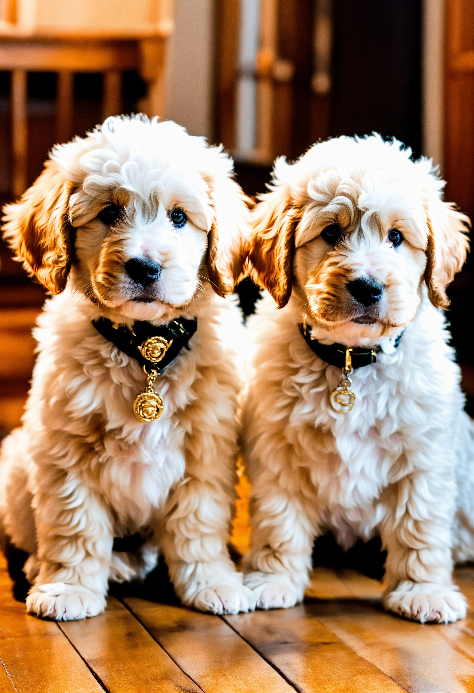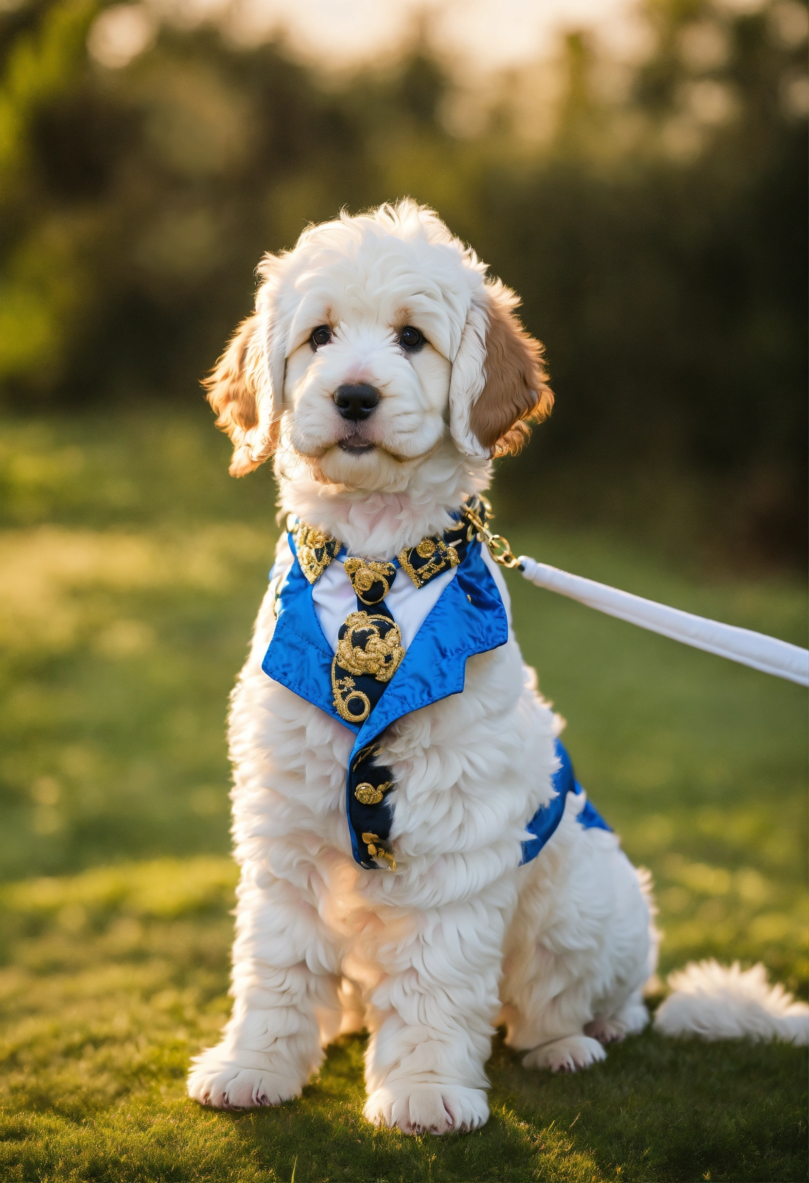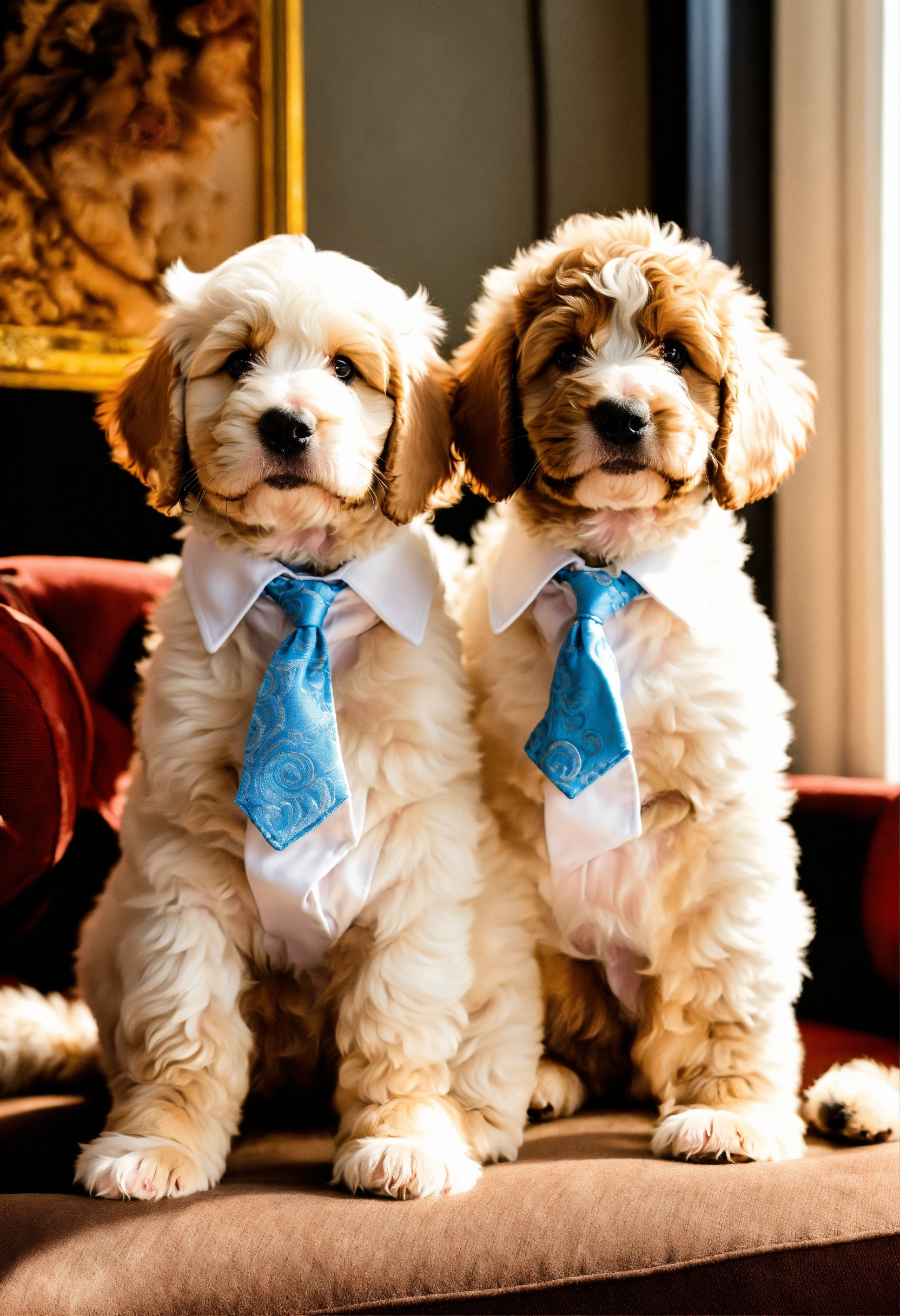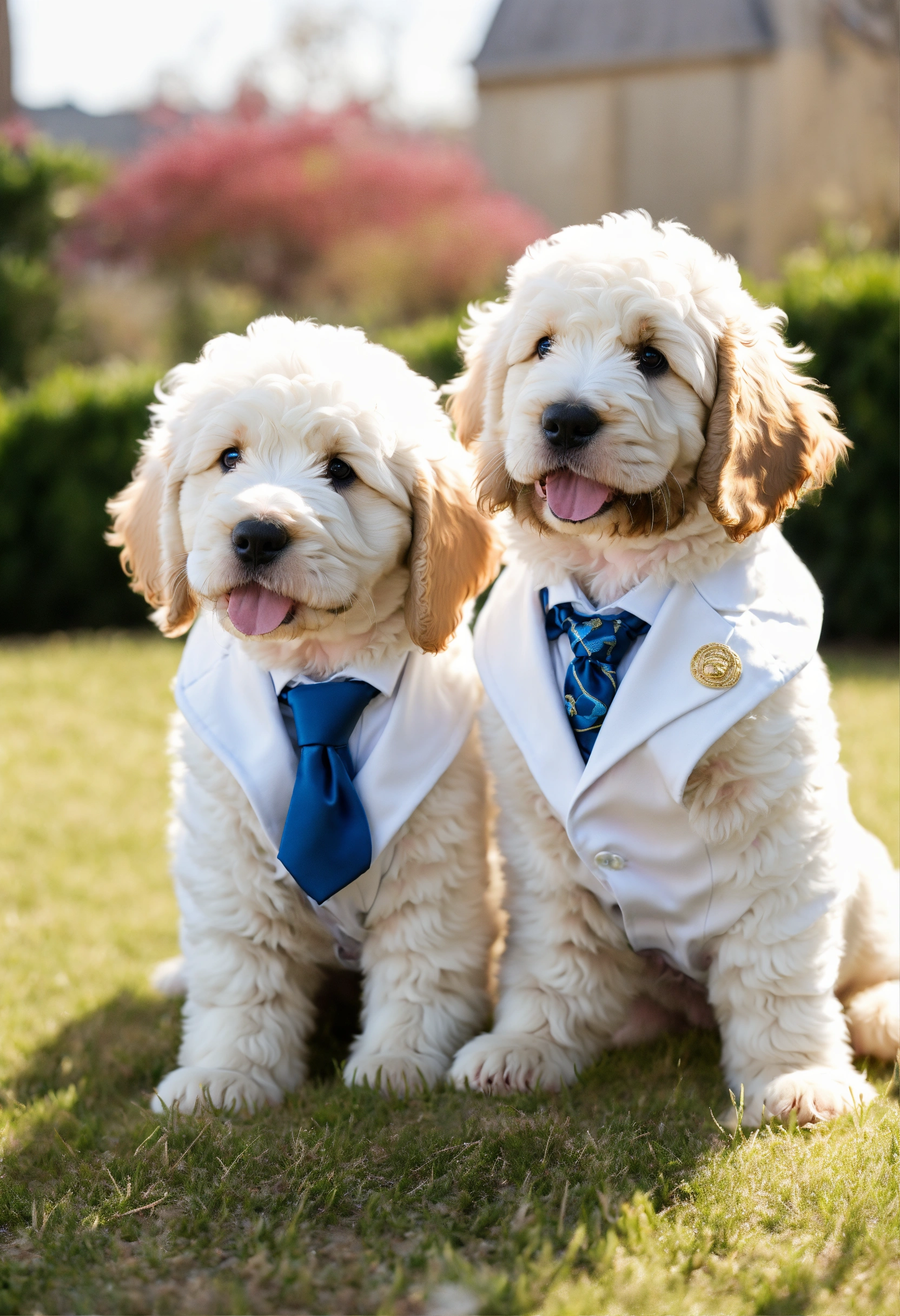 2 bernedoodle puppies wear white versace suits