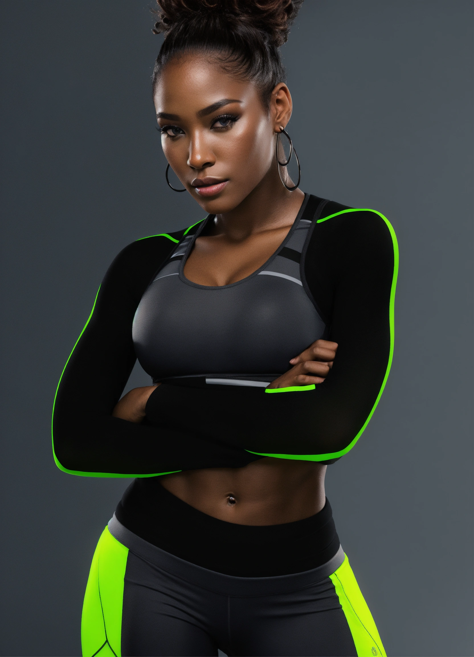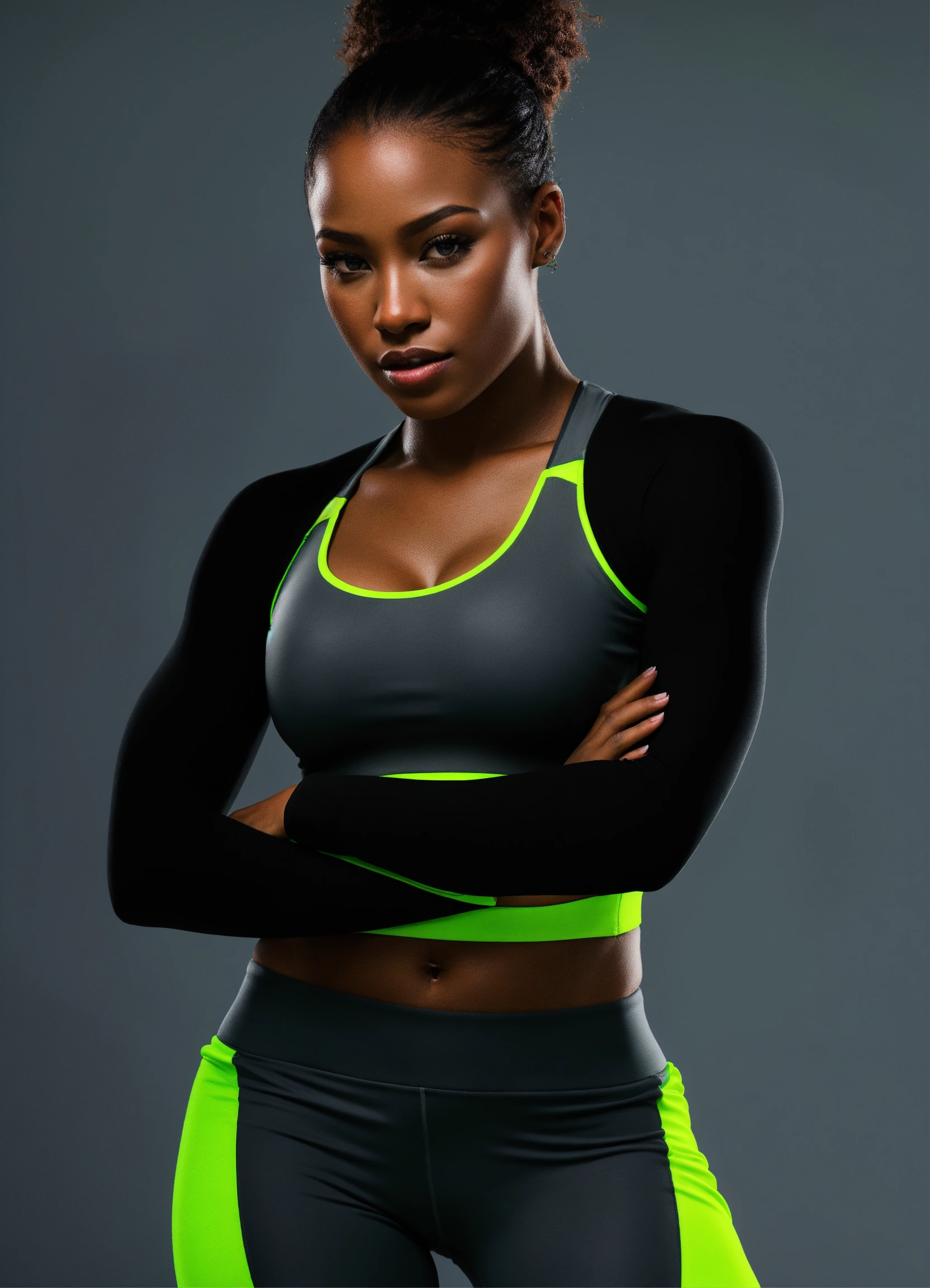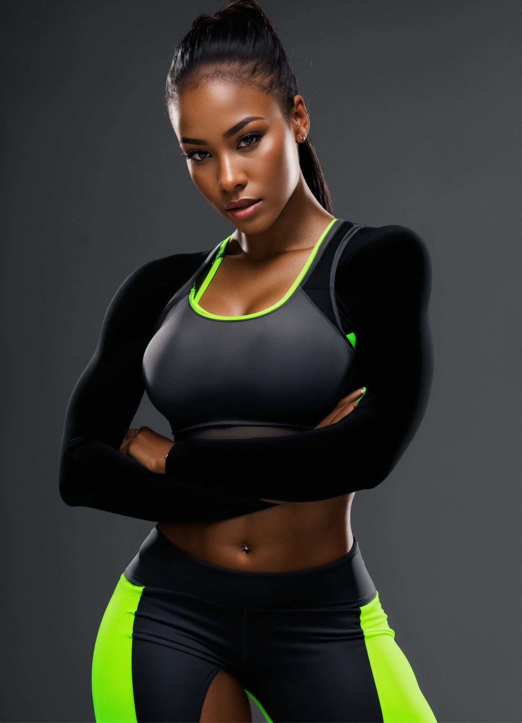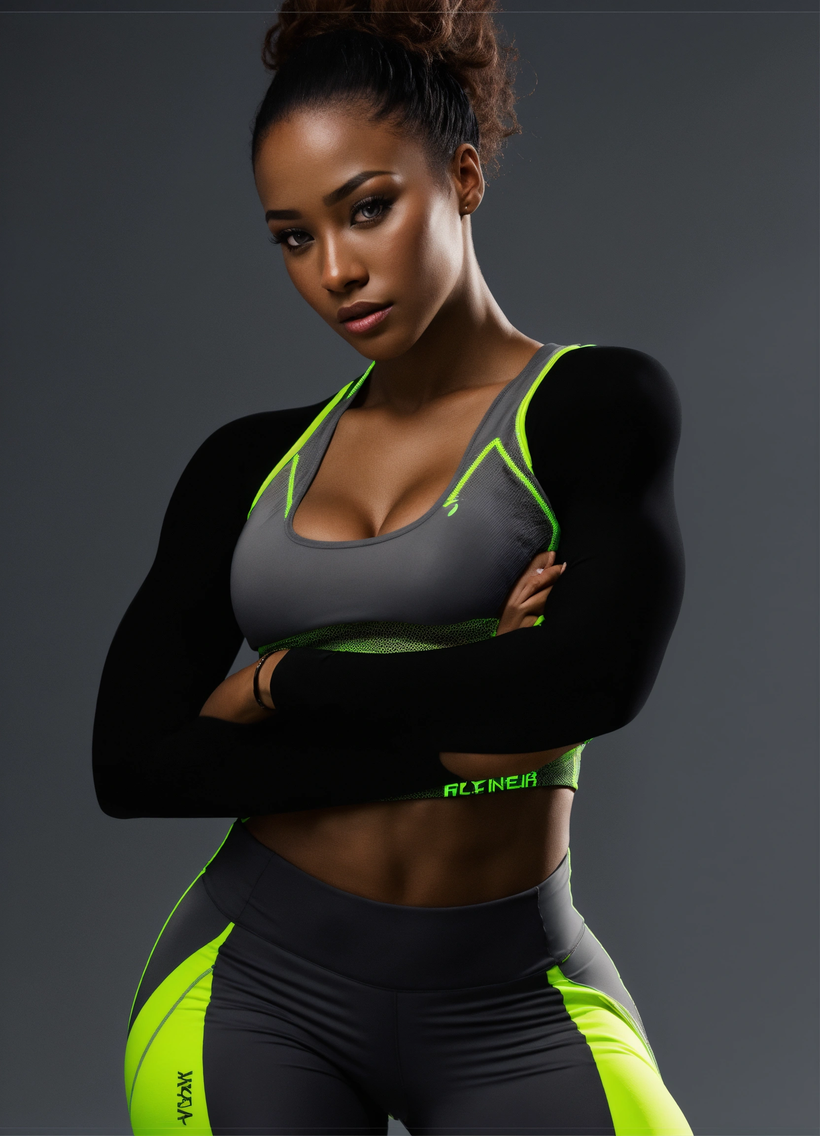 Black woman, neon lime color fitness wear, studio photo, front view, hyper realistic, fashion, photo realistic, 3d render, dark gray background
