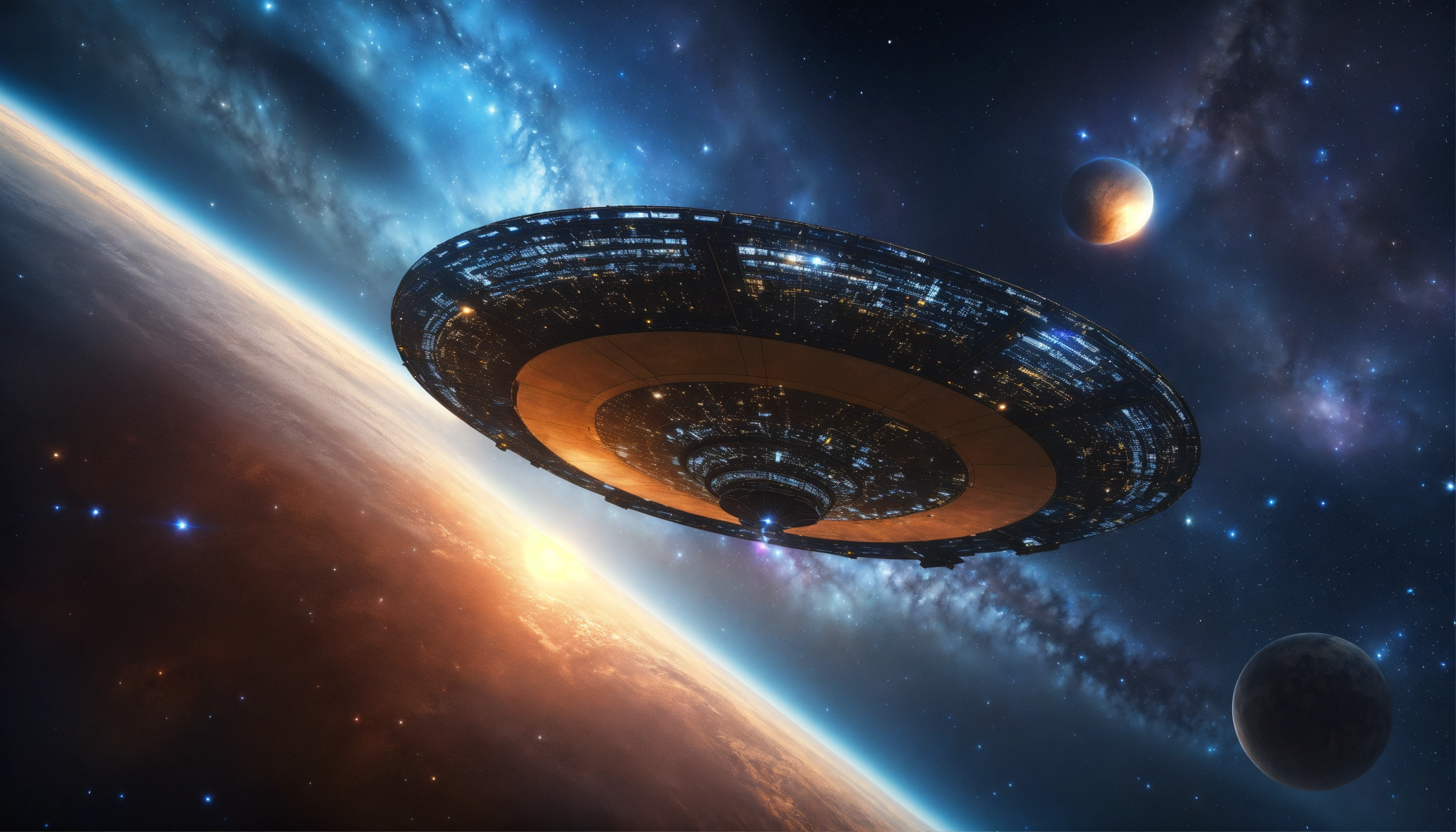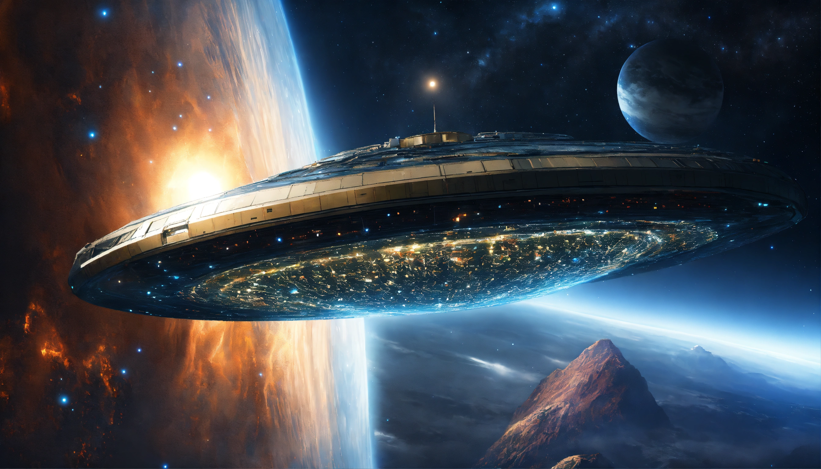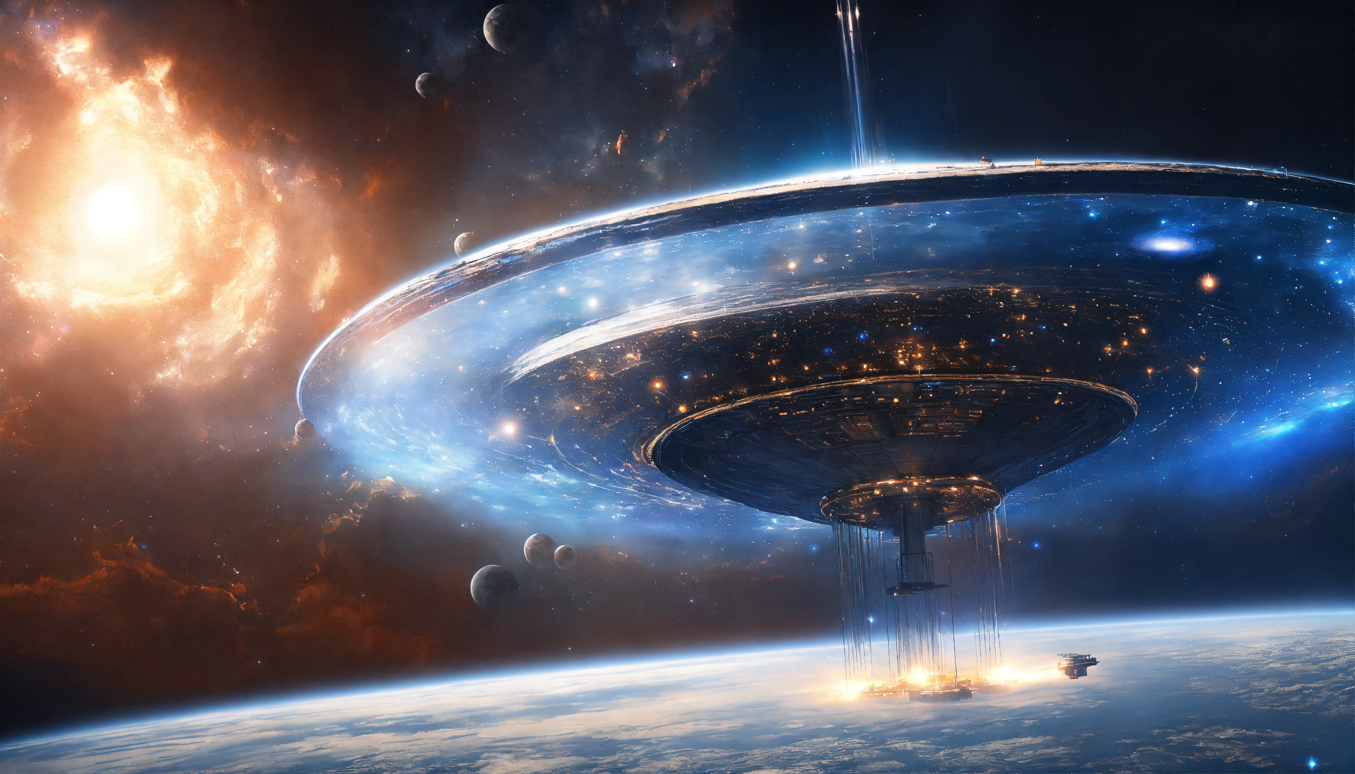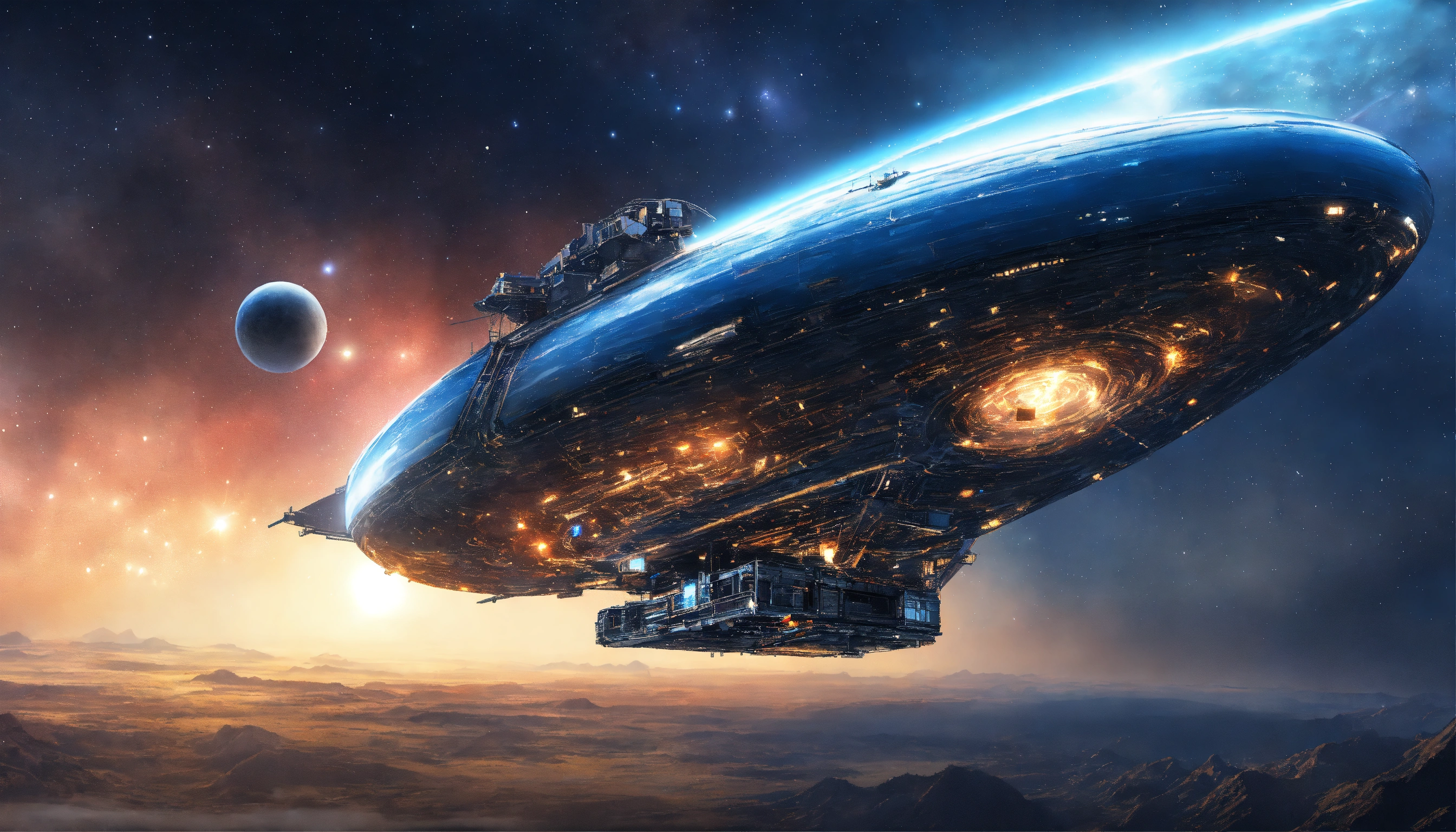A blue and big interstellar craft in, transparent above in the galactic atmosphere, sky galaxies+ lightss, détails, hd