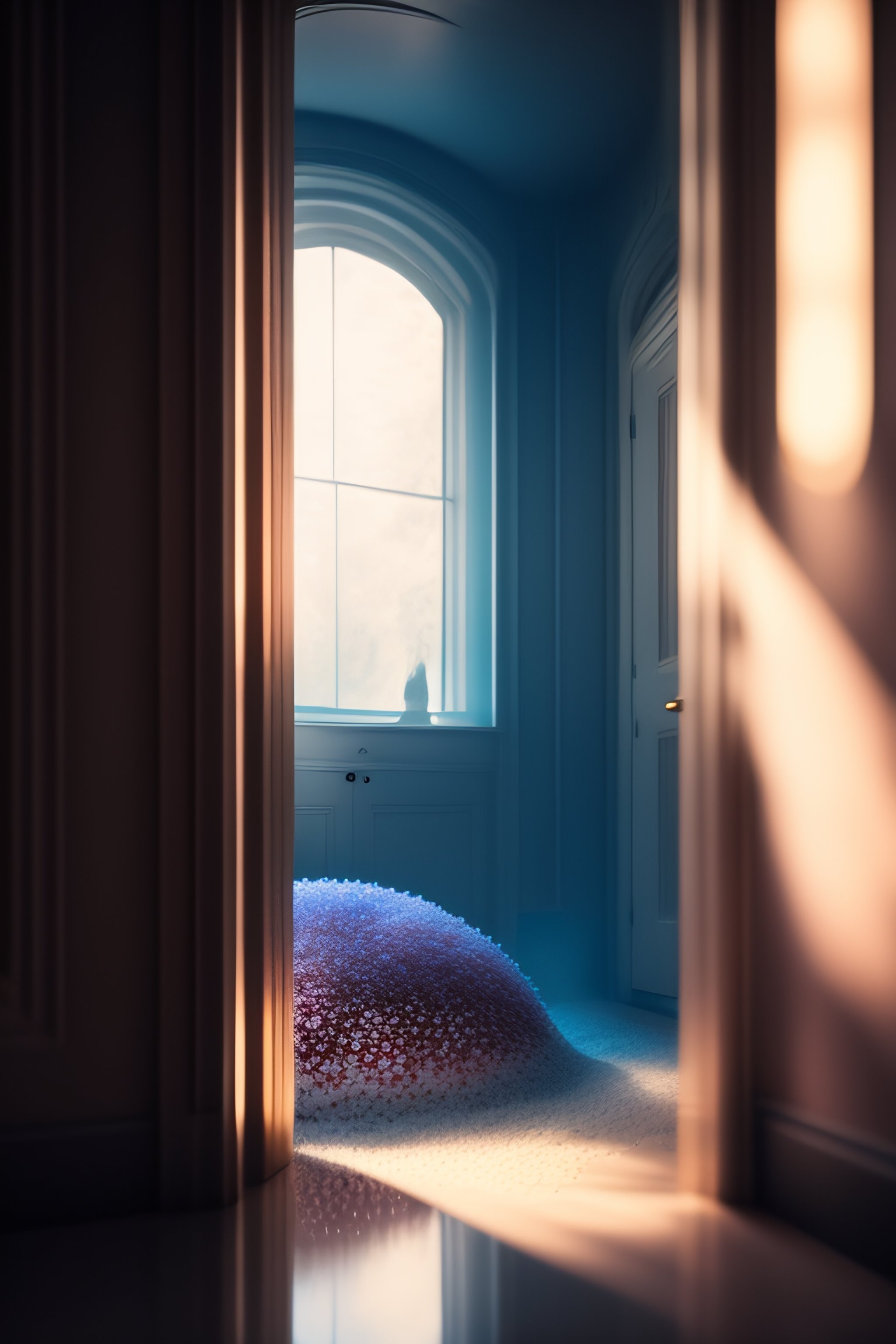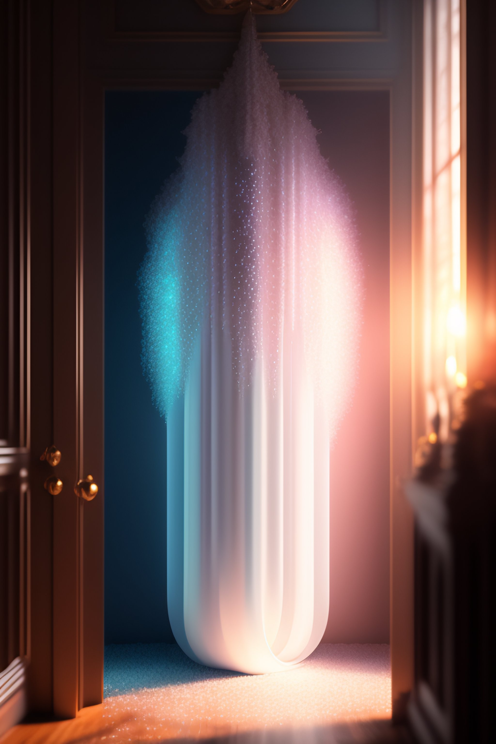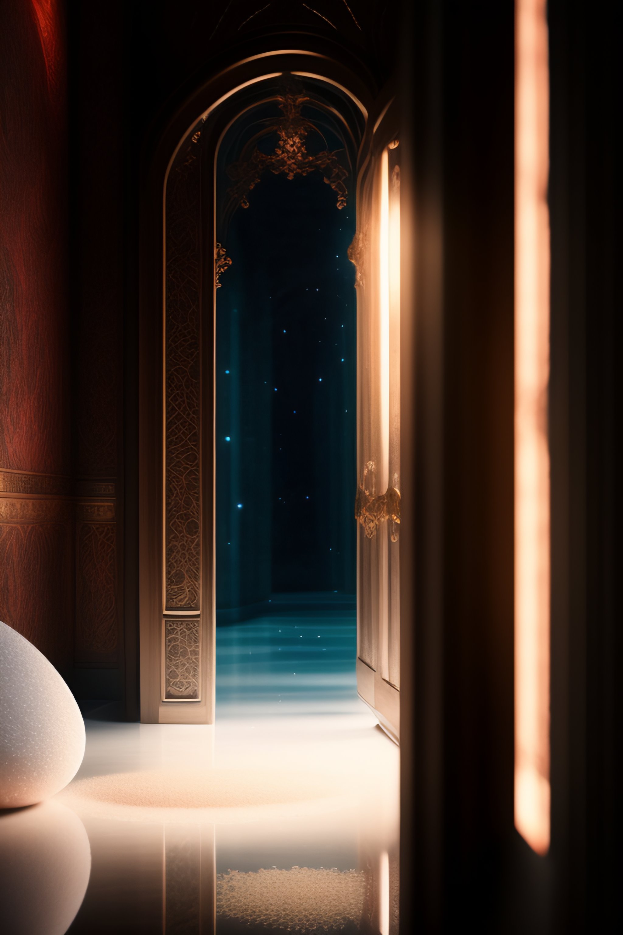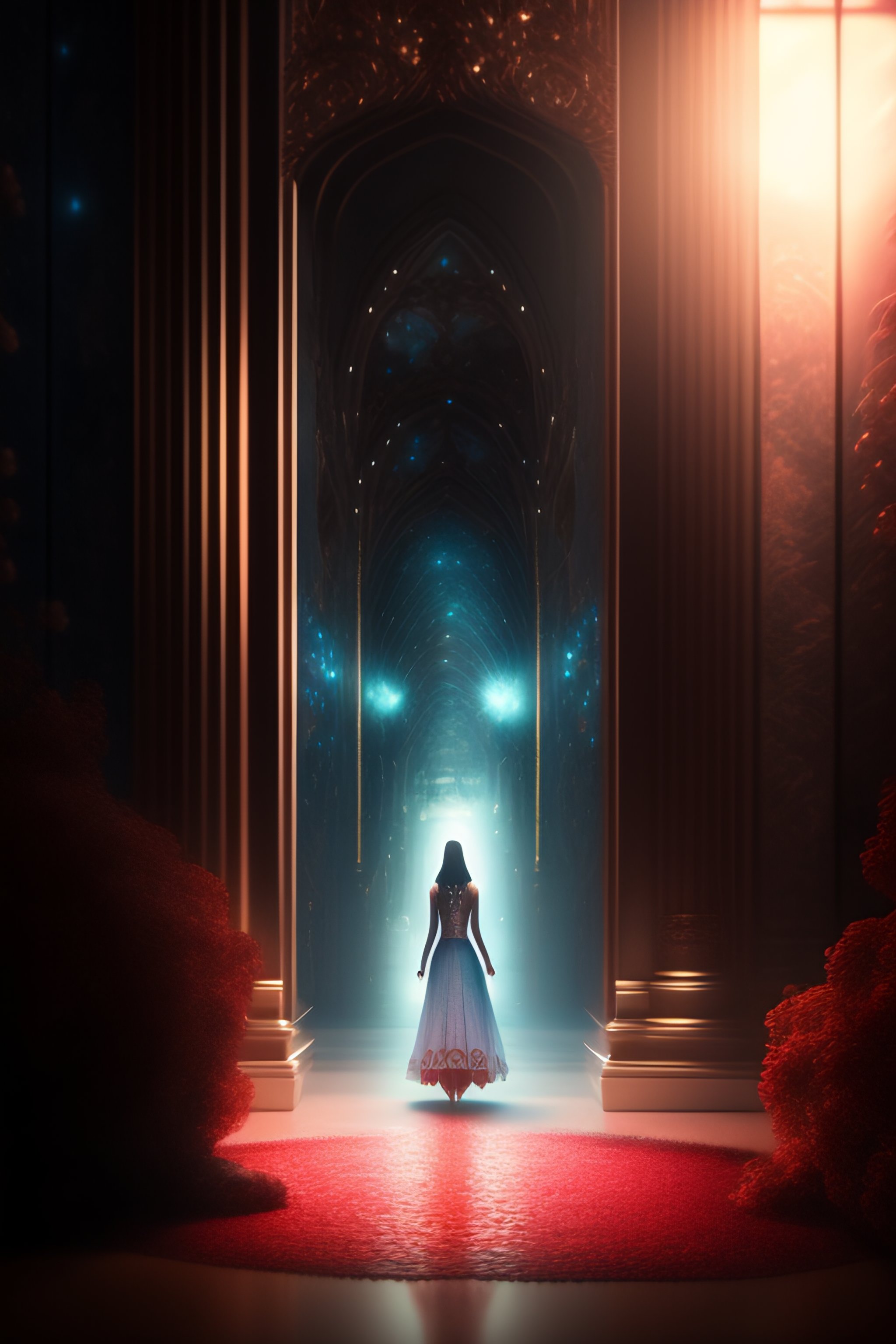 Sinestrea's back is turned to the viewer as they pace the empty room. the small door stands in the background, its size only emphasized by sinestrea's tall figure. the gold powder glows softly in the dim light, its texture sparkling and inviting. the angle of the photo is taken from the ground, giving the viewer a unique perspective of the scene. sinestrea's body is tense as they approach the powder, their hand outstretched as they prepare to follow alice's instructions, in the style of ai art