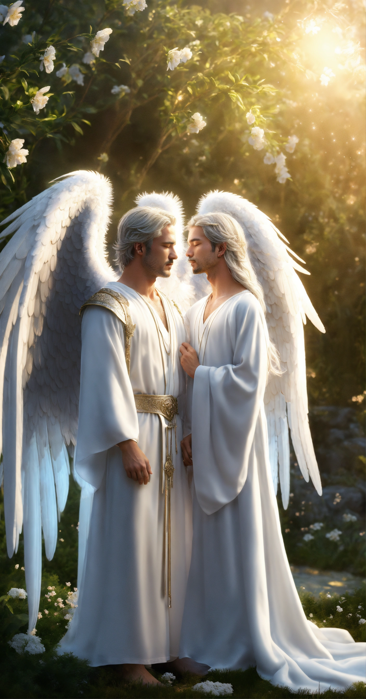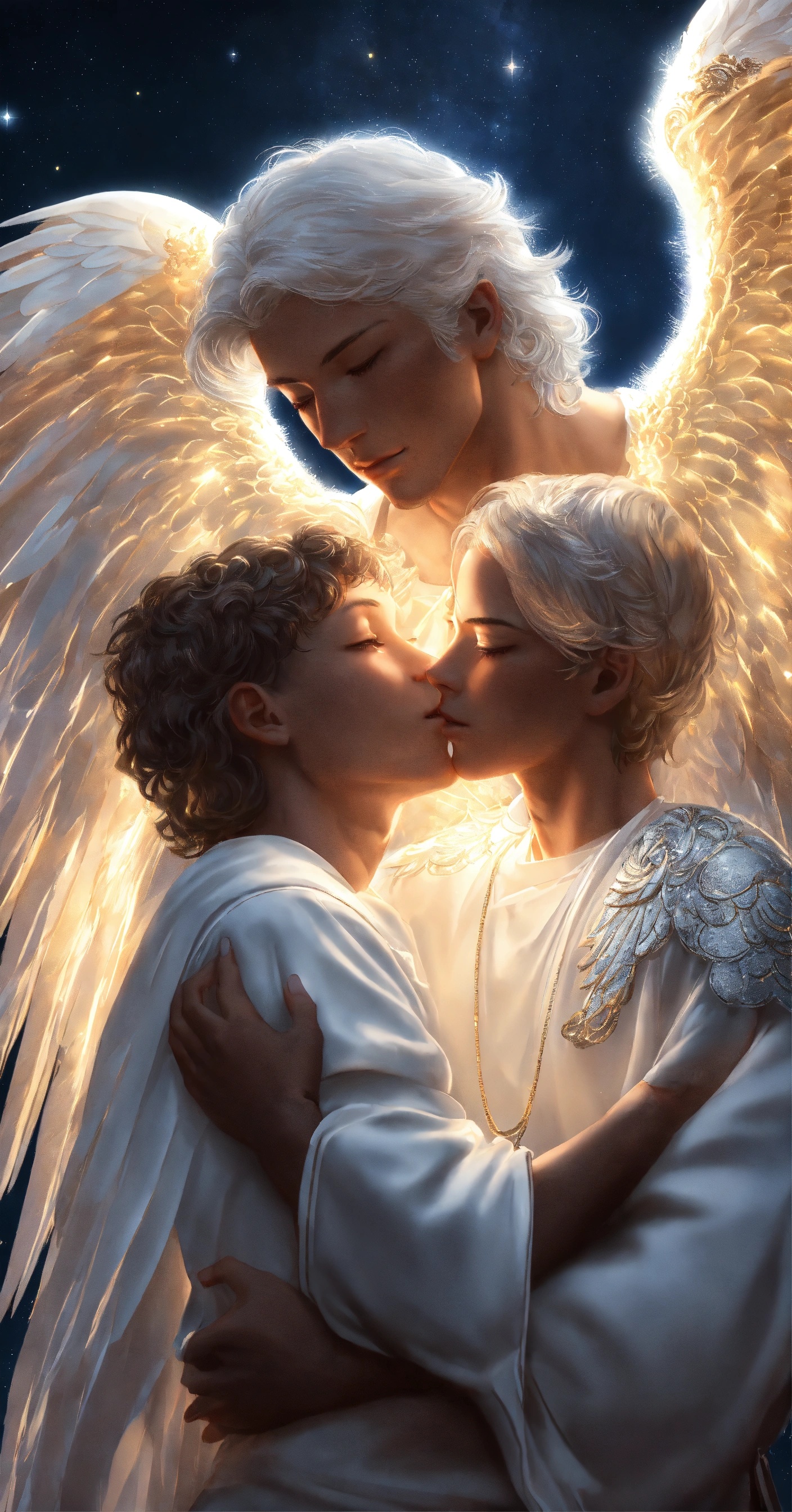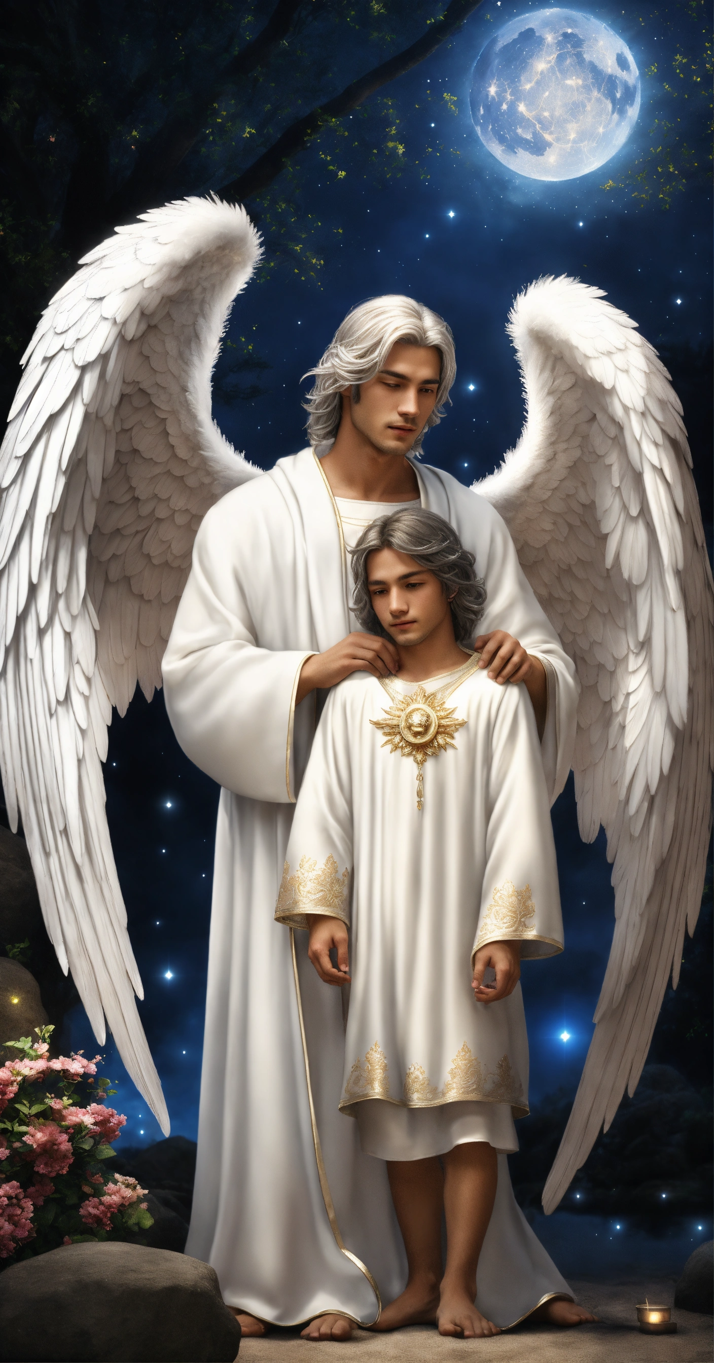2 male guardian angels with detailed and luminous white angel wings. 1 male angel of 30 years hugging a child angel of 9 years. the 2 male angels have large, uniform luminous white wings. their faces beautiful and detailed. very clear eyes that open with a deep and penetrating look. detailed and manly white hair. white tunic-type dresses with many silver details with luminous sparkles. they are in a beautiful, detailed zen garden with a night sky. hyper-detailed, hyper-realistic illustration. realism. masterpiece. digital art, hd, high quality. high definition, high definition. 8k.