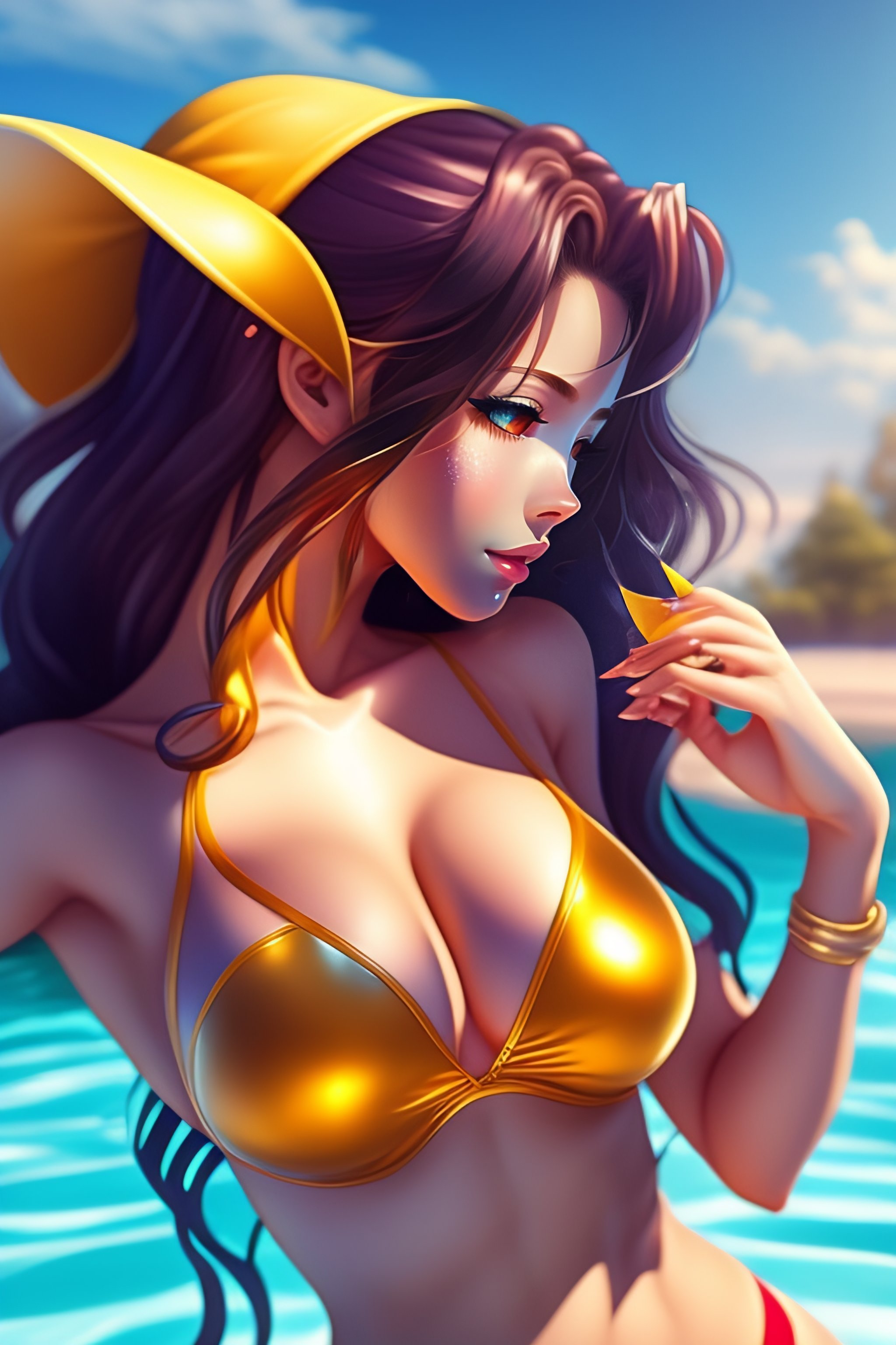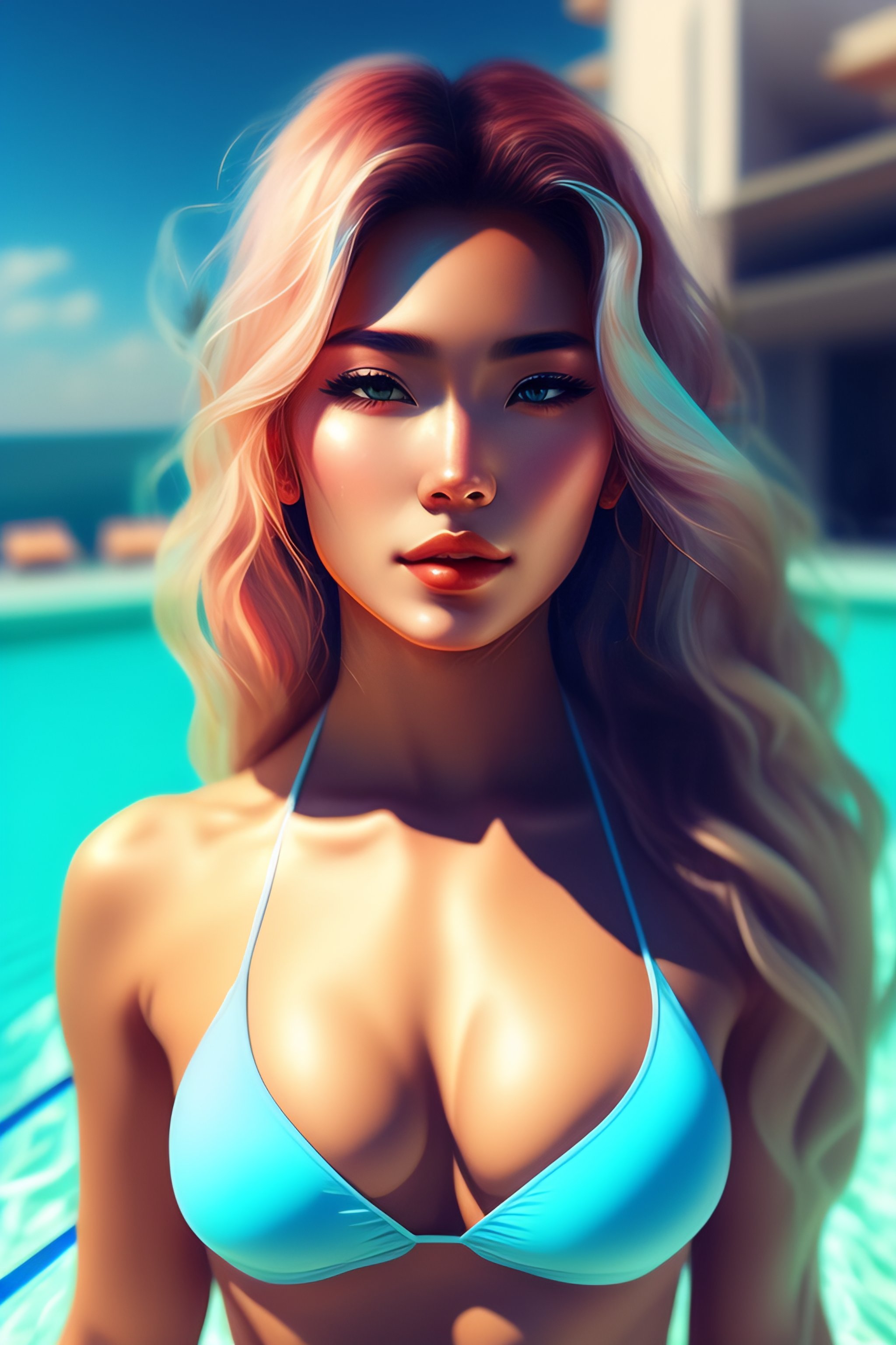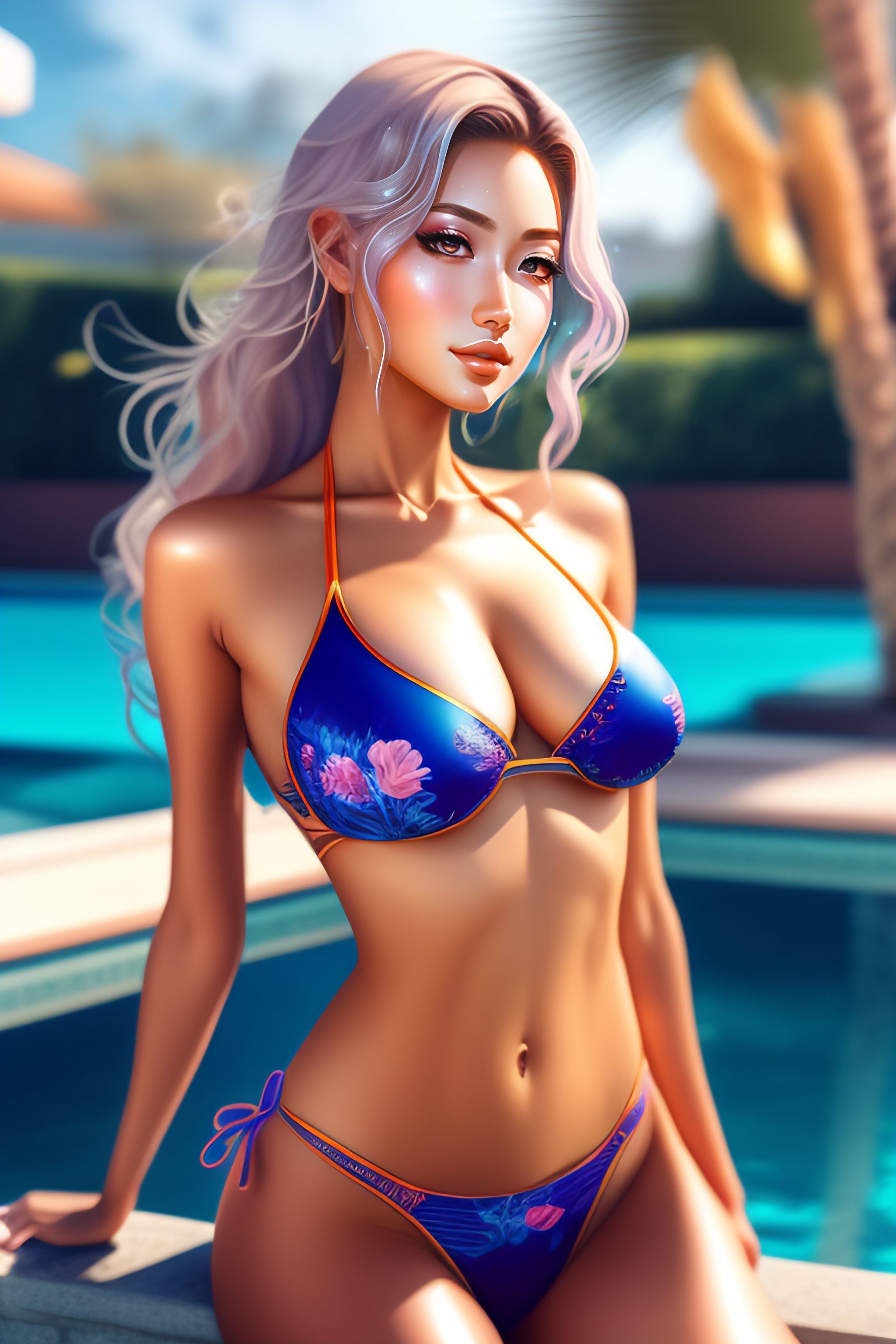 Dynamic photography of a beautiful anime girls in bikinis at a pool, oiled body, detailed character portrait, sunny day, detailed and intricate environment