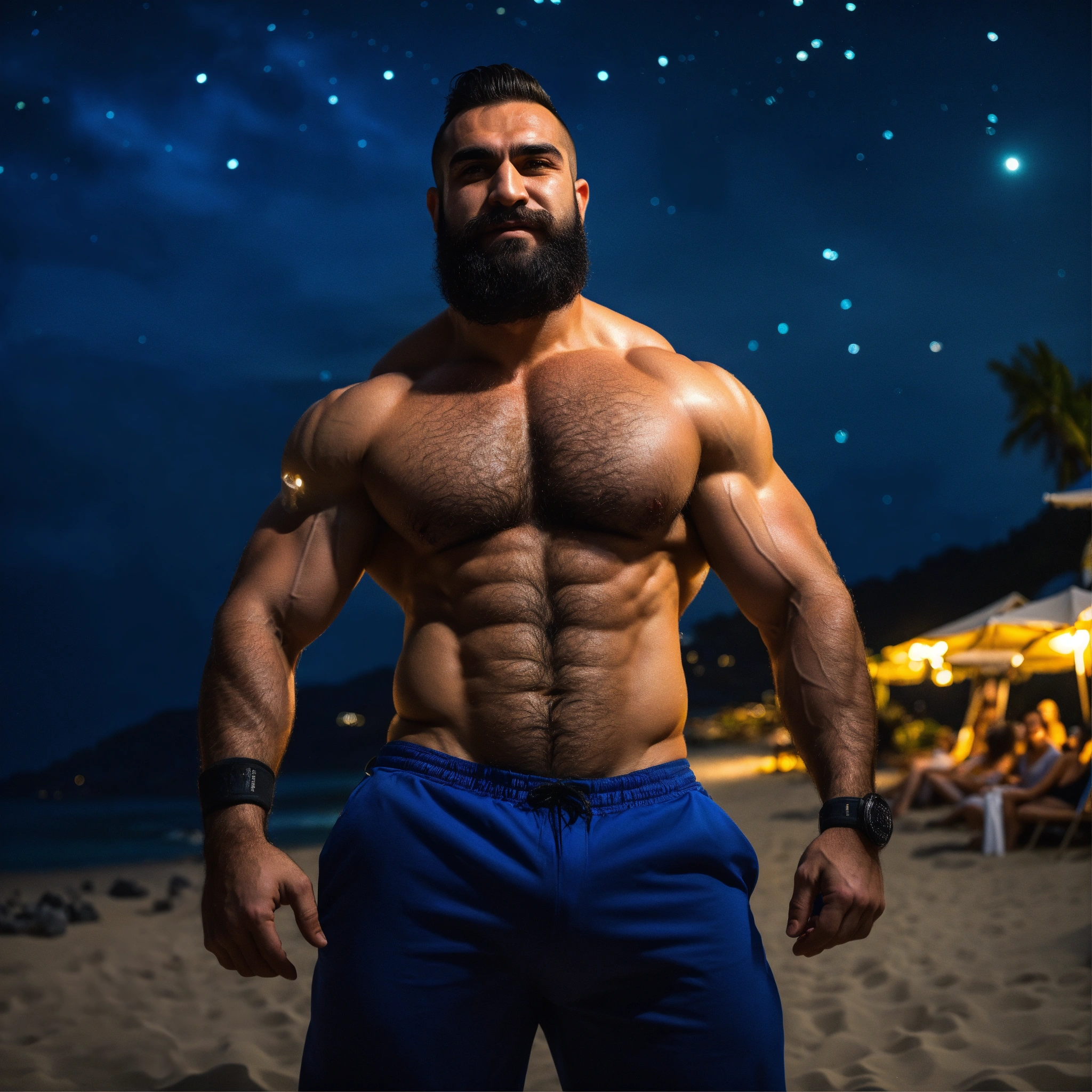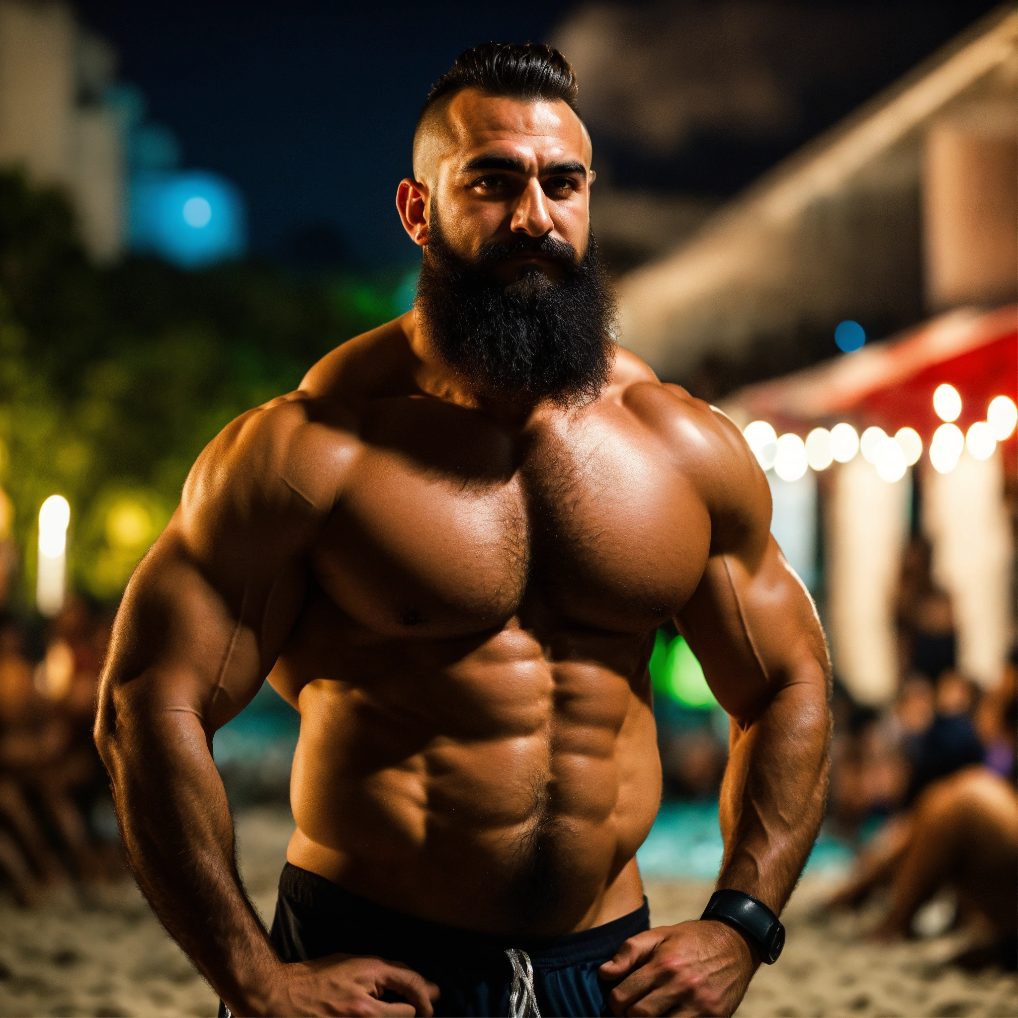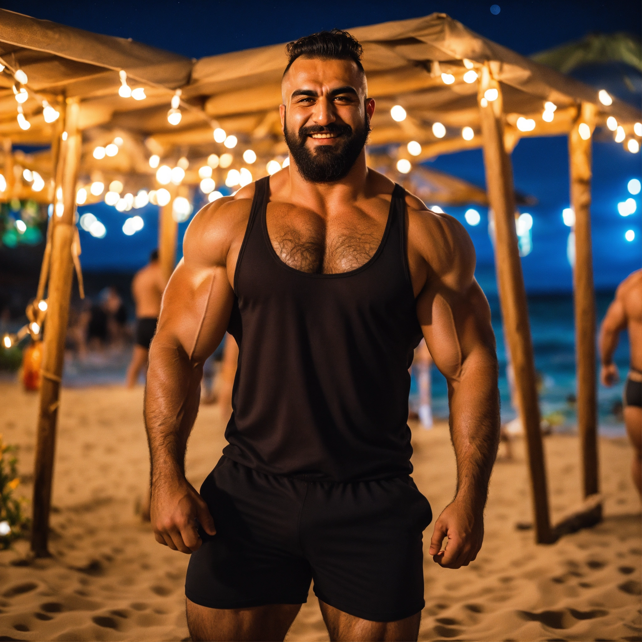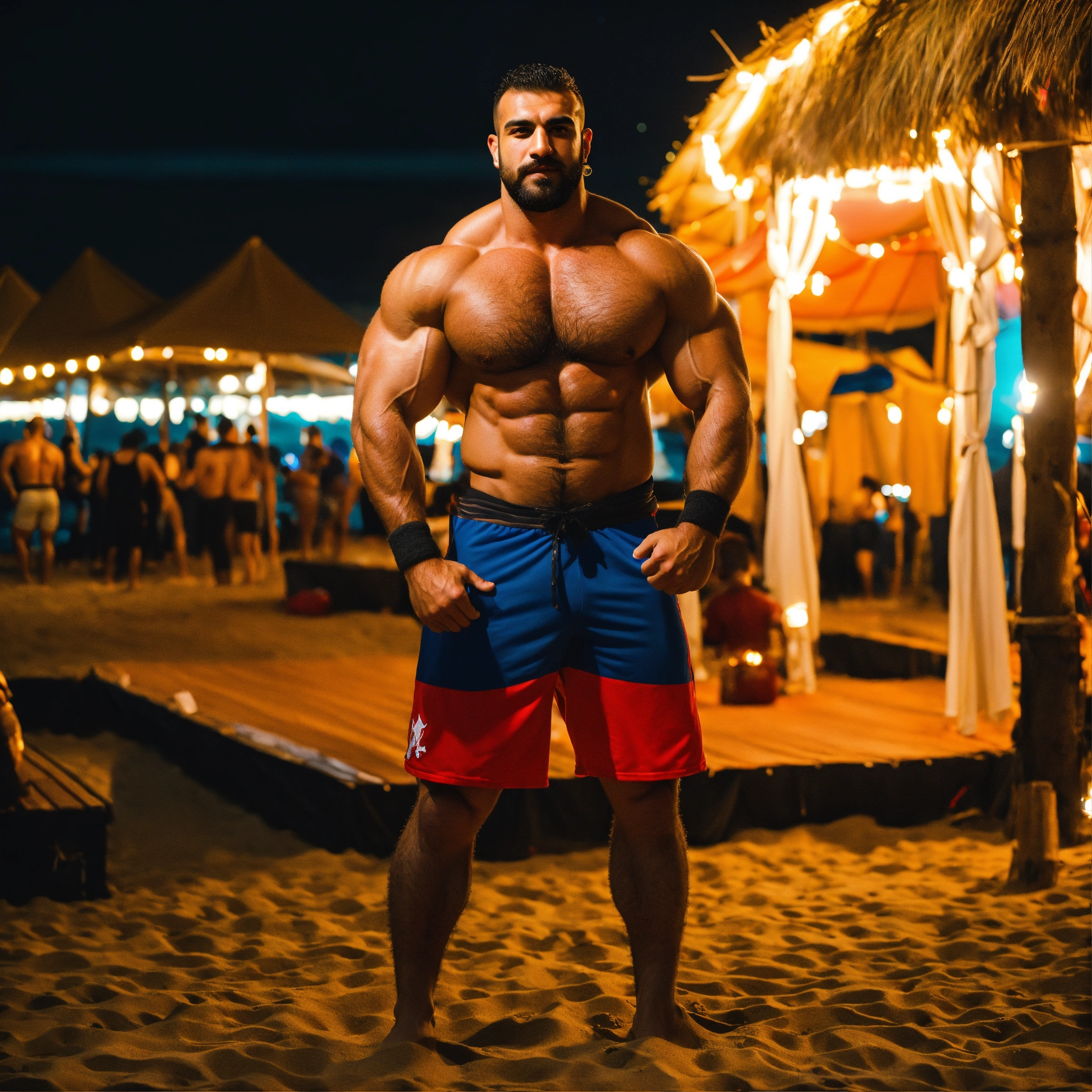 30-year-old hairy turkish man with big muscles, big bodybuilder, body like a wrestler, at a party on the beach at night