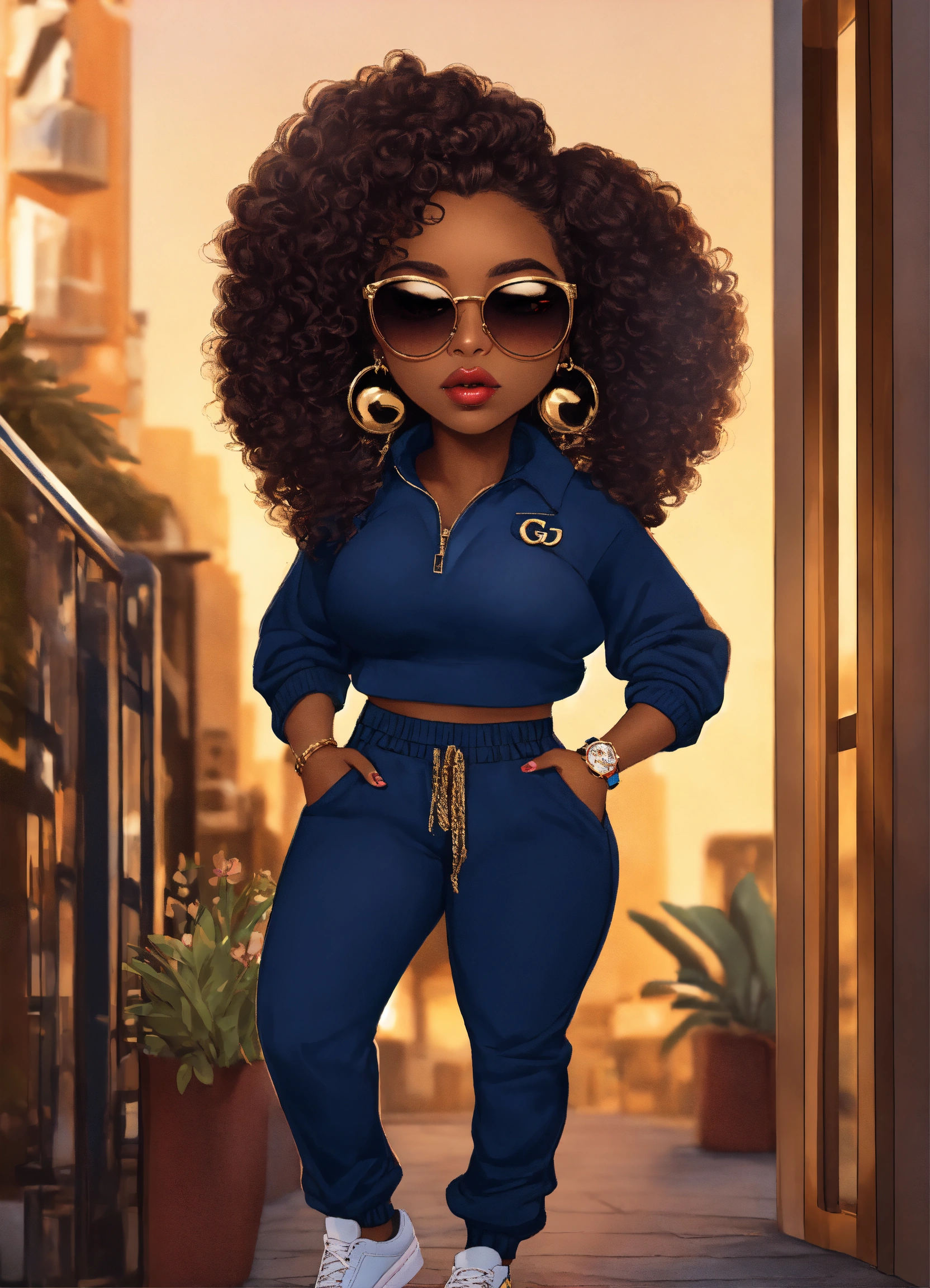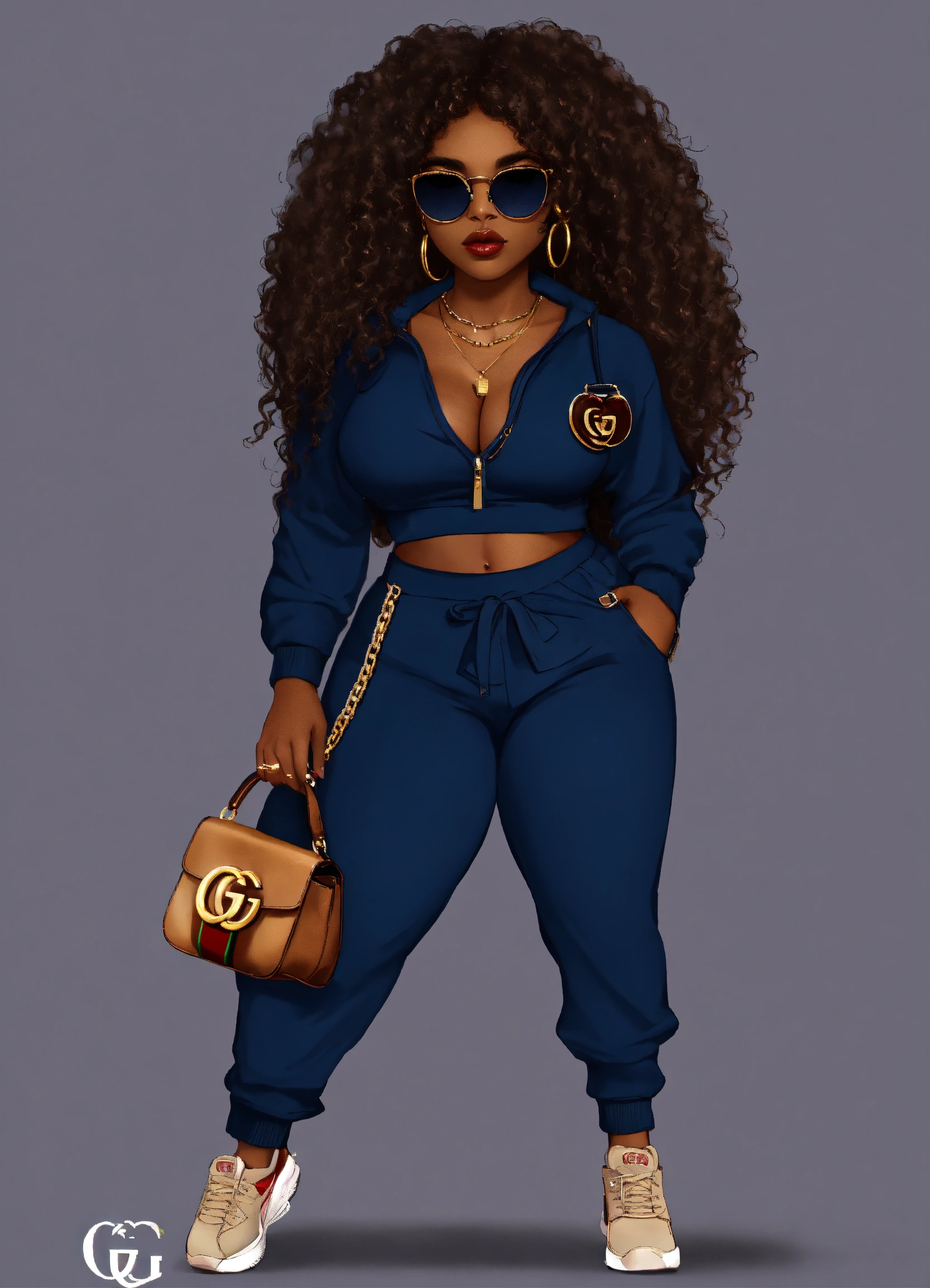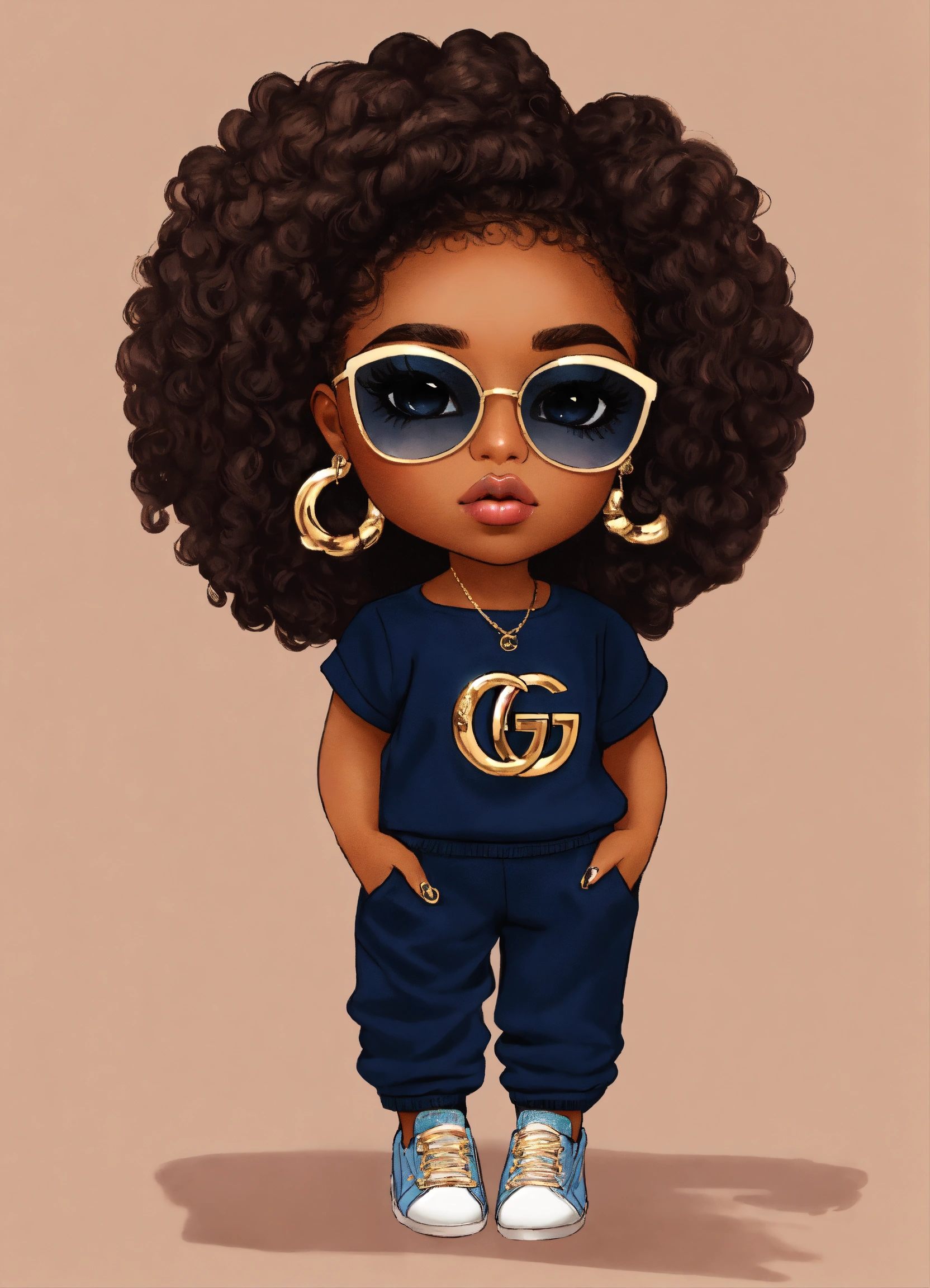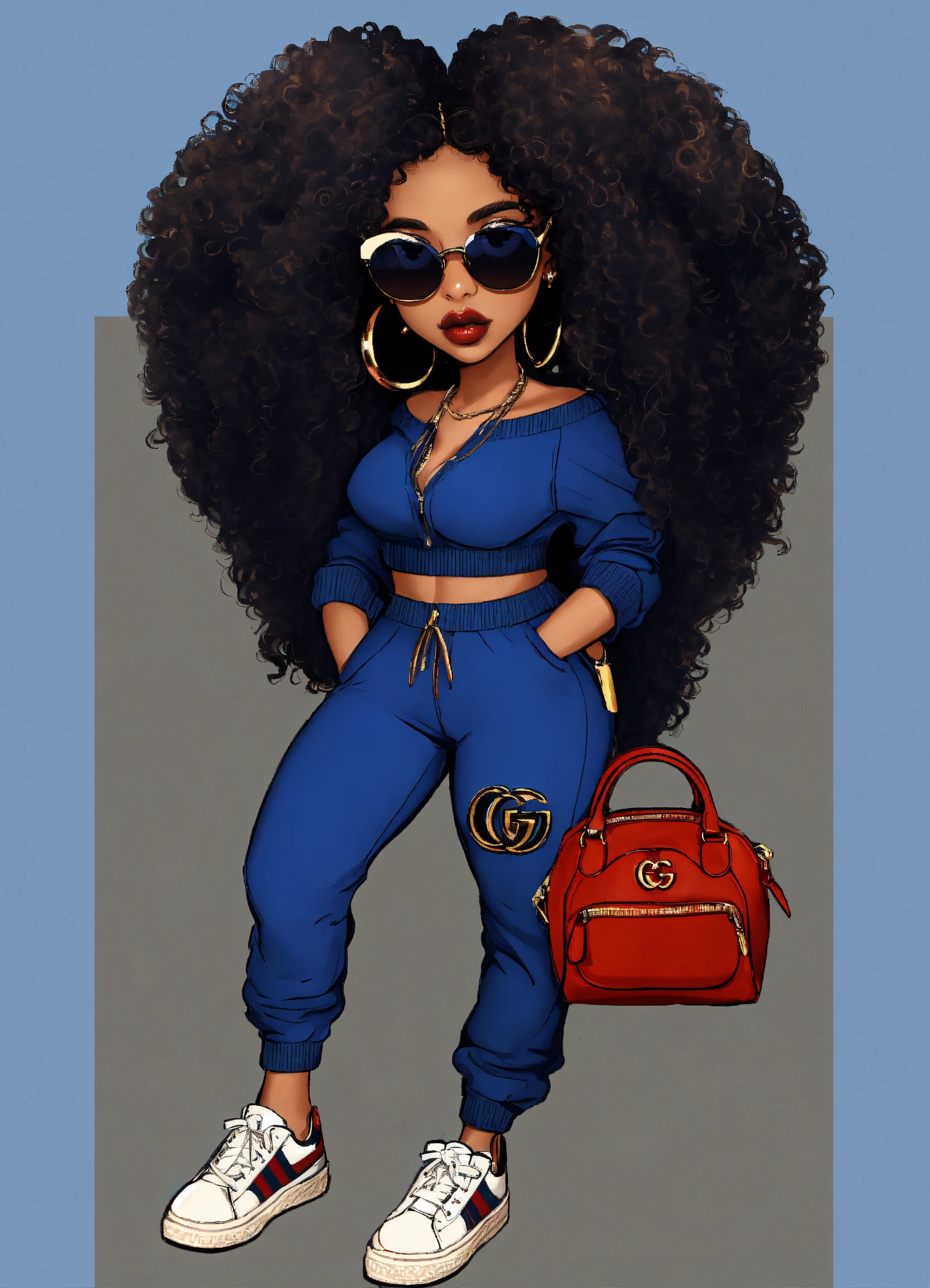 Black woman with big eyes, long lashes and full lips, wearing navy blue joggers that says "gucci". she has a brown and tan purse that says "gucci". she has black sunglasses on with glossy lip gloss on her lips. full body, chibi style and has long loose curly hair. --v 5.0