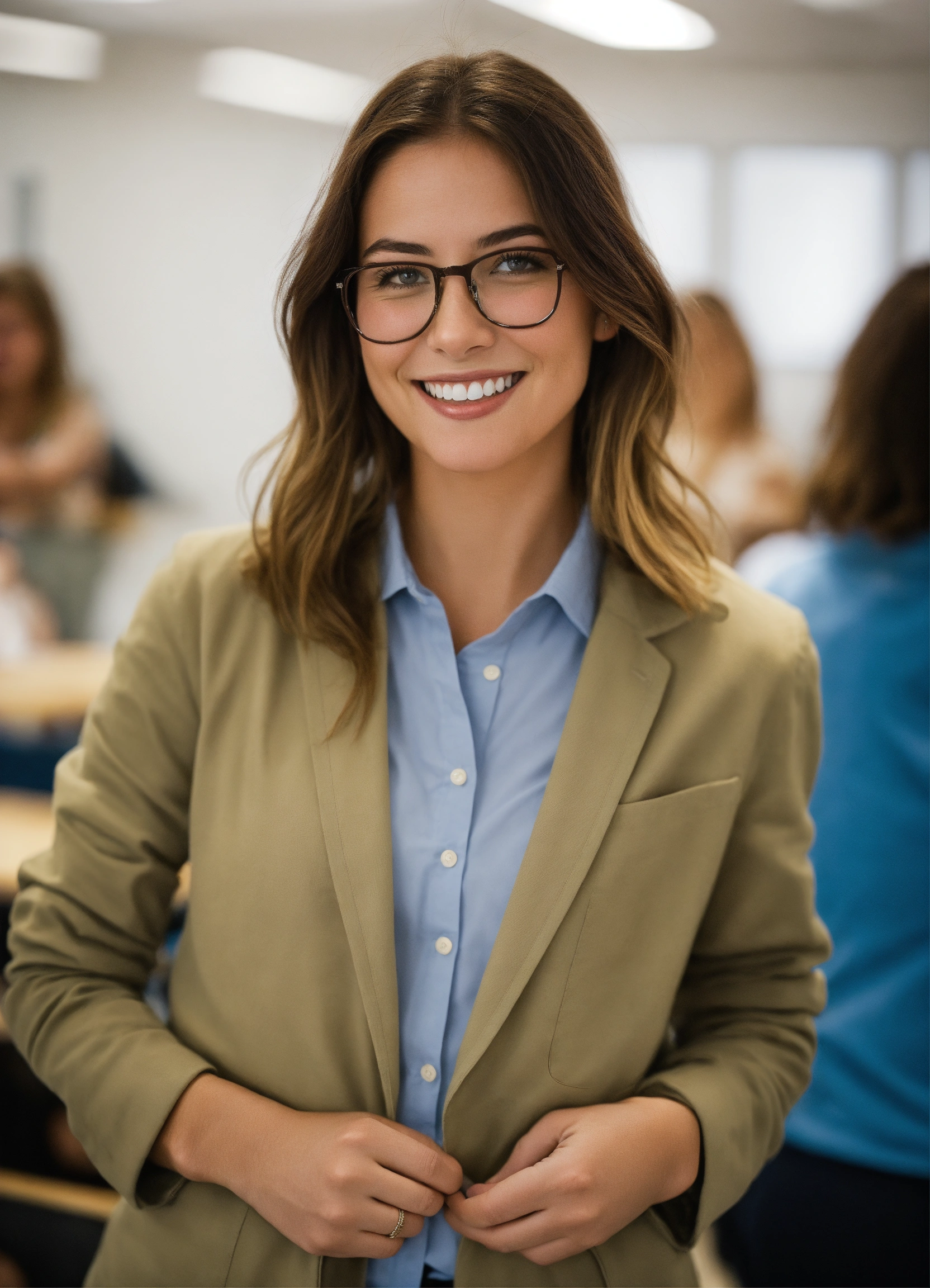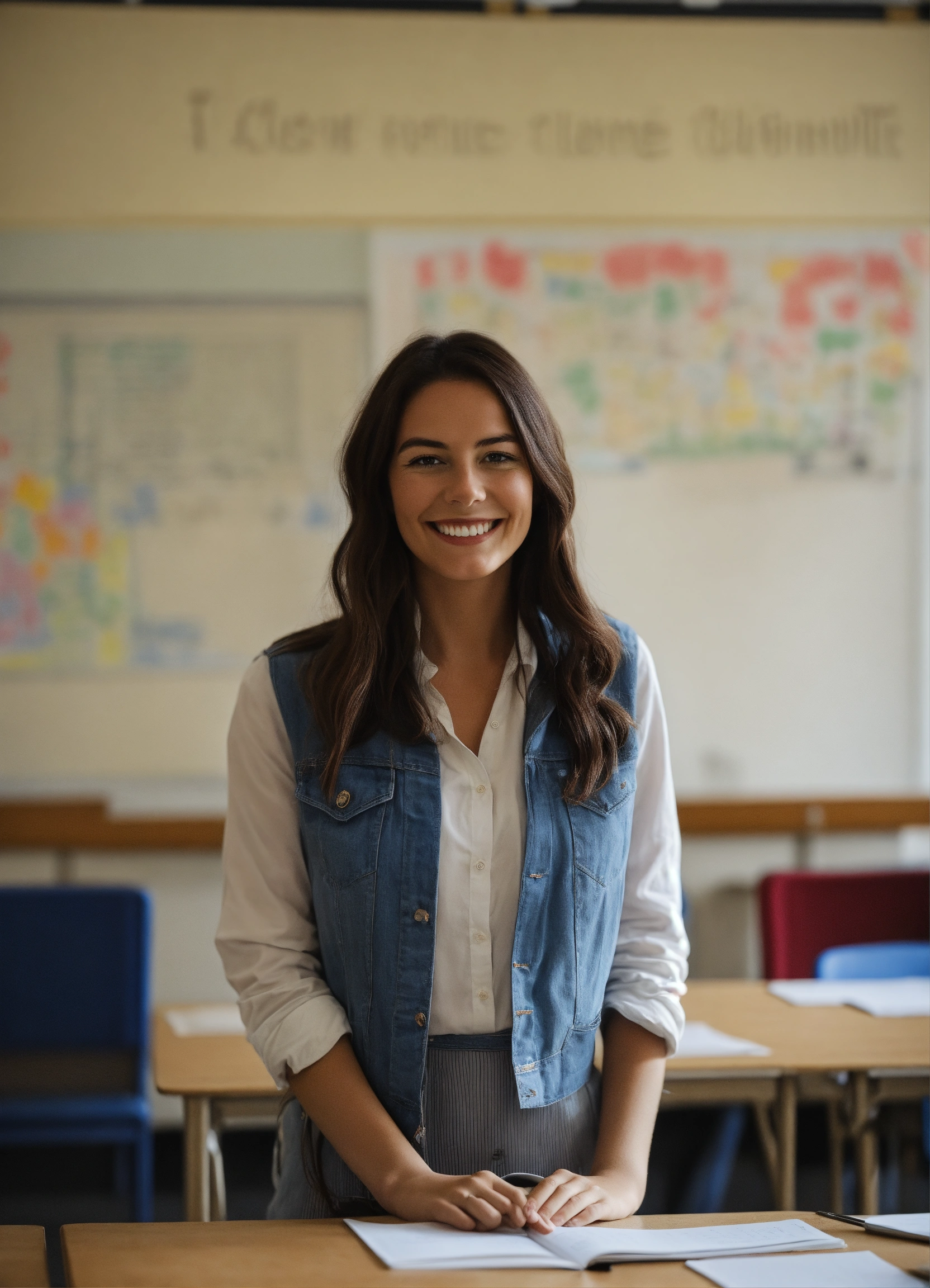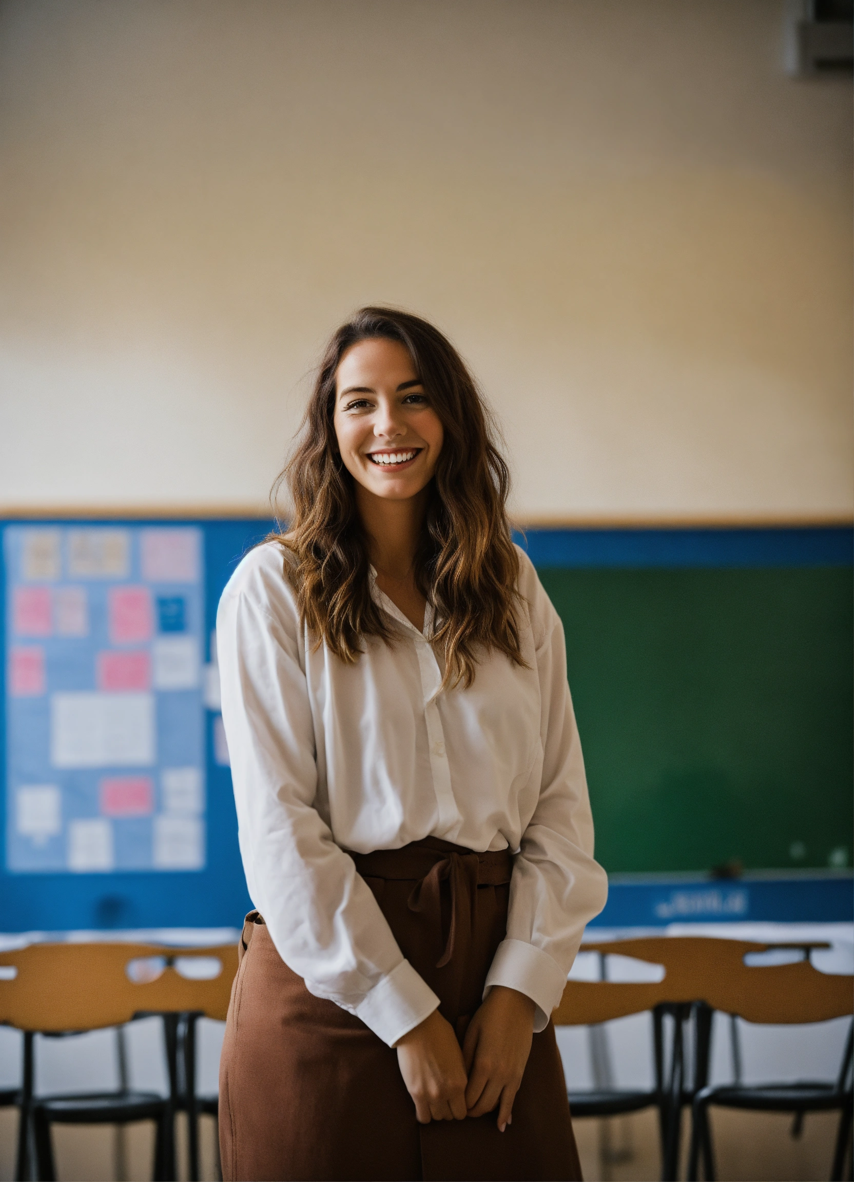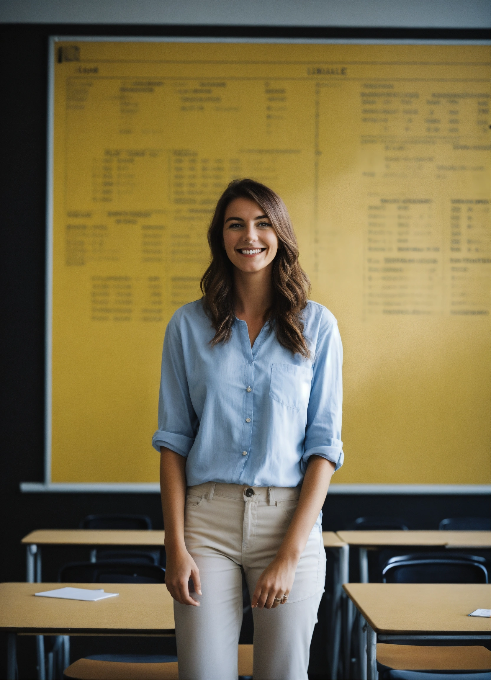 Un plan large montrant une femme souriante debout devant un tableau blanc d'une salle de classe
