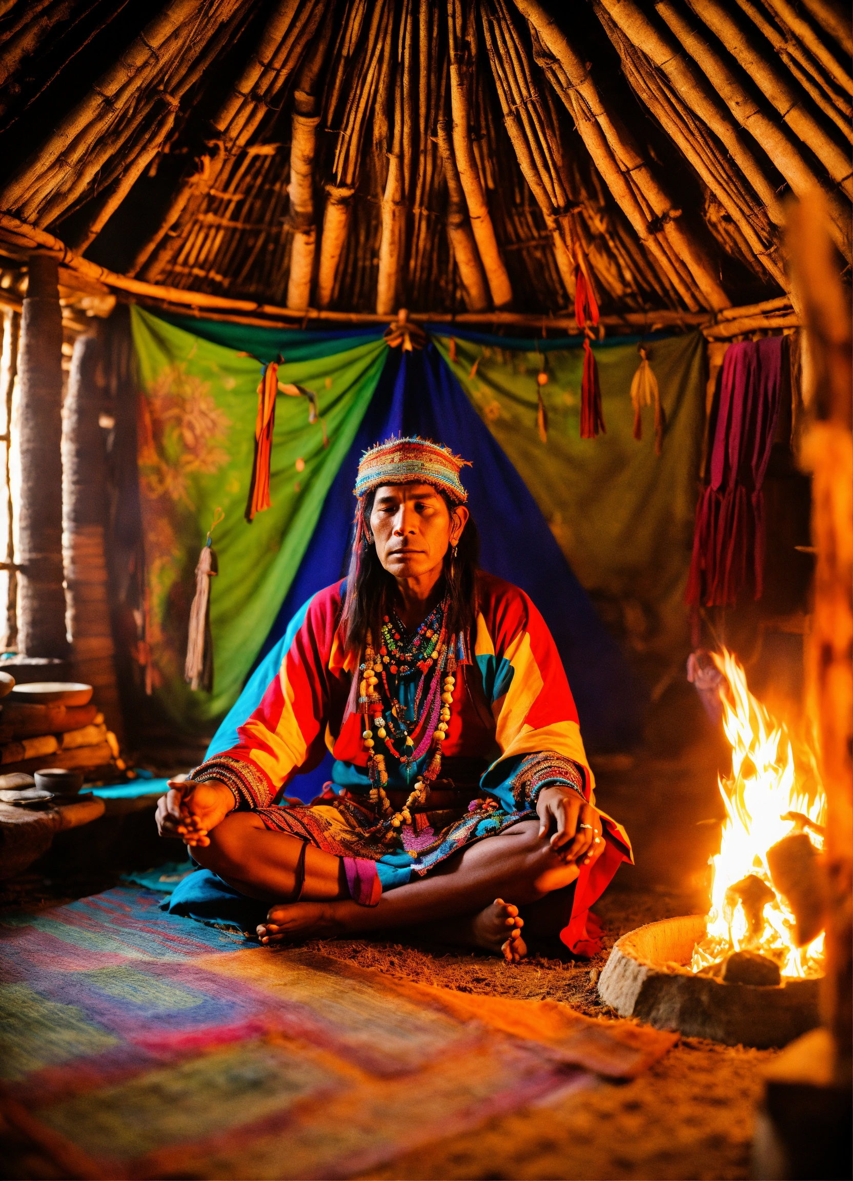 Peruvian shaman sitting cross-legged in shamanic trance illusion ayahuasca visions in his hut aura multi-color front of fire