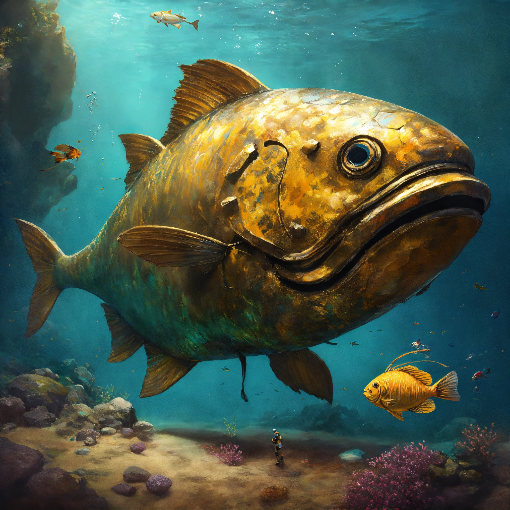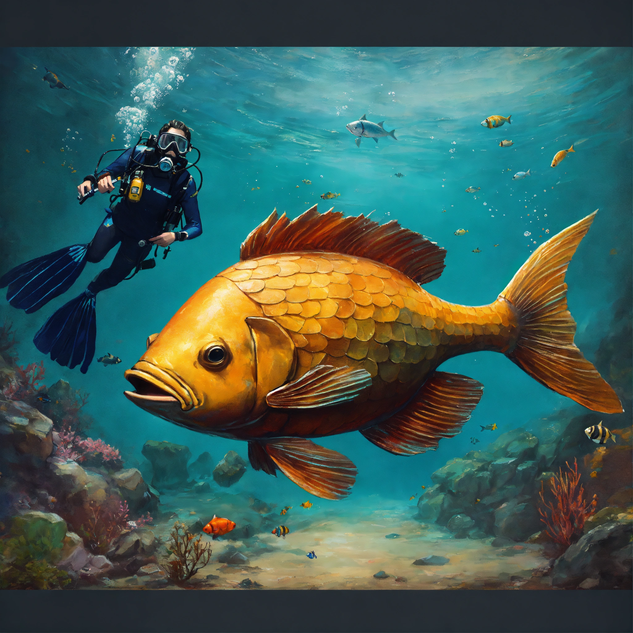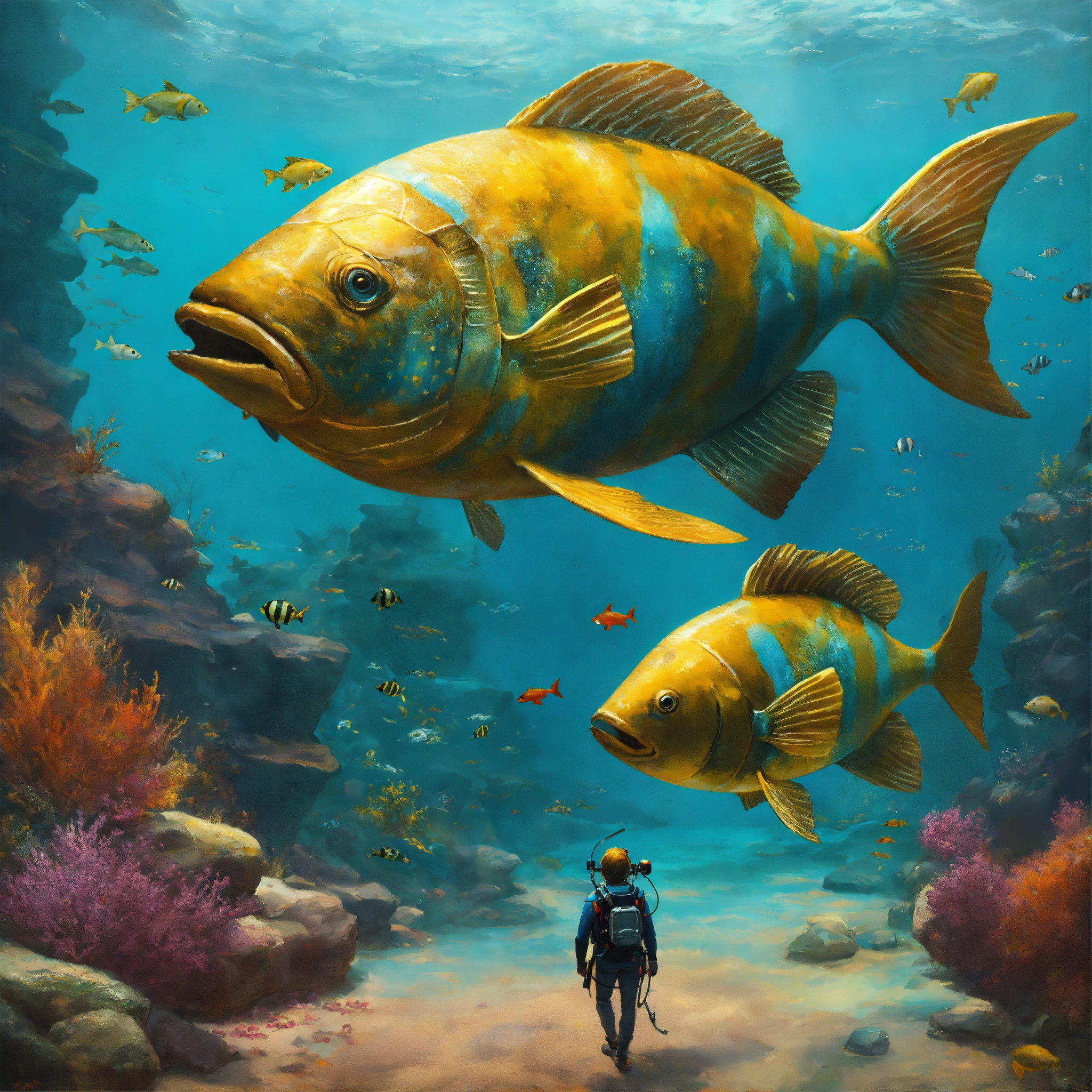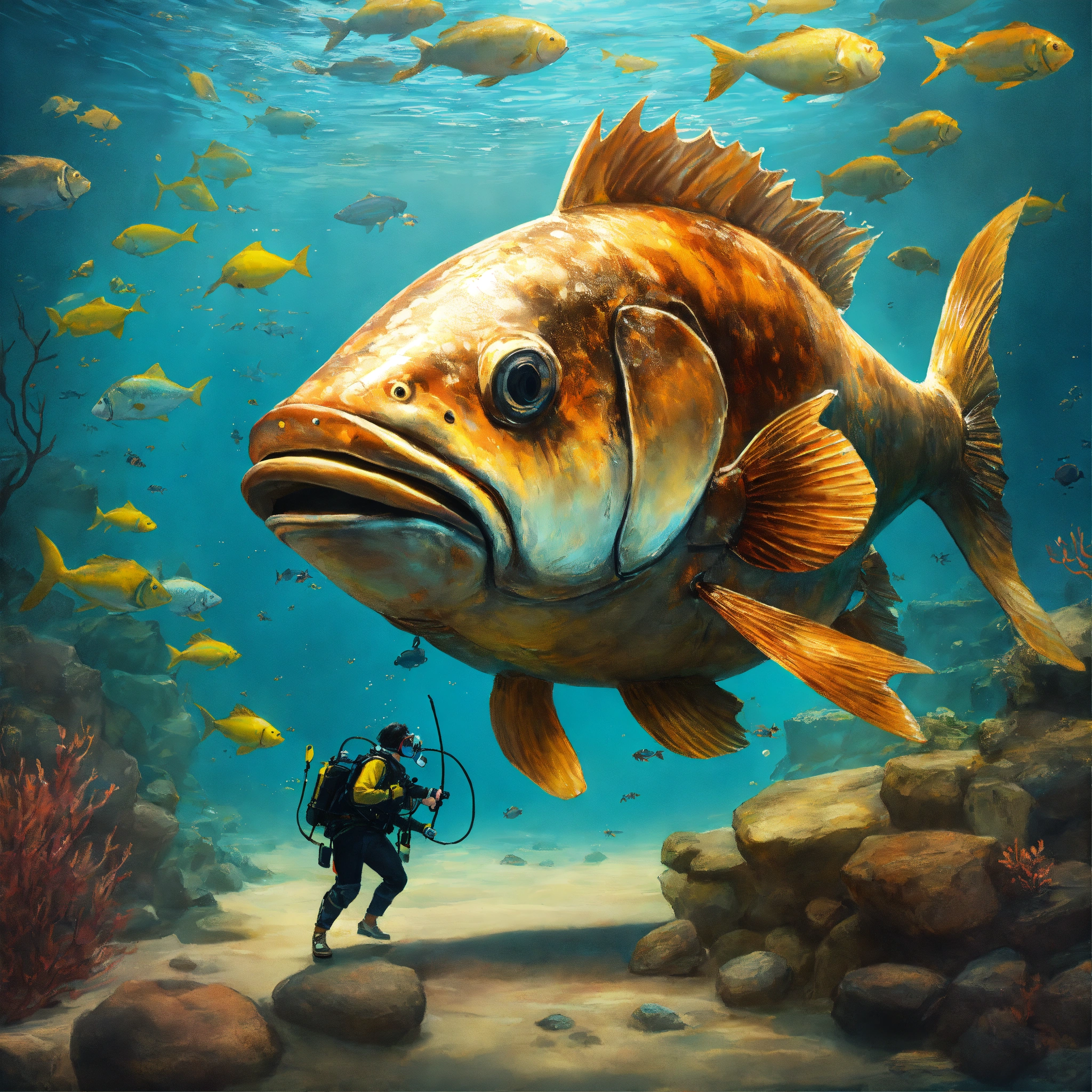 Concept art of a big fish made out of rock next to tiny scuba divers, highly detailed, oil painting style, brush strokes, 8k