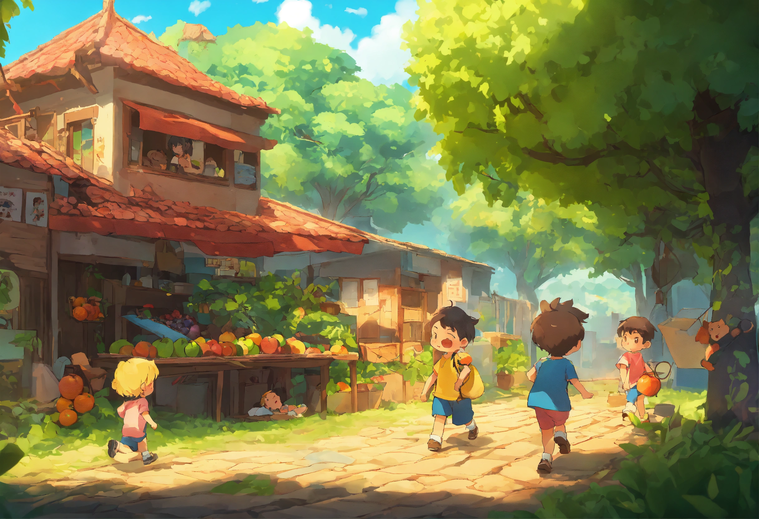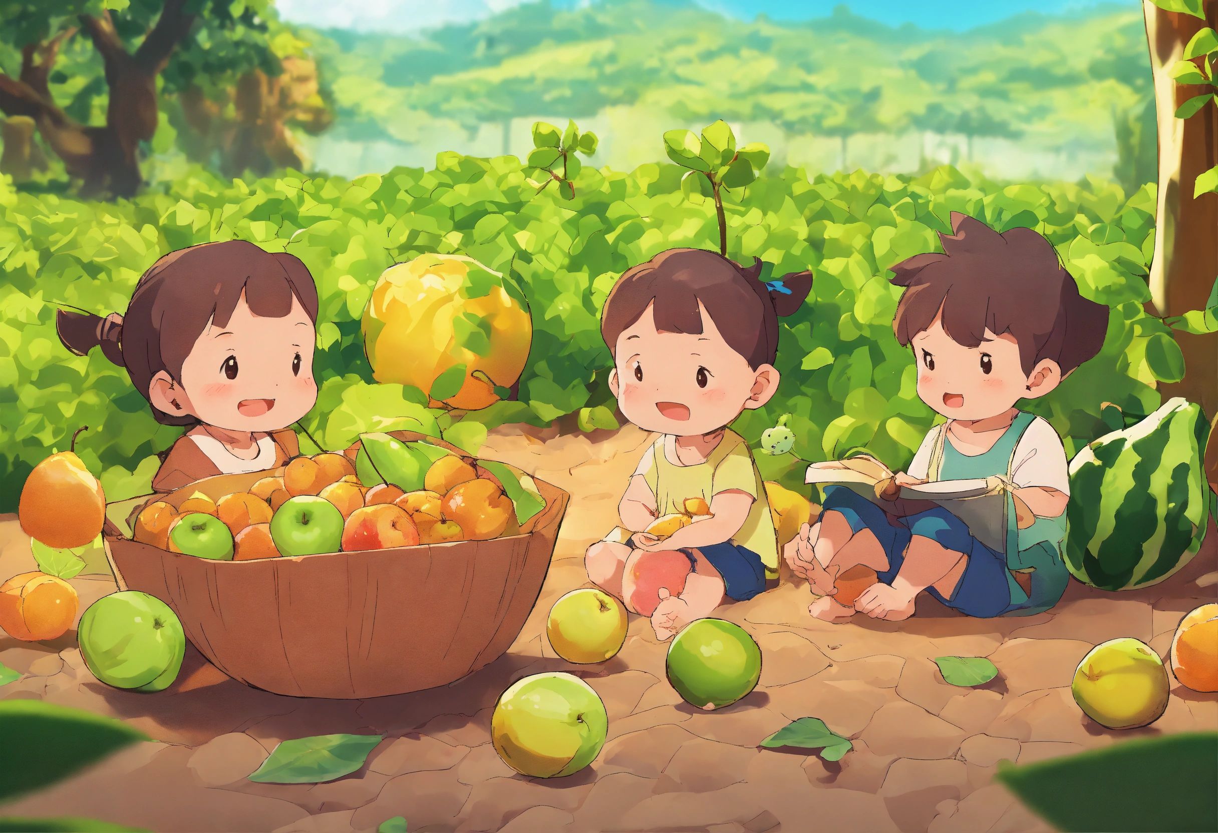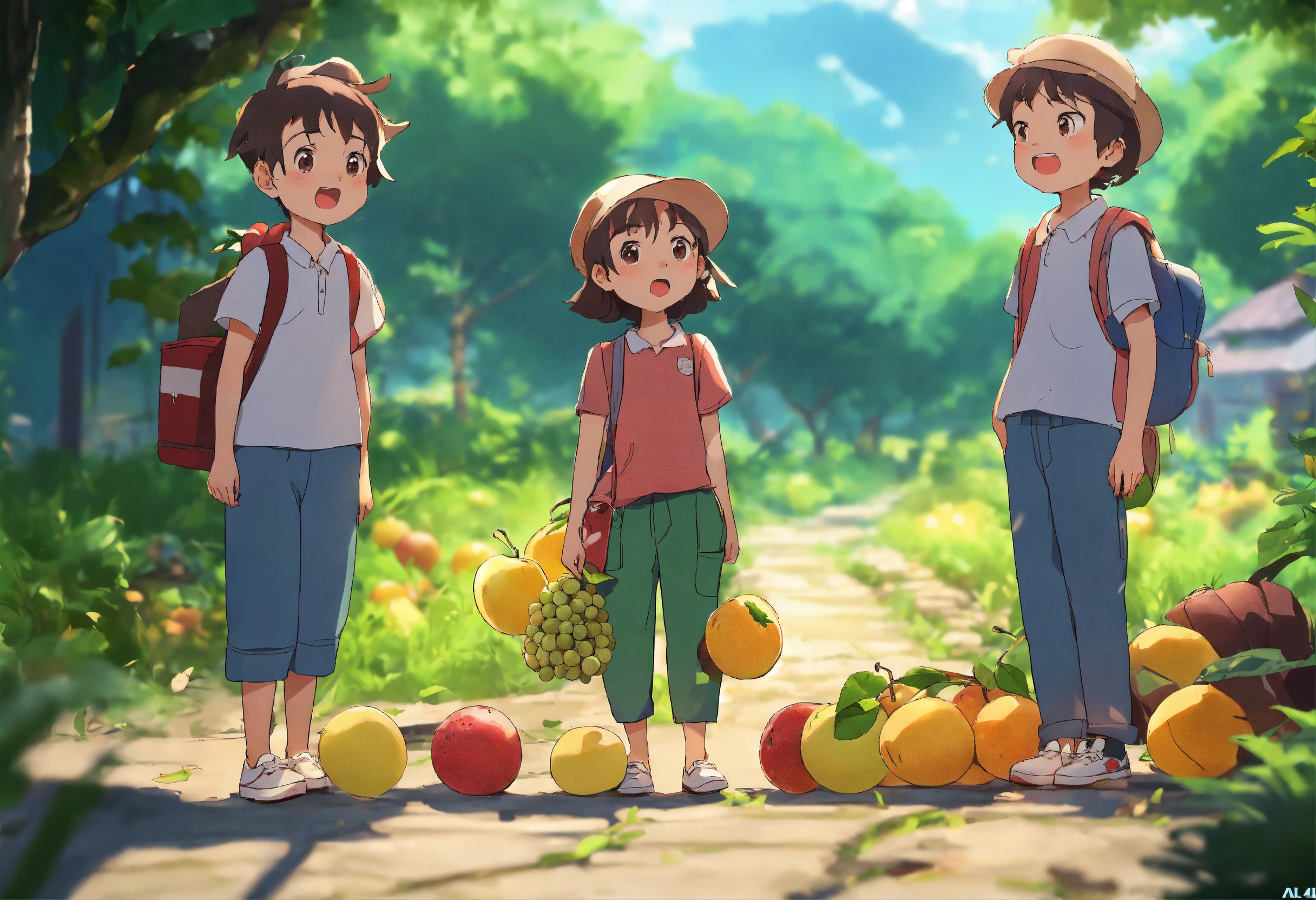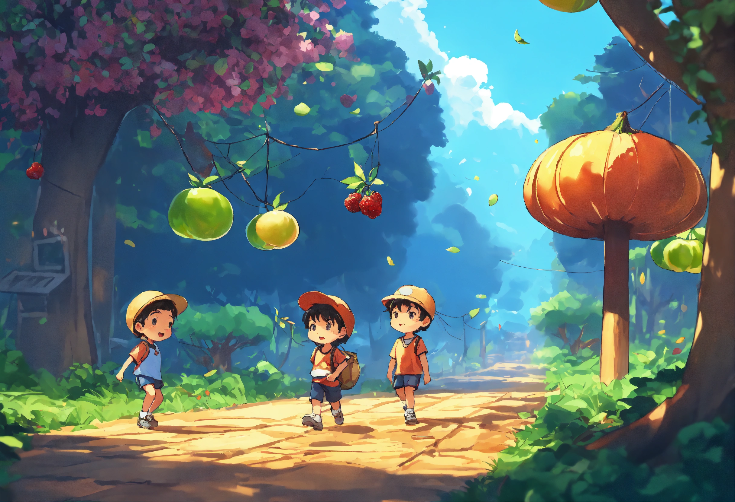 They had collected all the fruits. the next day they intended to return. when they lay down to slow down in the afternoon, there was a tremor on the ground and it seemed like an earthquake. then the three friends got up and looked around for the cause. they started doing it. ai cartoon 4k hd image 2 parallel fast generations