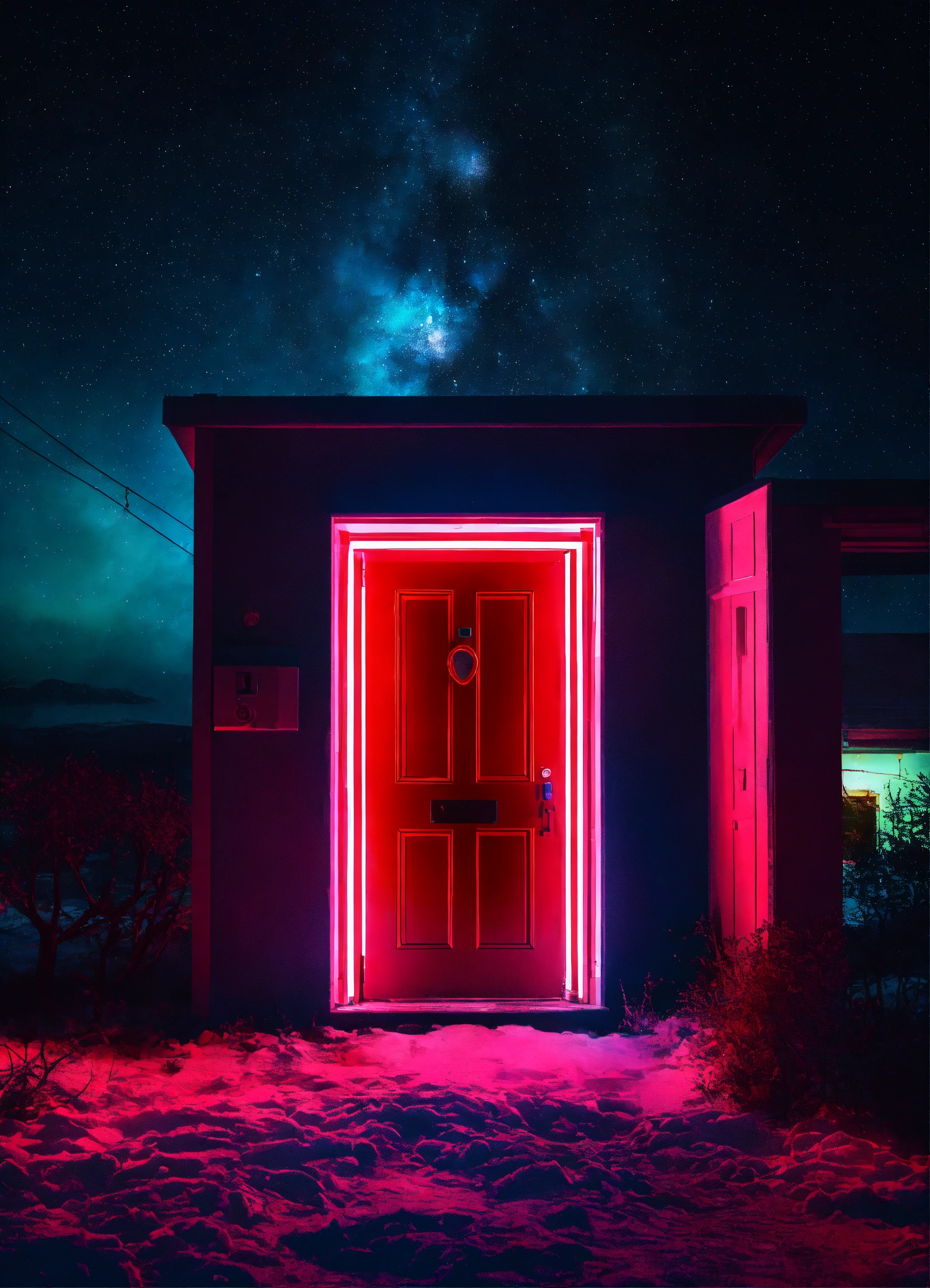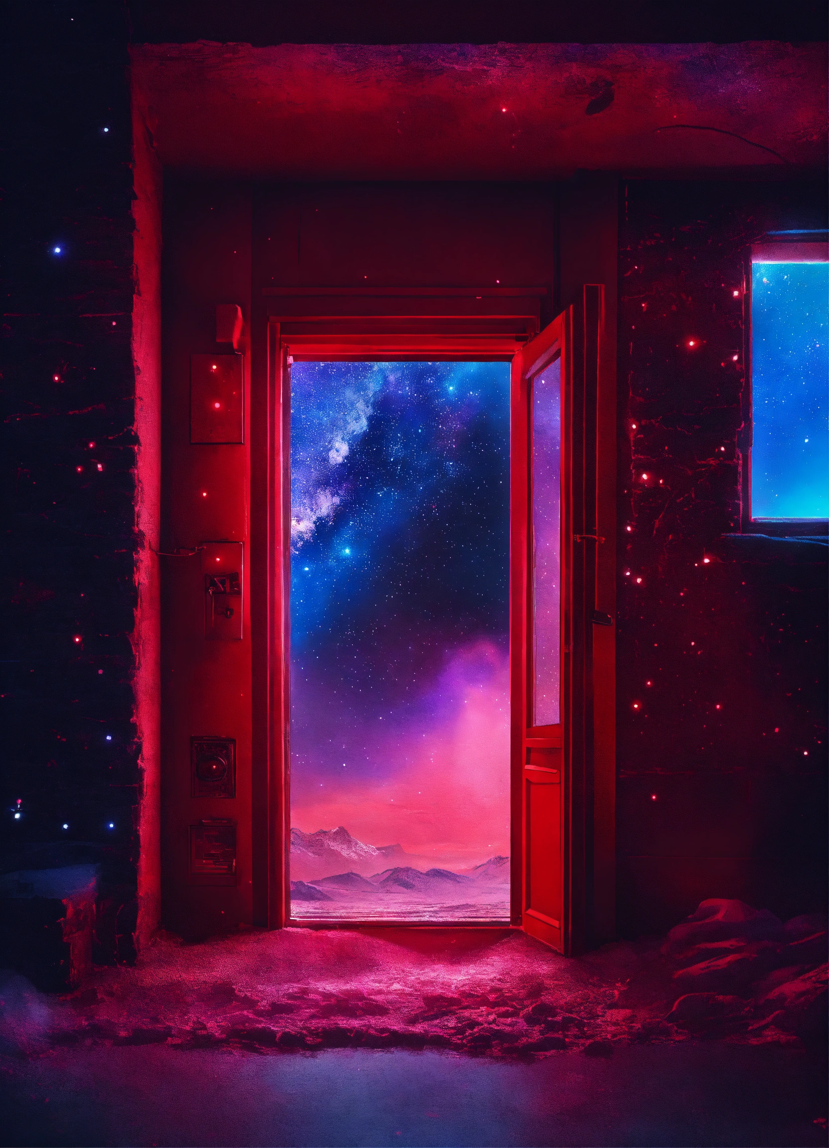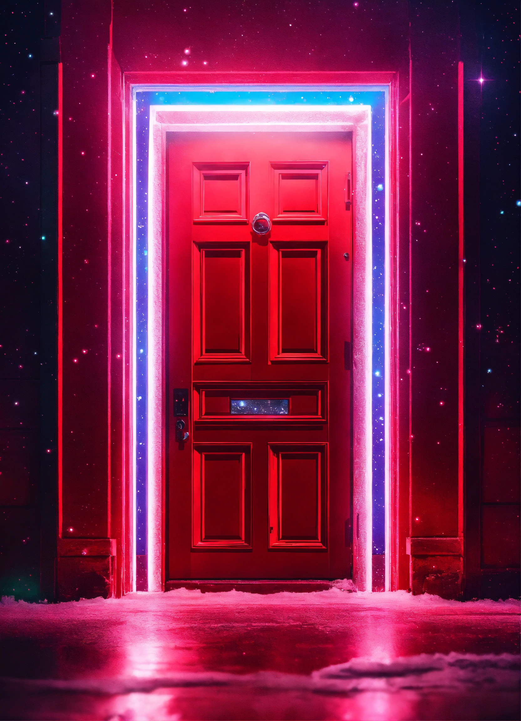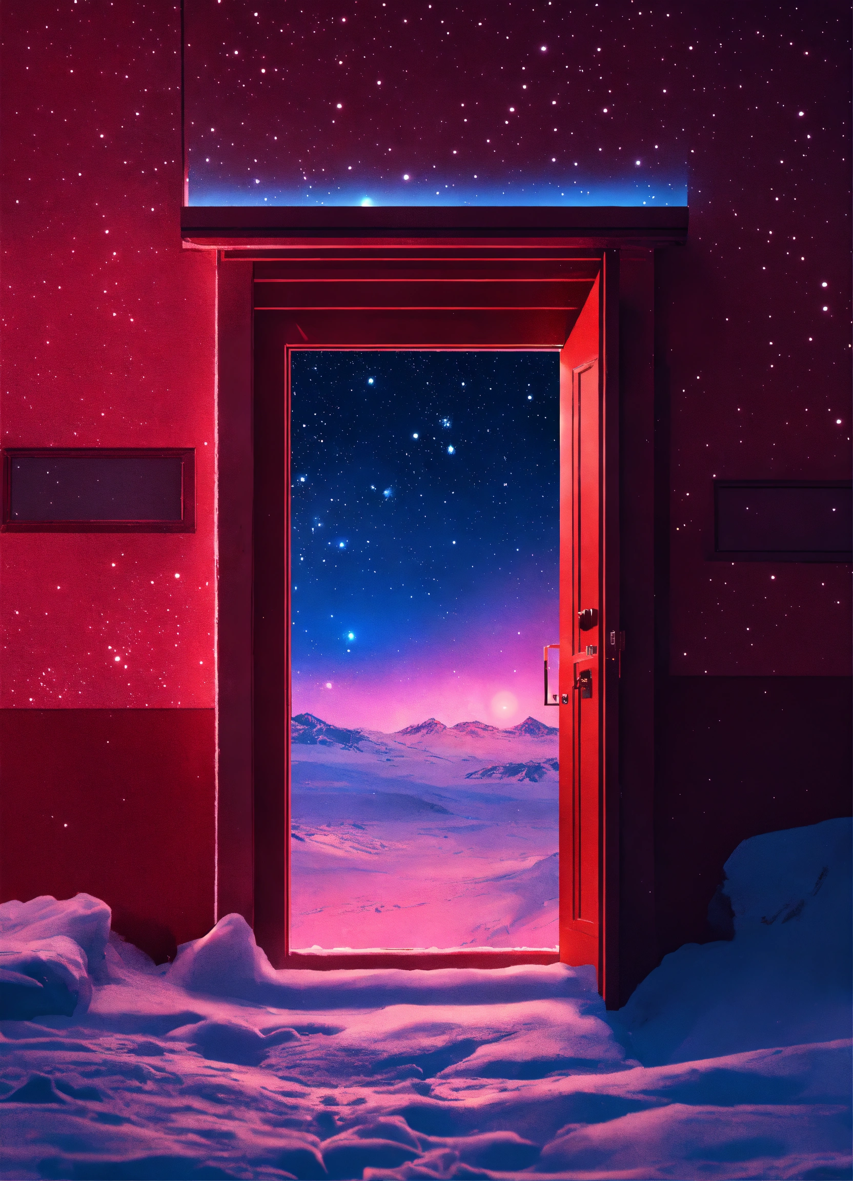 Red door in the cold space with neon light in doorwindow, mistic doorframe, full of stars sky at night, icepunk, retrowave, average plan, wallpaper