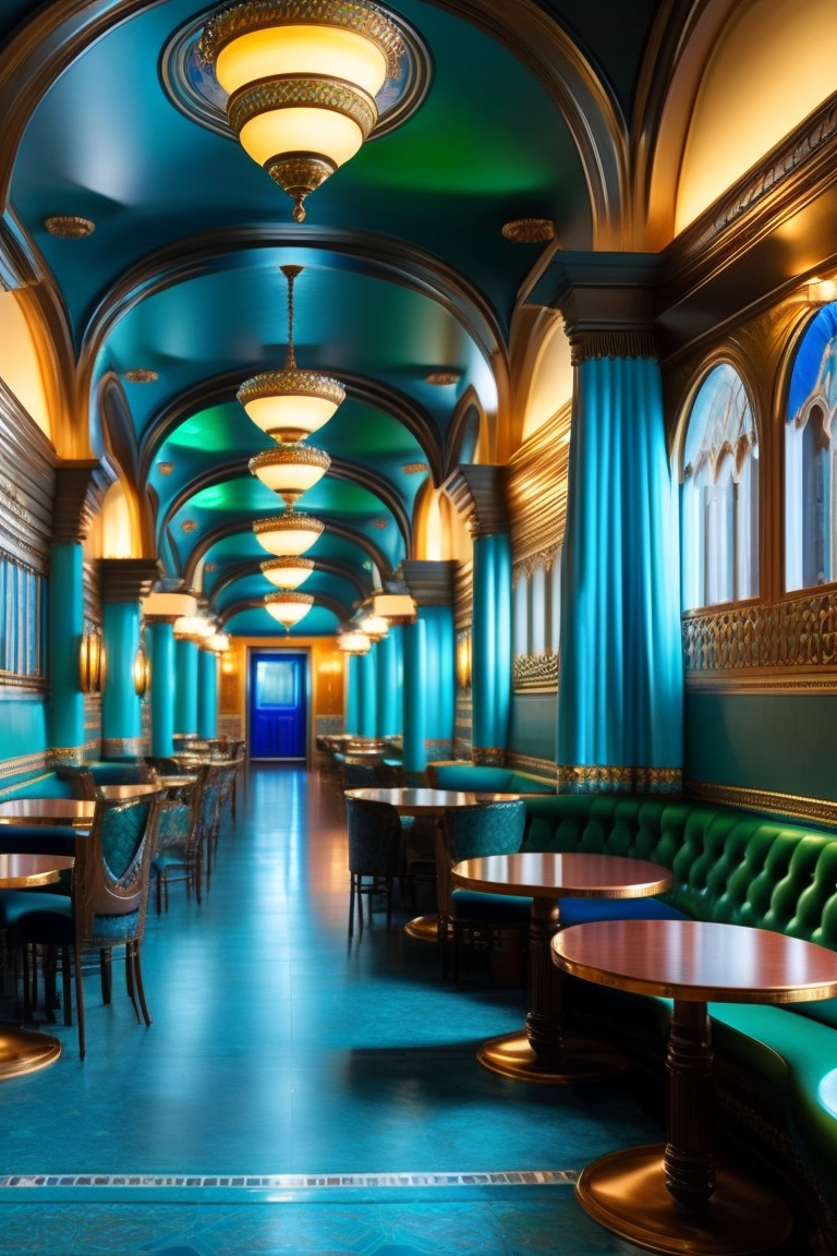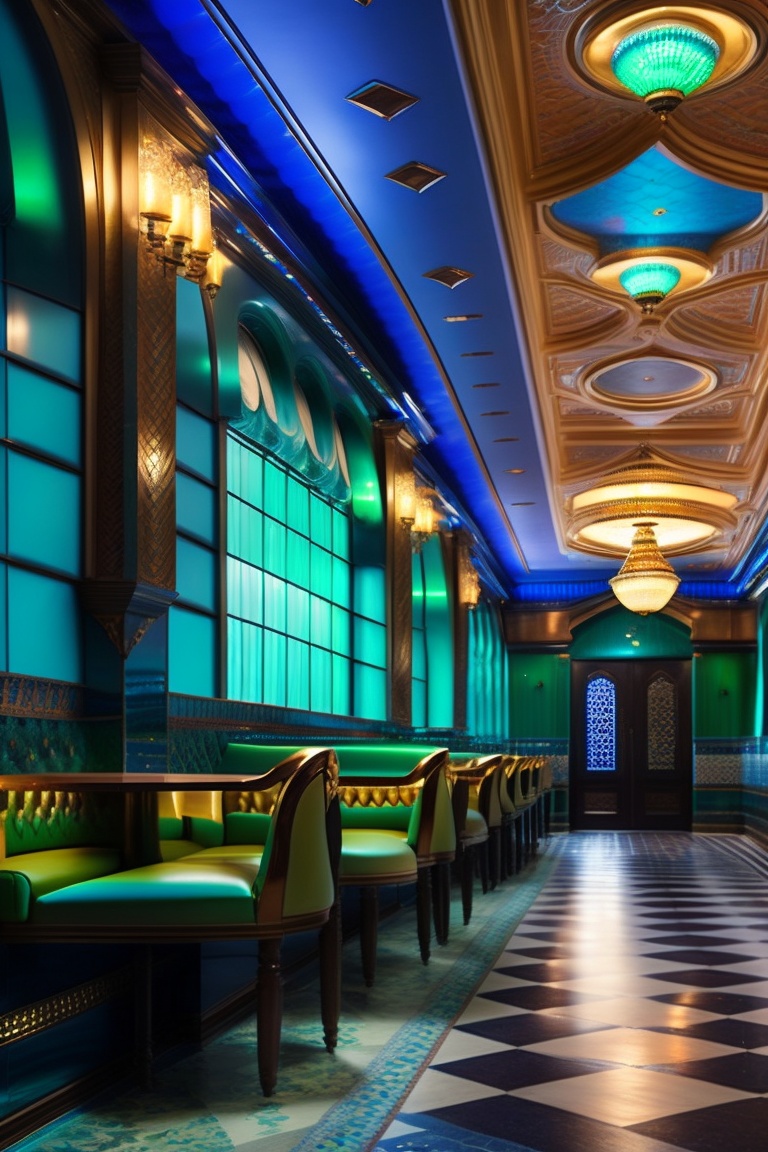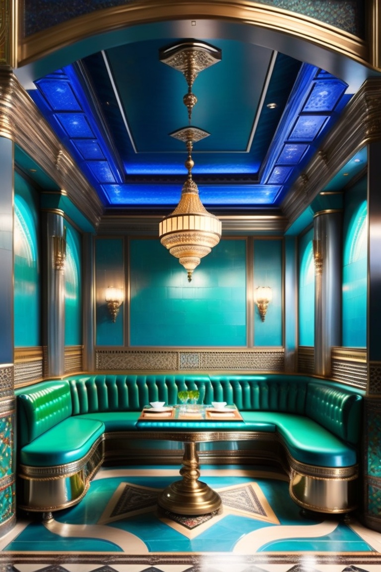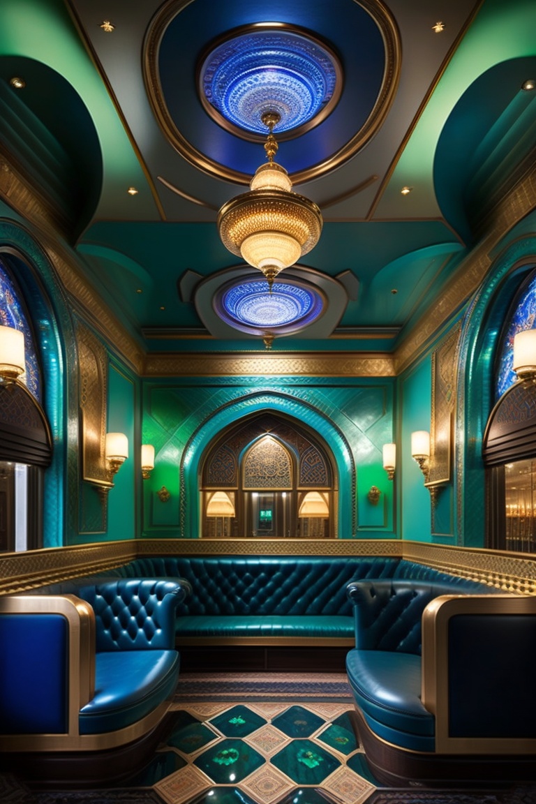 A beautiful vintage restaurant, islamic+persian architecture, vintage pullman train car restaurant, leather chesterfield seats, turquoise marble floor, lapis lazuli wall tiles, emerald arches and pillars, cinematic ambient lighting, dramatic artificial accent lights, architecture, archetictural, intricate classic details