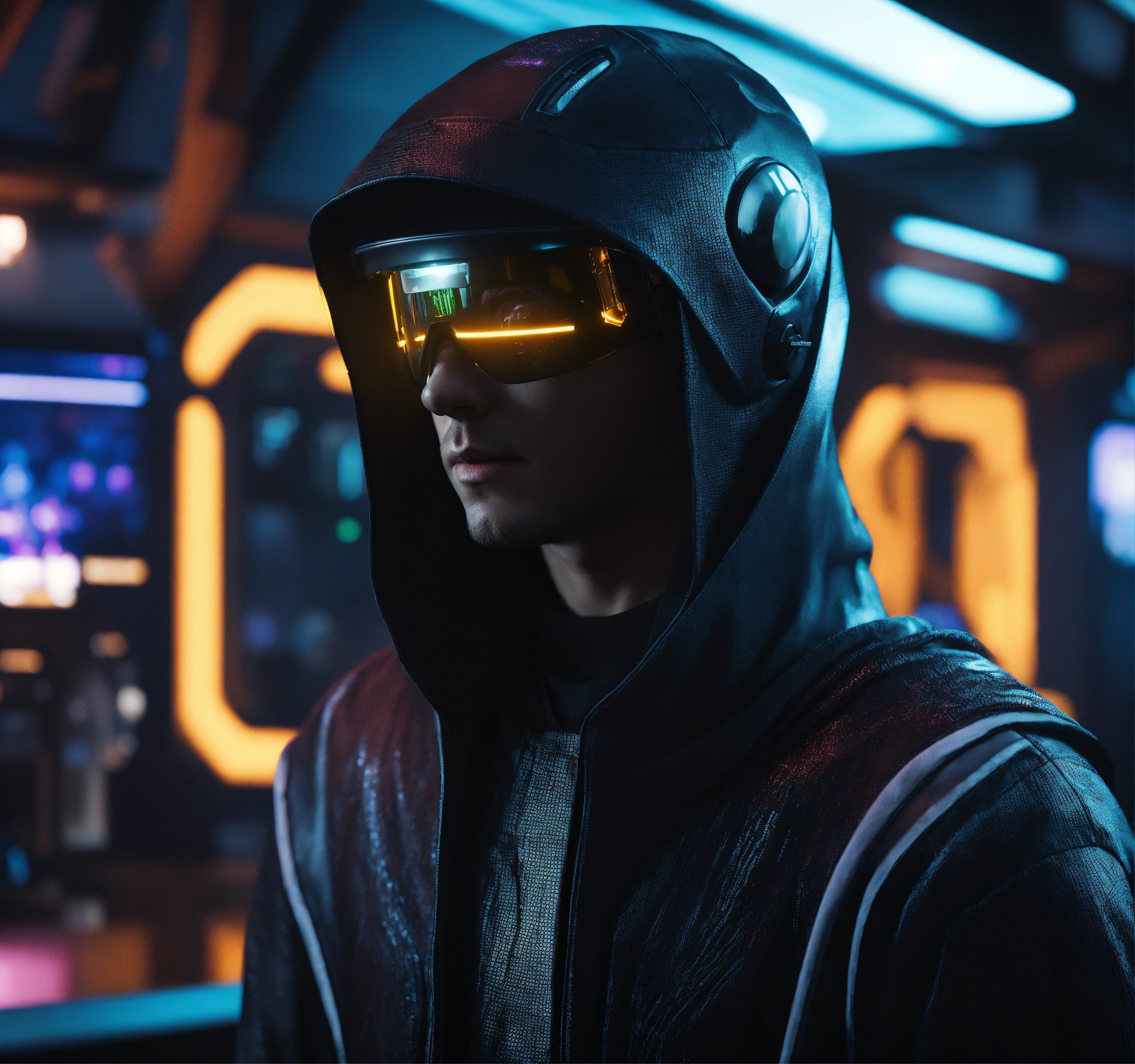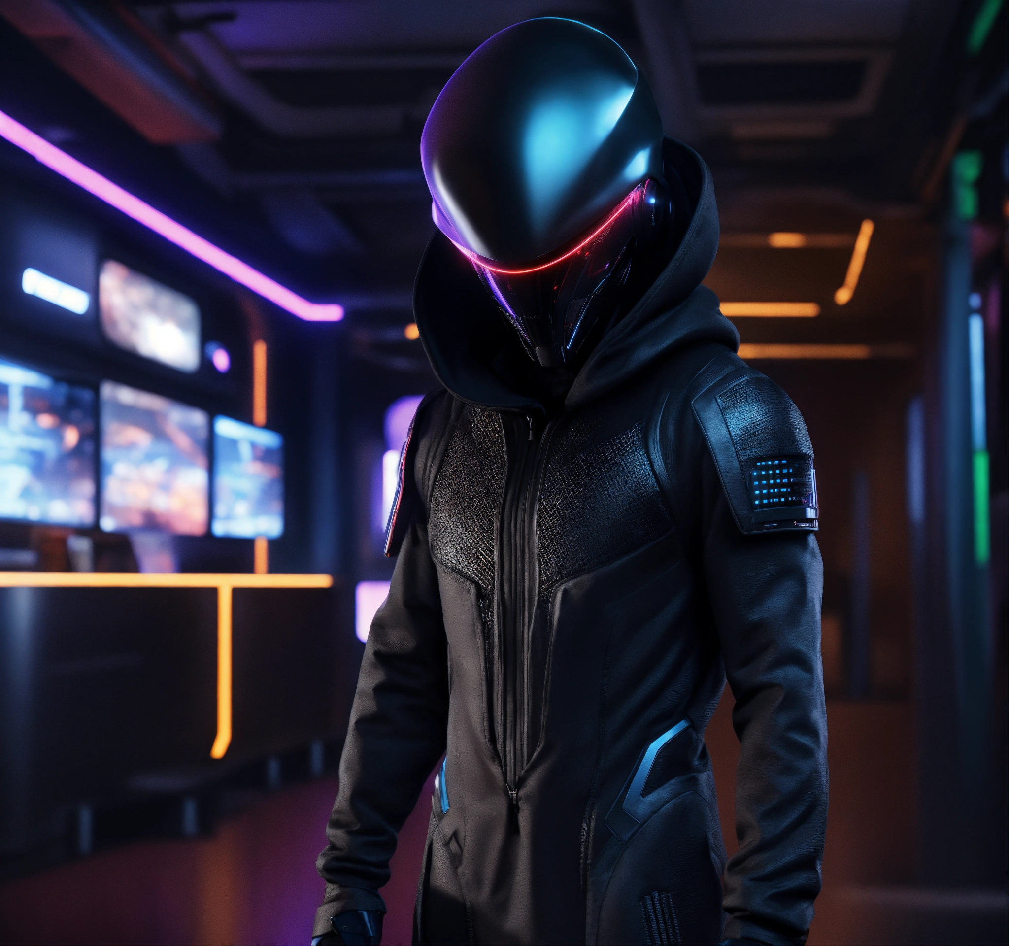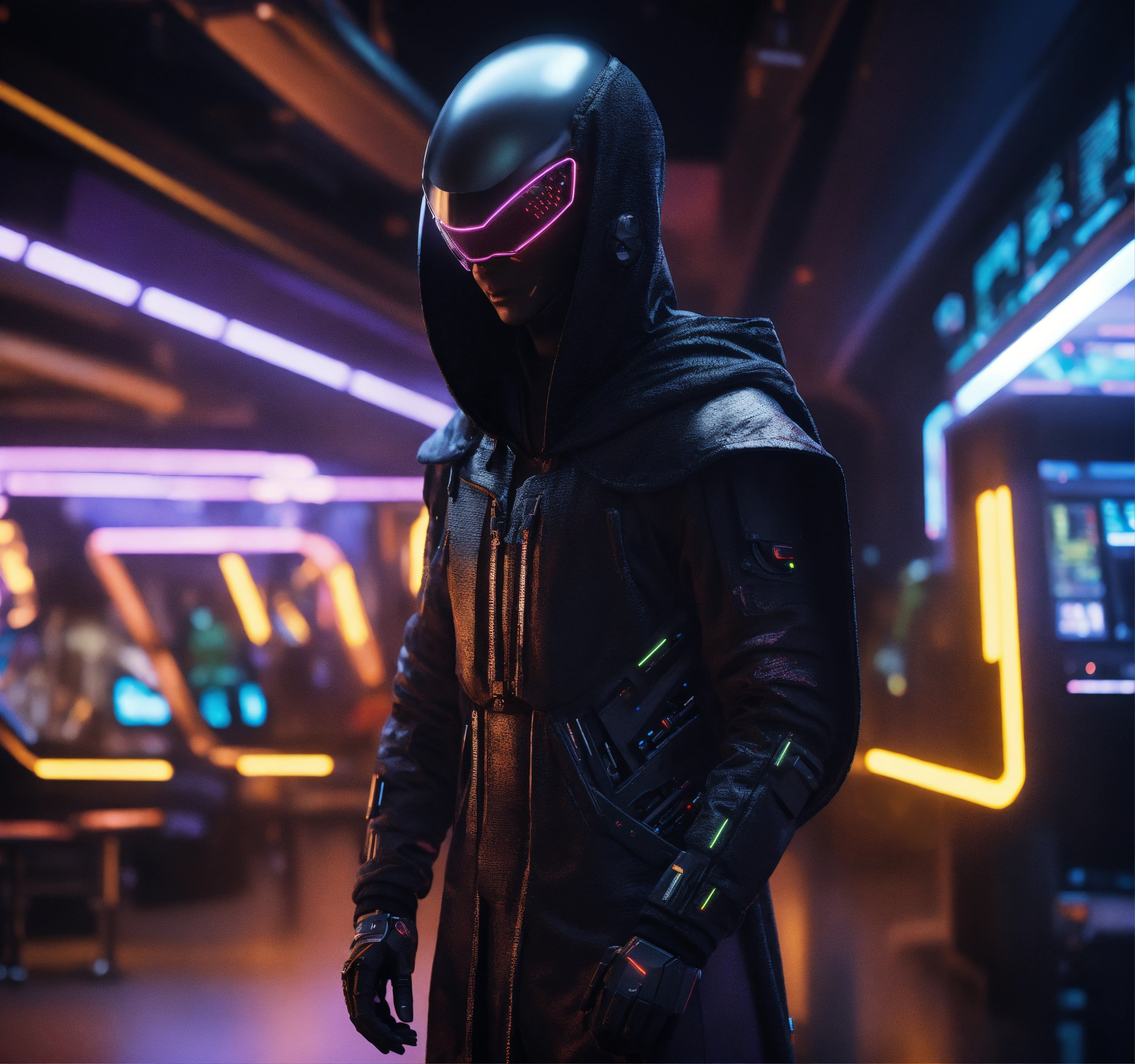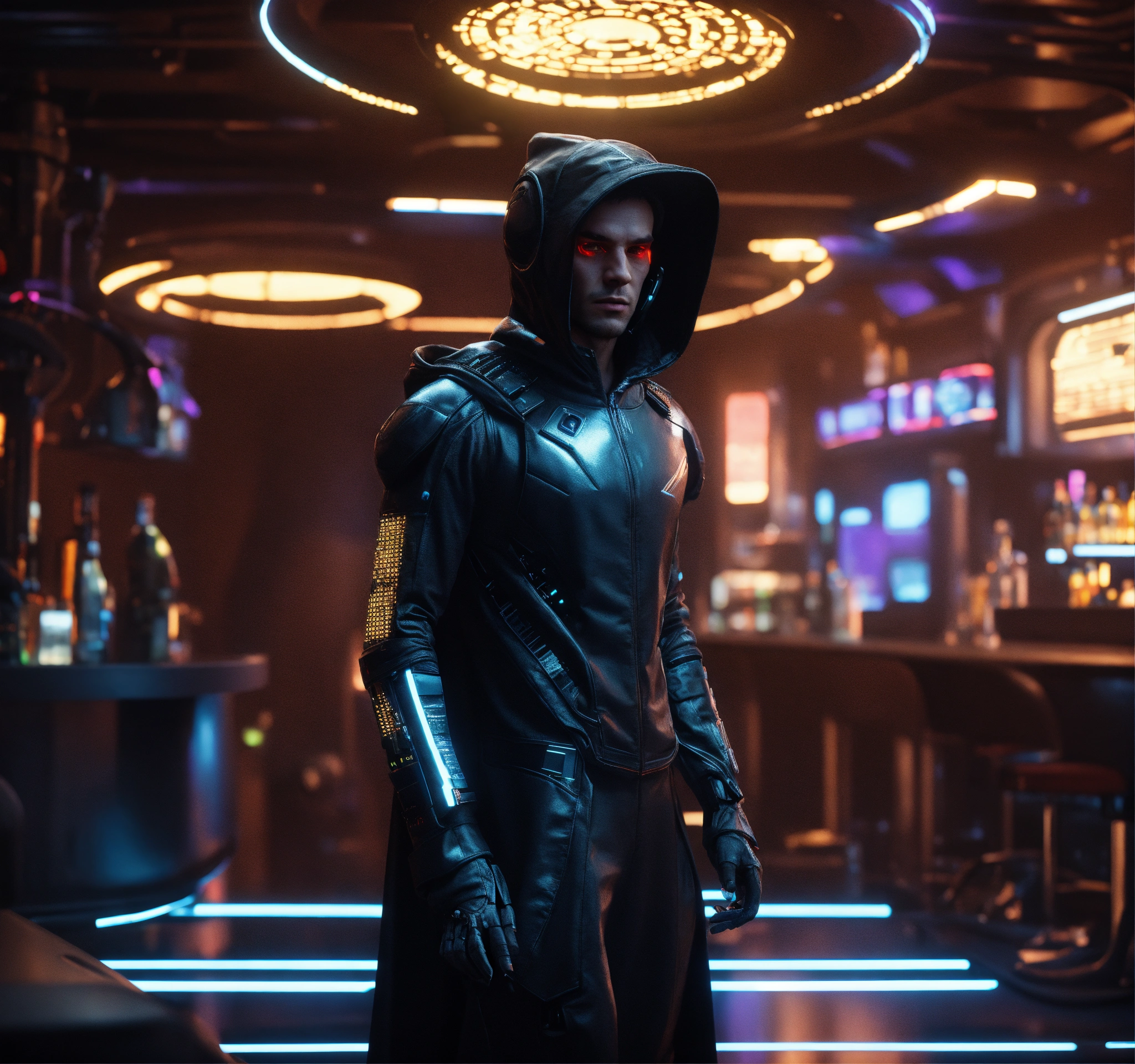 Male alien mutant half cyborg hacker wearing futuristic black clothing, hi-tech visor and hooded cape, in a dark futuristic space port bar, 8k, realistic. unreal engine, pixar
