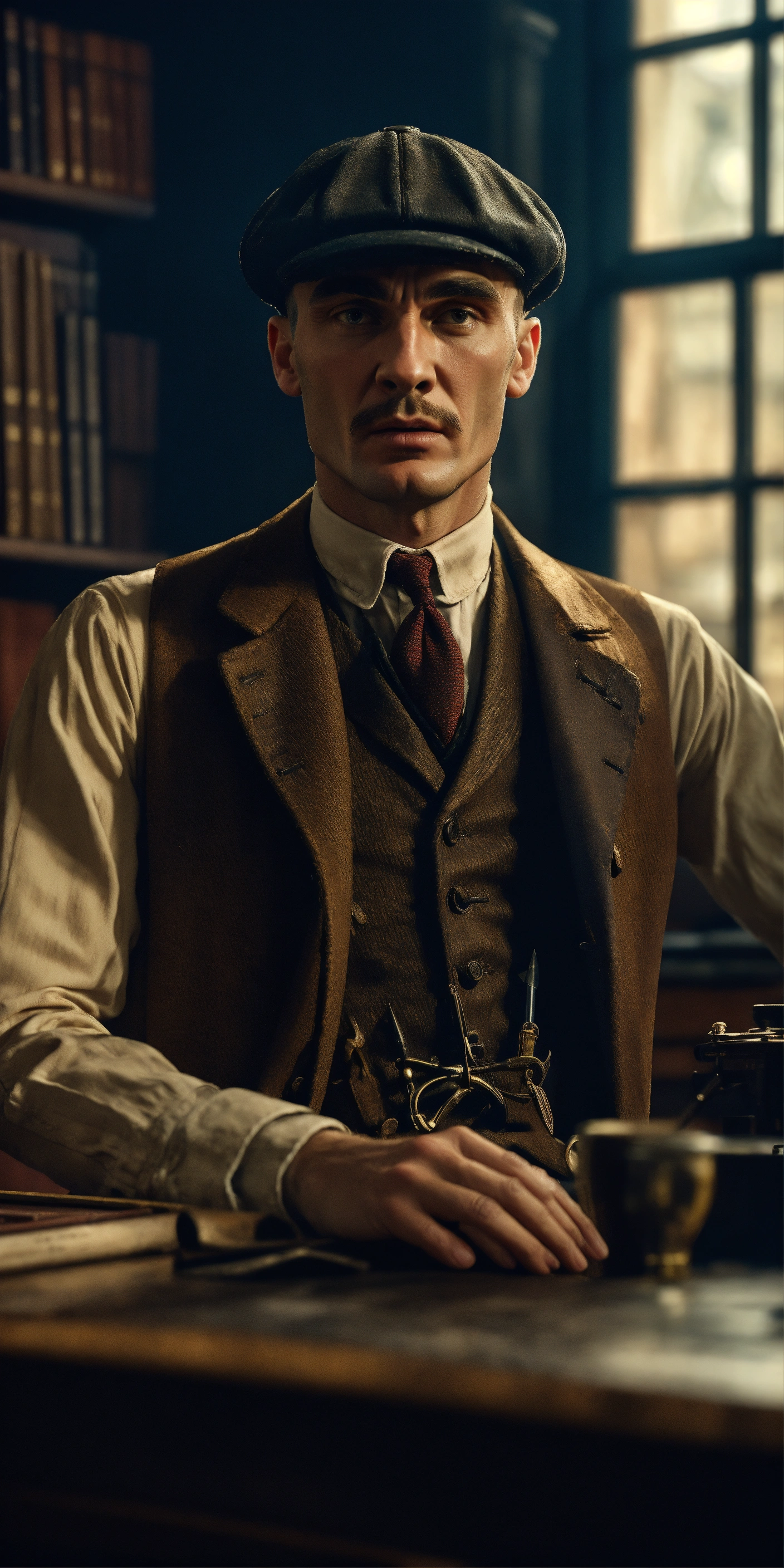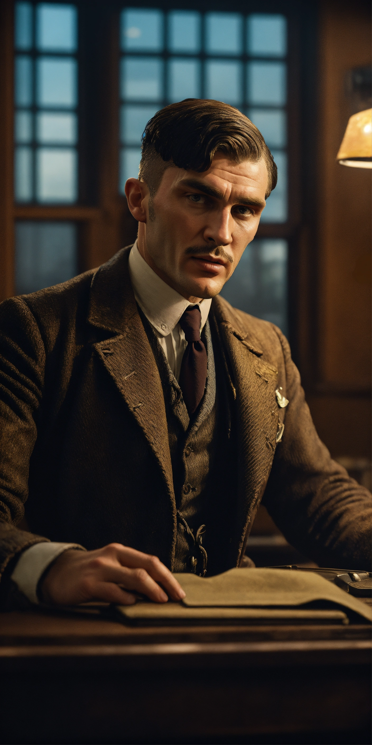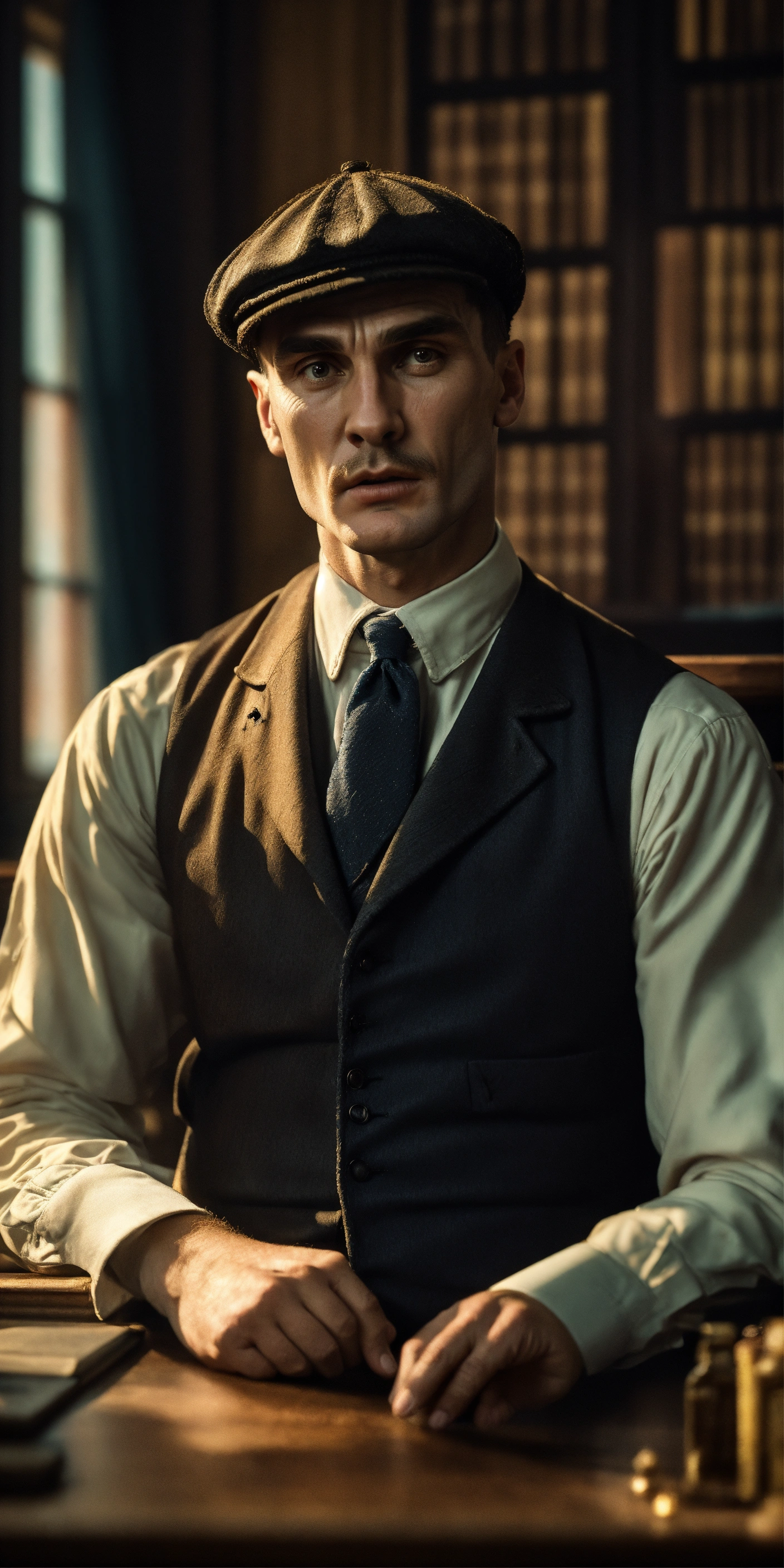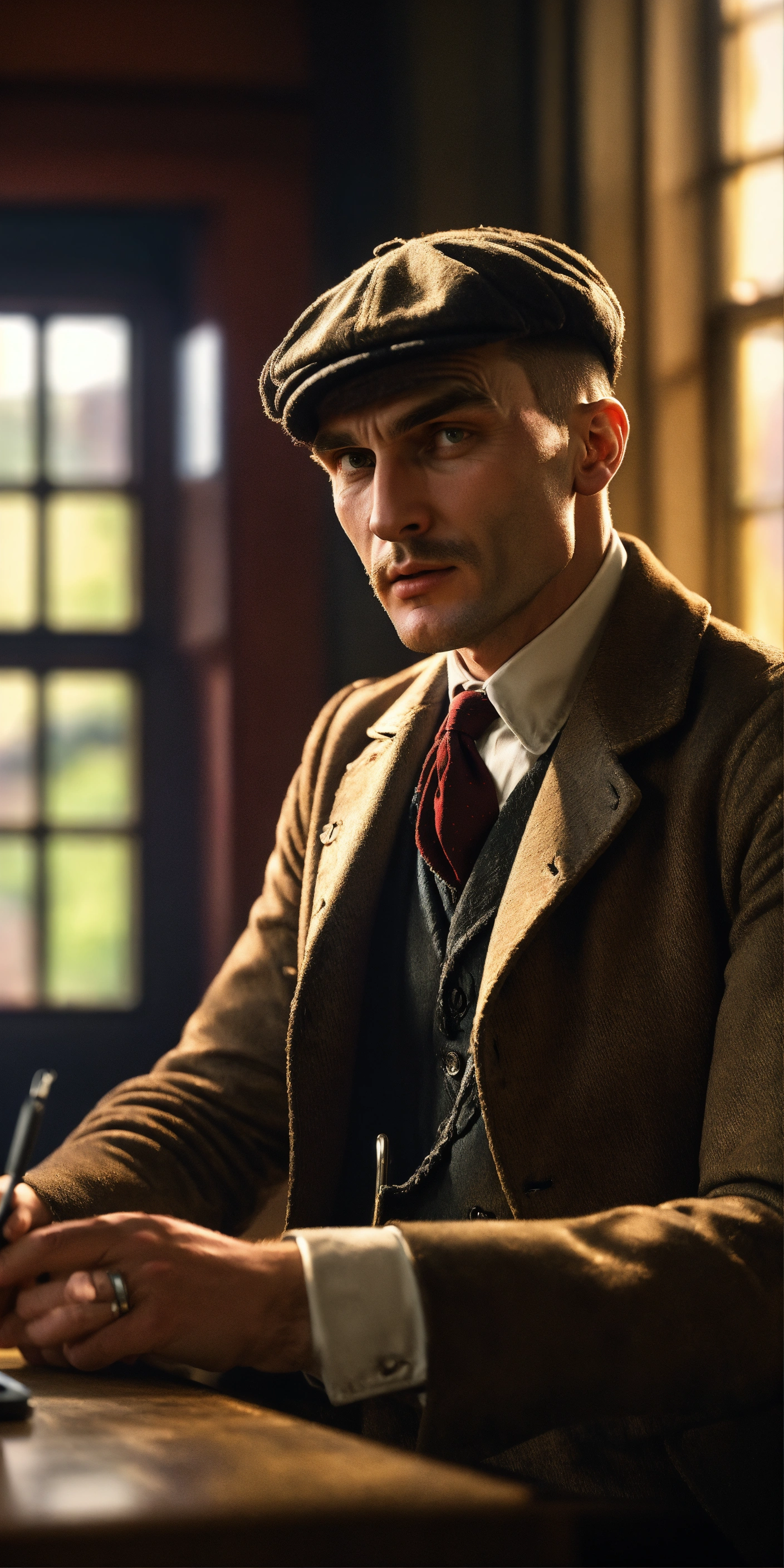 Character in the style of thomas shelby, front view, brightly colored image background, placing the character sitting behind a desk, looking towards the camera, with a large window behind, sharp focus, dramatic spotlighting, very detailed, 8k, autofocus creates an incredibly realistic image, slight blur in the background, studio quality