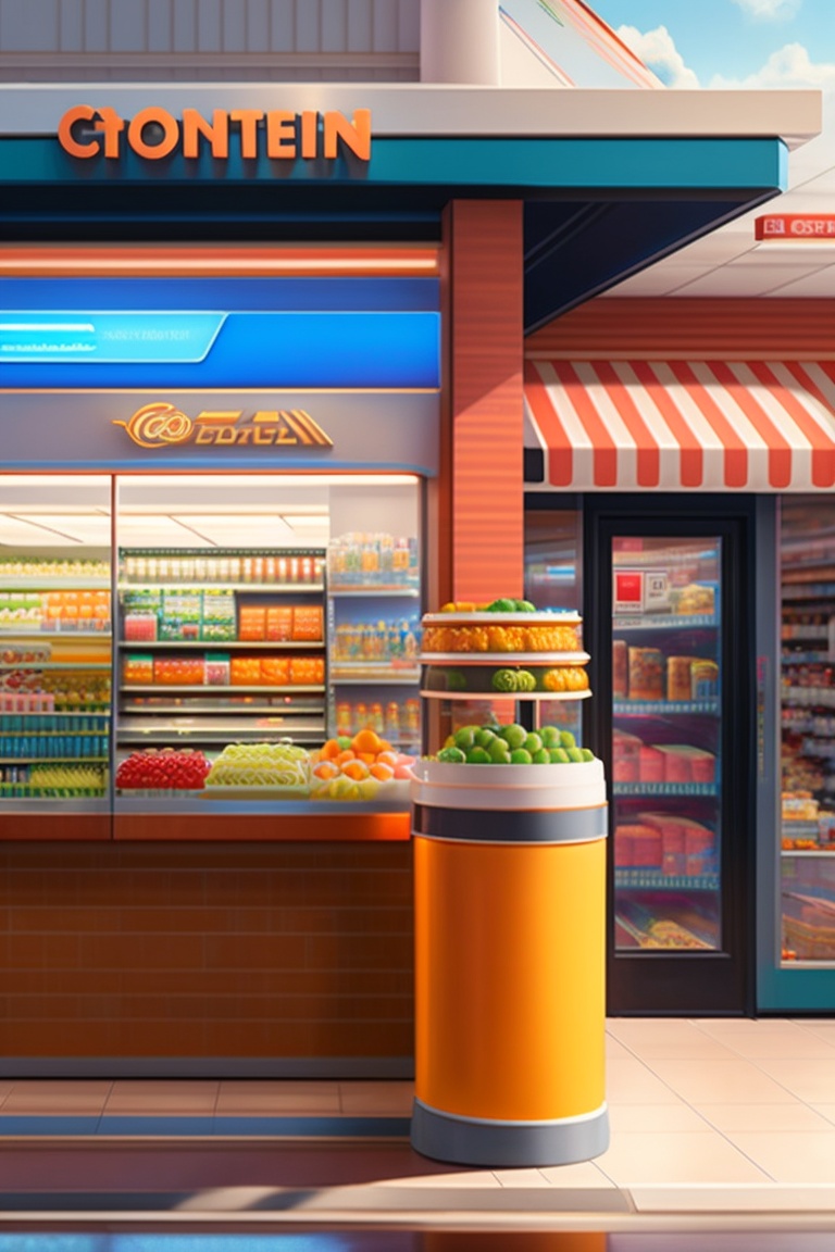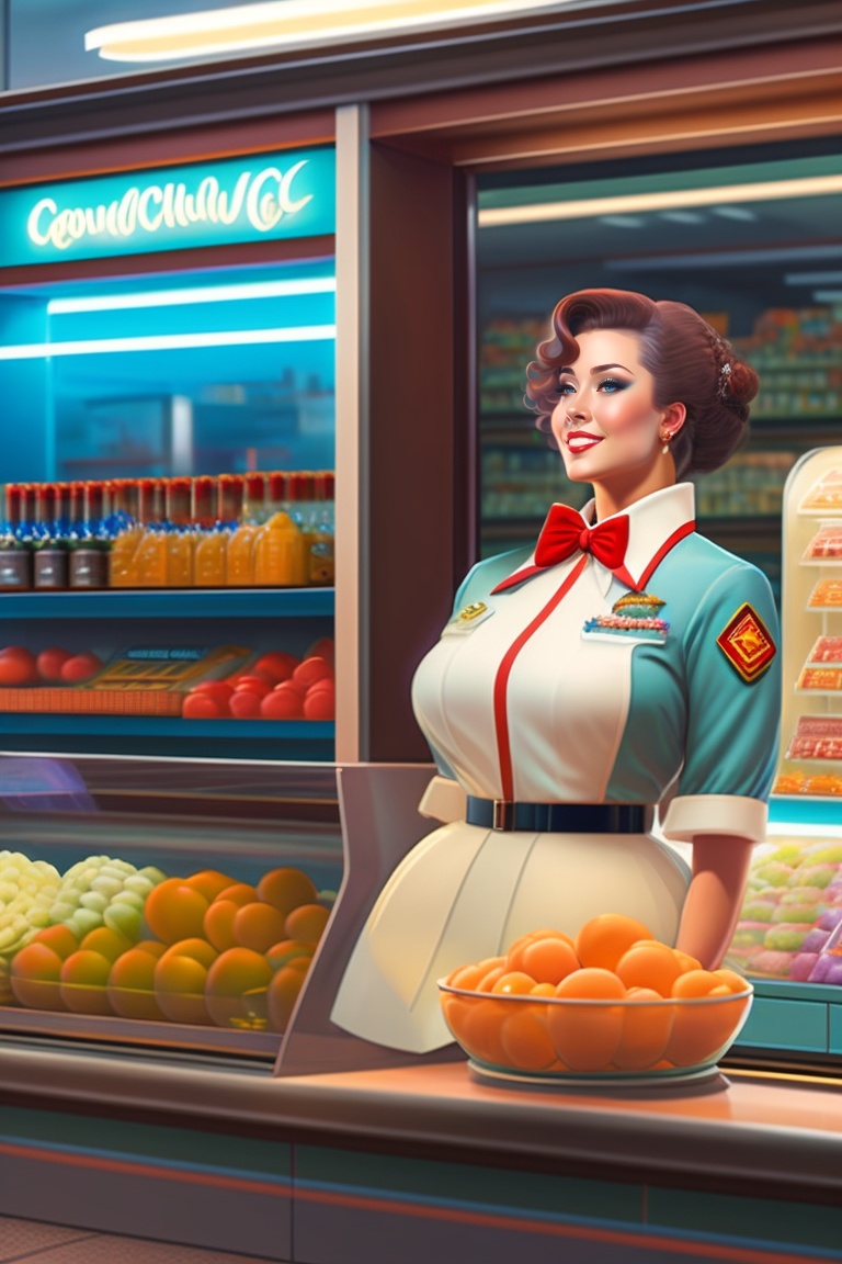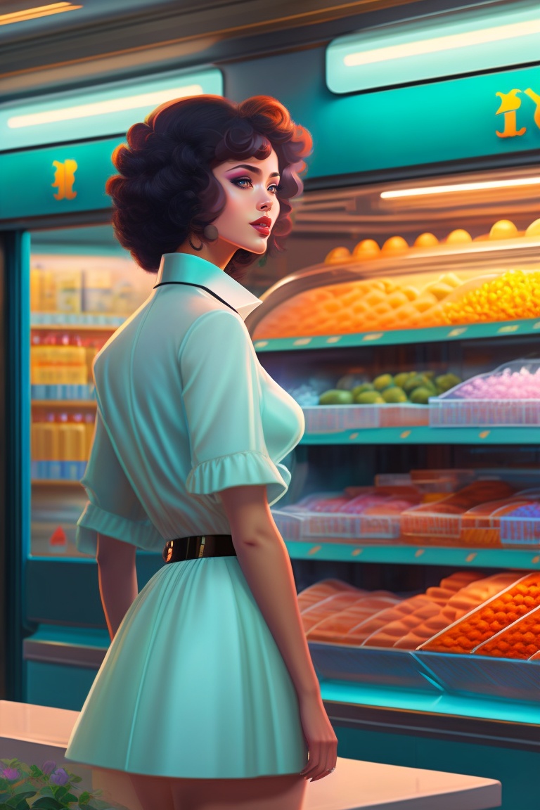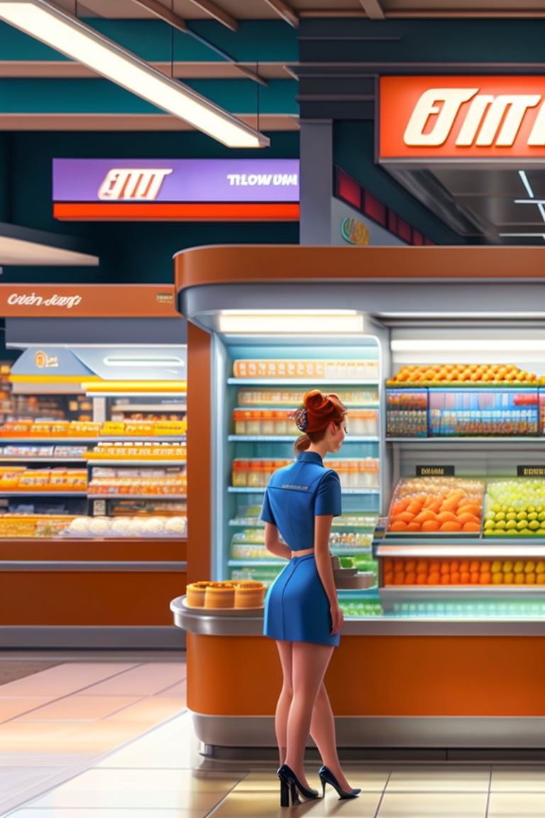 "floral model in a convenience store 7/11" by syd mead, cold color palette, muted colors, detailed, 8k