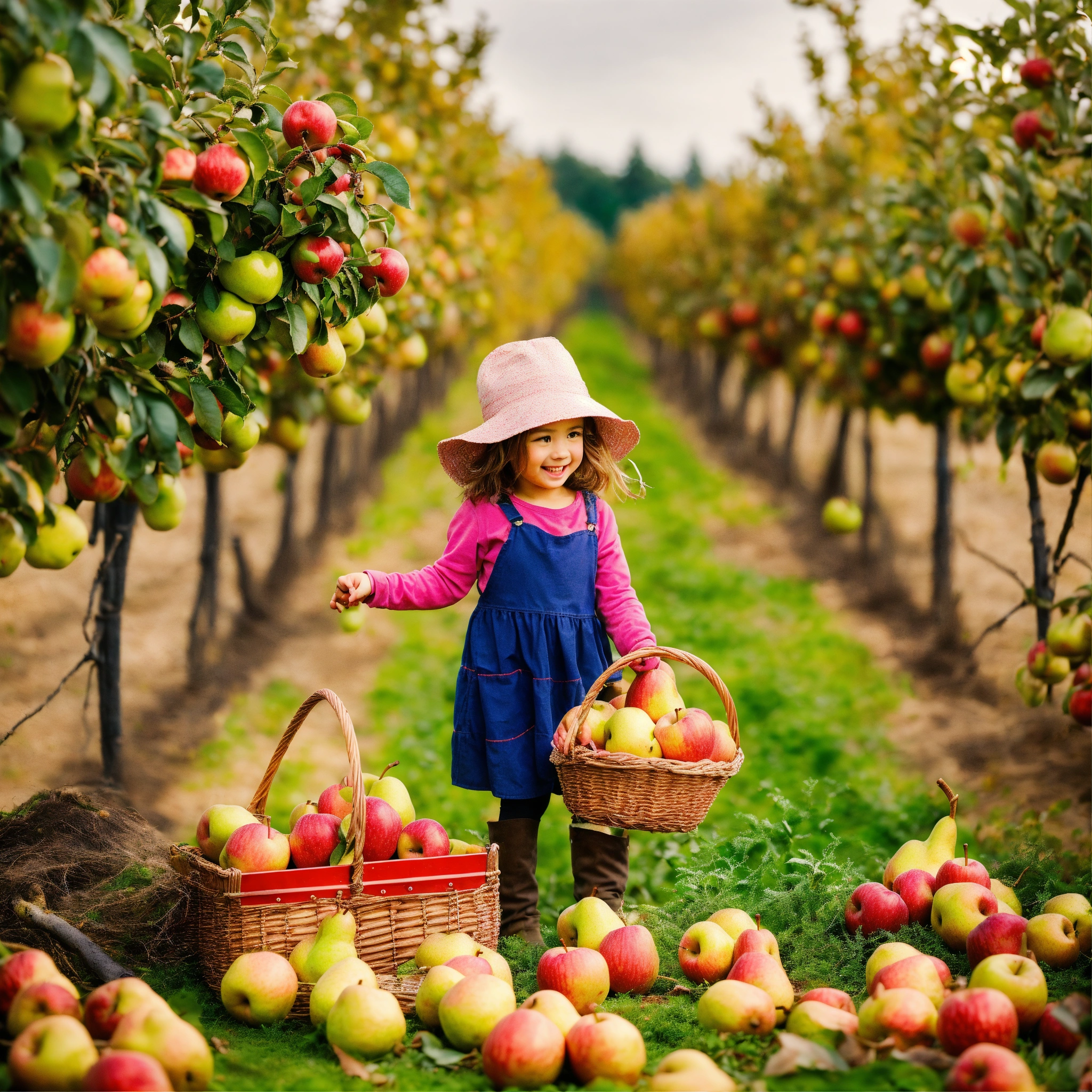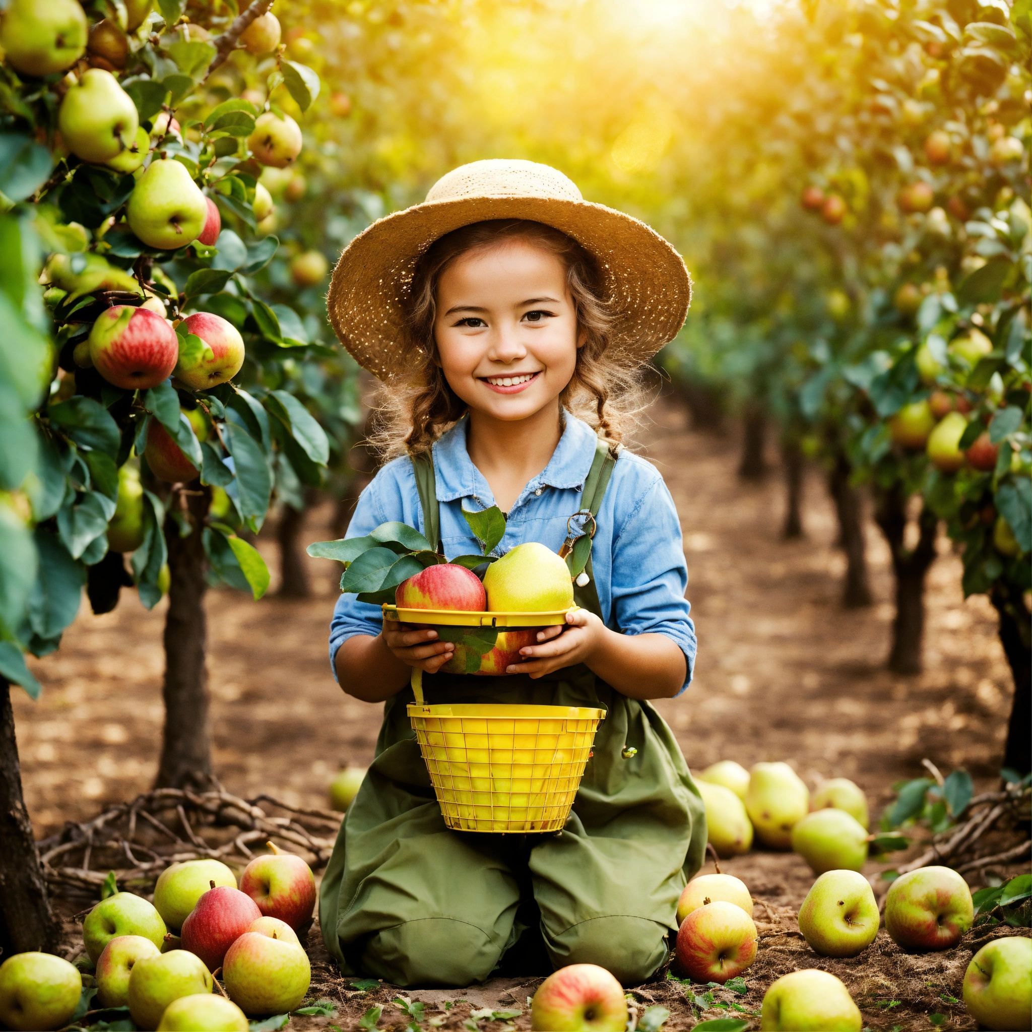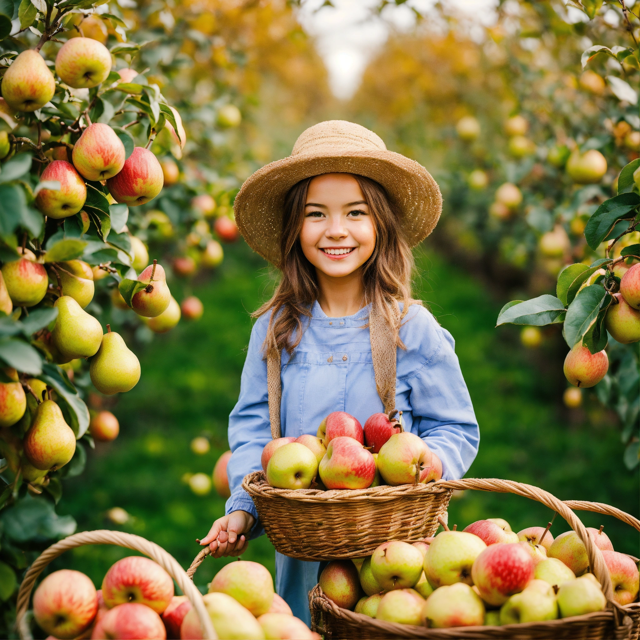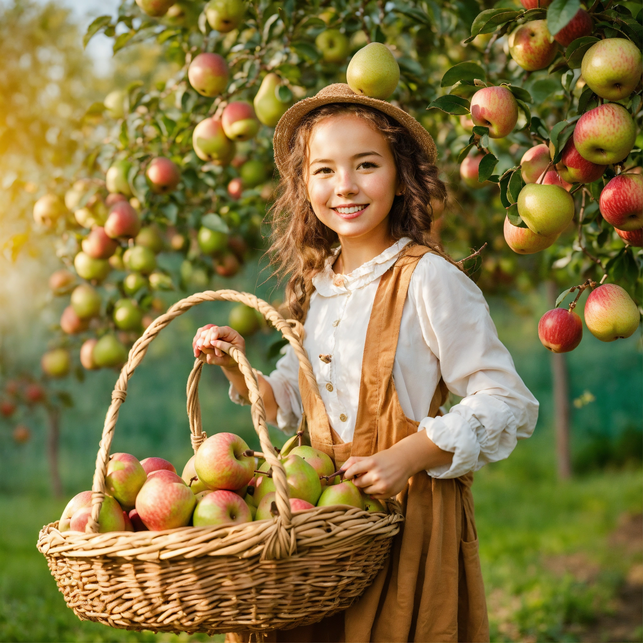 Cute girl as a fruit picker in a pear garden. joyfully gathering apples, making the autumn harvest a sweet and delightful scene