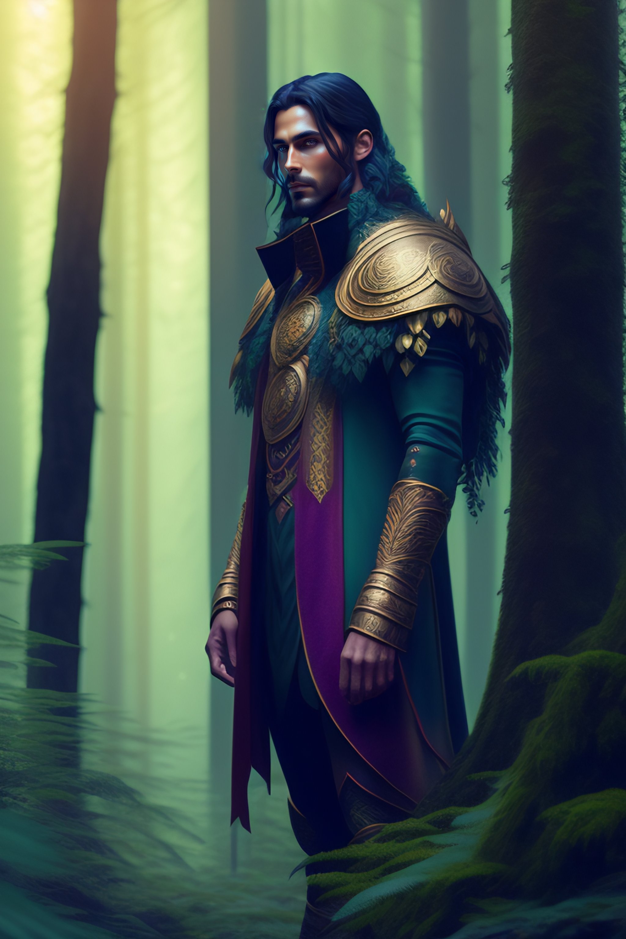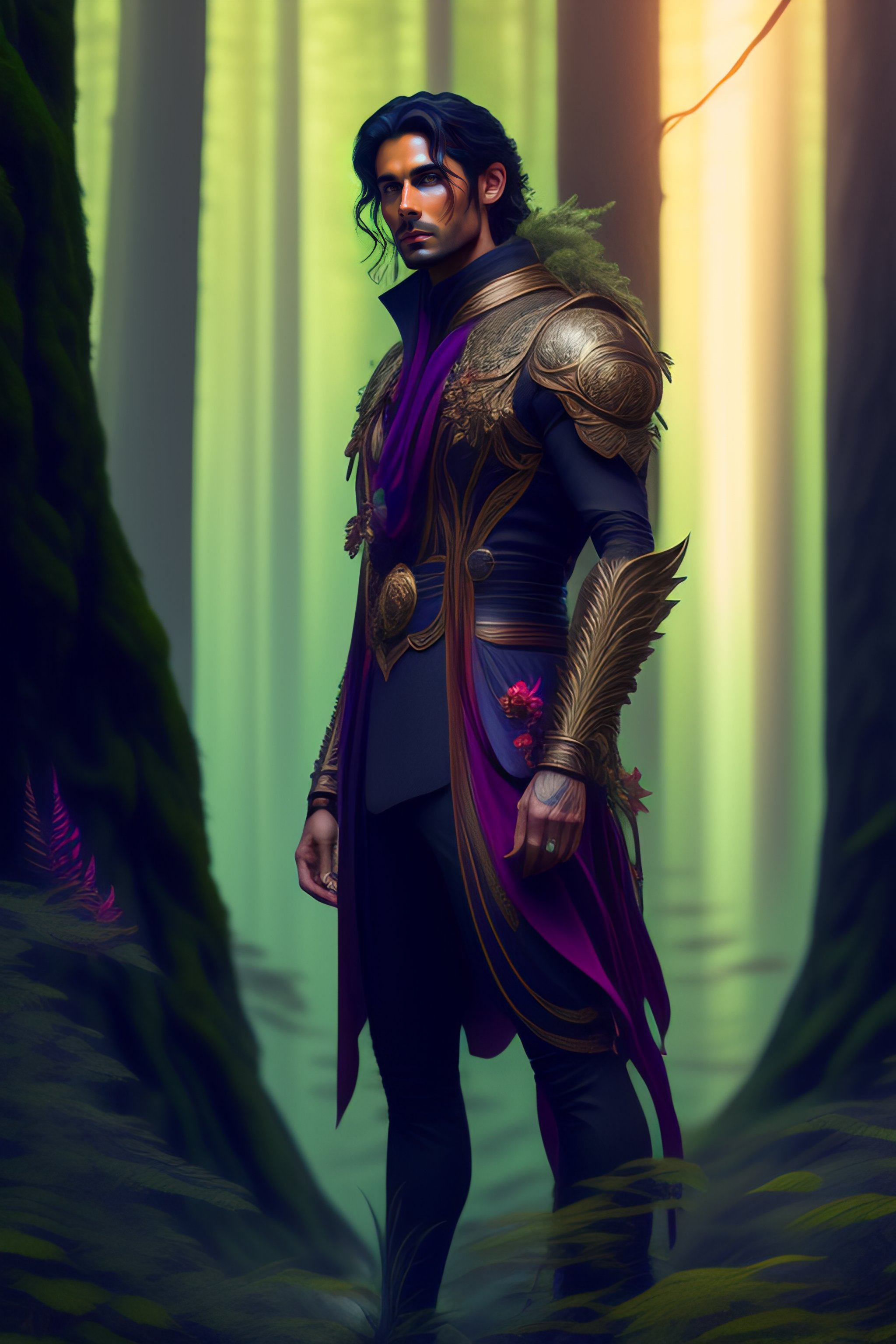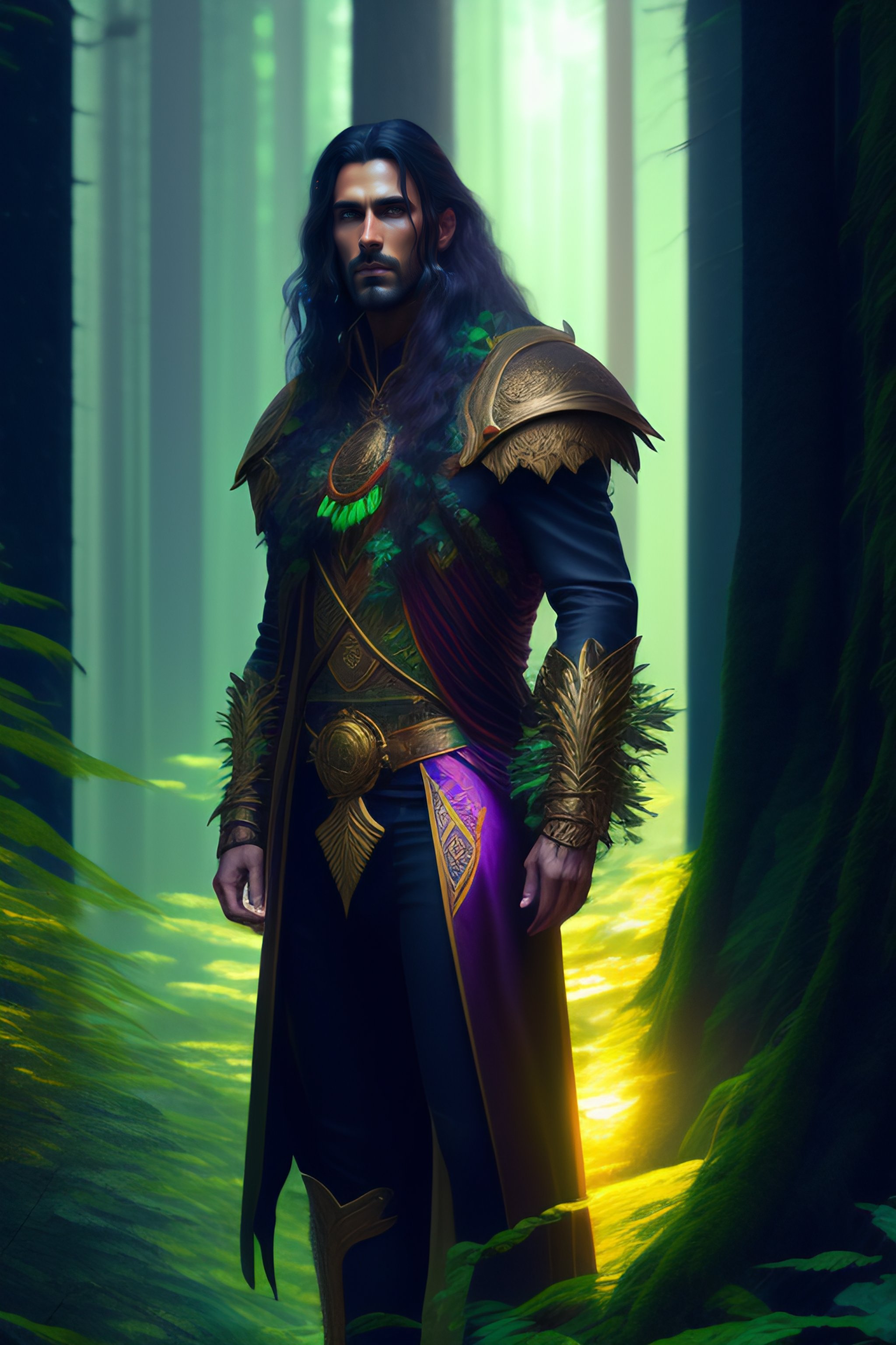 Forest god, full length shot of handsome dark haired male standing in alien colorful forest, highly detailed, digital painting, deviantart, artstation, concept art, matte, sharp focus, photo realistic, detailed face, photorealistic pale skin, greg rutkowski and alphonse mucha