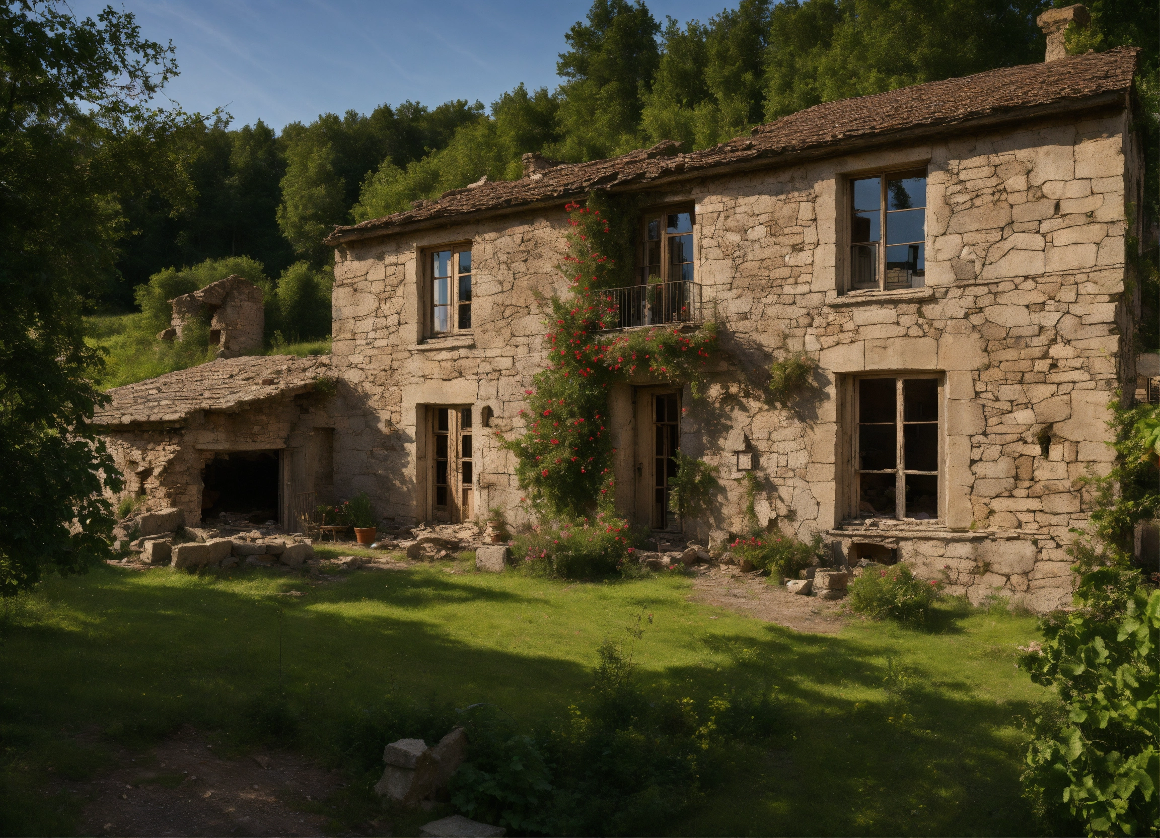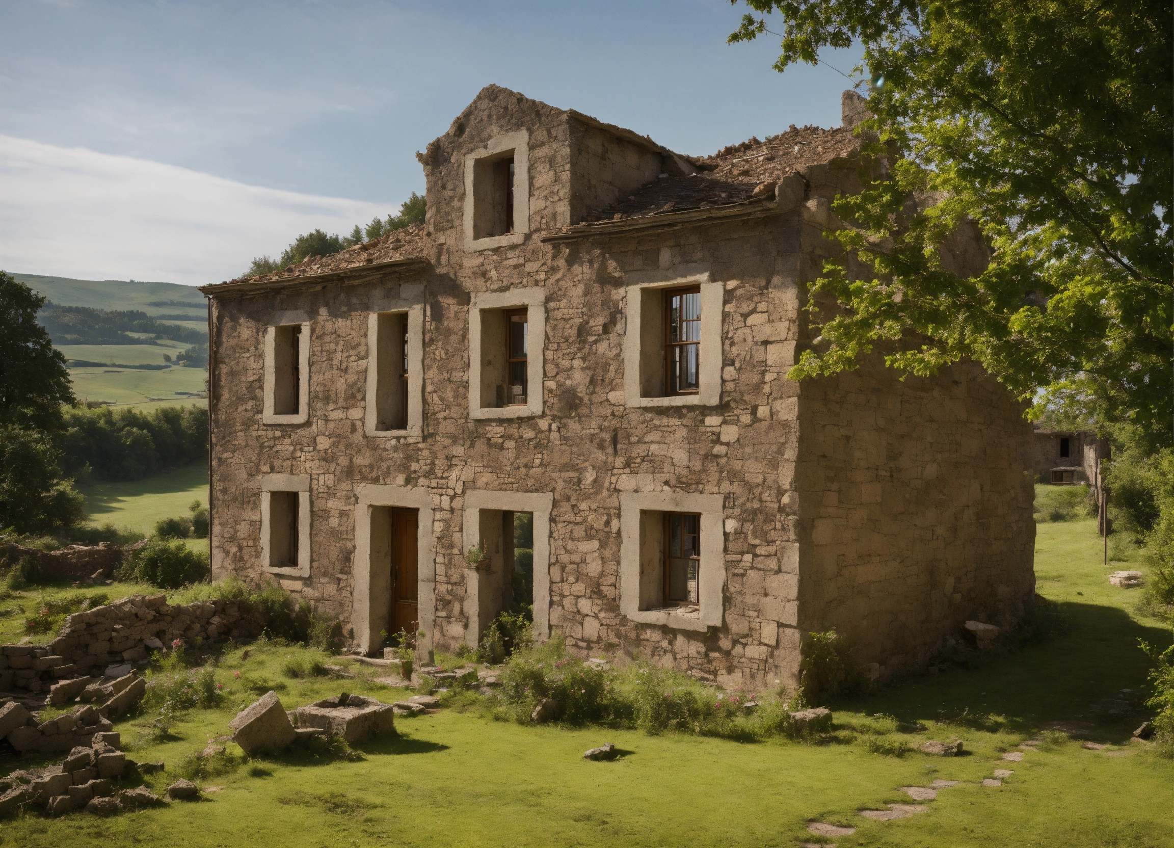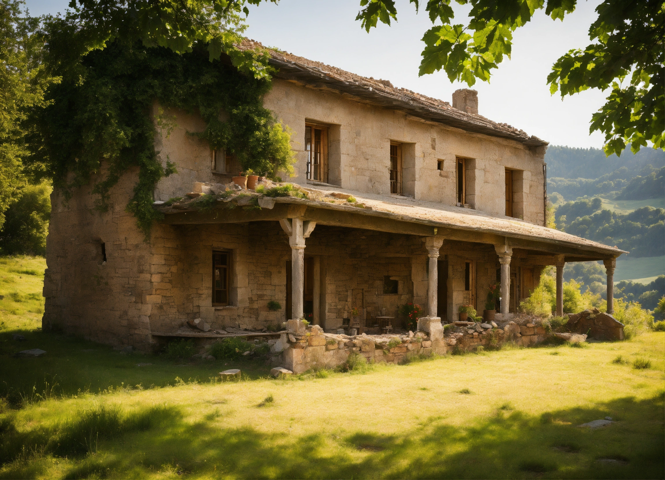 A modest rustic farmhouse on the ground floor with stone and cement cladding