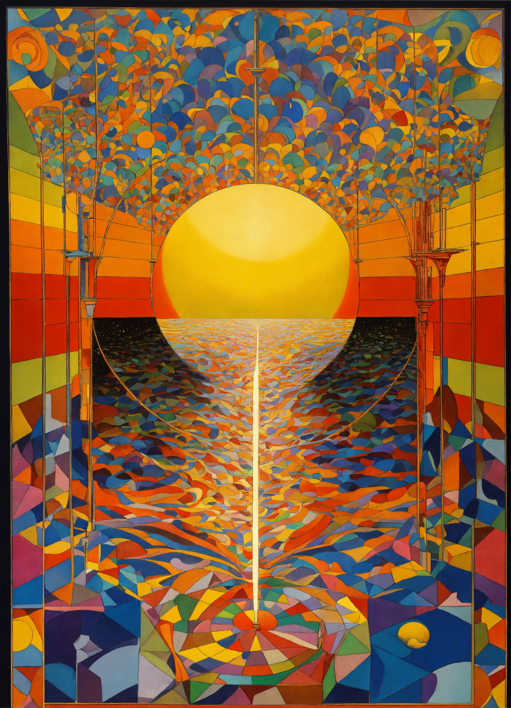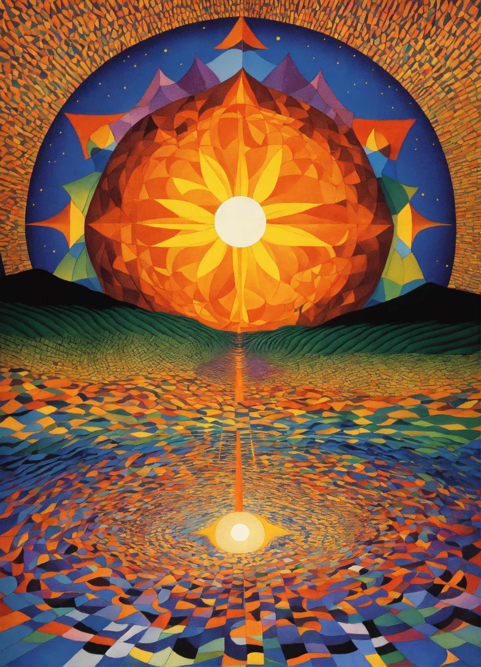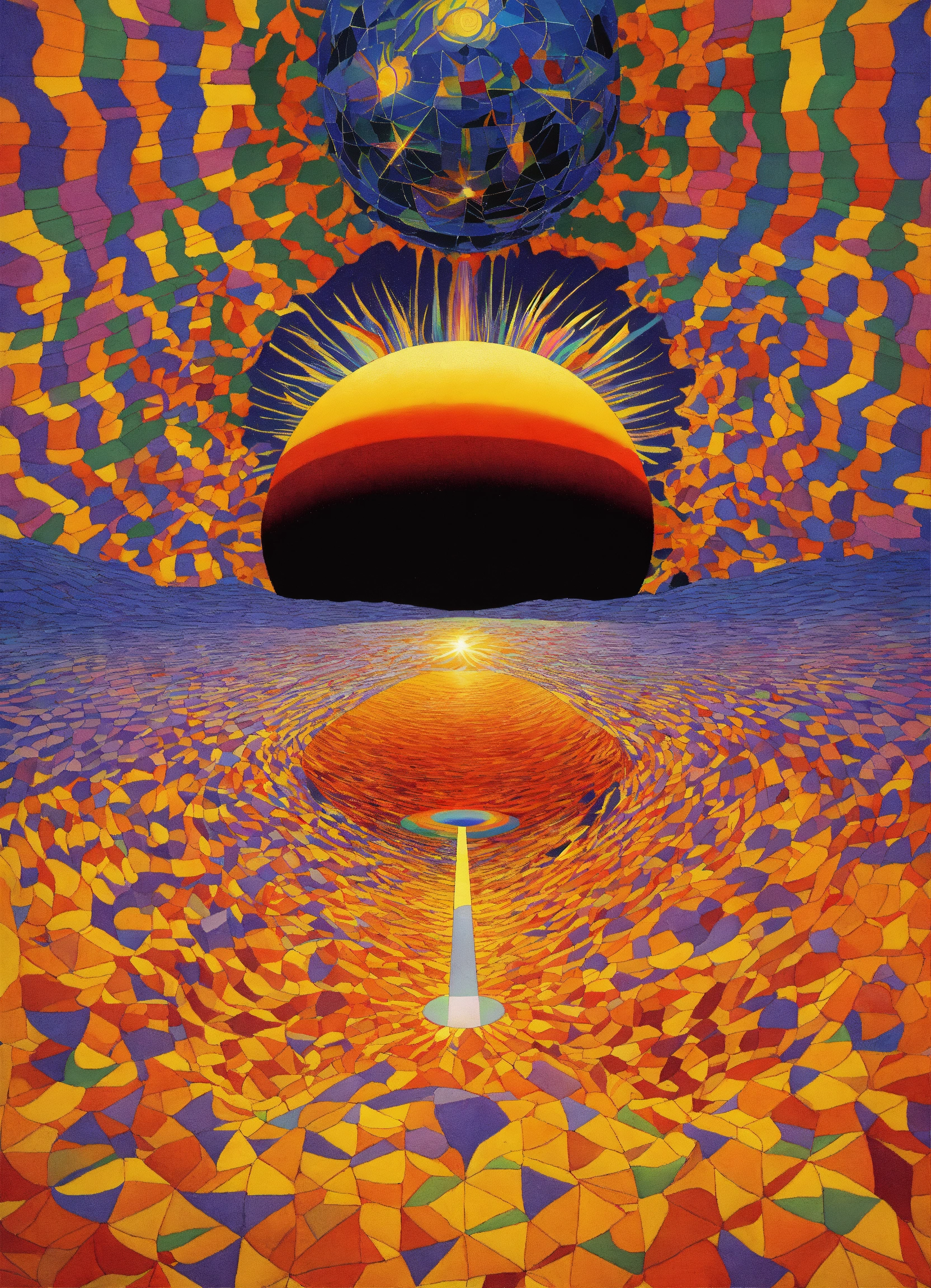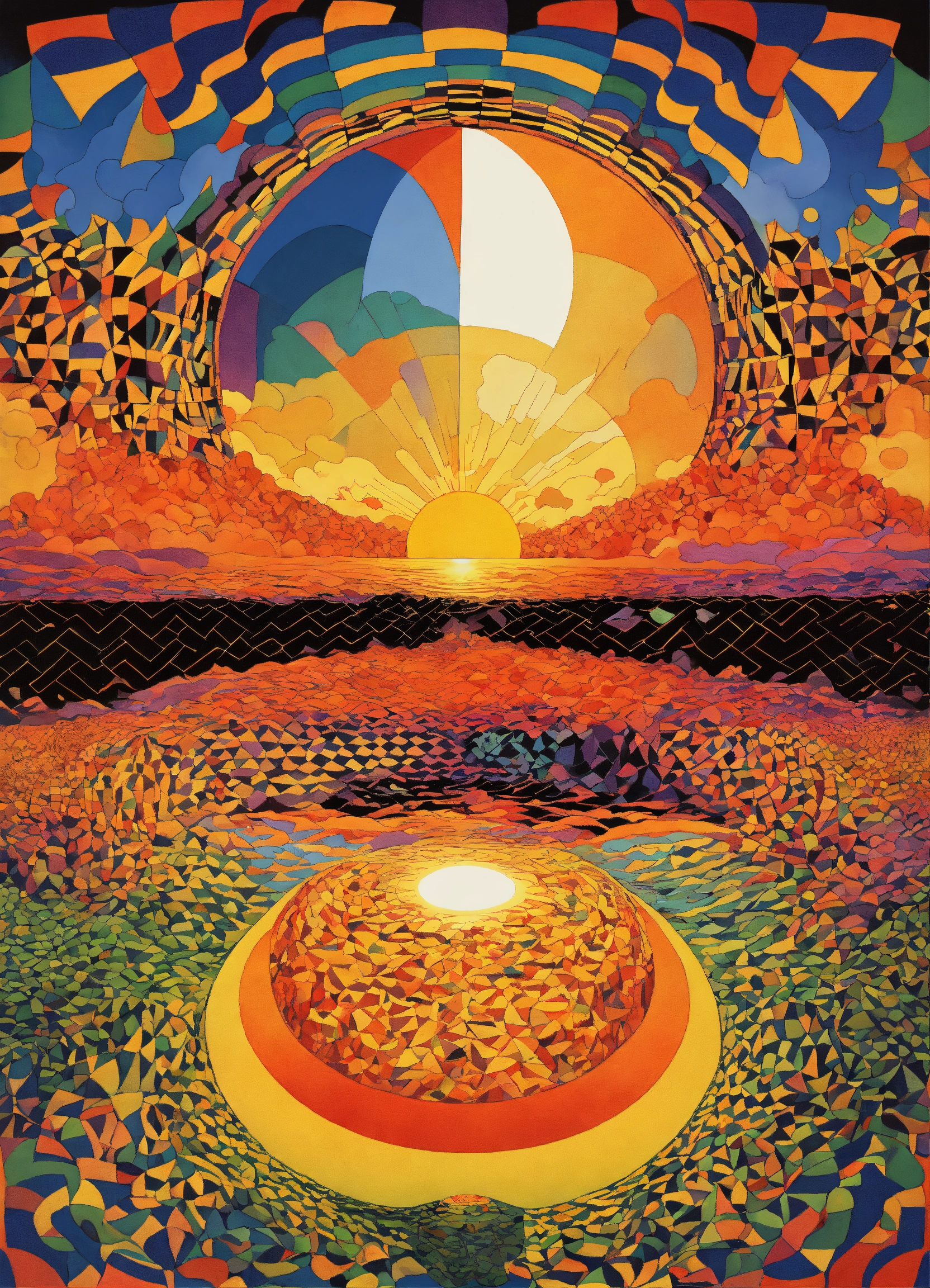 Sun merging into moon, psychedelic, the four corners of the world, rainbow geometrical patterns by mc escher