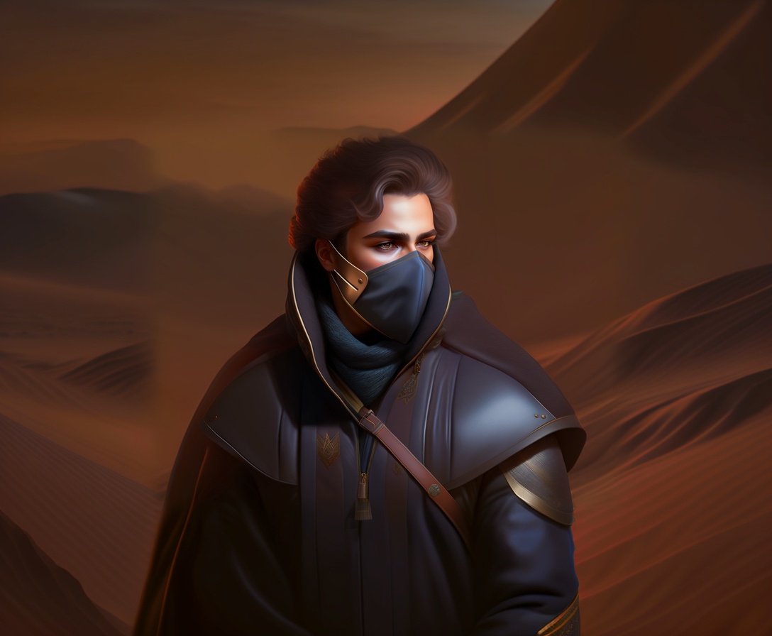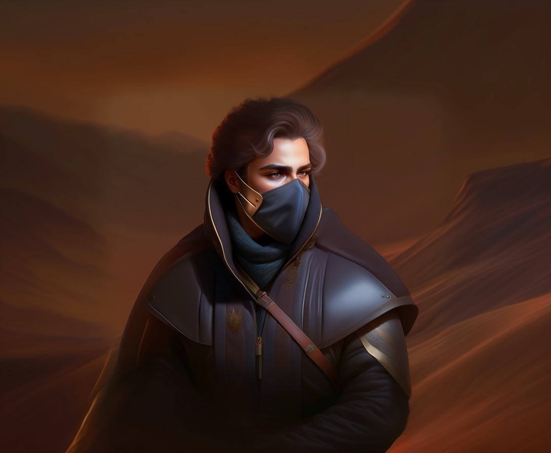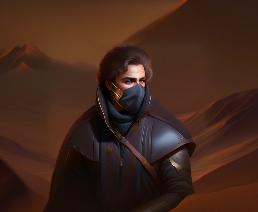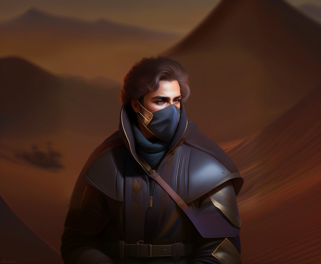 Dune game art, paul atreides, nomad, wearing hood, wearing a mask, sci fi, digital painting, artstation, cg art, elegant, highly detailed, sharp focus, full body portrait, cgi, octane
