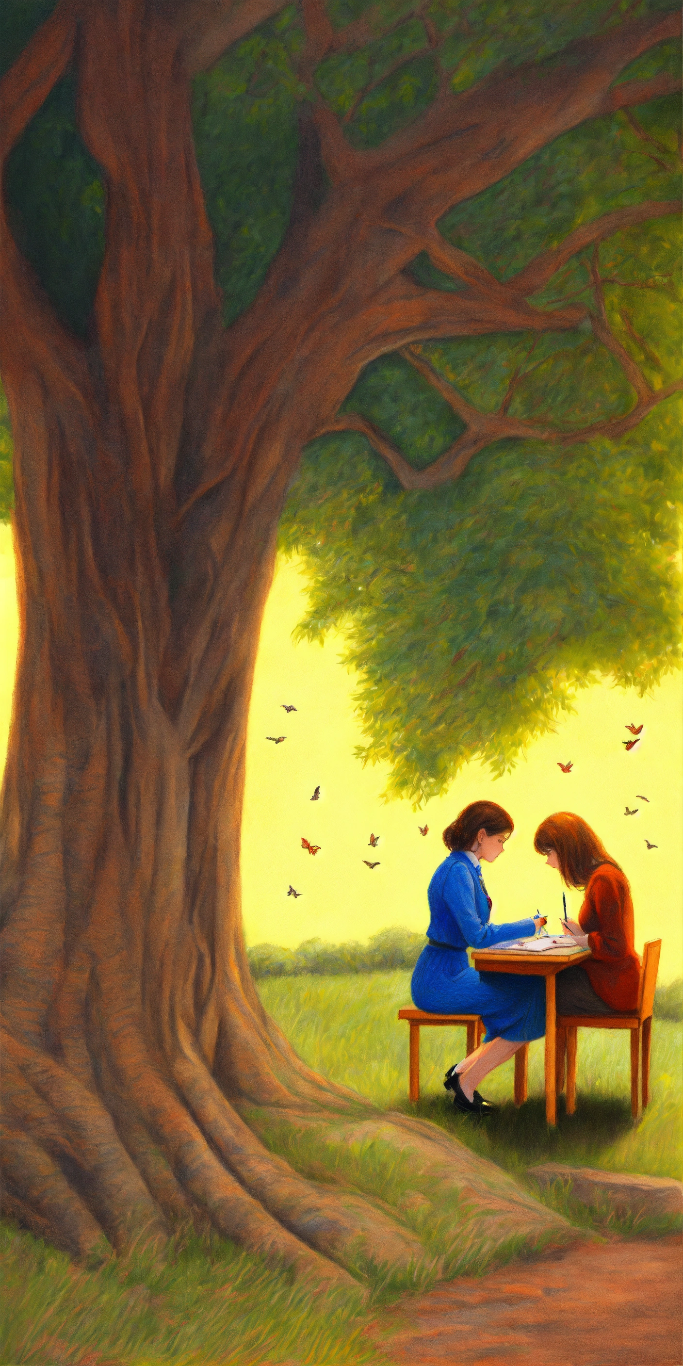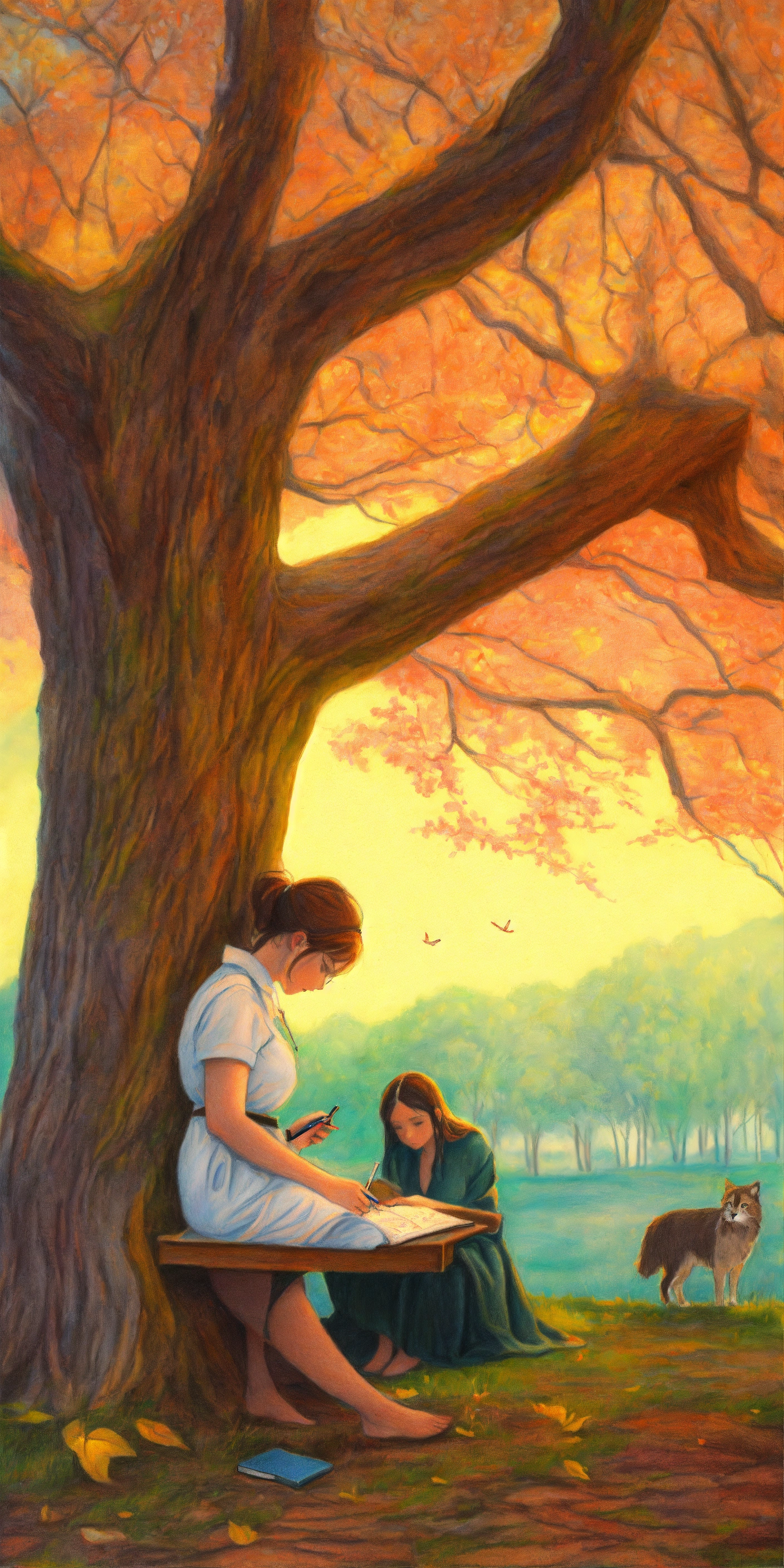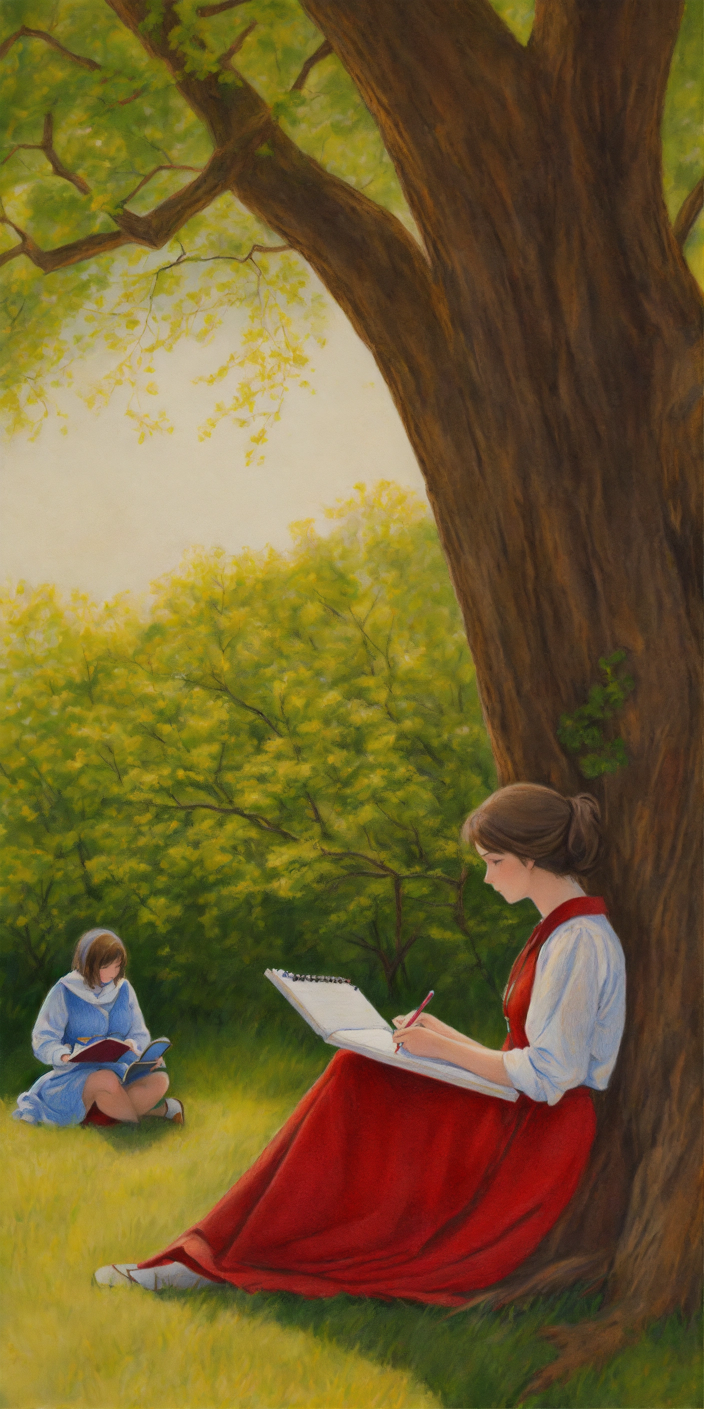 Colored pencil drawing of a woman writes her diary quietly under a tree, while a creepy woman watches her from afar.