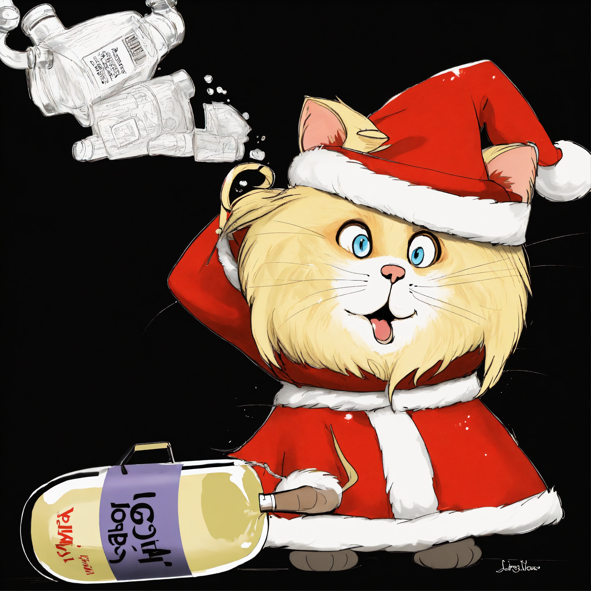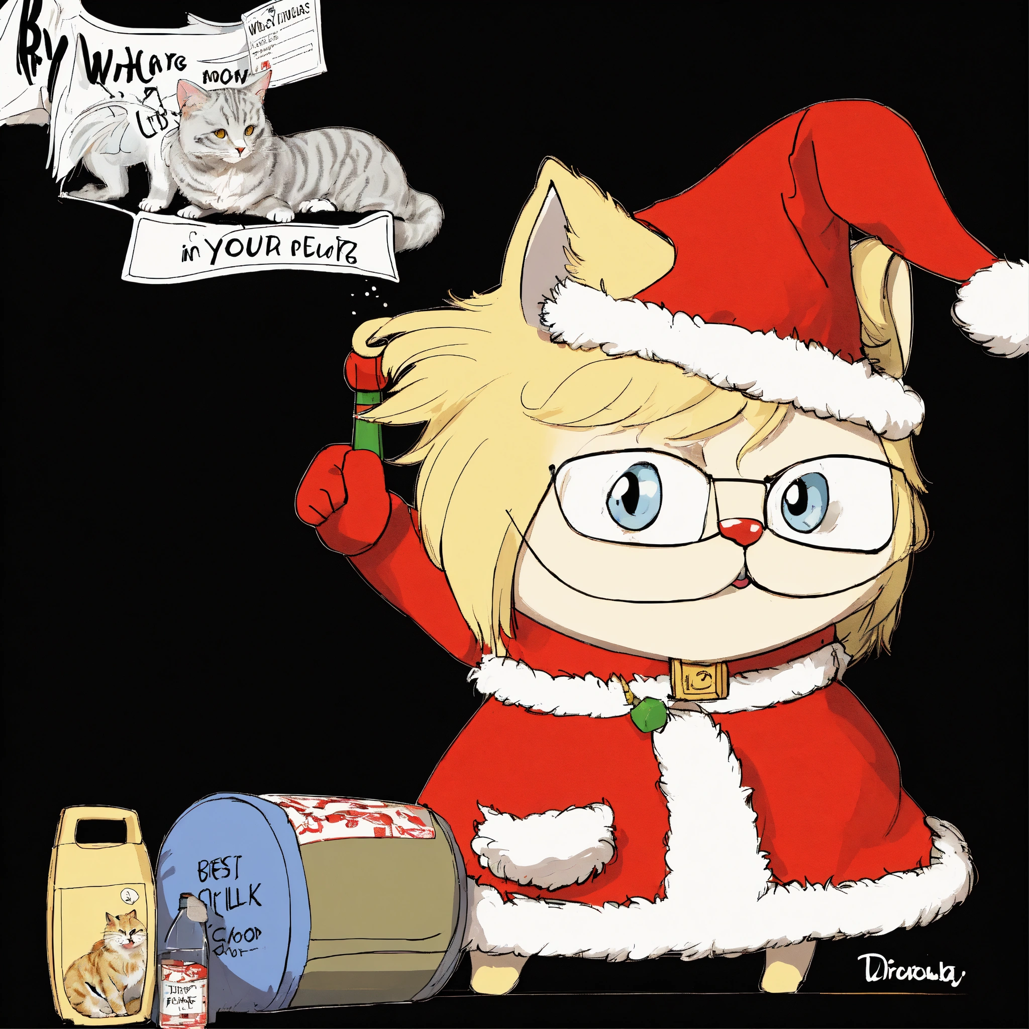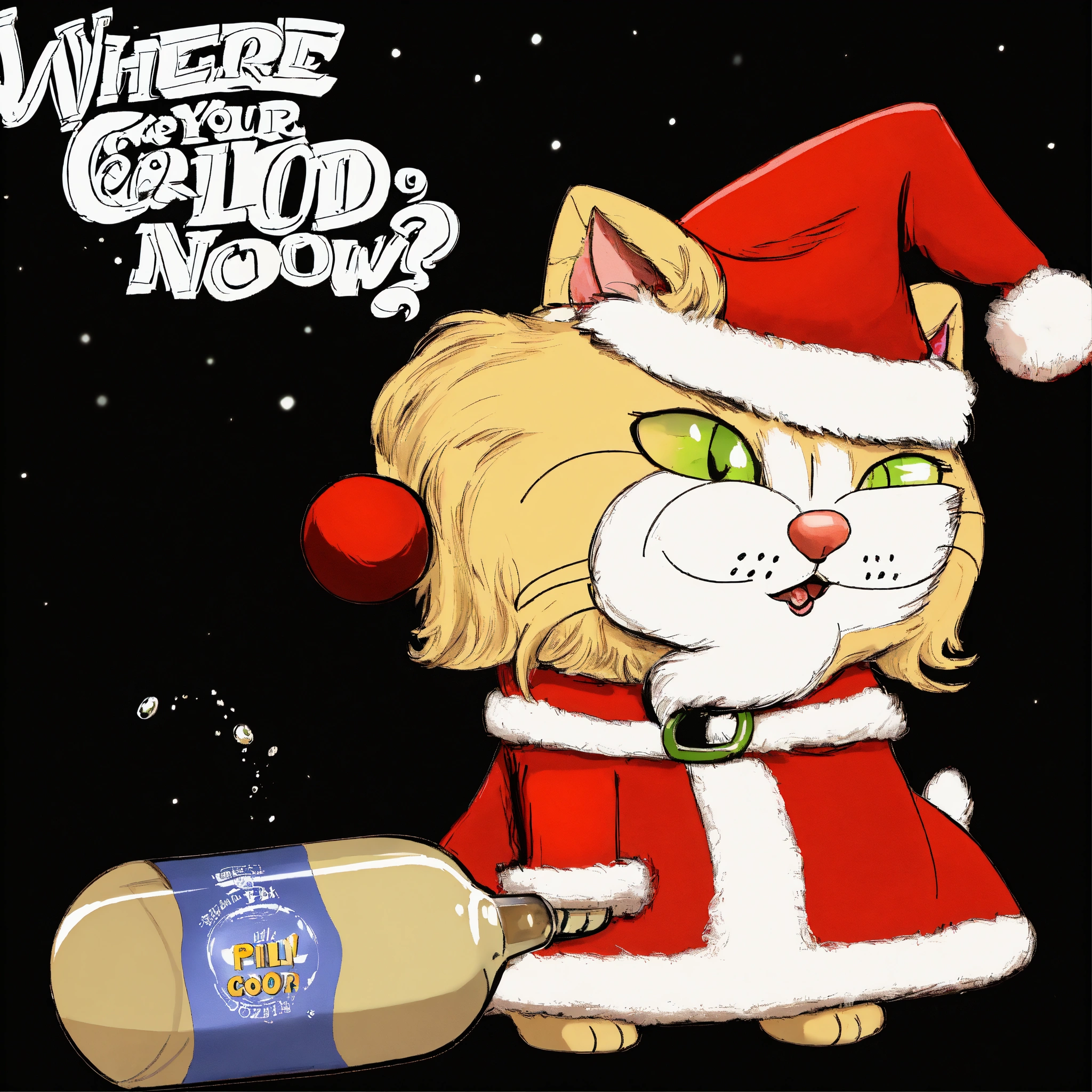 An anthropomorphic short cat with blonde hair wearing a santa claus costume and dragging a big bottle of liquid with label "pilk" after themselves and with text "where is your god now?" in the top left corner, best quality, drawn by ink, drawn by pencil, digital art, 8 k, beautiful drawing, highly detailed, concept art, sharp focus, ultra realistic illustration