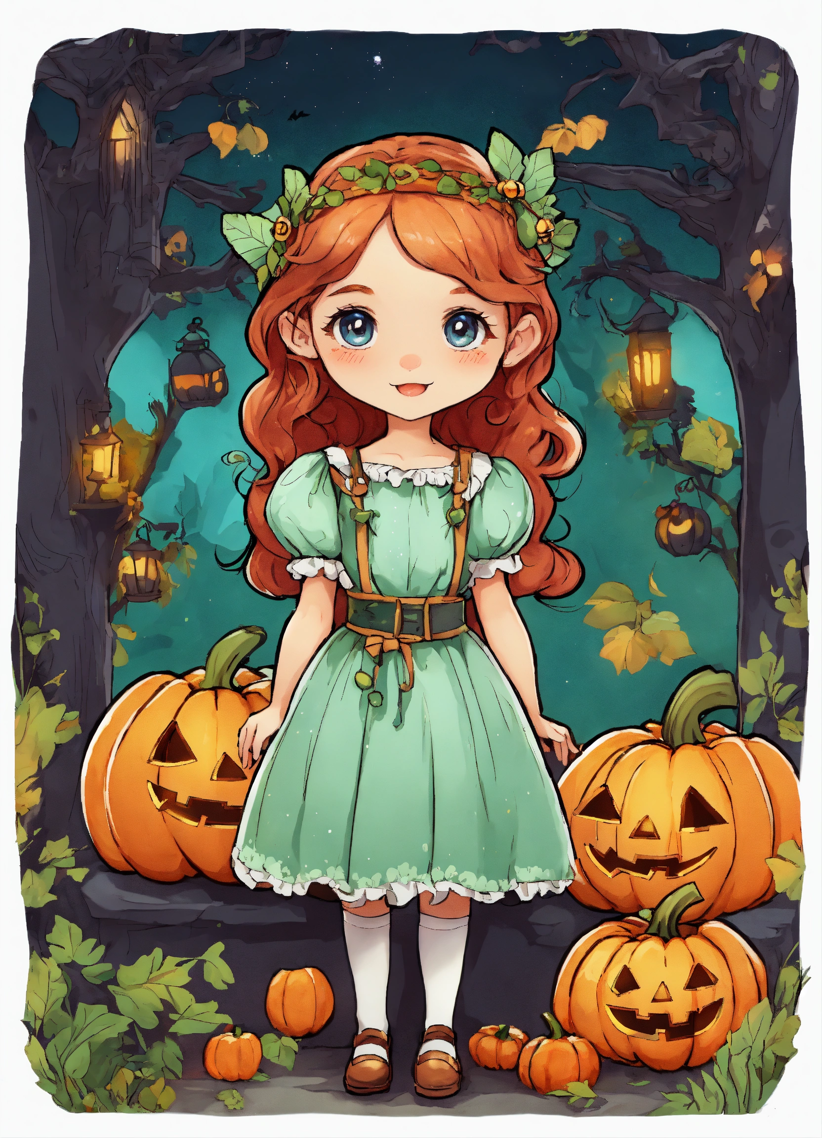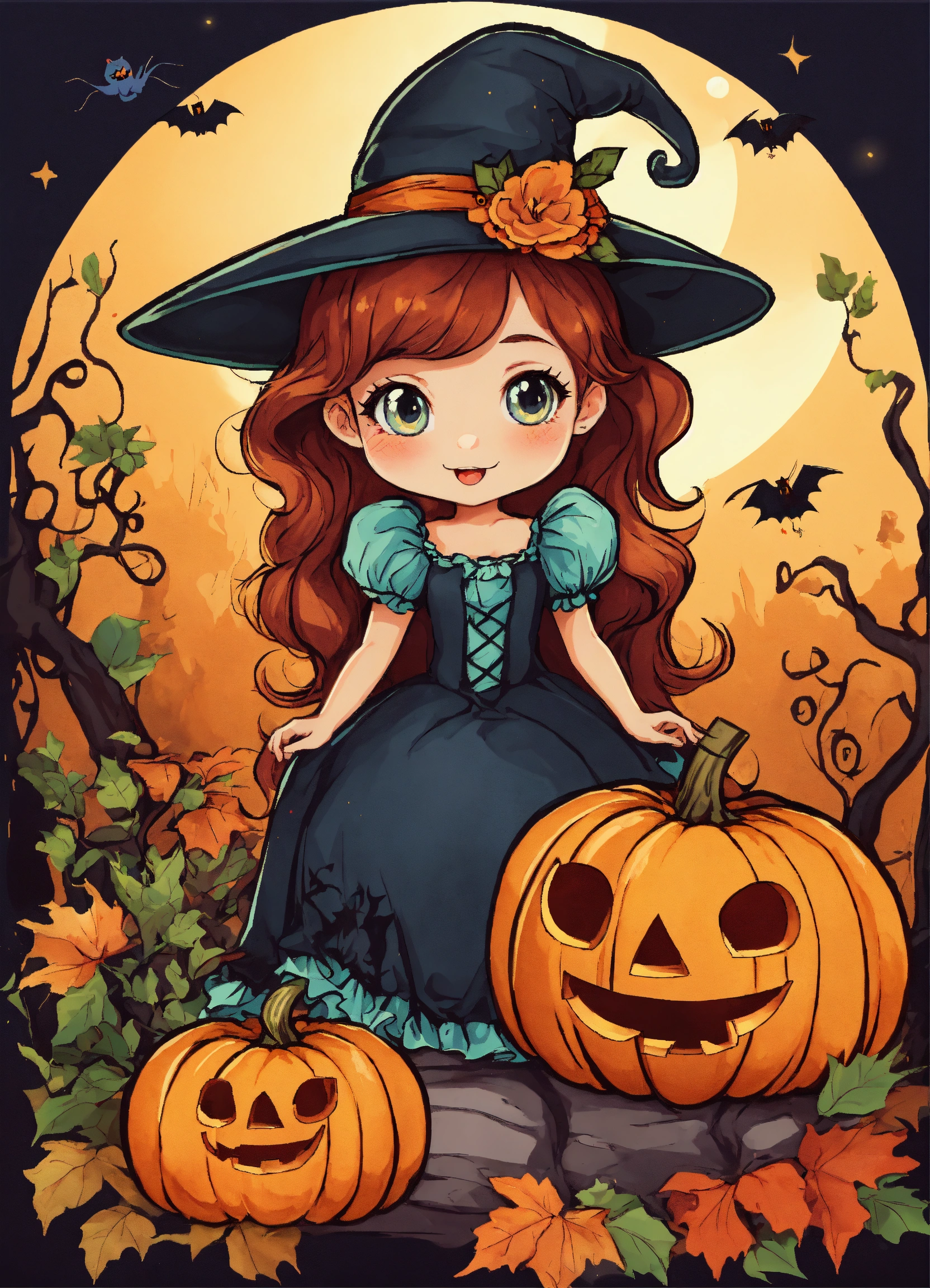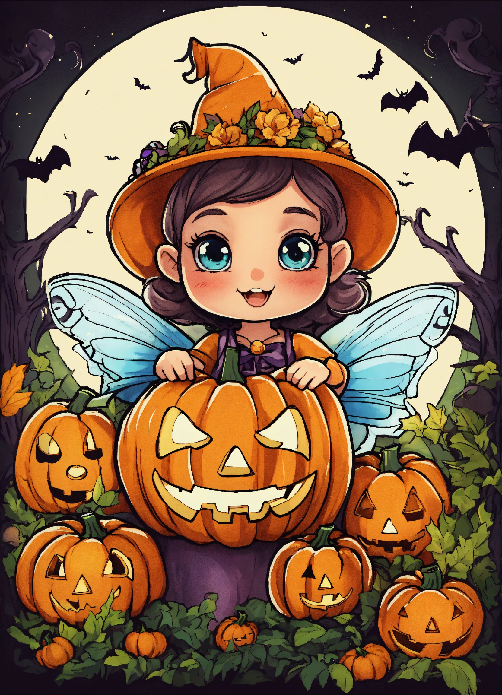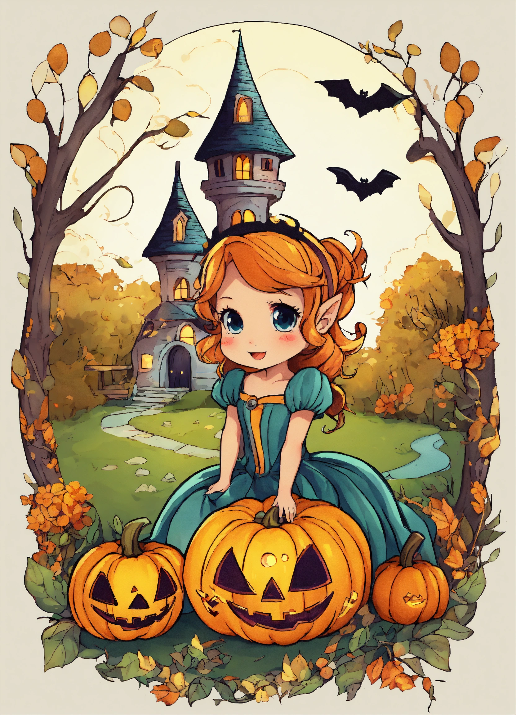 Generate a cute halloween fairy tales illustration, 4k resolution, cartoon-sticker style with clear lines on a pure white background suitable for a children's coloring book.