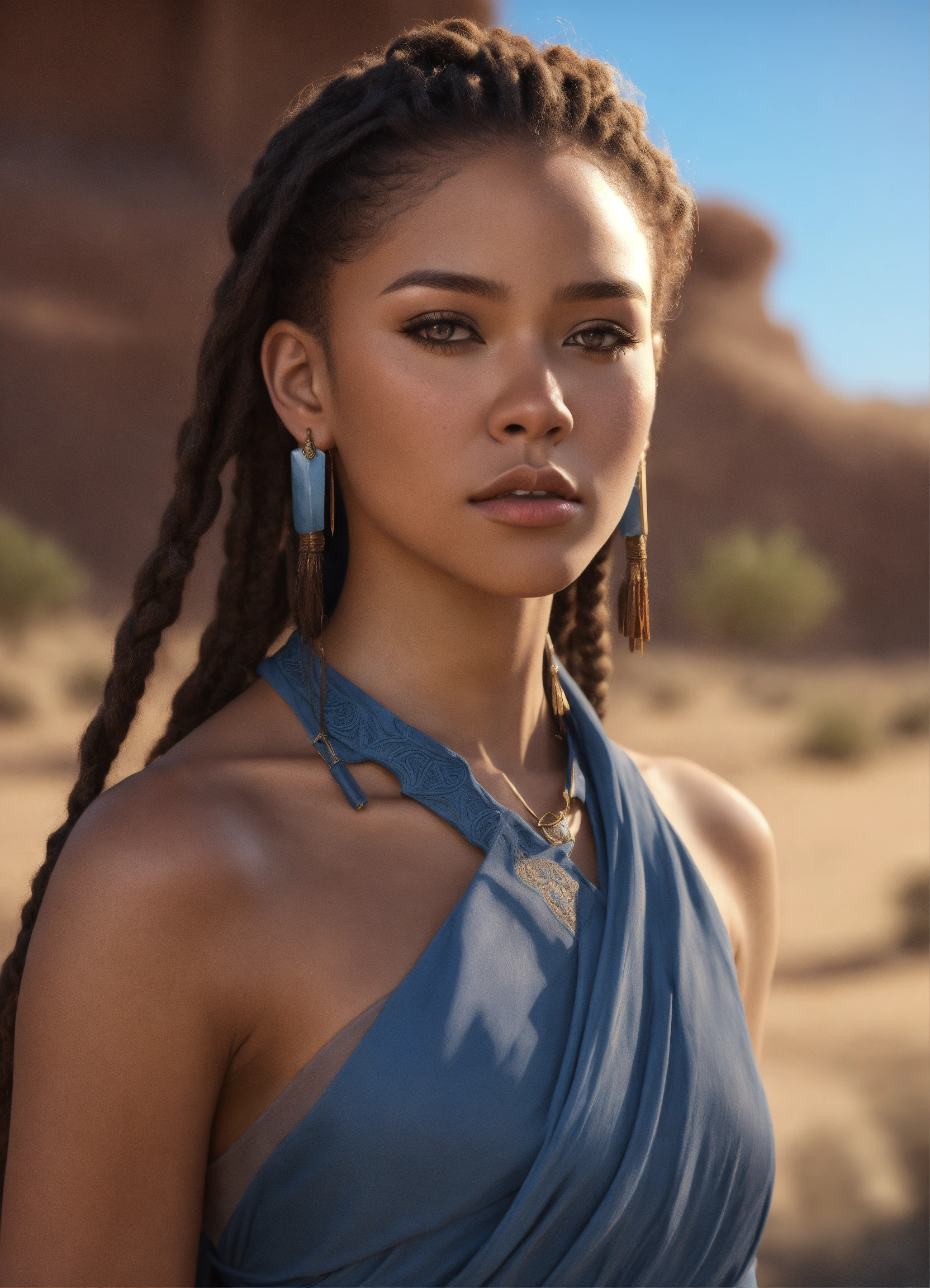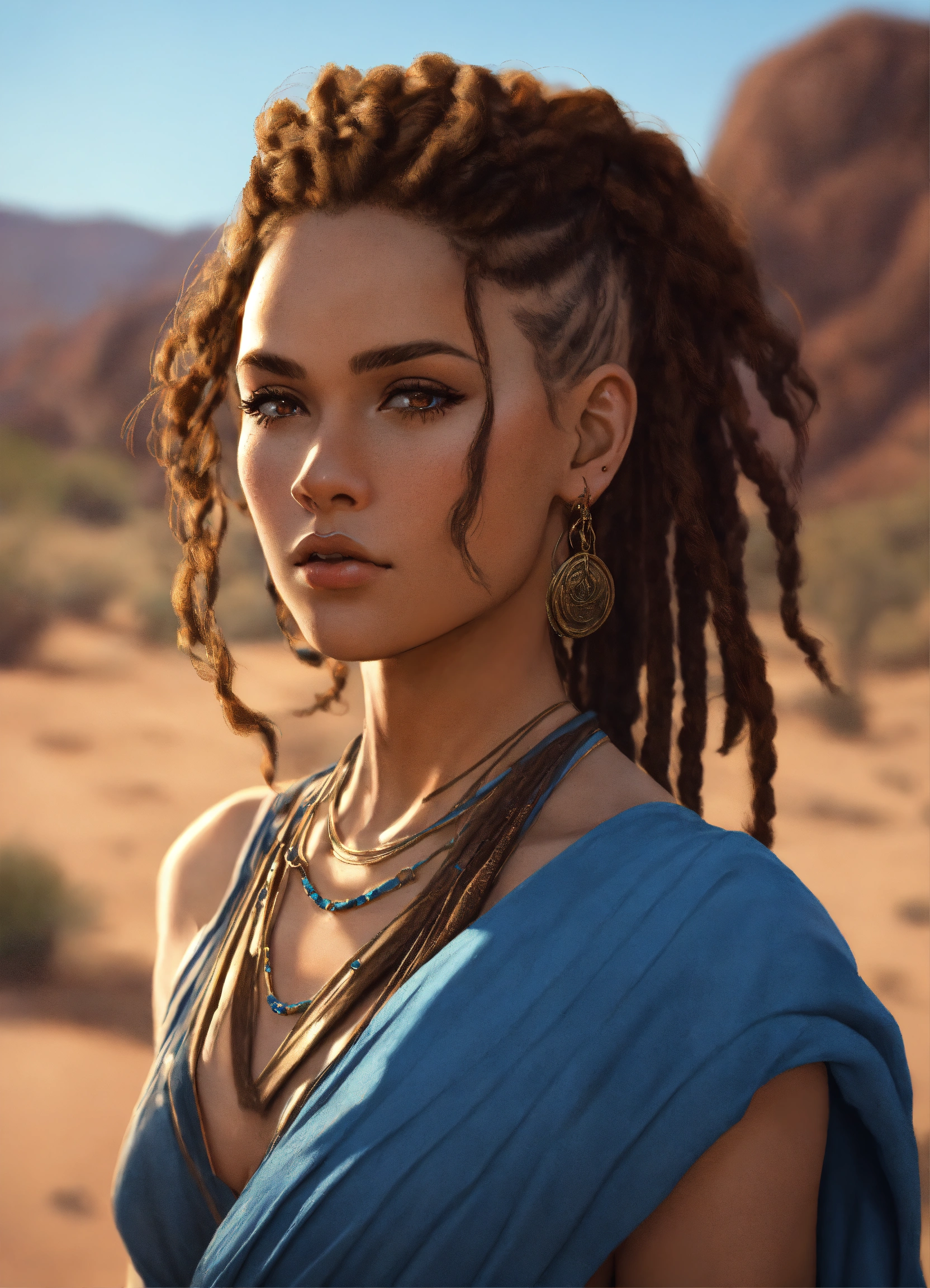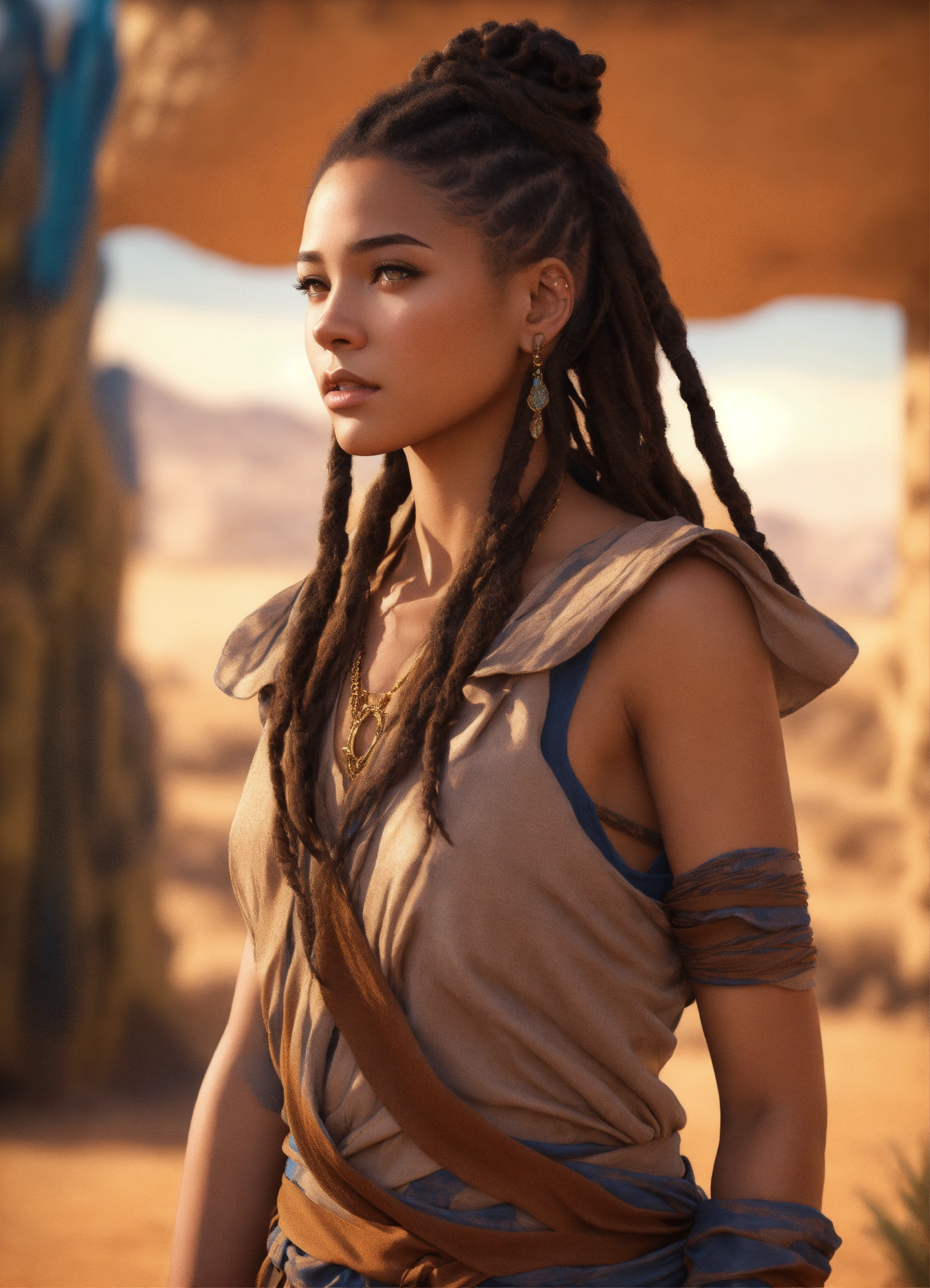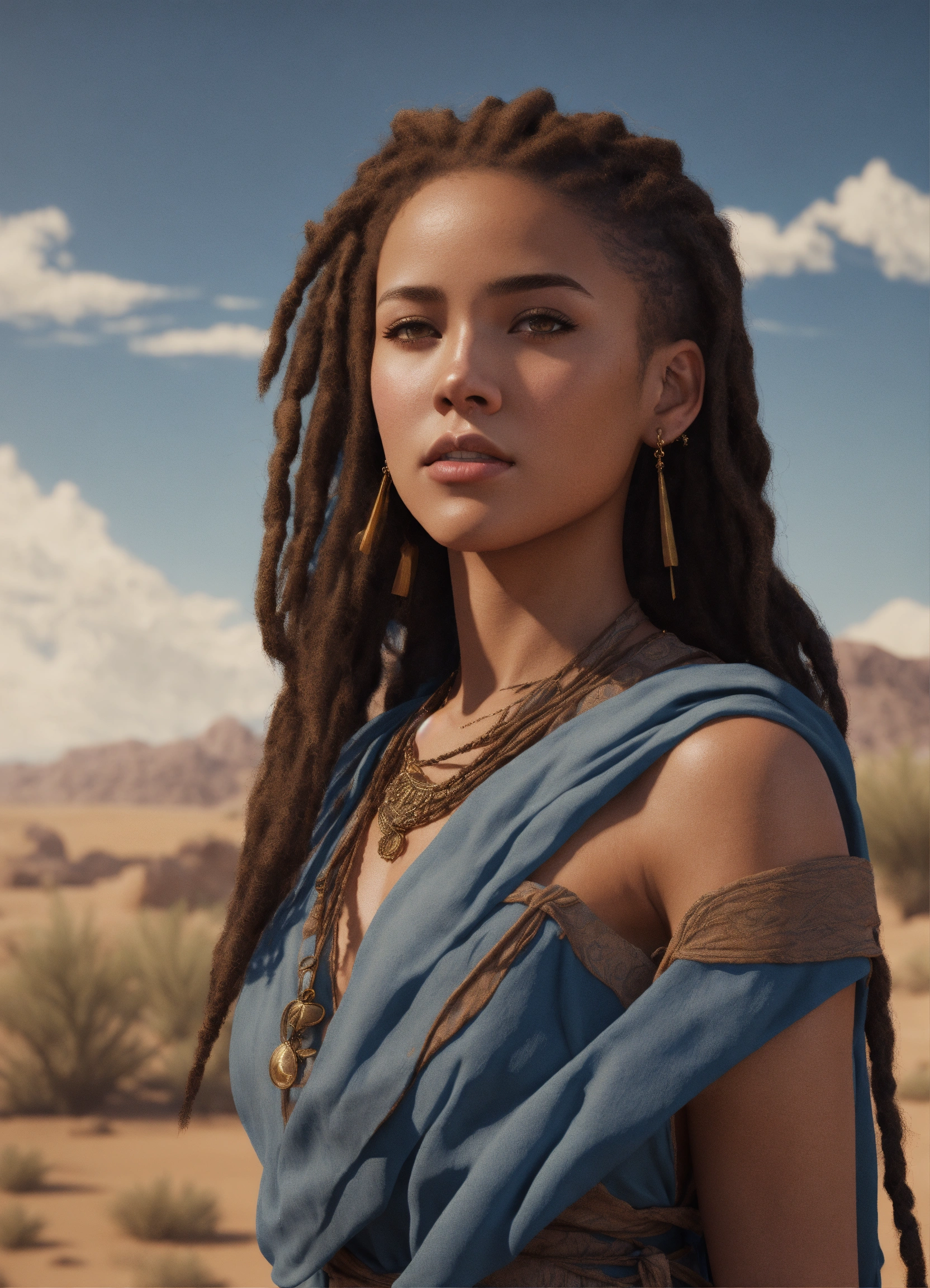 Portrait of lightskin woman, age 20, light skin, square jaw, beard, dreads, tomboy, muscular, fantasy clothing, desert environment, blue wrap dress, brown hair, high cheekbones, intricately detailed photorealism, trending on artstation, ray-traced environment, vintage 90's anime artwork.