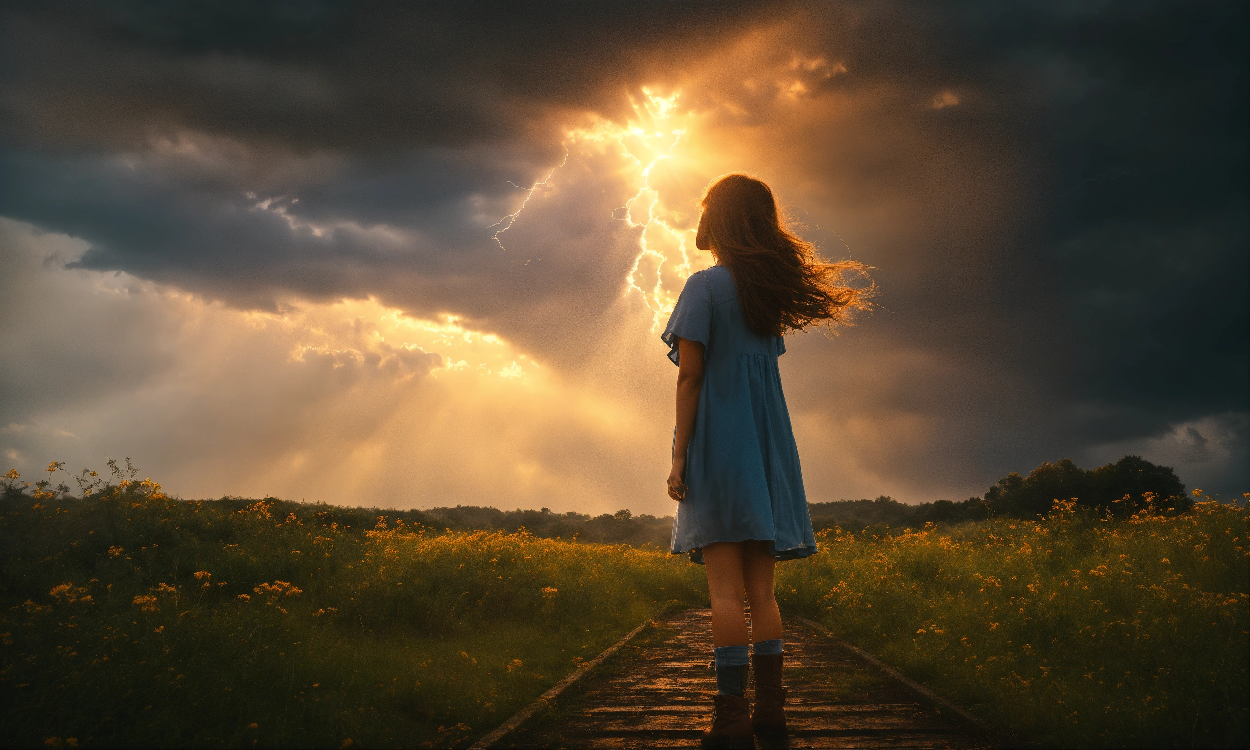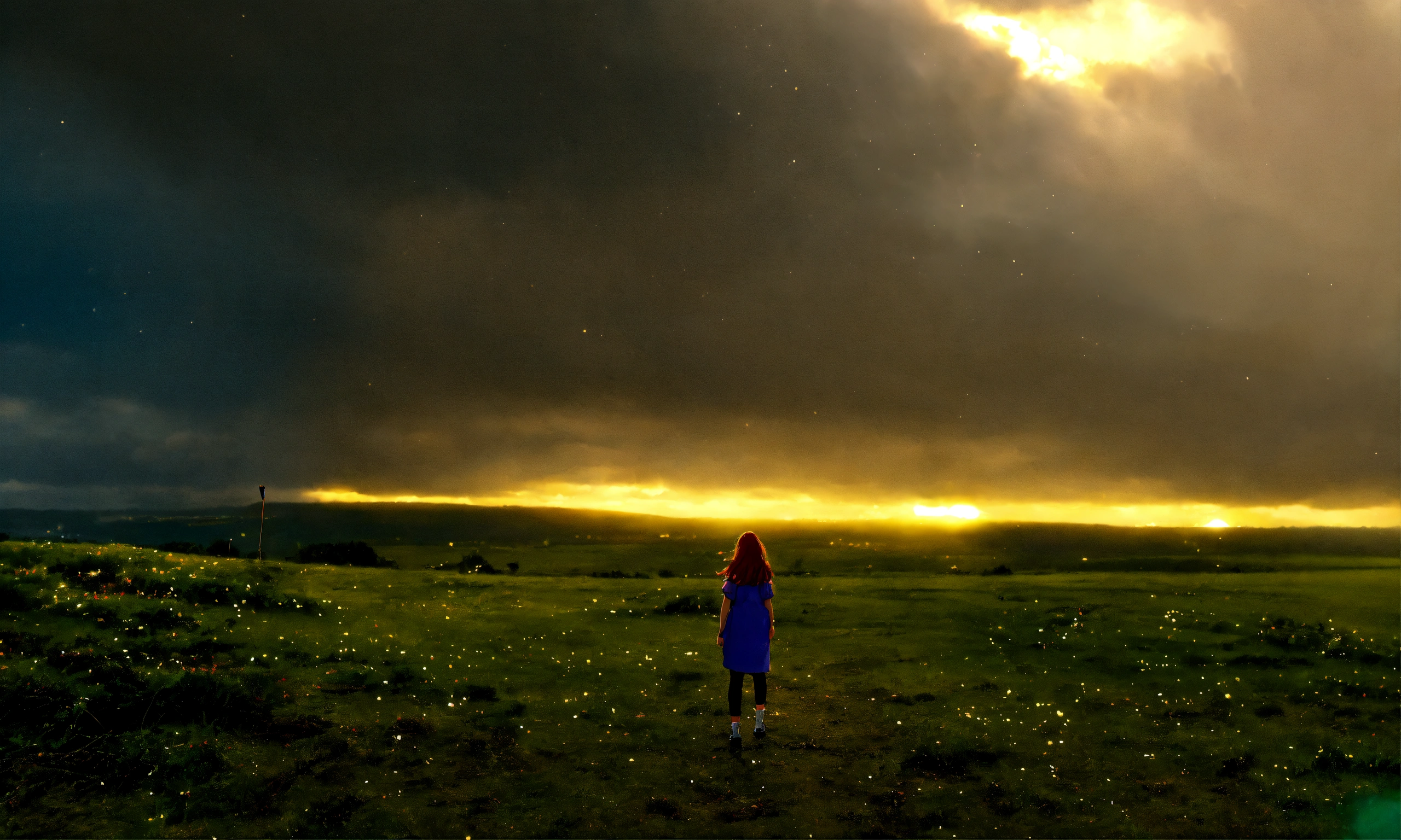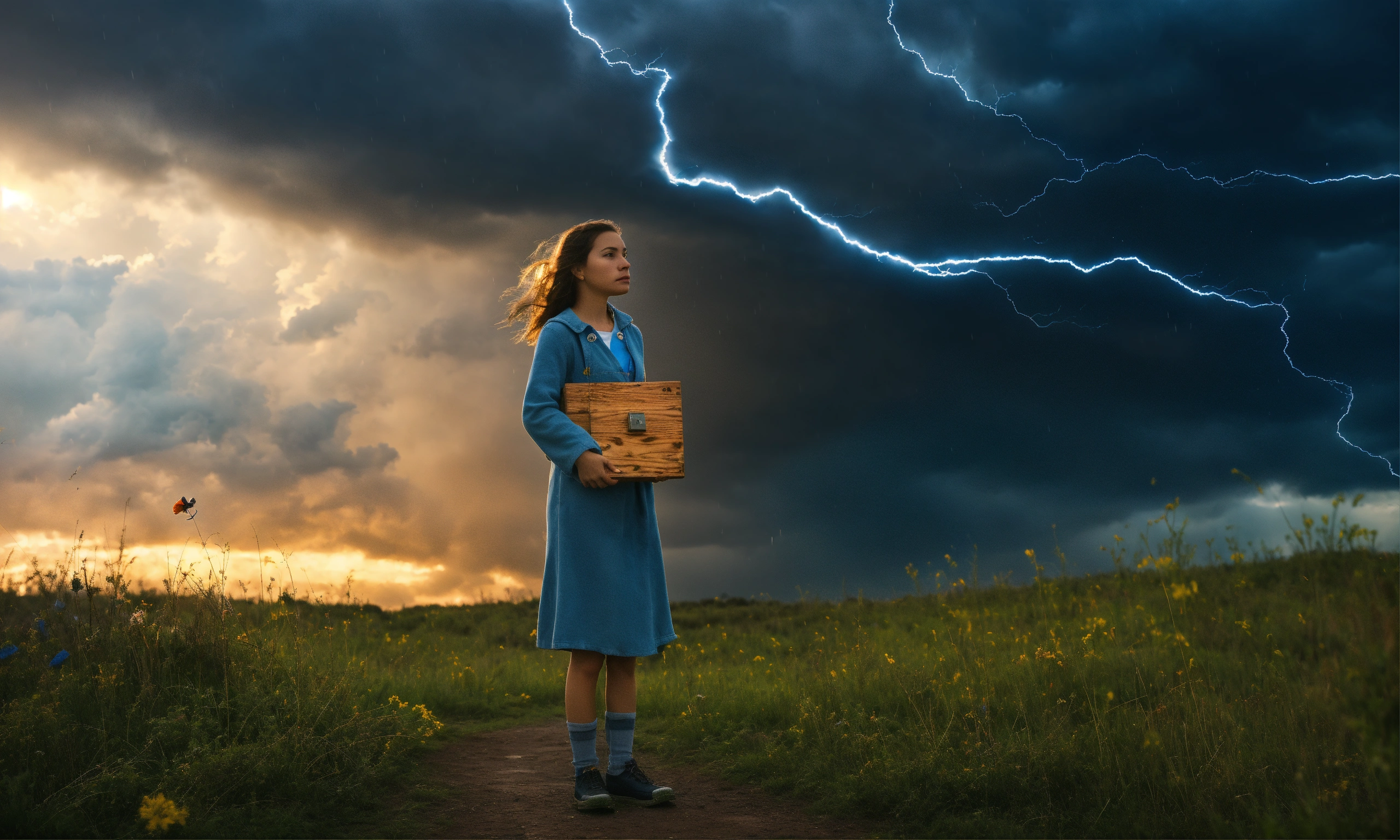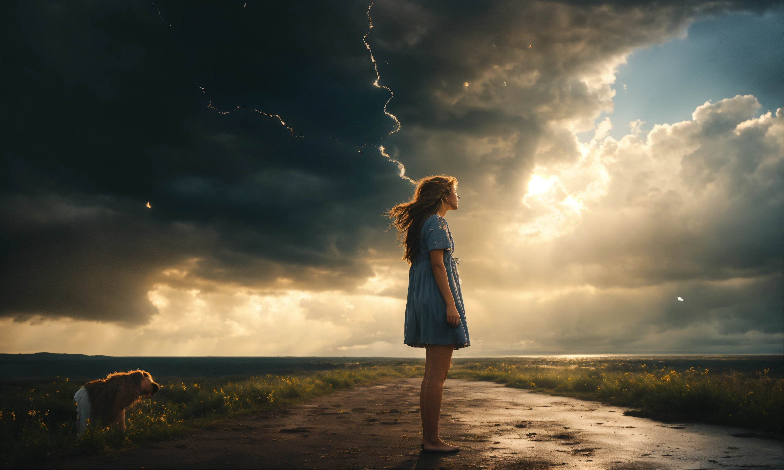 A sad girl stands against a stormy sky, releasing a keepsake. as she lets go, sunlight pierces through