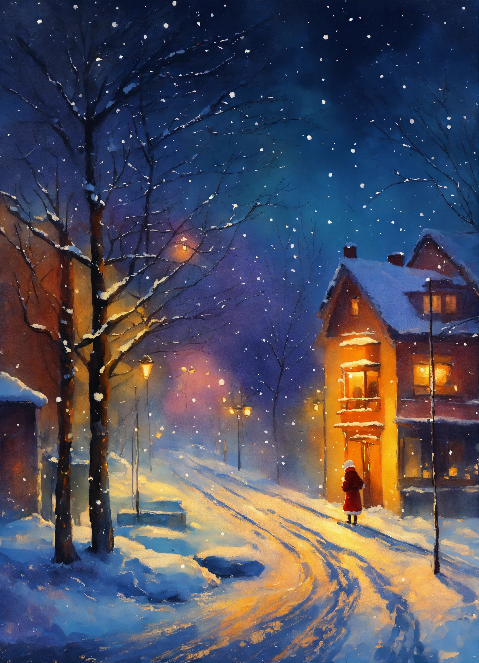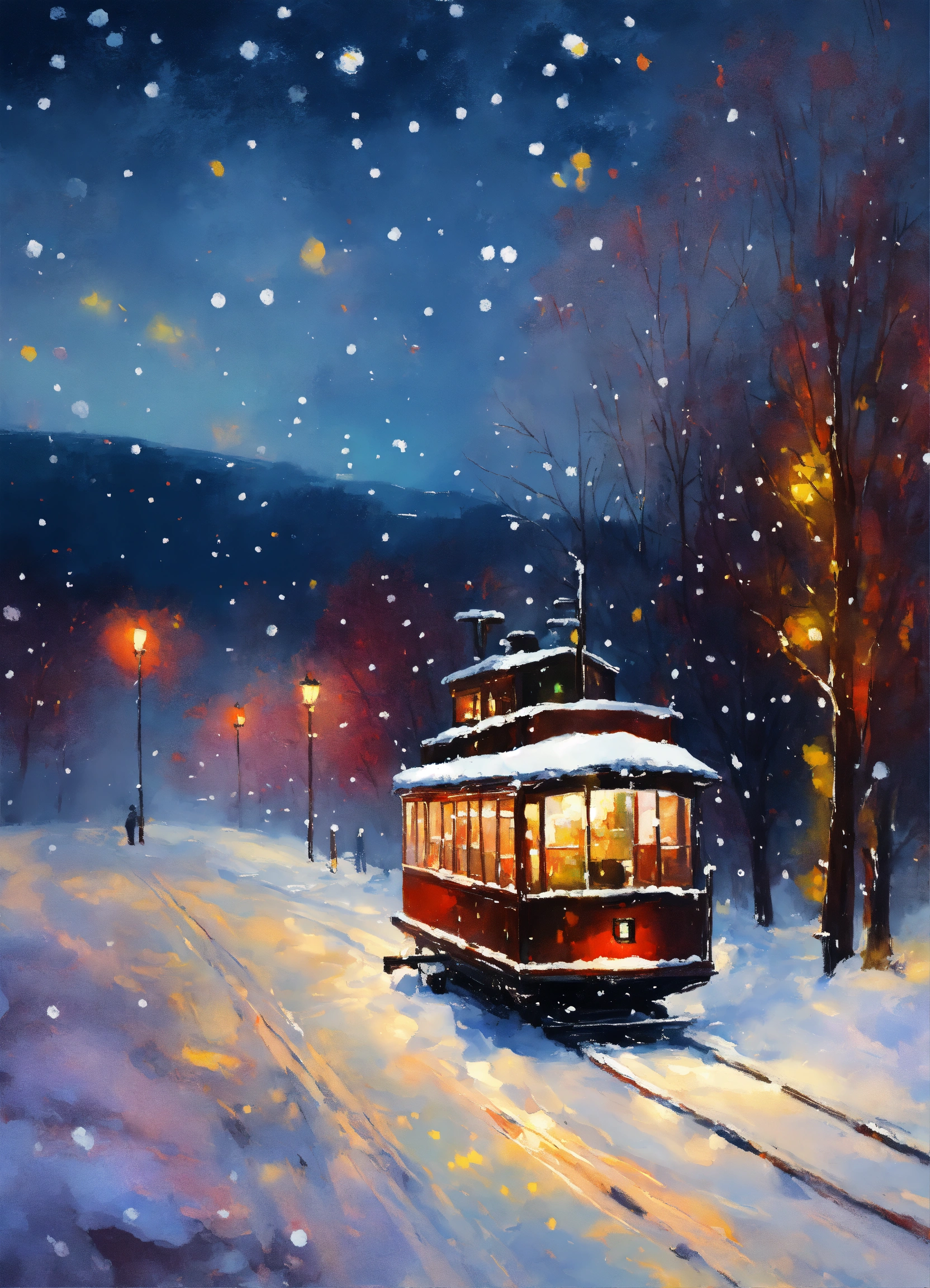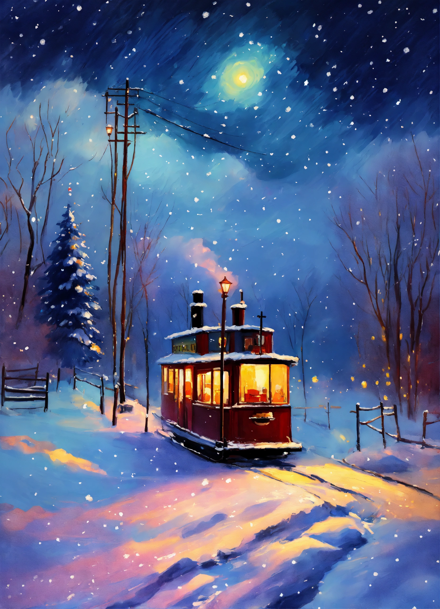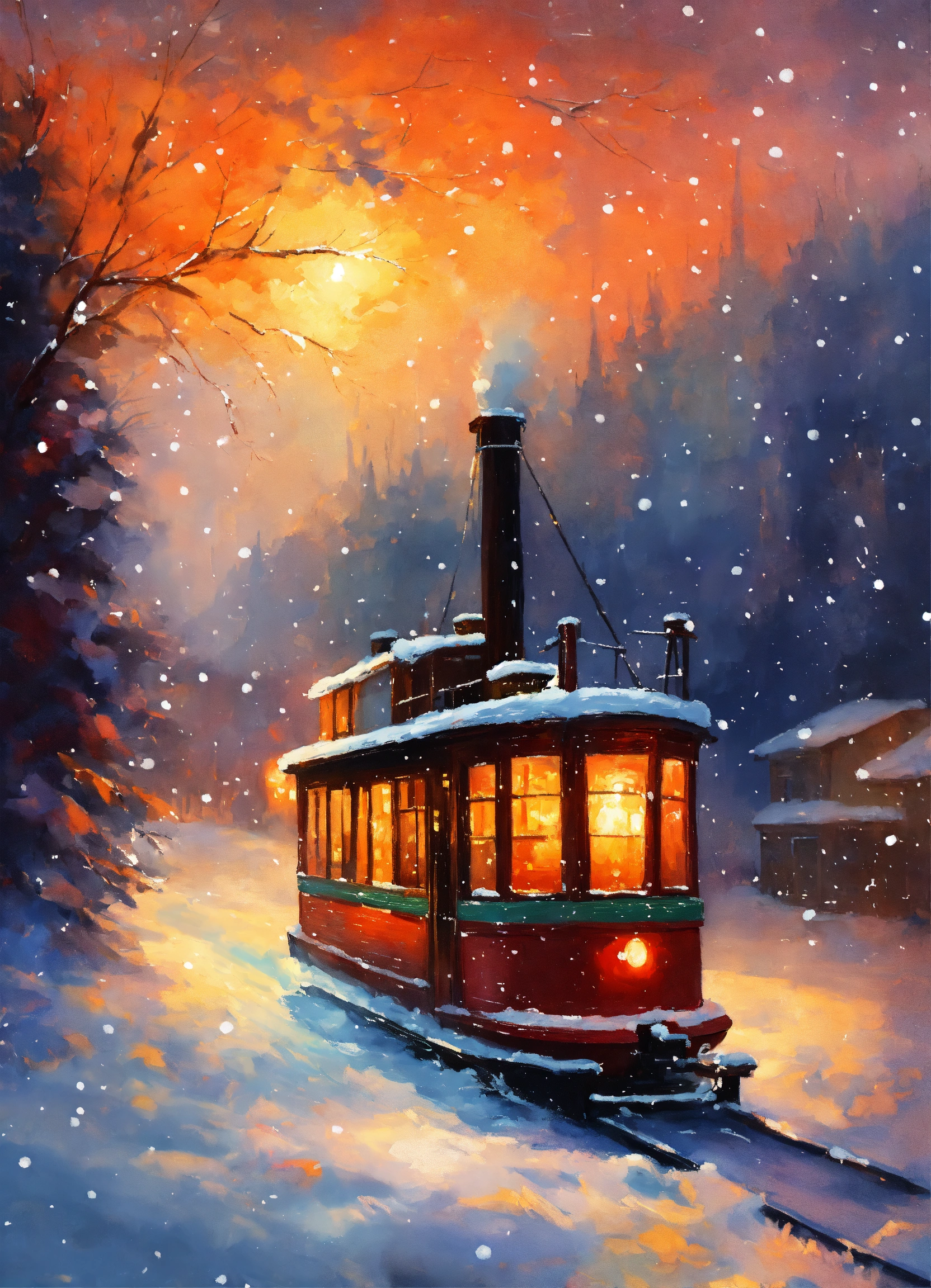 Painting midnight colorful landscape in winter snowing heavily. impressionist style, christmas old time steamboat