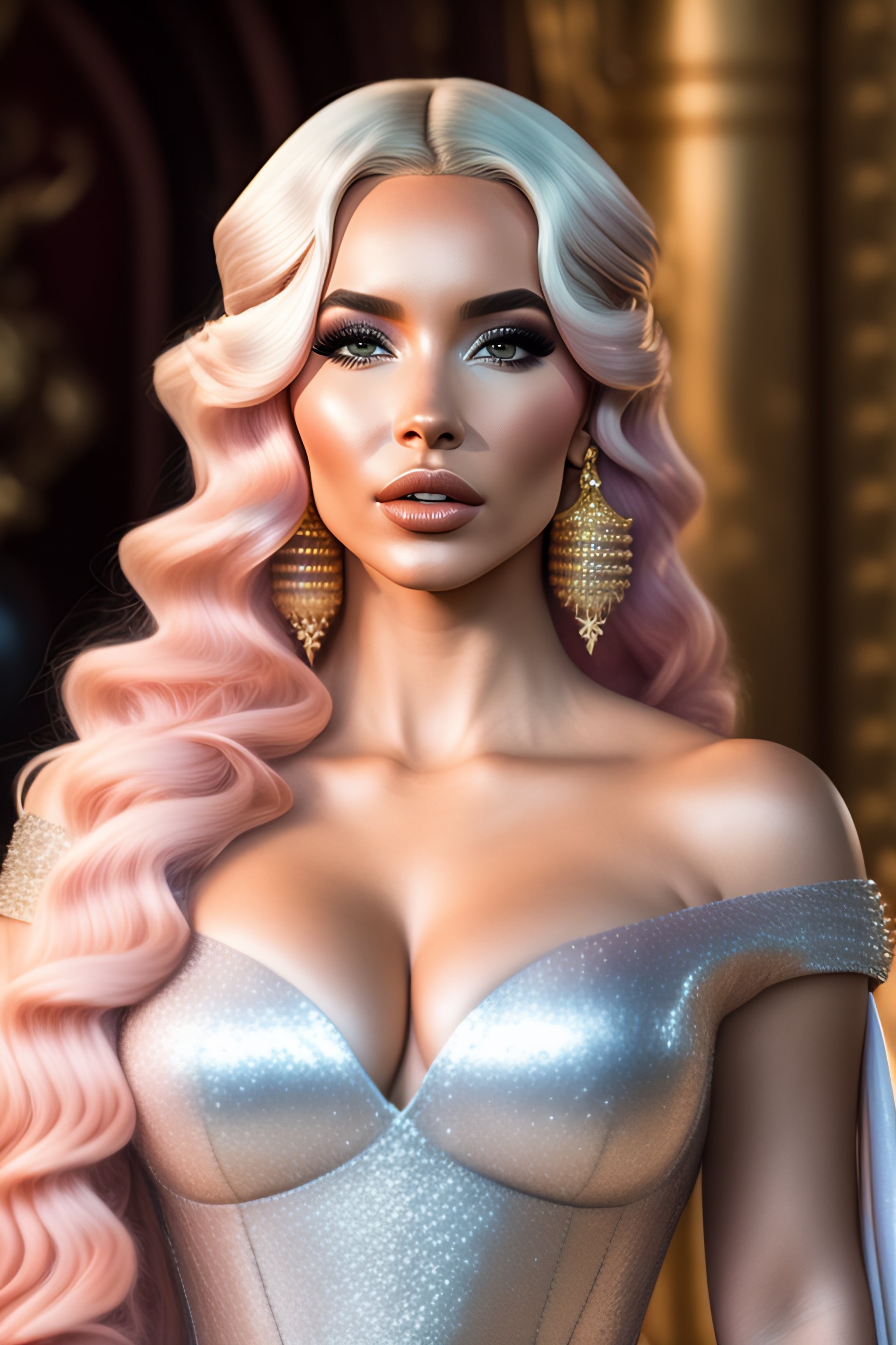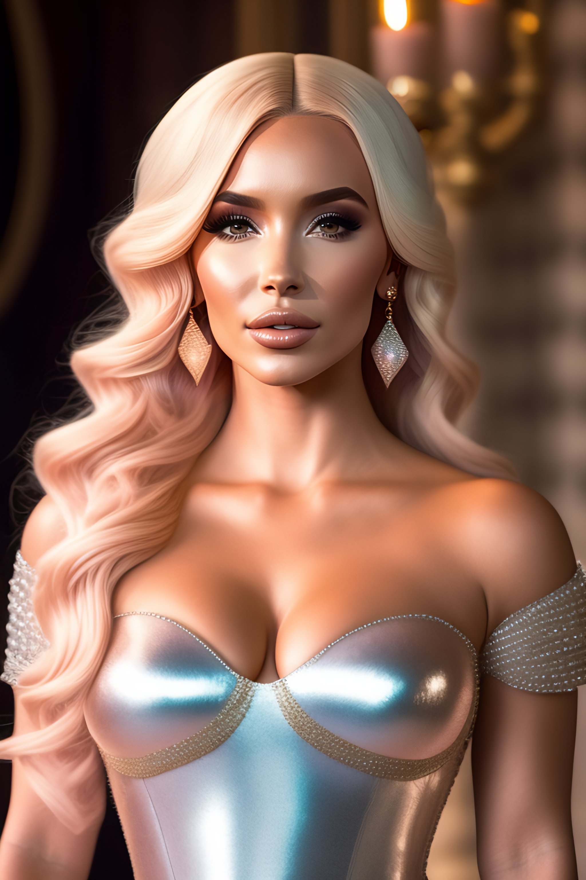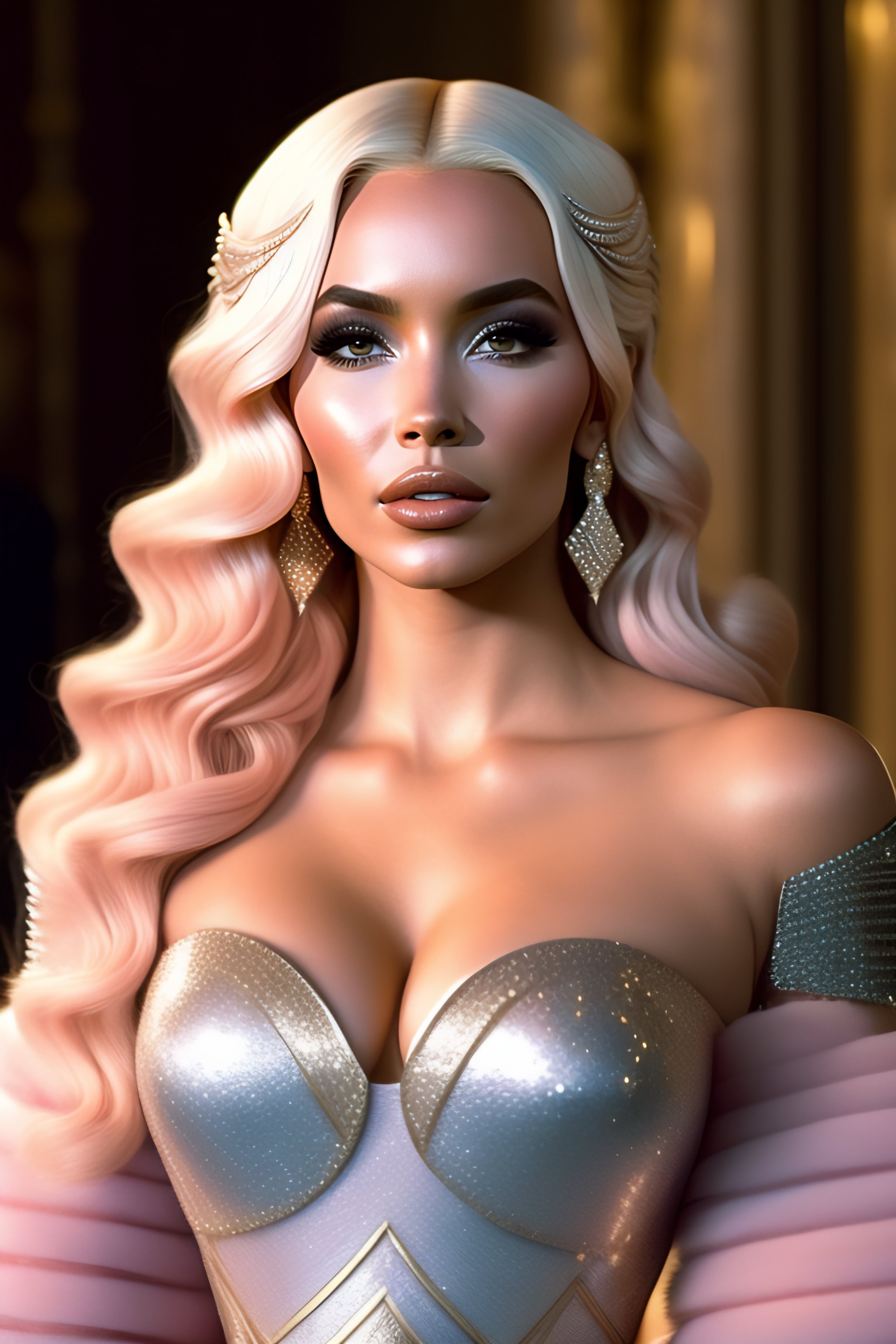 Film still of princess peach dove cameron gigantic kim kardashian showing perfect oversized in transparent iridescent glistening armor in game of thrones, female, back, spine, large, christina hendricks chest, revealing dress, smooth, sharp focus, wide lens, cinematic shot