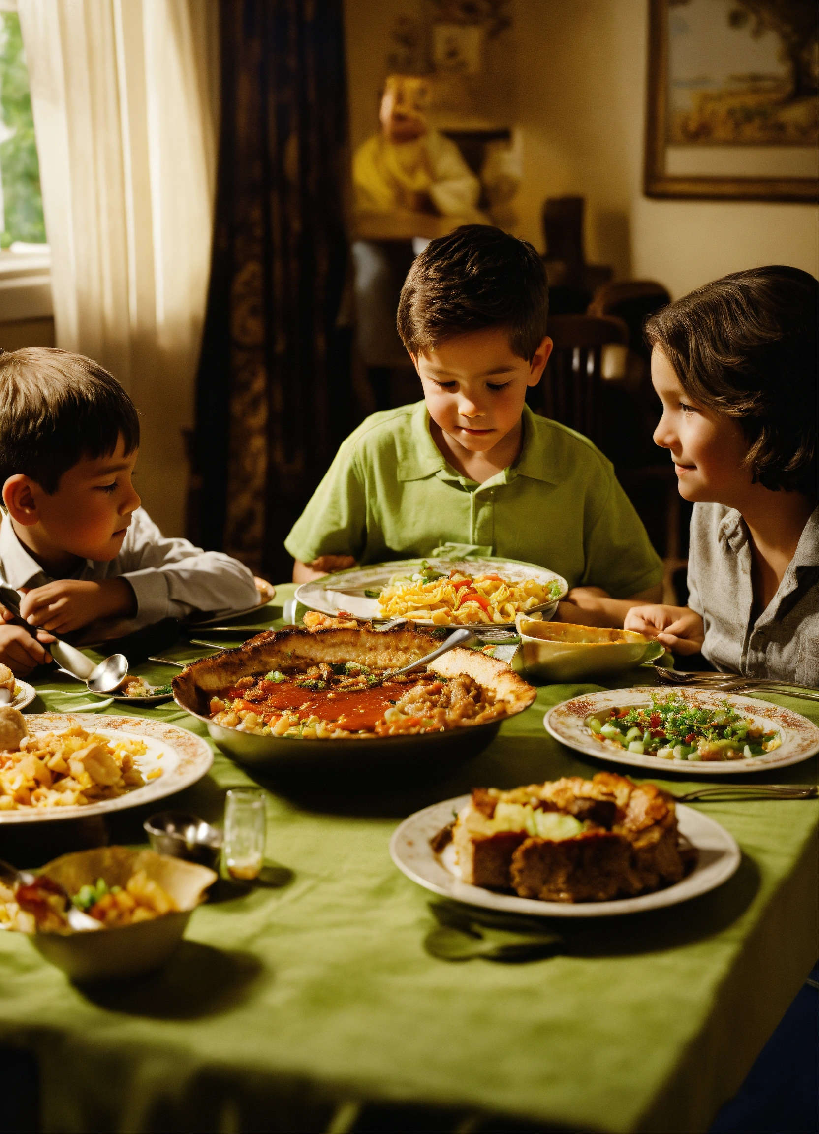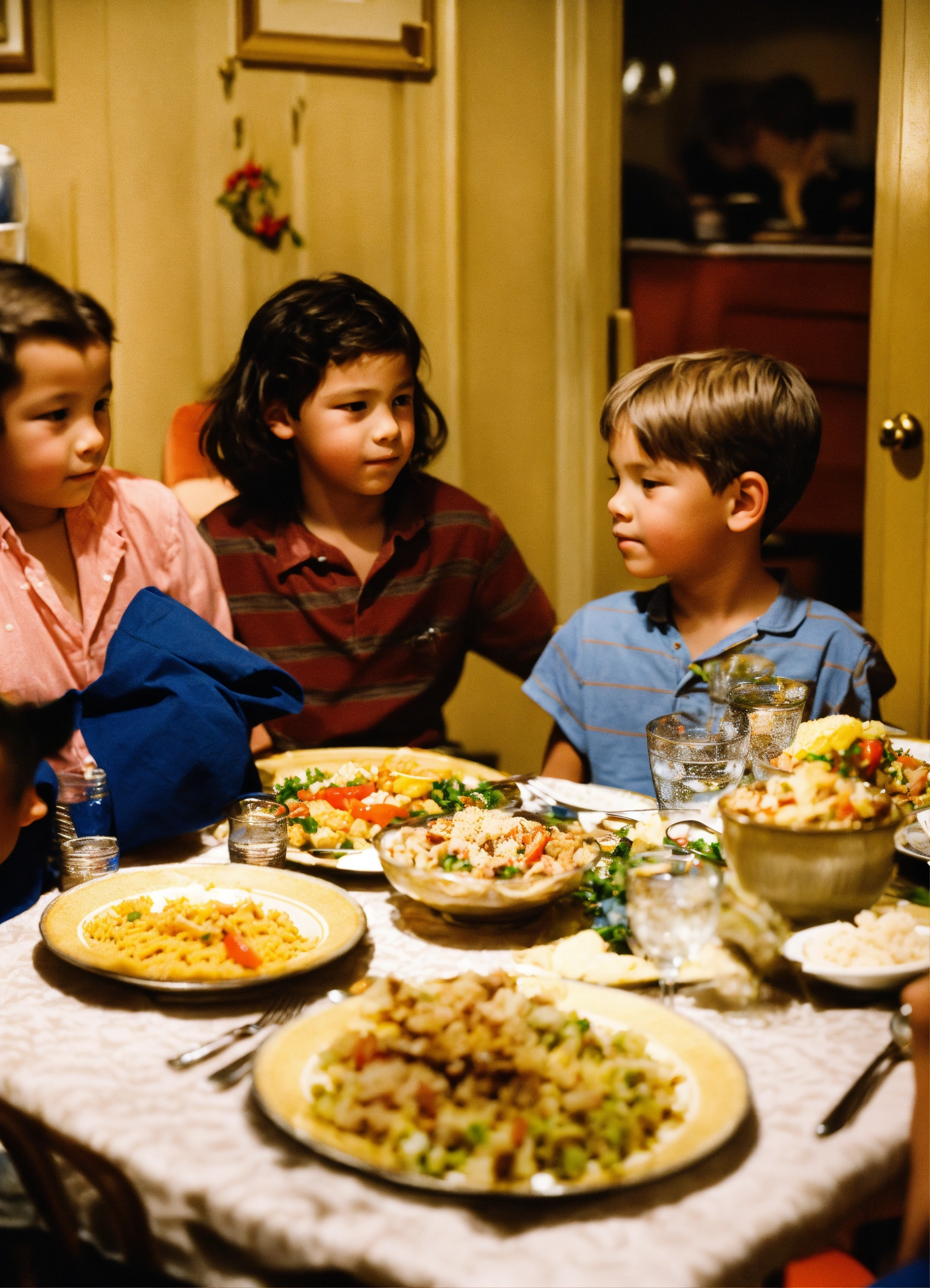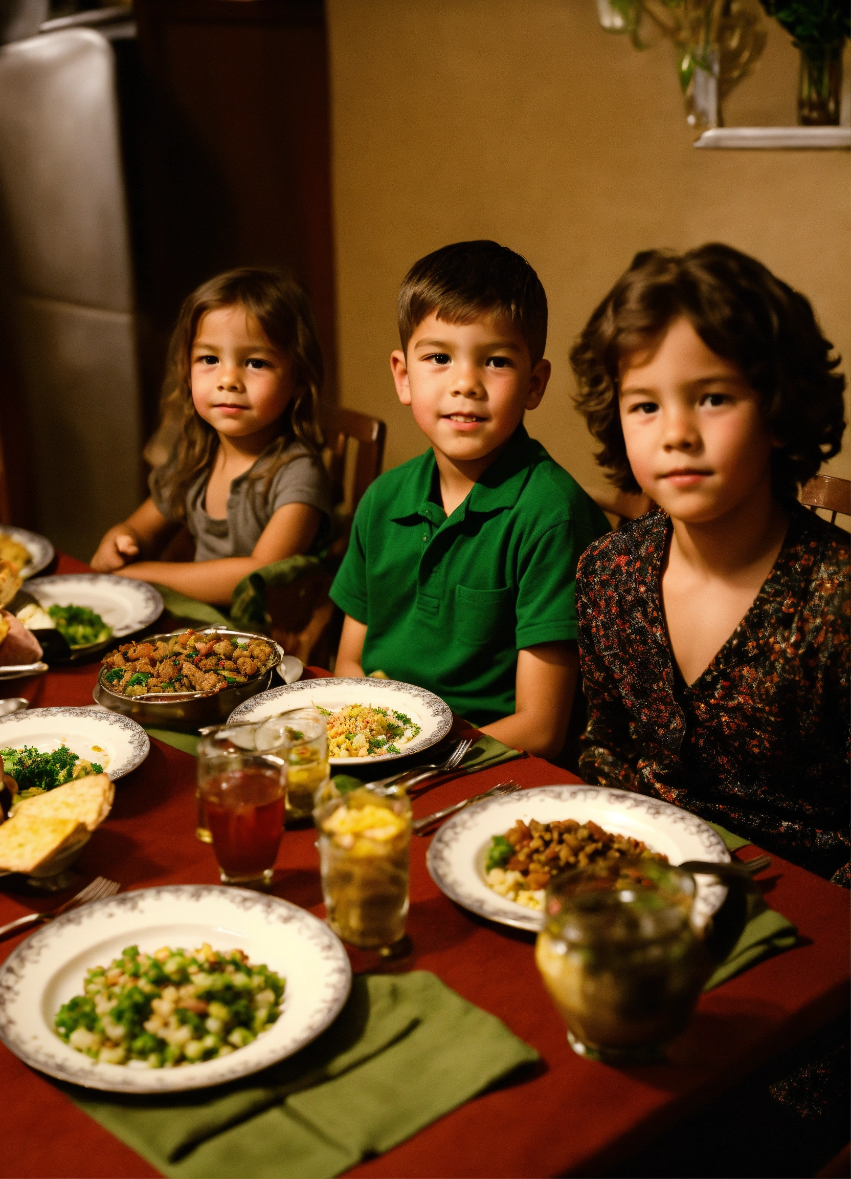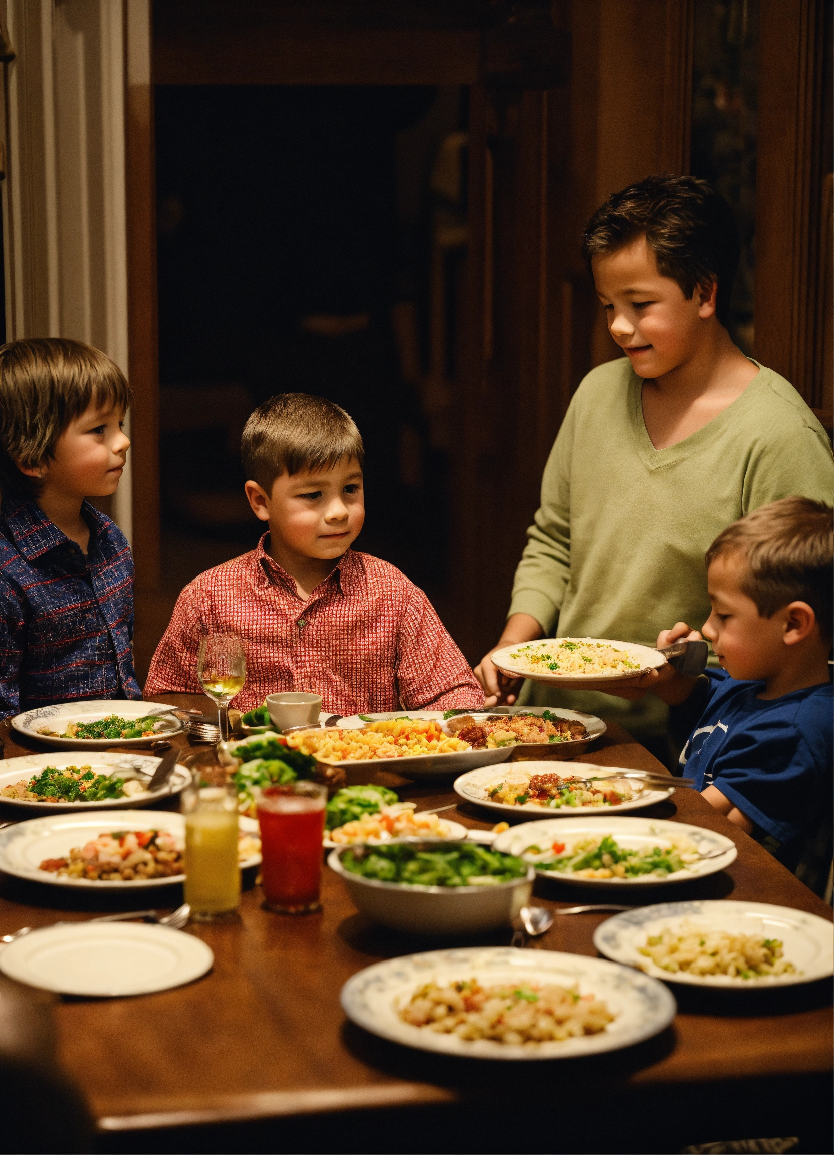 A young boy named john, around 7 years old, is shown sitting at the dinner table with his family. the dinner table is filled with plates of food.