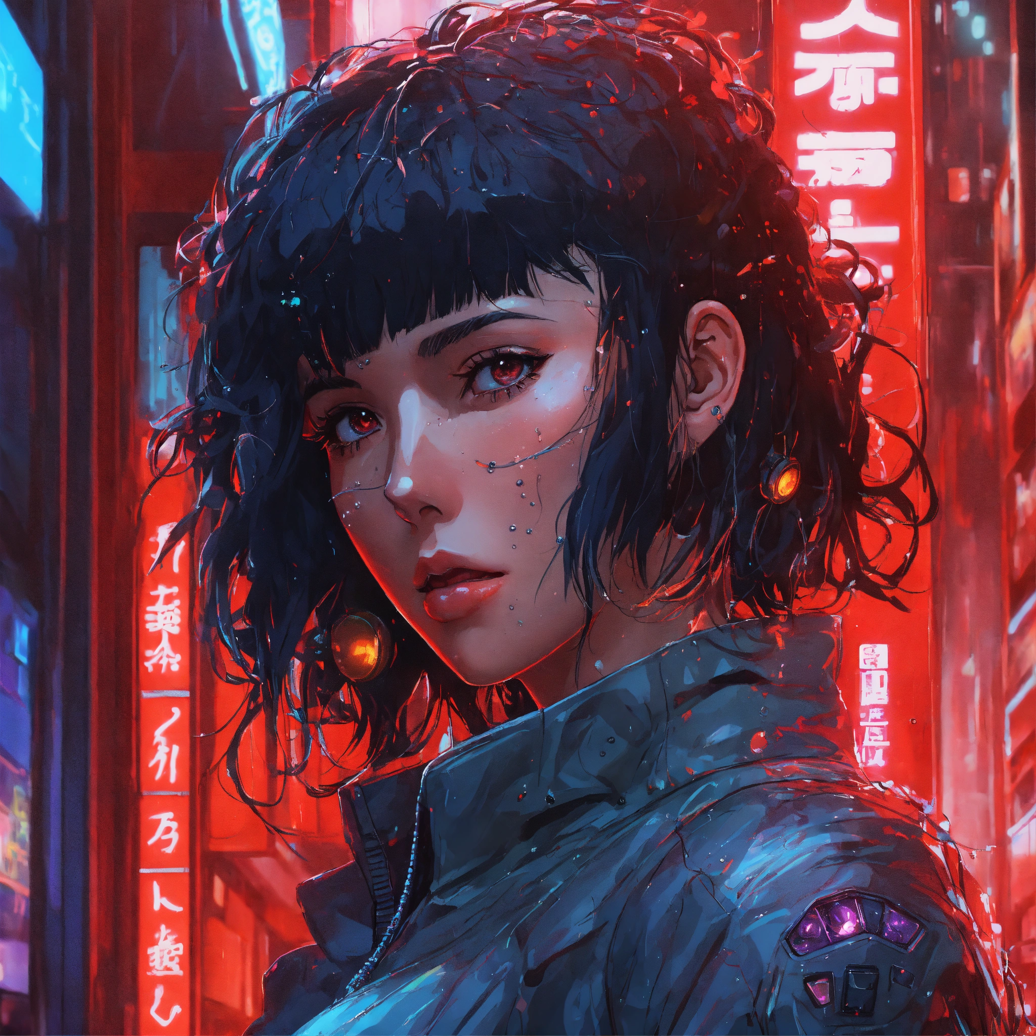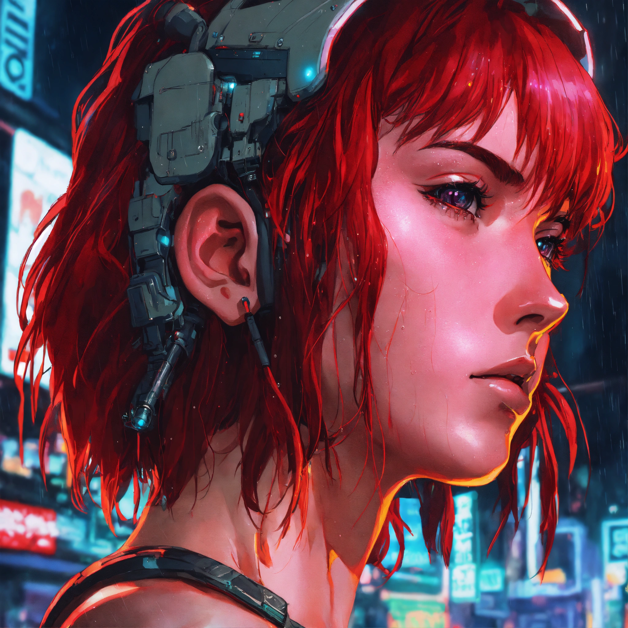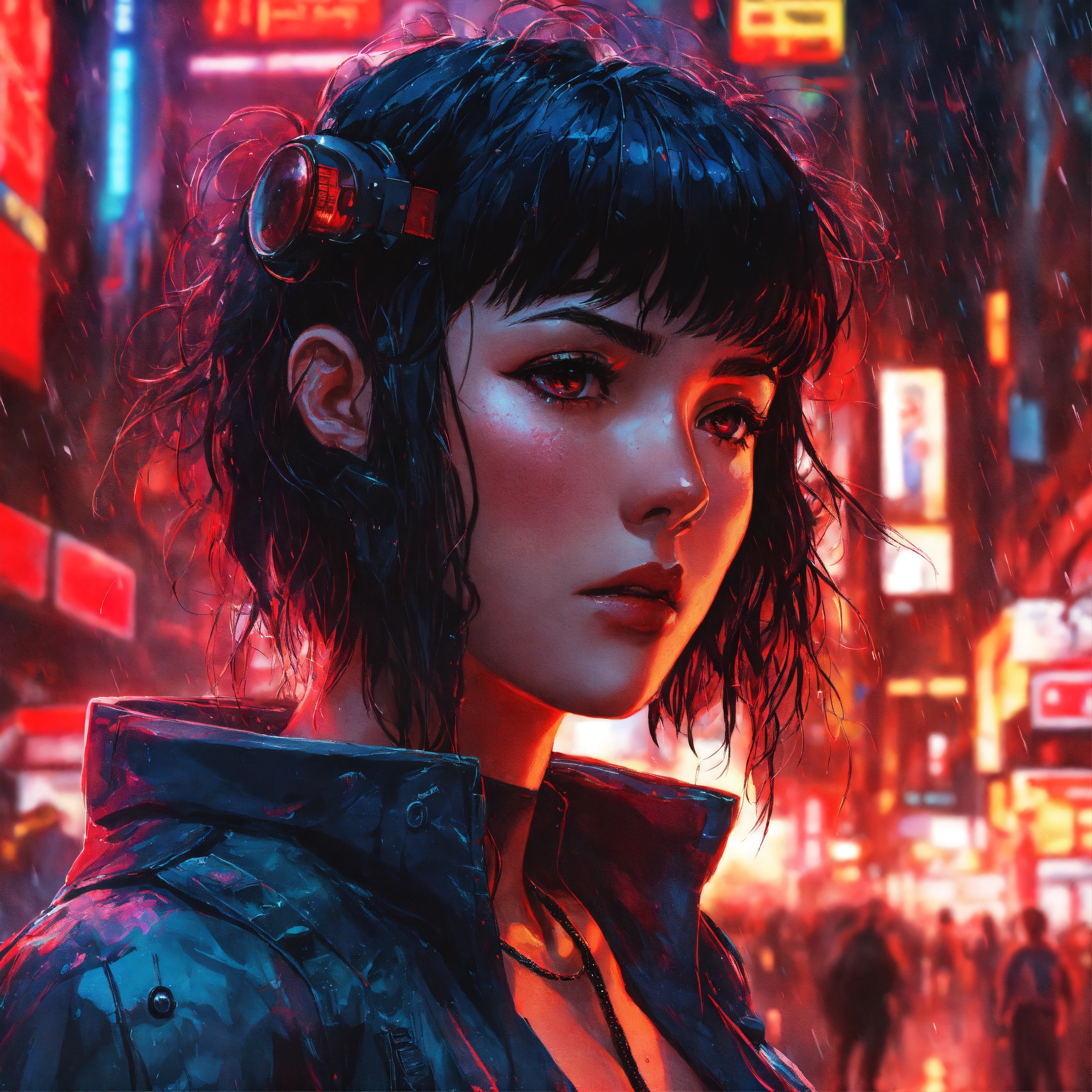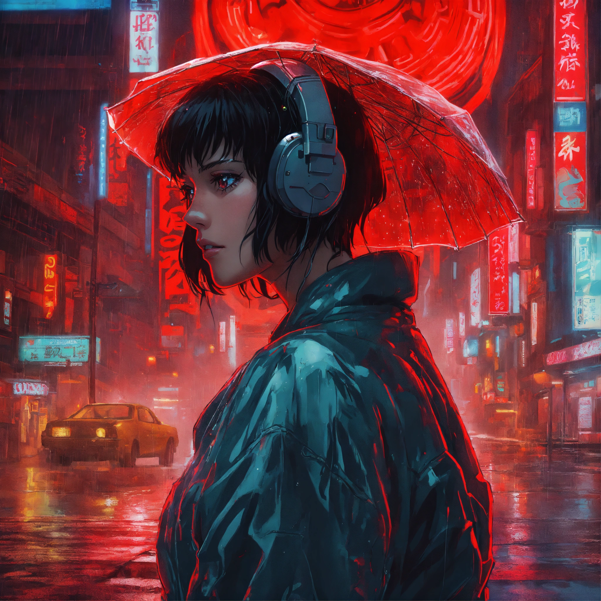 Anime art of ghost in the shell, detailed scene, red, perfect face, intricately detailed photorealism, trending on artstation, neon lights, rainy day, cybernetic implants, vintage 90's anime artwork.